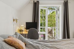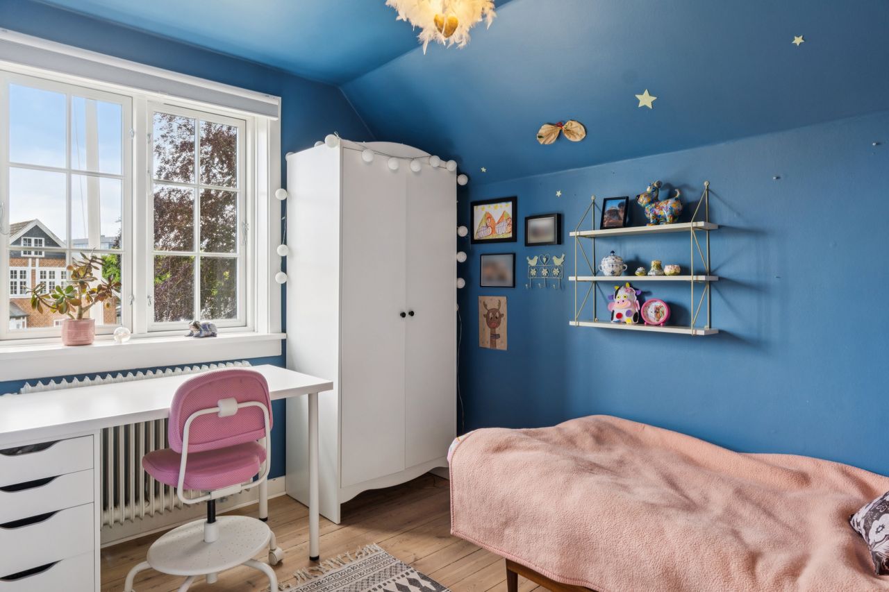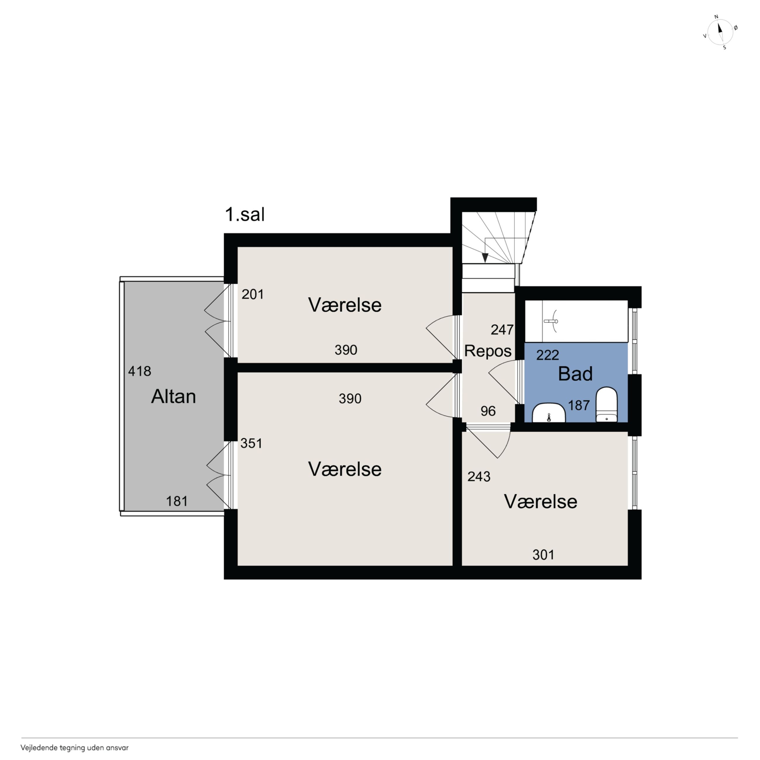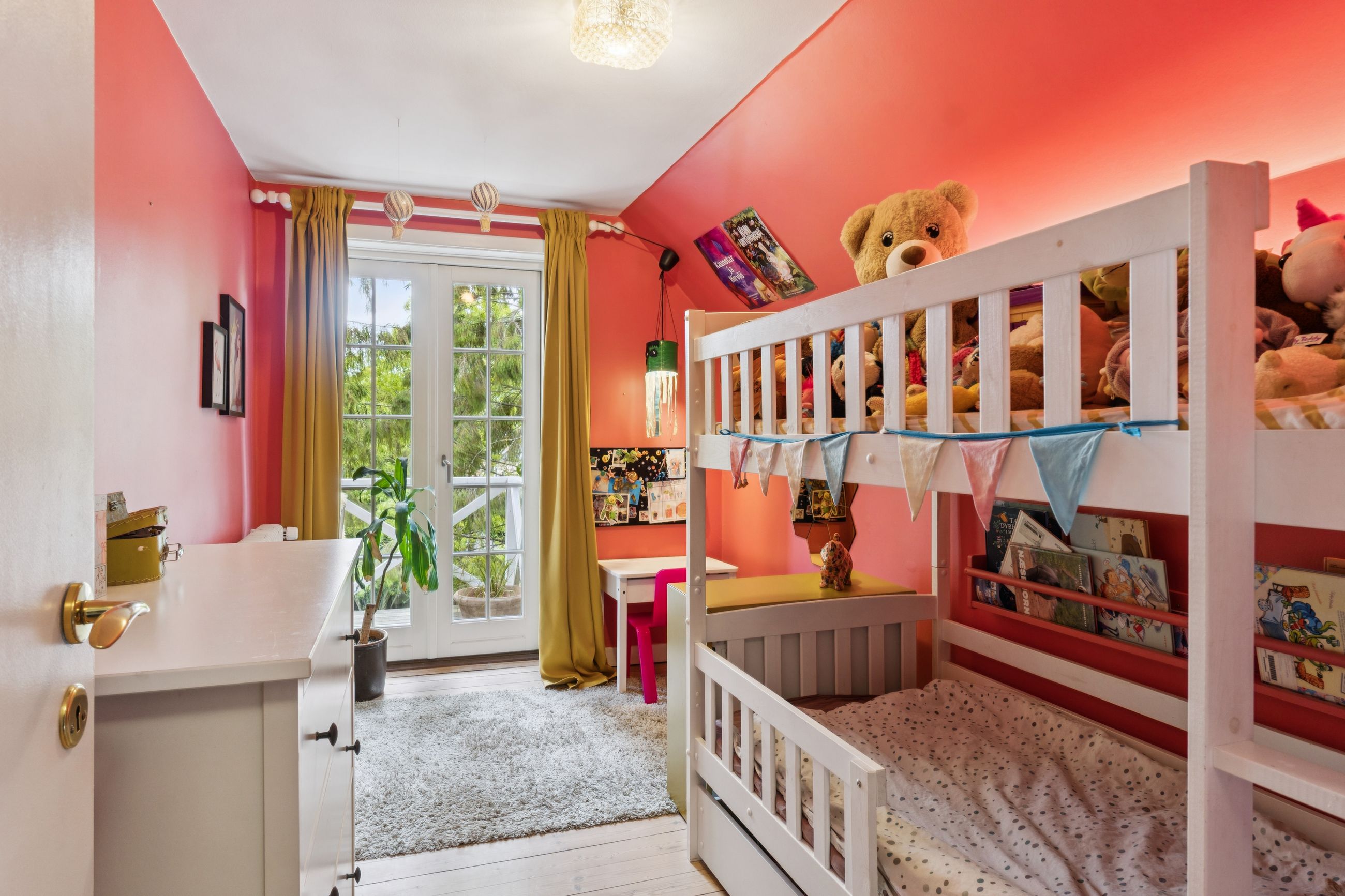 1. sal: Repos med adgang til badeværelse med terrazzogulv, badekar og brusebad. Herudover byder 1. salen på et rummeligt soveværelse med udgang til balkonen samt 2 gode børneværelser, hvoraf det ene også har udgang til balkonen.