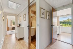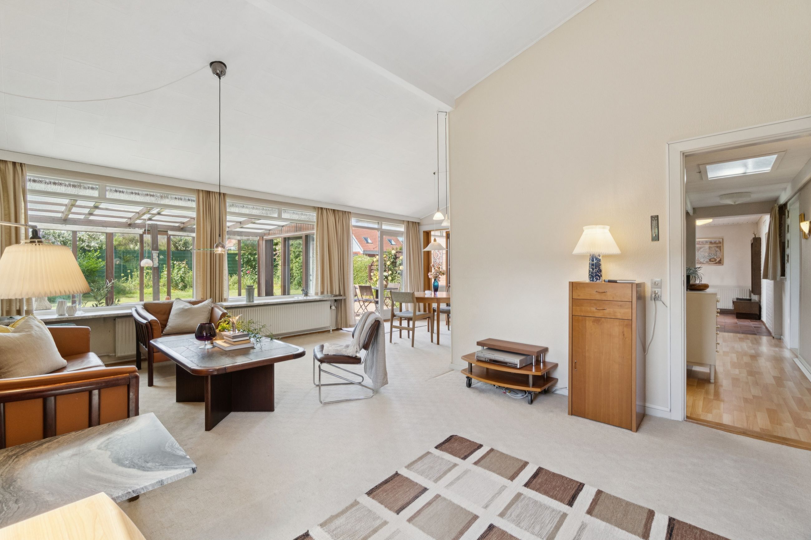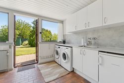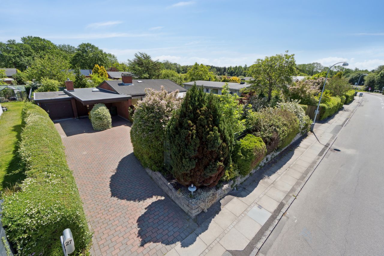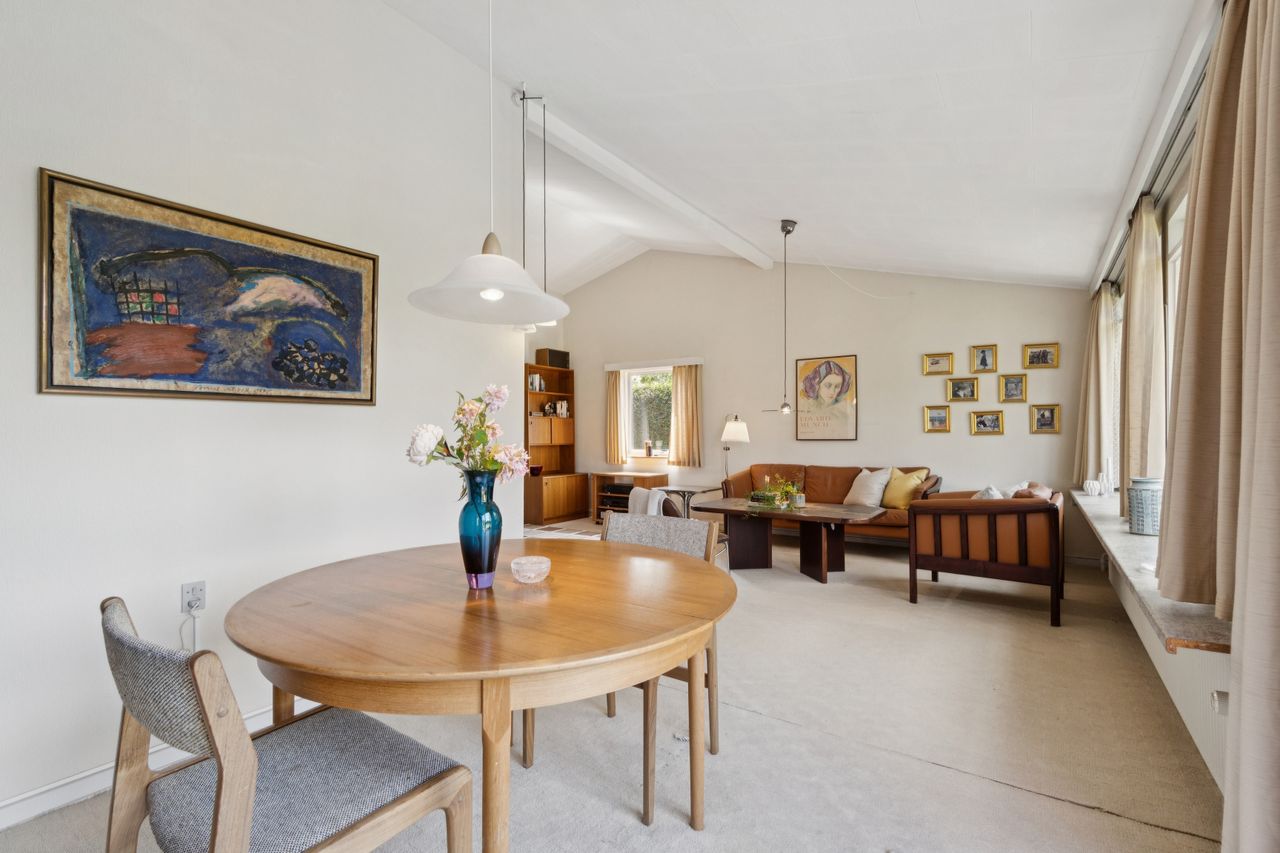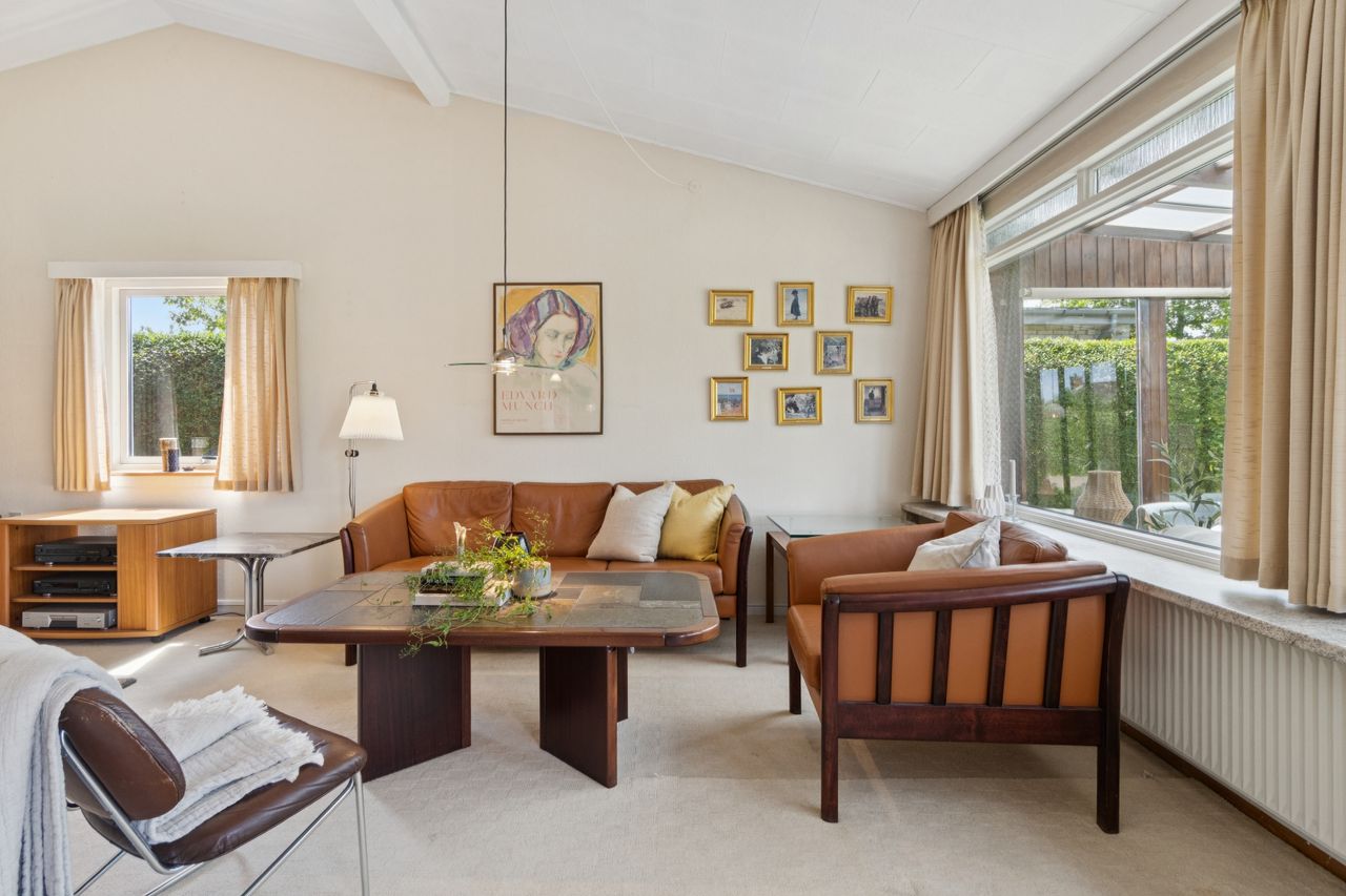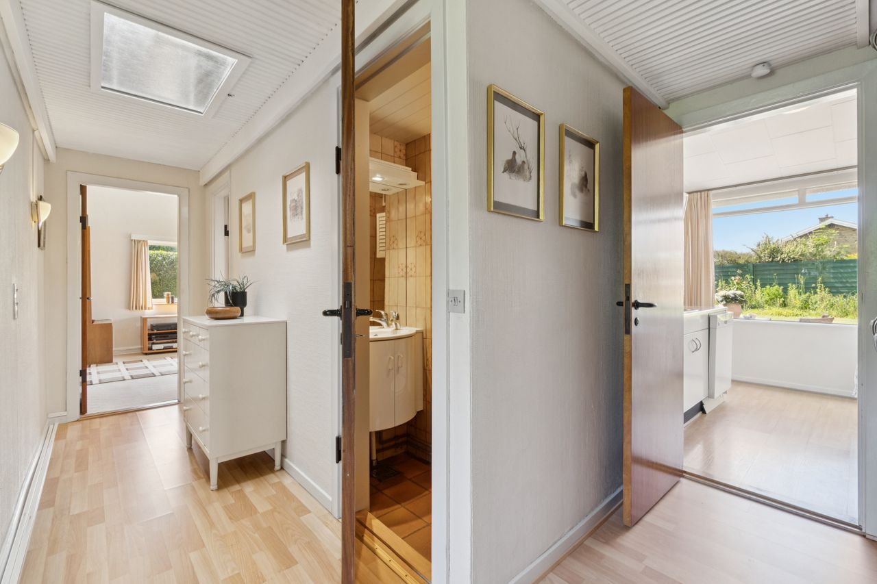 Meget rummelig entré med klinkegulv og garderobe. Fra entreen er der adgang til husets velholdte køkken, hvorfra der er adgang til en skøn, stor og meget højloftet (frit til kip) opholdsstue. Køkken og stue er kun adskilt med en let væg, som er nem at bortskaffe, hvis man ønsker et åbent køkken. Fra stuen er der udgang til haven samt en vestvendt havestue. Huset byder endvidere på et soveværelse, 2 børneværelser (pt. sammenlagte), badeværelse med brusebad, gæstetoilet samt et rummeligt brygges med naturgasfyr. - Huset har tillige et anvendeligt loftrum.