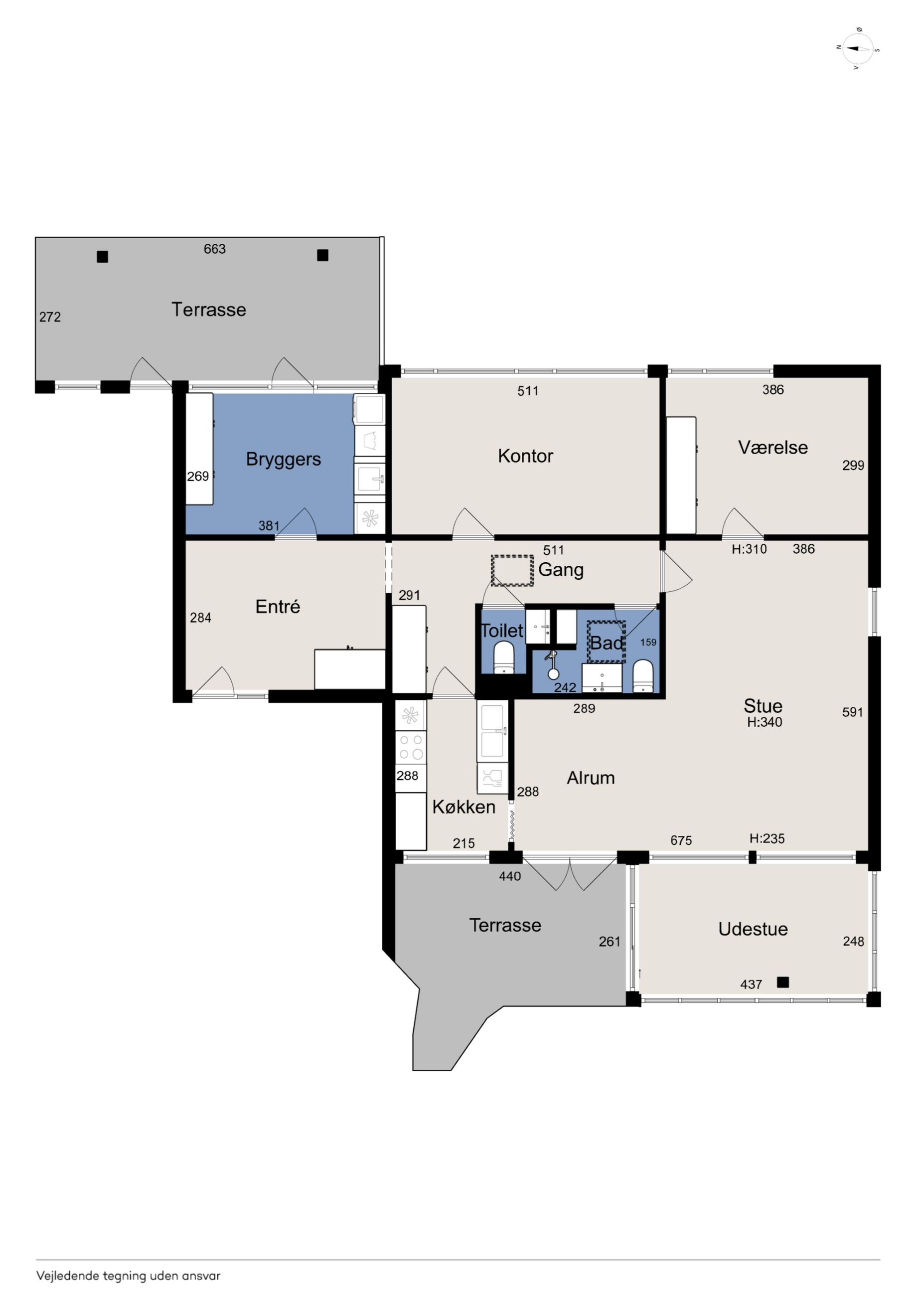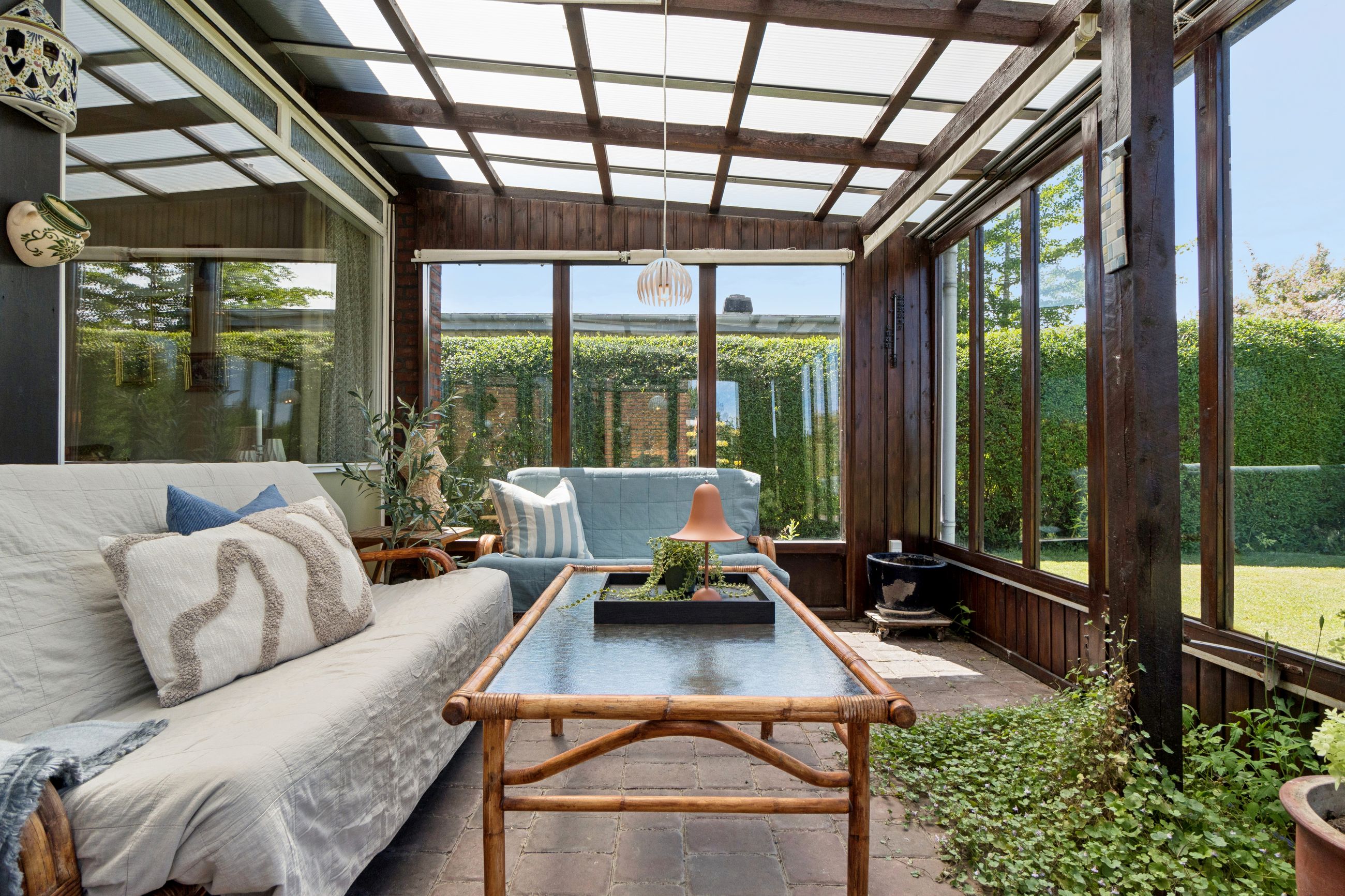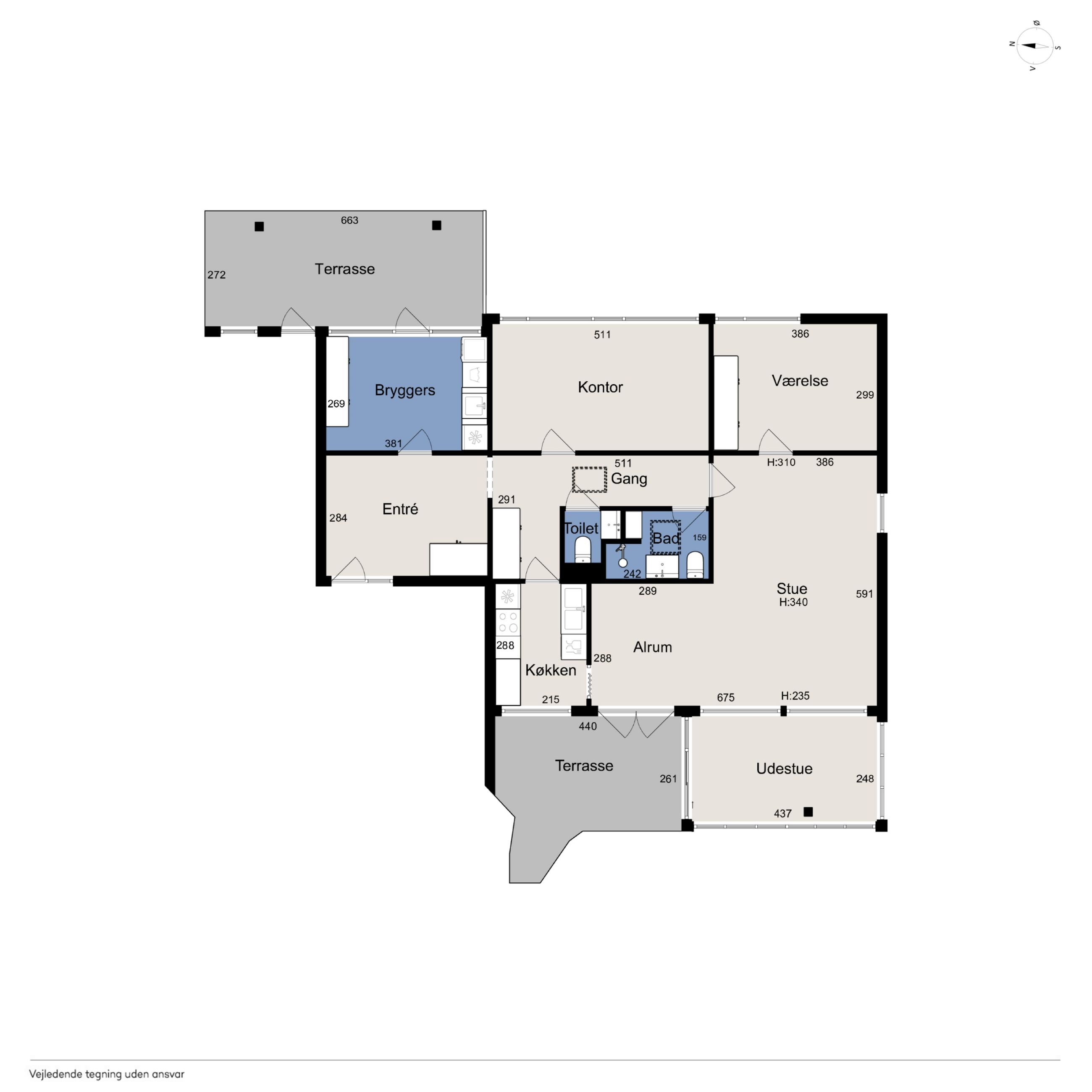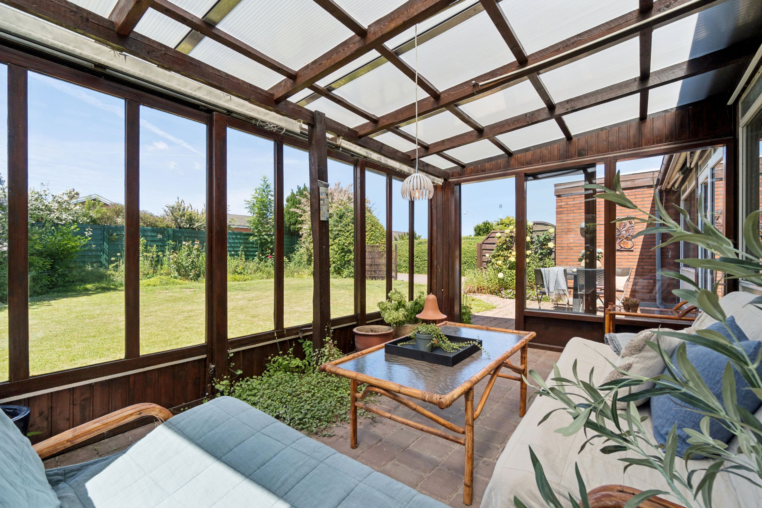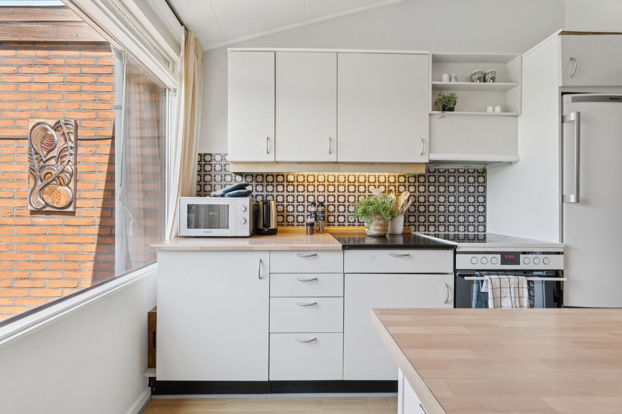 Meget rummelig entré med klinkegulv og garderobe. Fra entreen er der adgang til husets velholdte køkken, hvorfra der er adgang til en skøn, stor og meget højloftet (frit til kip) opholdsstue. Køkken og stue er kun adskilt med en let væg, som er nem at bortskaffe, hvis man ønsker et åbent køkken. Fra stuen er der udgang til haven samt en vestvendt havestue. Huset byder endvidere på et soveværelse, 2 børneværelser (pt. sammenlagte), badeværelse med brusebad, gæstetoilet samt et rummeligt brygges med naturgasfyr. - Huset har tillige et anvendeligt loftrum.