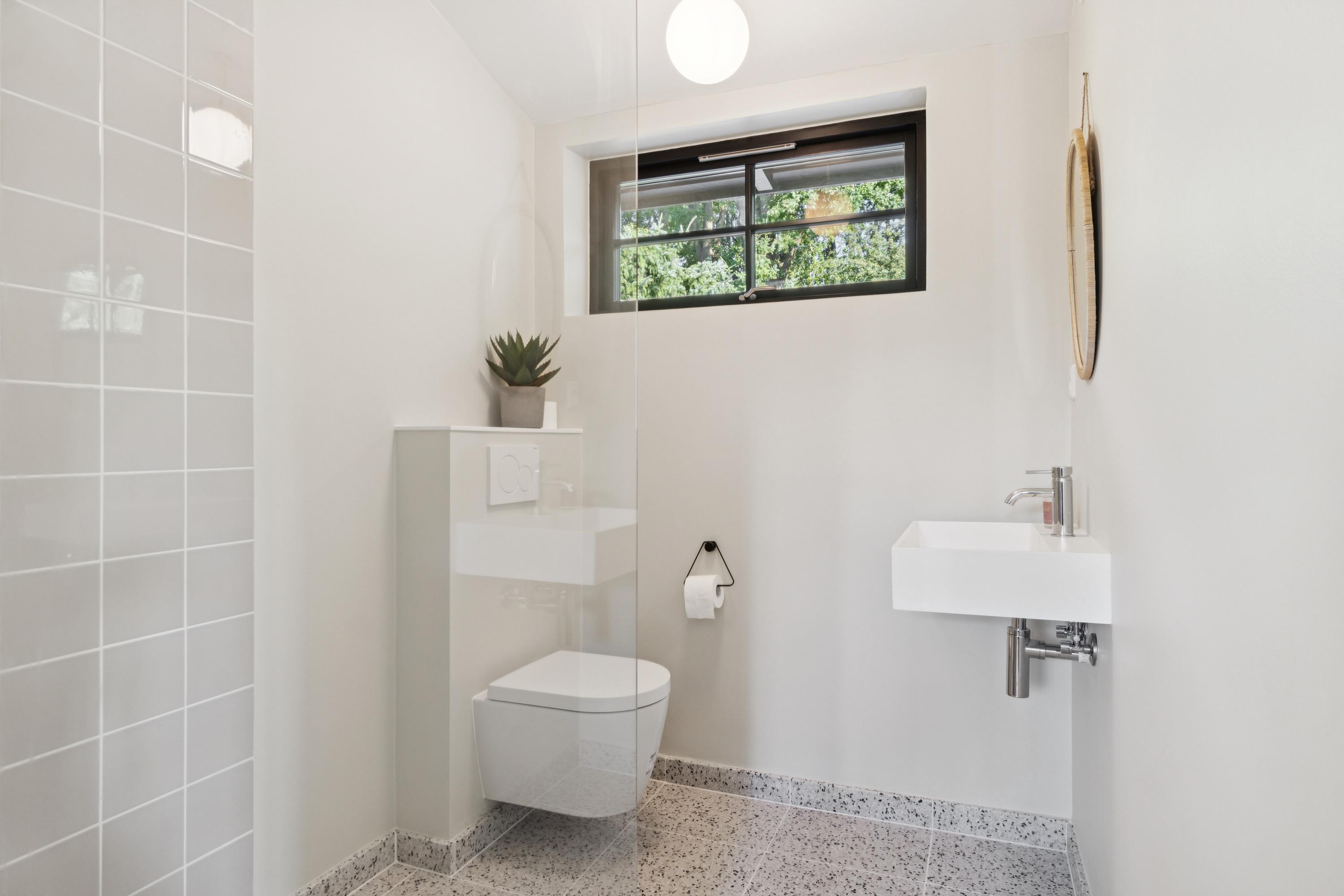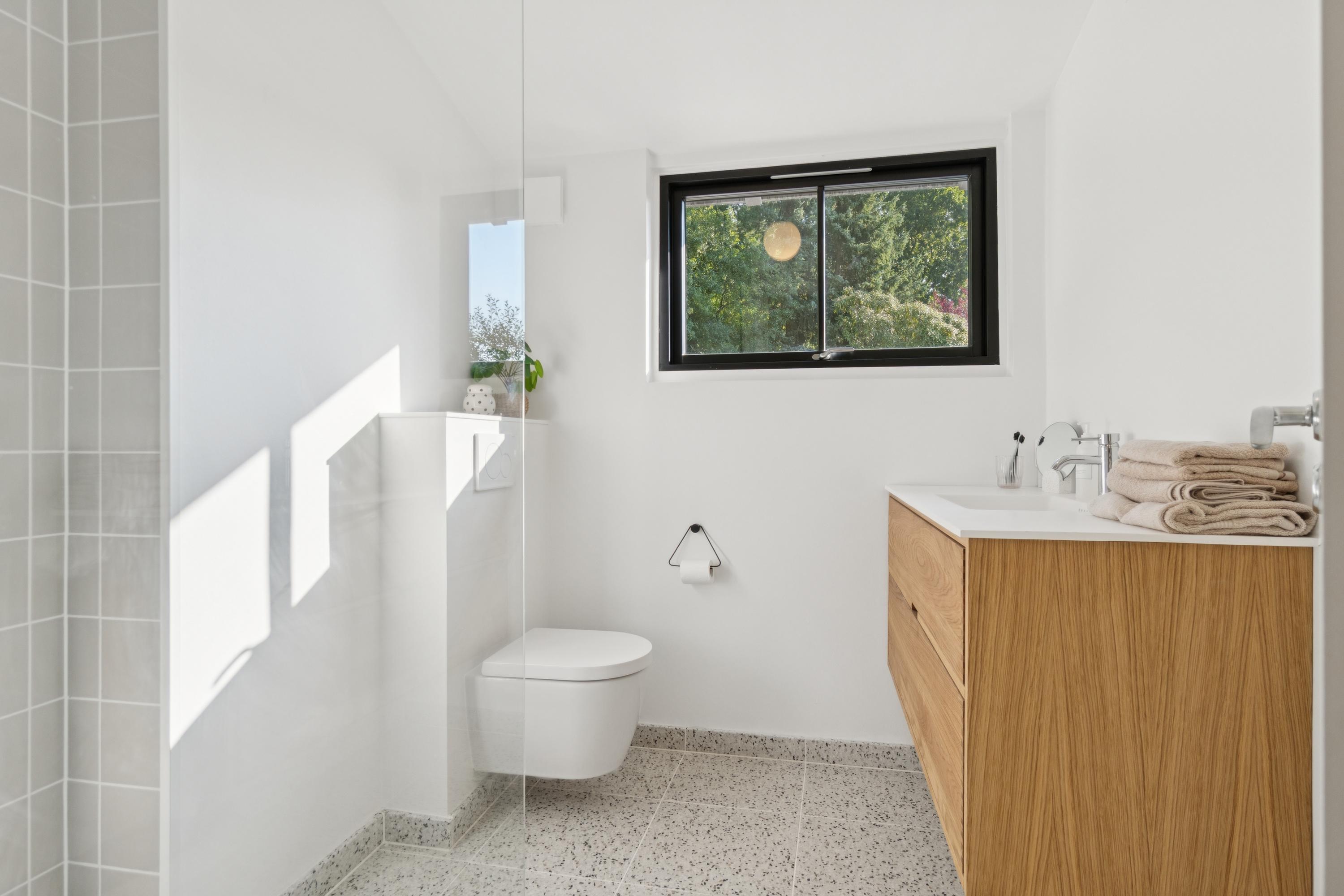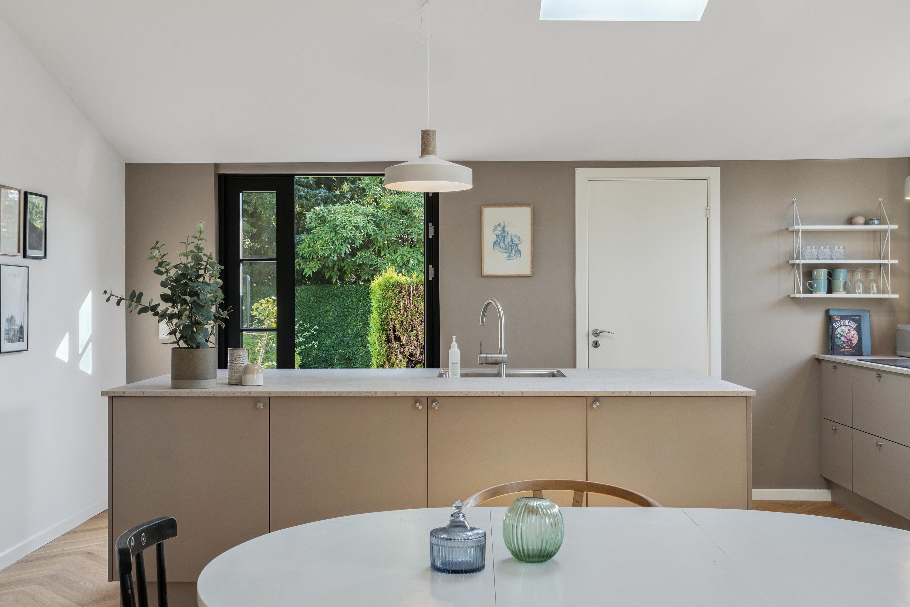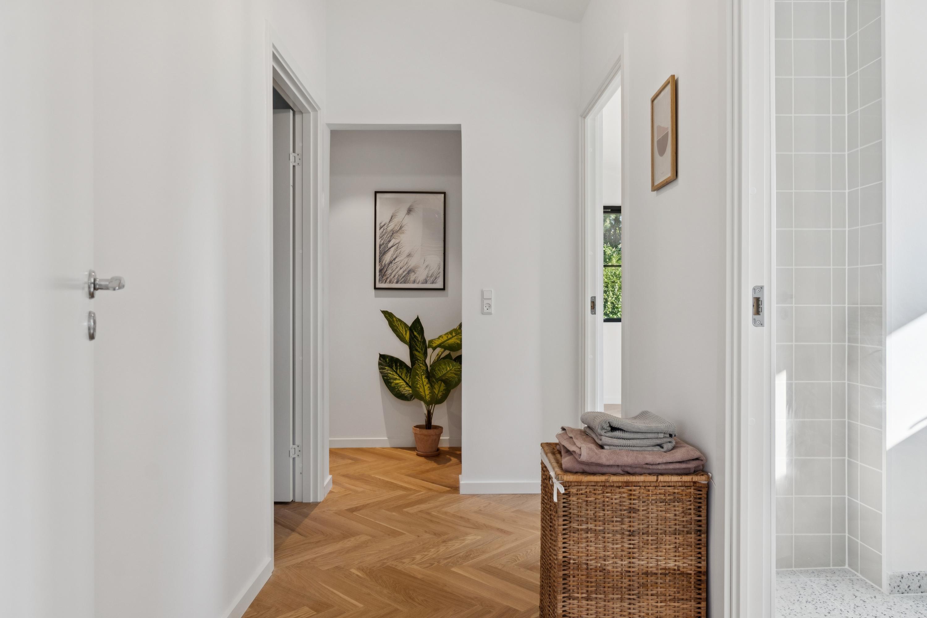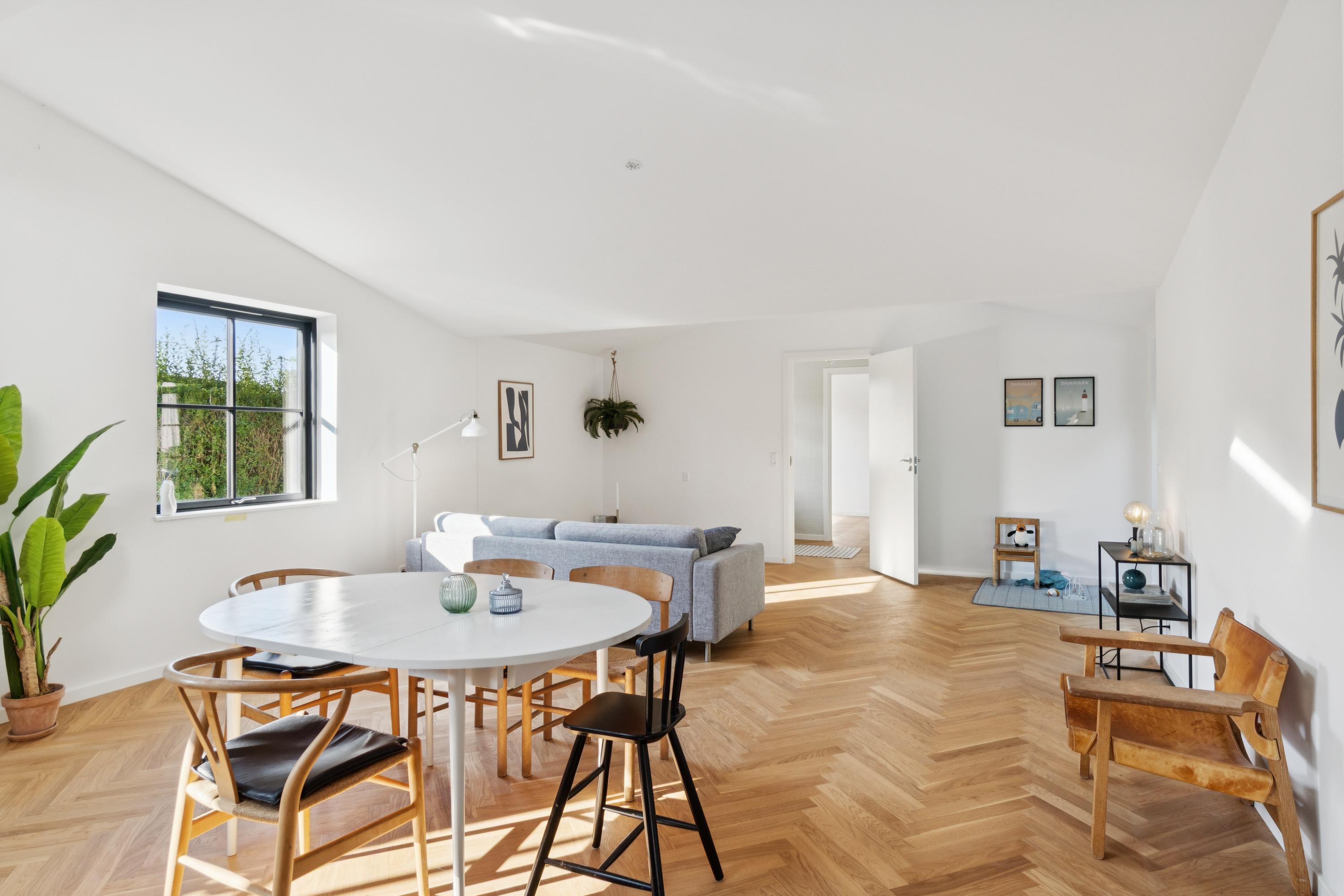 Boligen er gennemgribende renoveret og fremstår i flot stand med filset facade og gennemtænkte materialevalg.