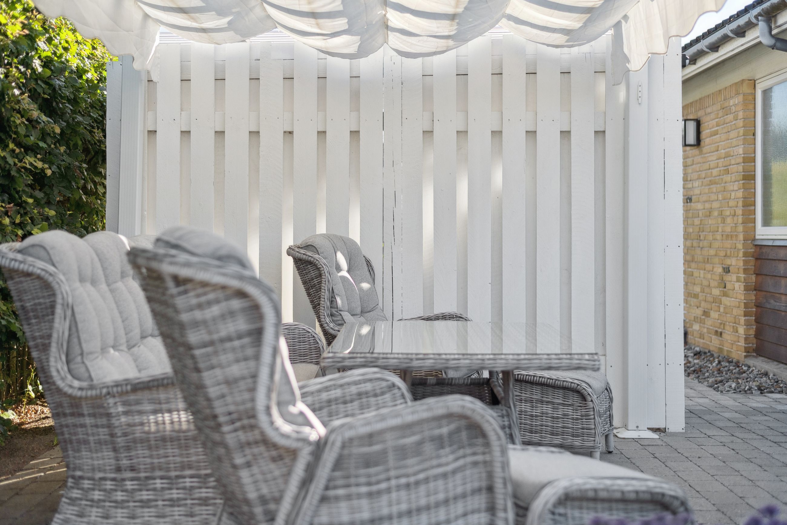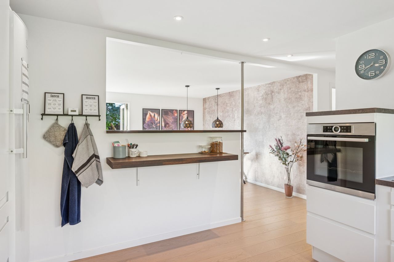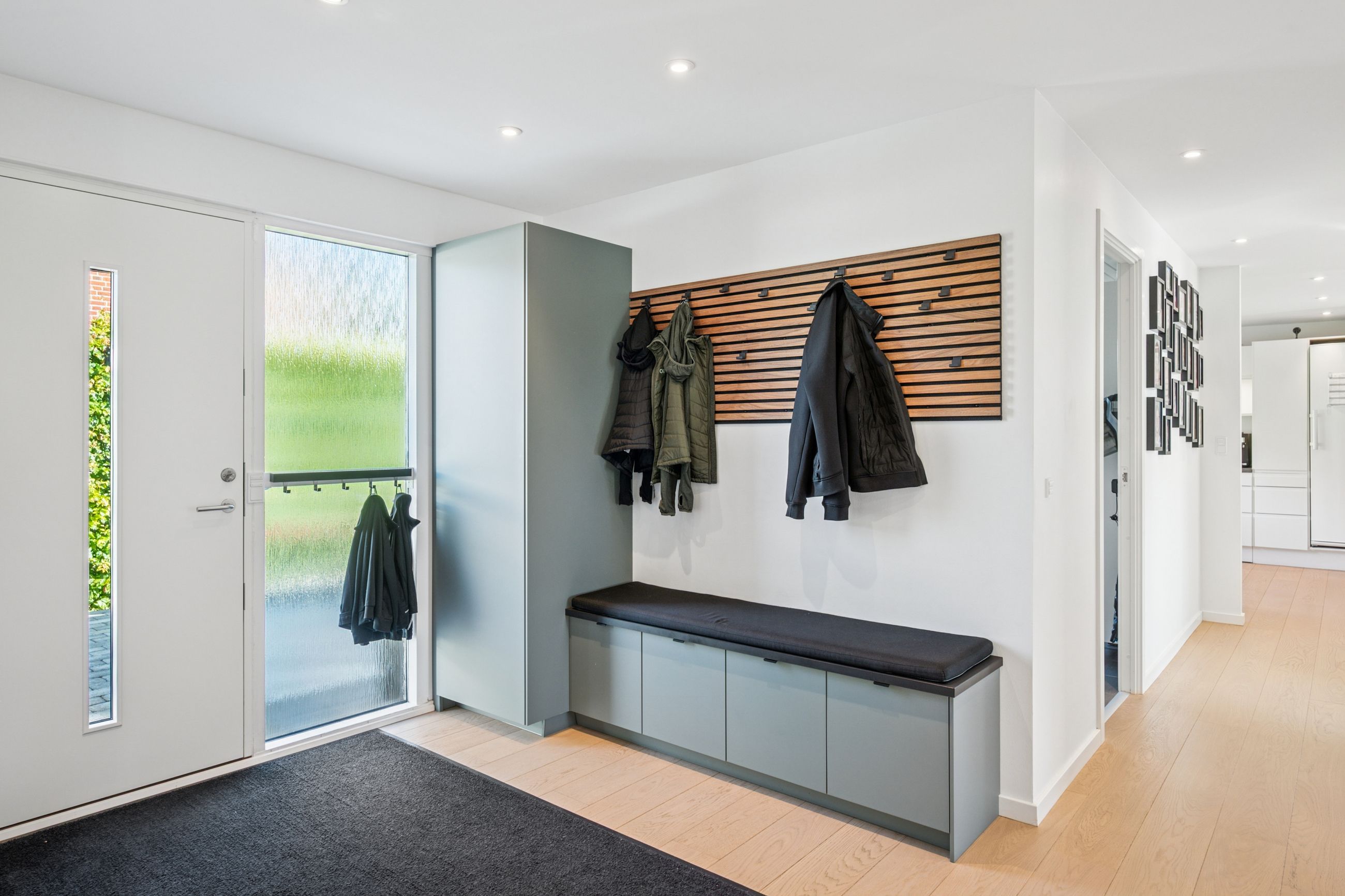 Villaen byder på et lyst og rummeligt køkken i åben forbindelse til stuen, hvor samvær og hverdag naturligt smelter sammen. Herfra er der adgang til haven, så ude- og indeliv let kan forenes.