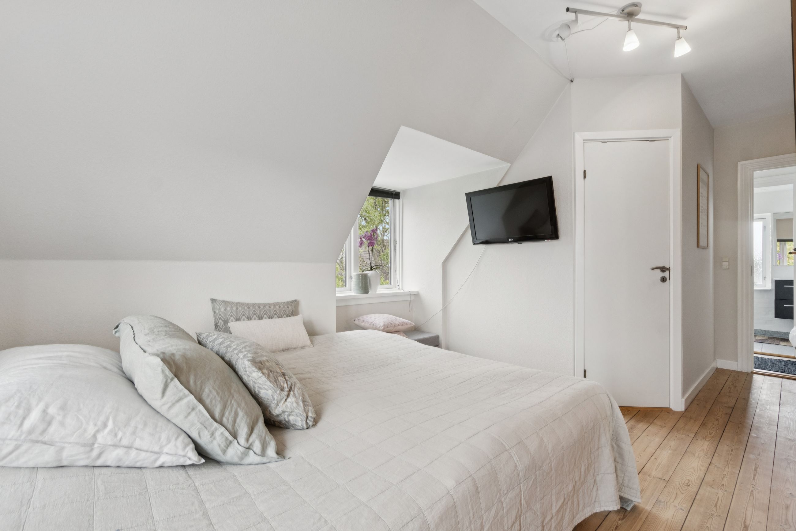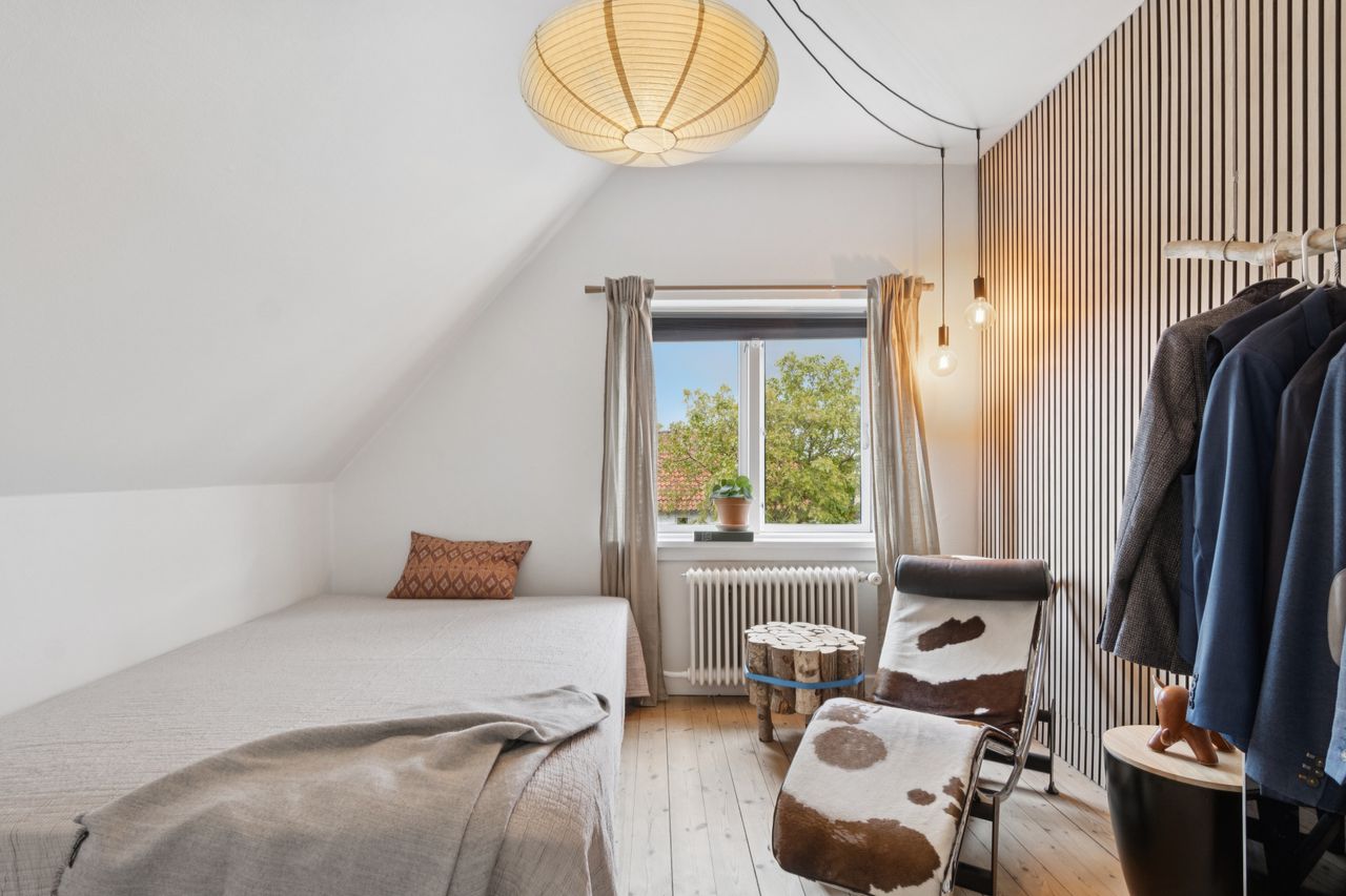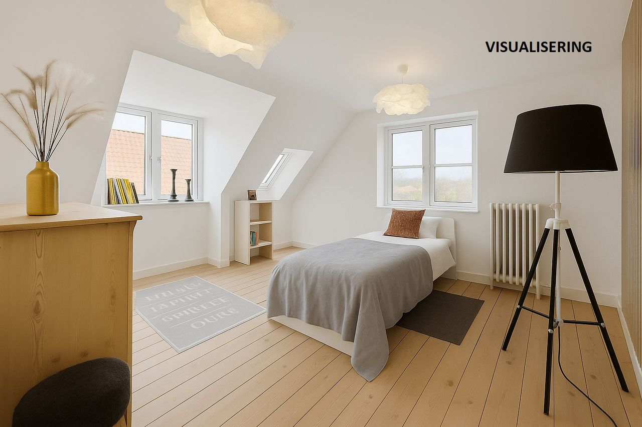 1. salen byder på tre regulære værelser og et elegant badeværelse – samt forældreafdeling med walk-in-closet. Etagen har kviste på begge sider, hvilket sikrer flot lys og god loftshøjde.