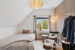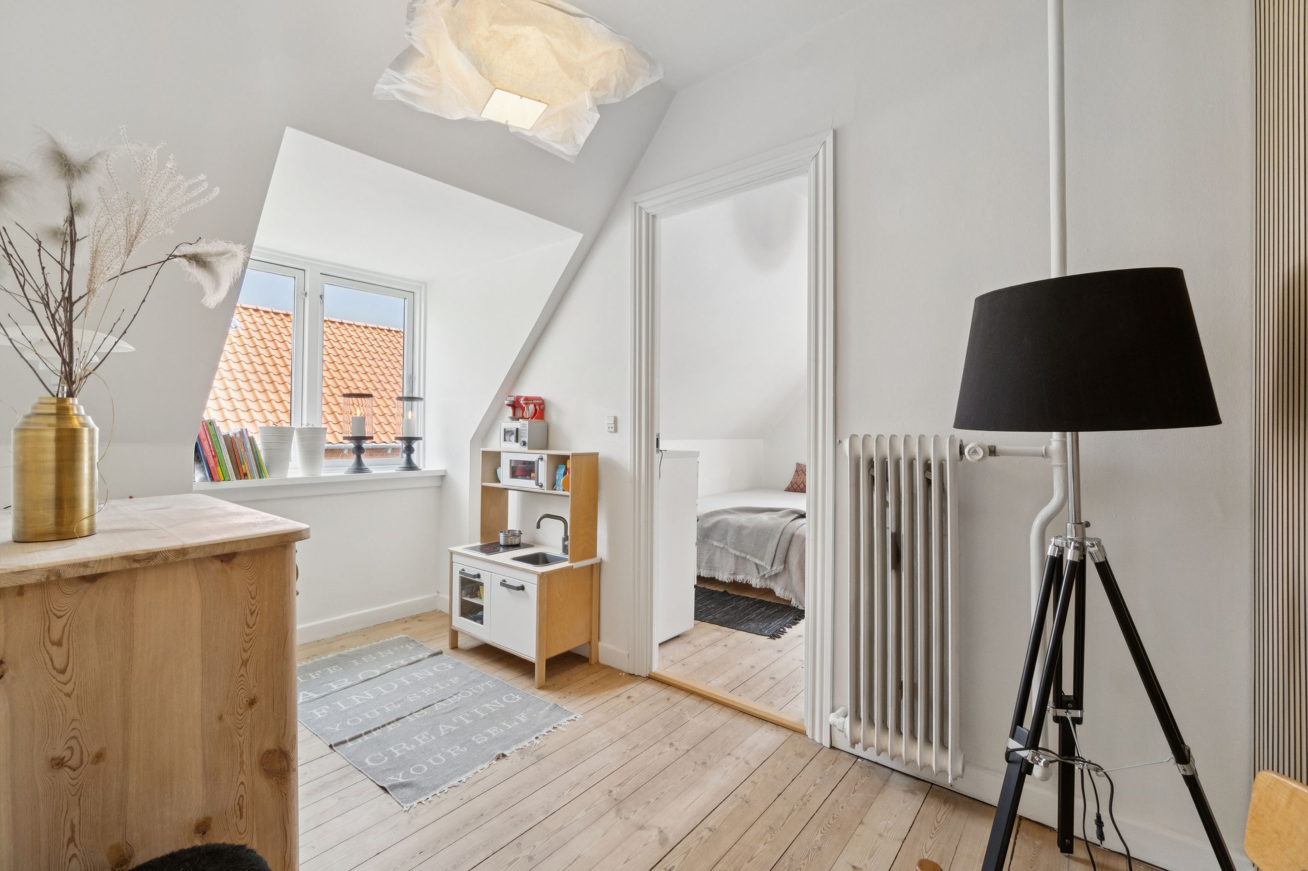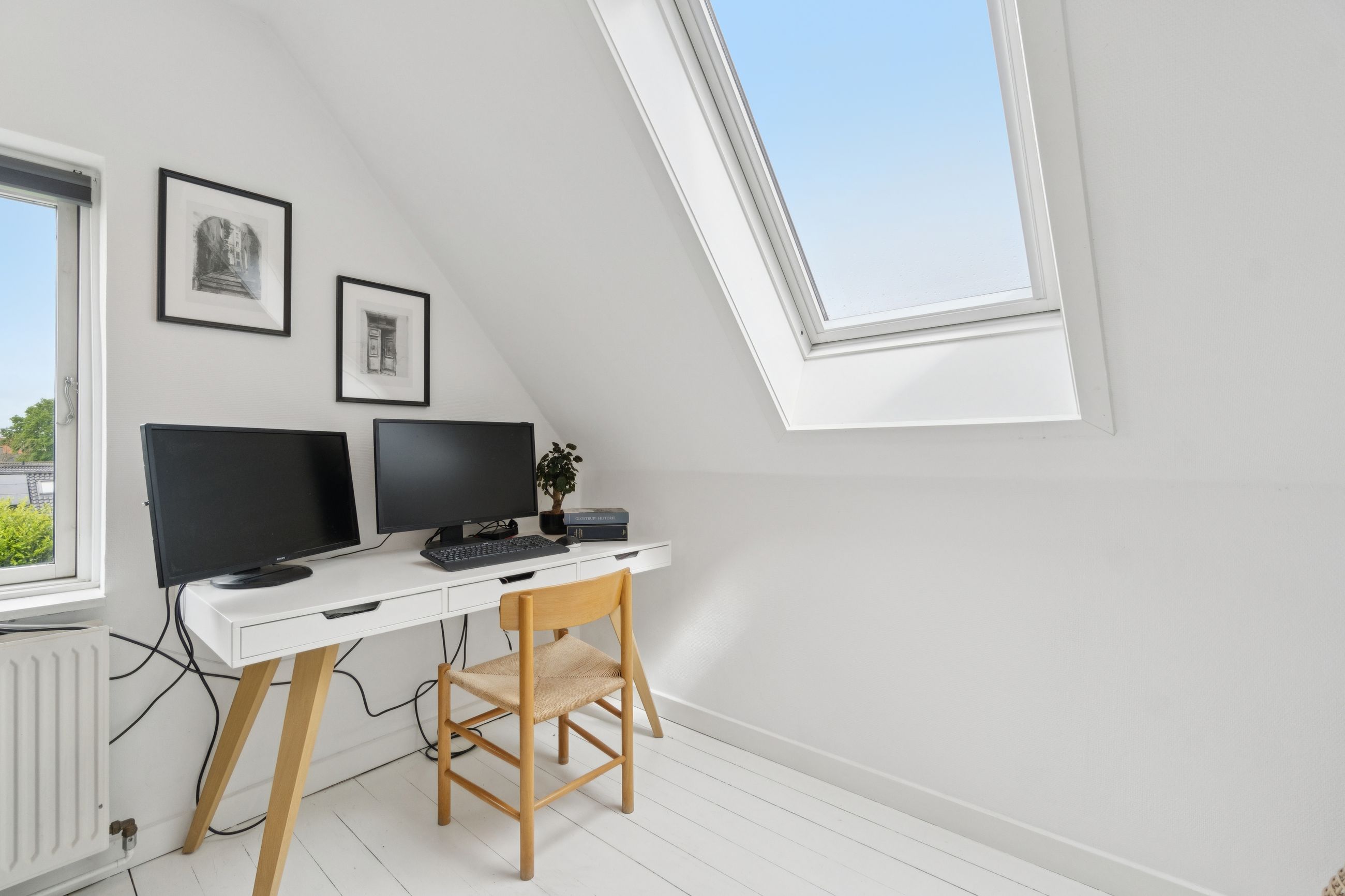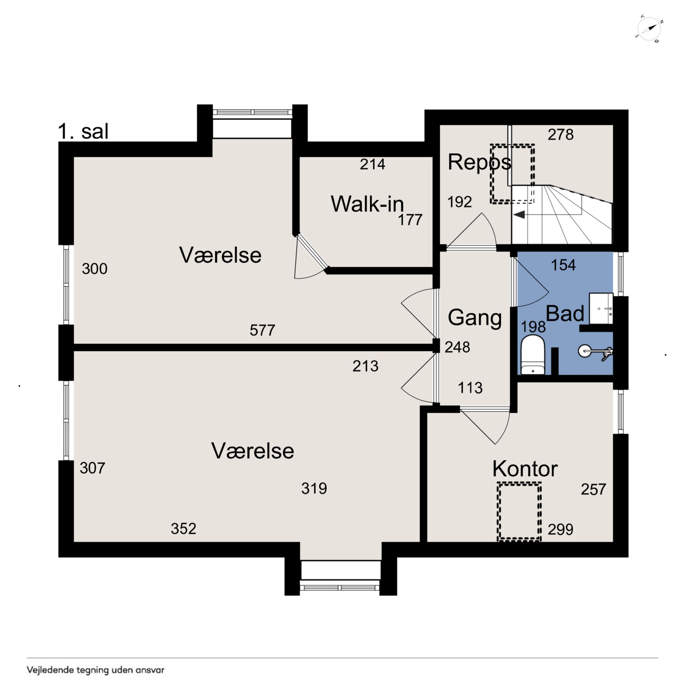 1. salen byder på tre regulære værelser og et elegant badeværelse – samt forældreafdeling med walk-in-closet. Etagen har kviste på begge sider, hvilket sikrer flot lys og god loftshøjde.