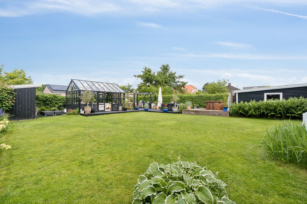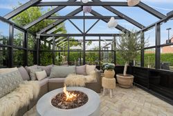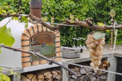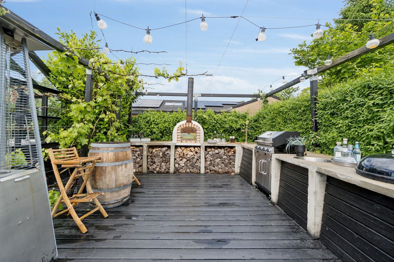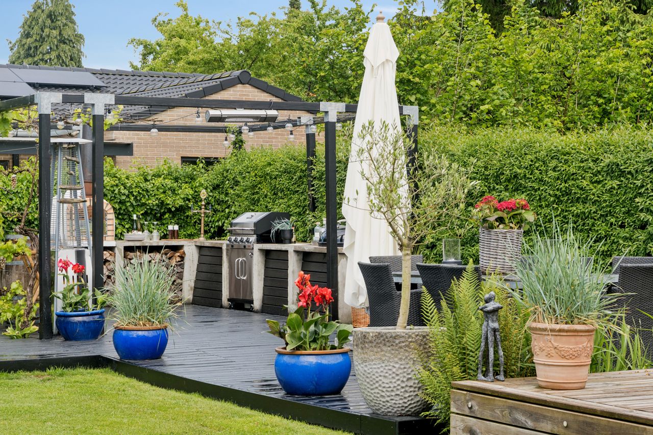 Bagerst i den frodige og solrige have venter et imponerende uderum, der ganske enkelt skal opleves. Her er opført en rustik træterrasse med overdådigt udekøkken i ægte sydlandsk stil – opført i beton og træ, og udstyret med brændefyret pizzaovn, indbygget grill, mulighed for fadølsanlæg, håndvask og masser af bordplads til både madlavning og hygge. Herfra er der direkte adgang til det charmerende orangeri, opført i sort træ med loft til kip, store sprossevinduer hele vejen rundt og æstetisk gulvbelægning i gamle mursten. Orangeriet har strøm og plads til både spisebord og loungemøbler – perfekt til sommerens Tour de France eller lange aftener med et godt glas hvidvin.