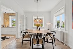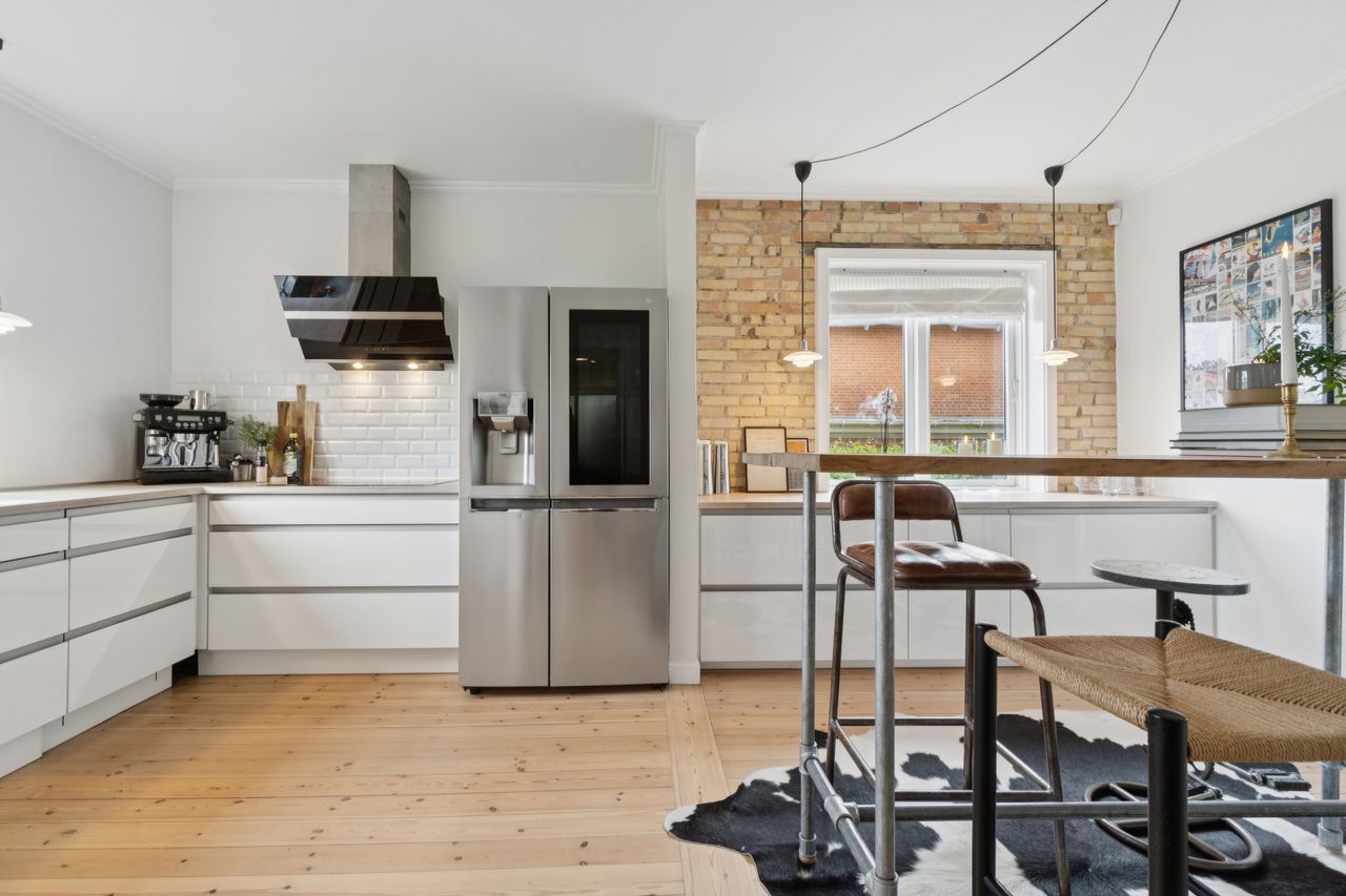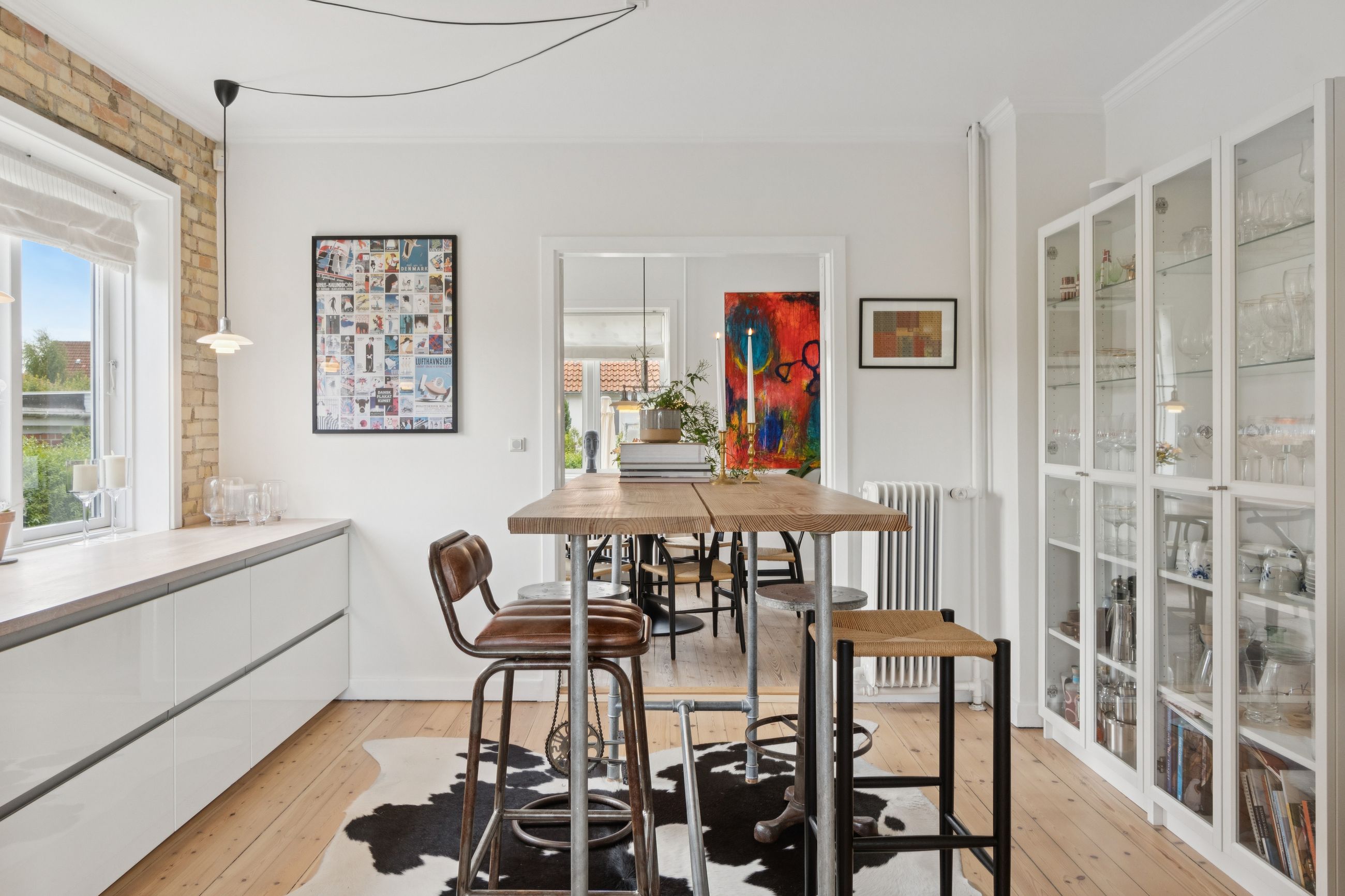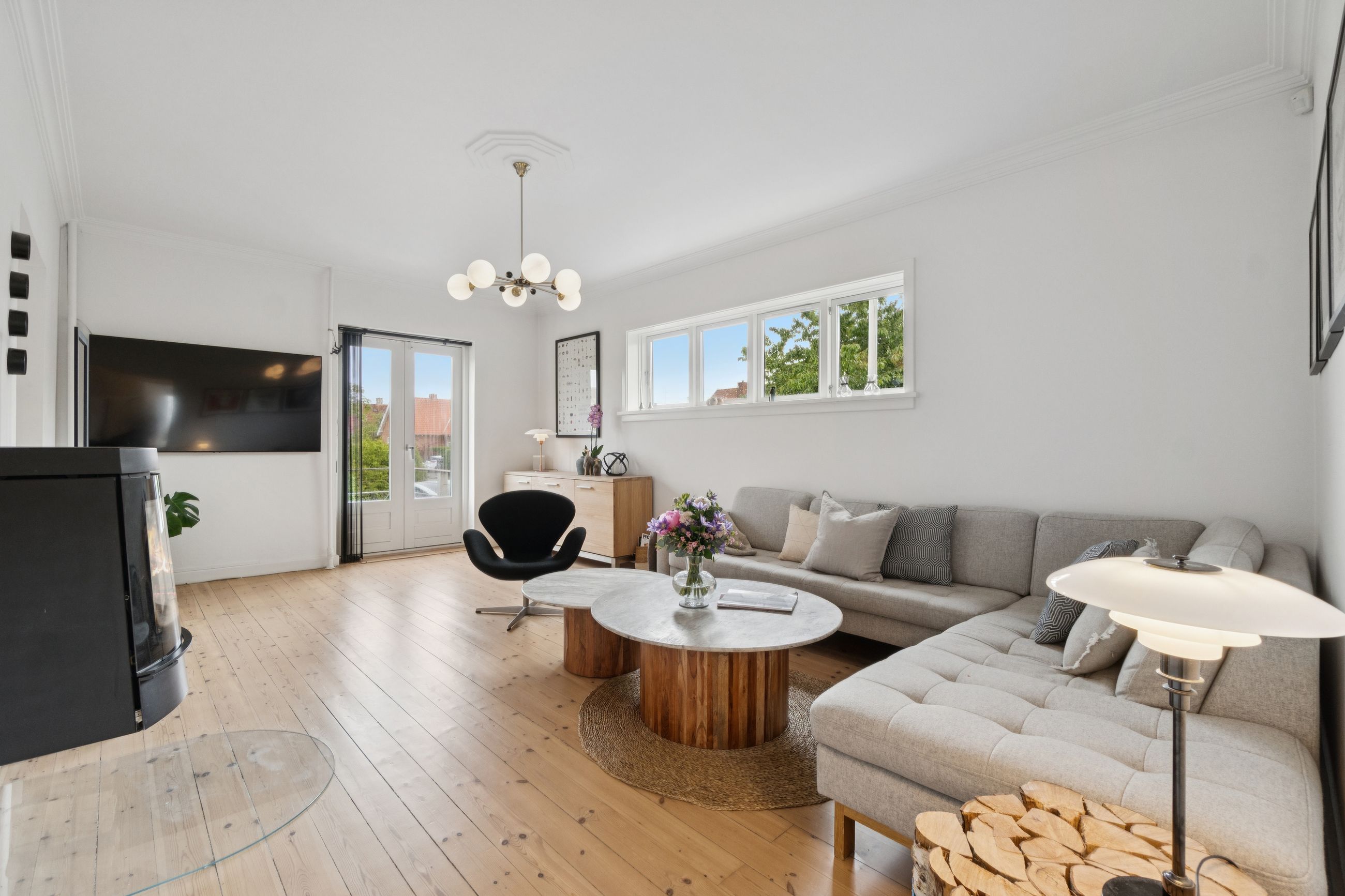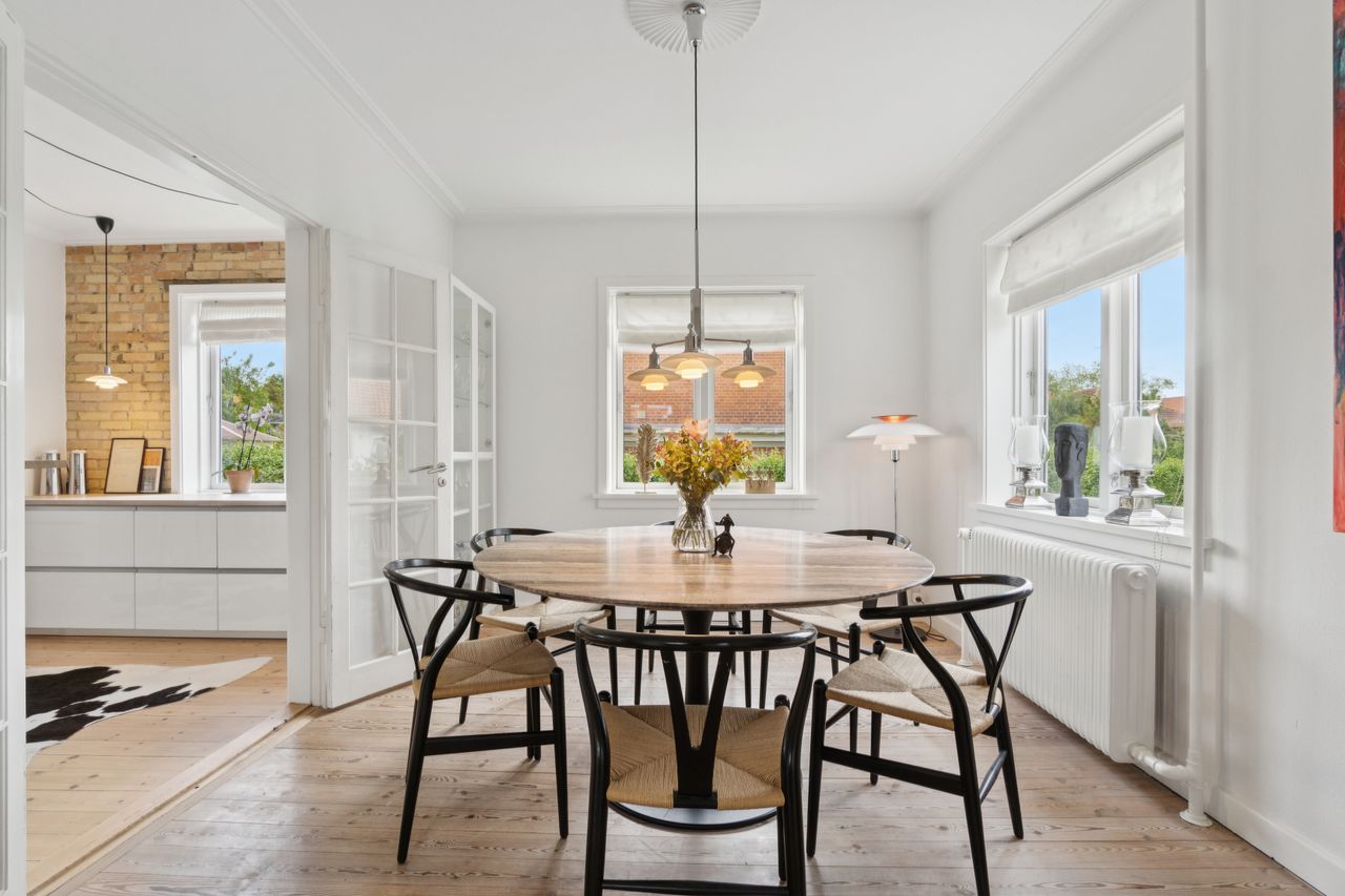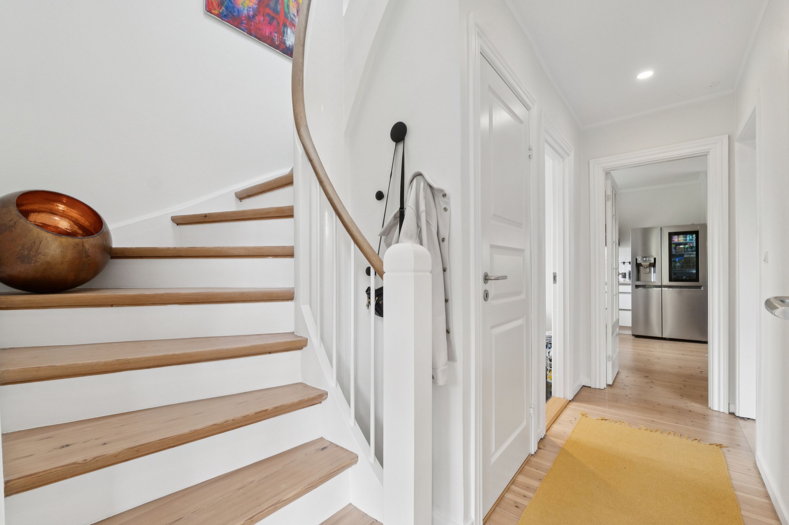Indgangen sker via et åbent vindfang og fører til en lys og velholdt entré med adgang til både stueplan, 1. sal og kælder. I stueplan finder du et lyst og åbent køkken-alrum med stilrent Vordingborg-køkken (2016), amerikanerkøleskab, pyrolyseovn og god skabs- og bordplads. Herfra åbnes dobbeltdøre til spisestuen, og videre til en hyggelig opholdsstue med brændeovn og udgang til en solrig sydvendt terrasse. Hele etagen fremstår yderst indbydende med smukke fyrretræsplankegulve, højt til loftet og masser af lysindfald fra de mange vinduer.