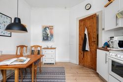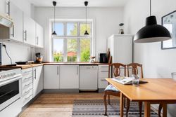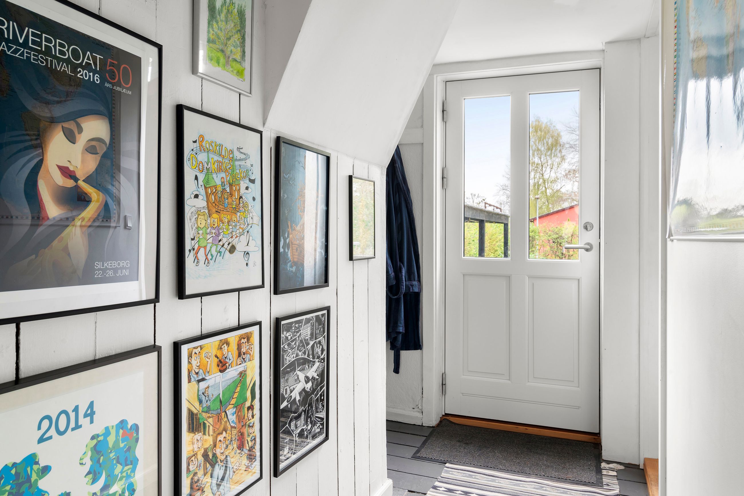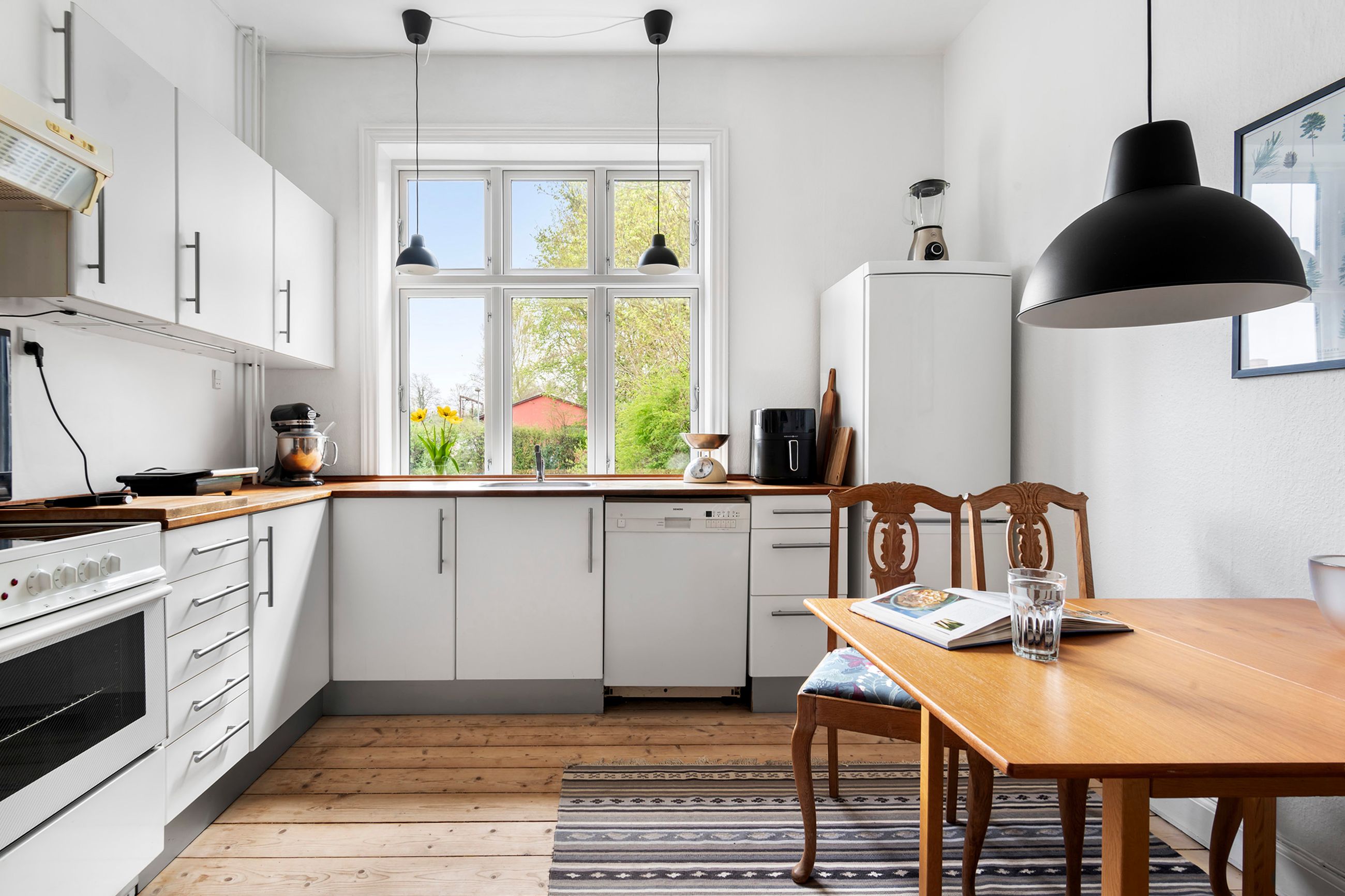 Man bydes velkommen i en rummelig entré med trappe til både 1. sal og underetagen. Herfra er der adgang til boligens lyse og funktionelle køkken med hvide skabsfronter, massiv træbordplade og god plads til opbevaring og madlavning. Der er desuden en hyggelig spiseplads, der fungerer godt til både hverdag og gæster.