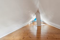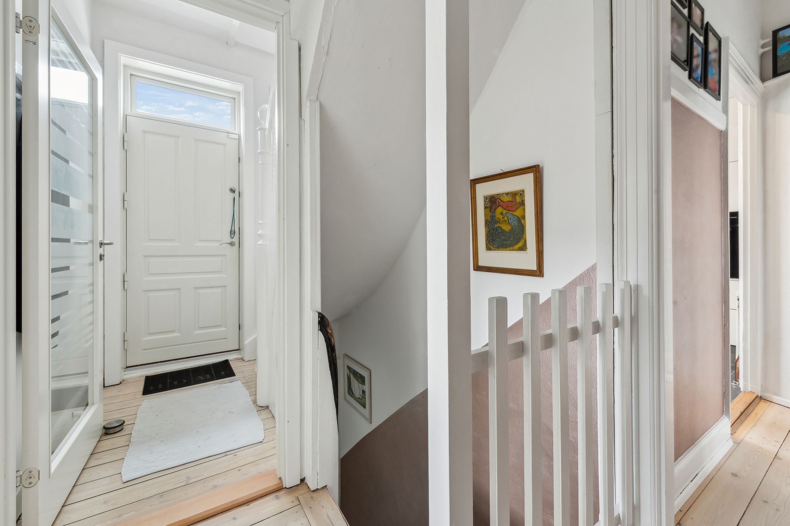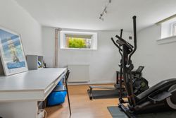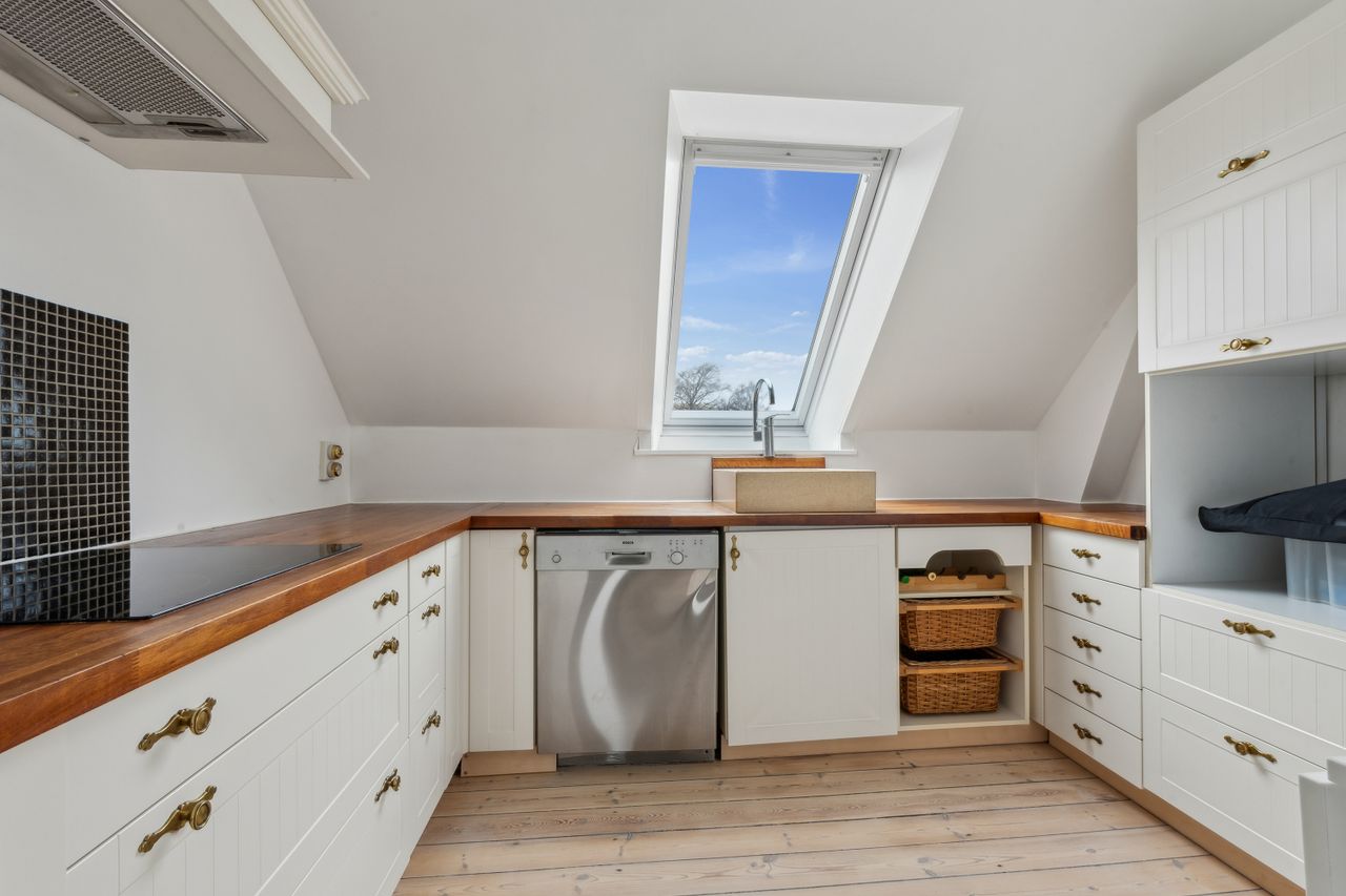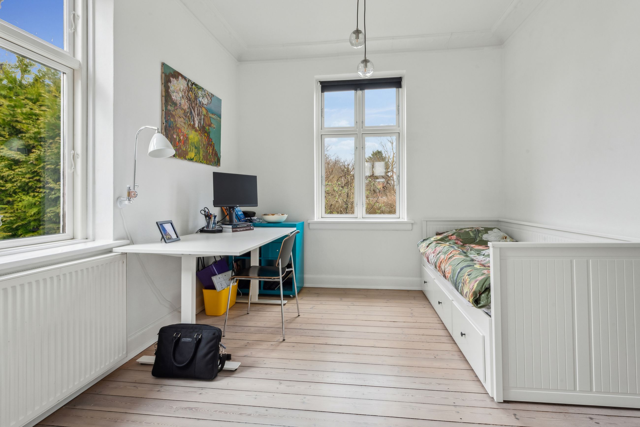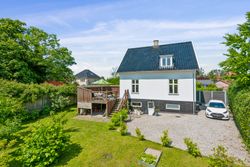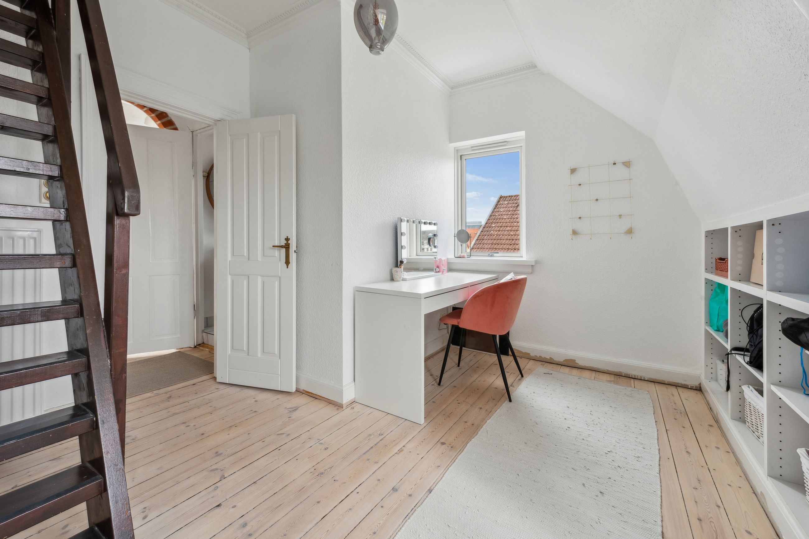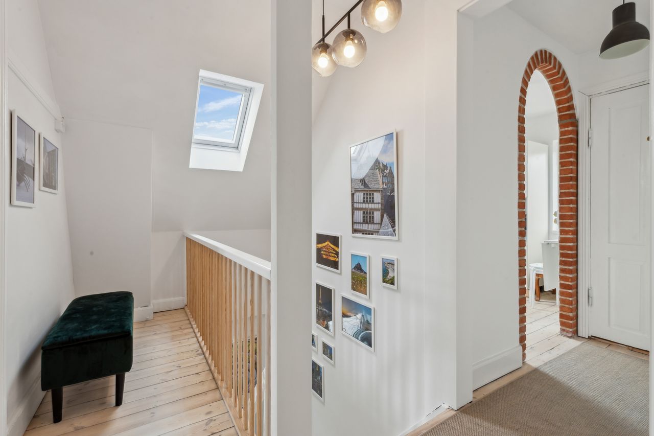 Stueetagen rummer også et praktisk værelse samt et gæstetoilet og et veludstyret køkken, hvor madlavning bliver en fornøjelse. På første sal finder du tre lyse værelser; det ene med en charmerende hems, som kan bruges som legeområde for børnene. Heroppe findes også endnu et køkken samt et badeværelse, hvilket giver mulighed for at skabe en separat boligafdeling om ønsket.