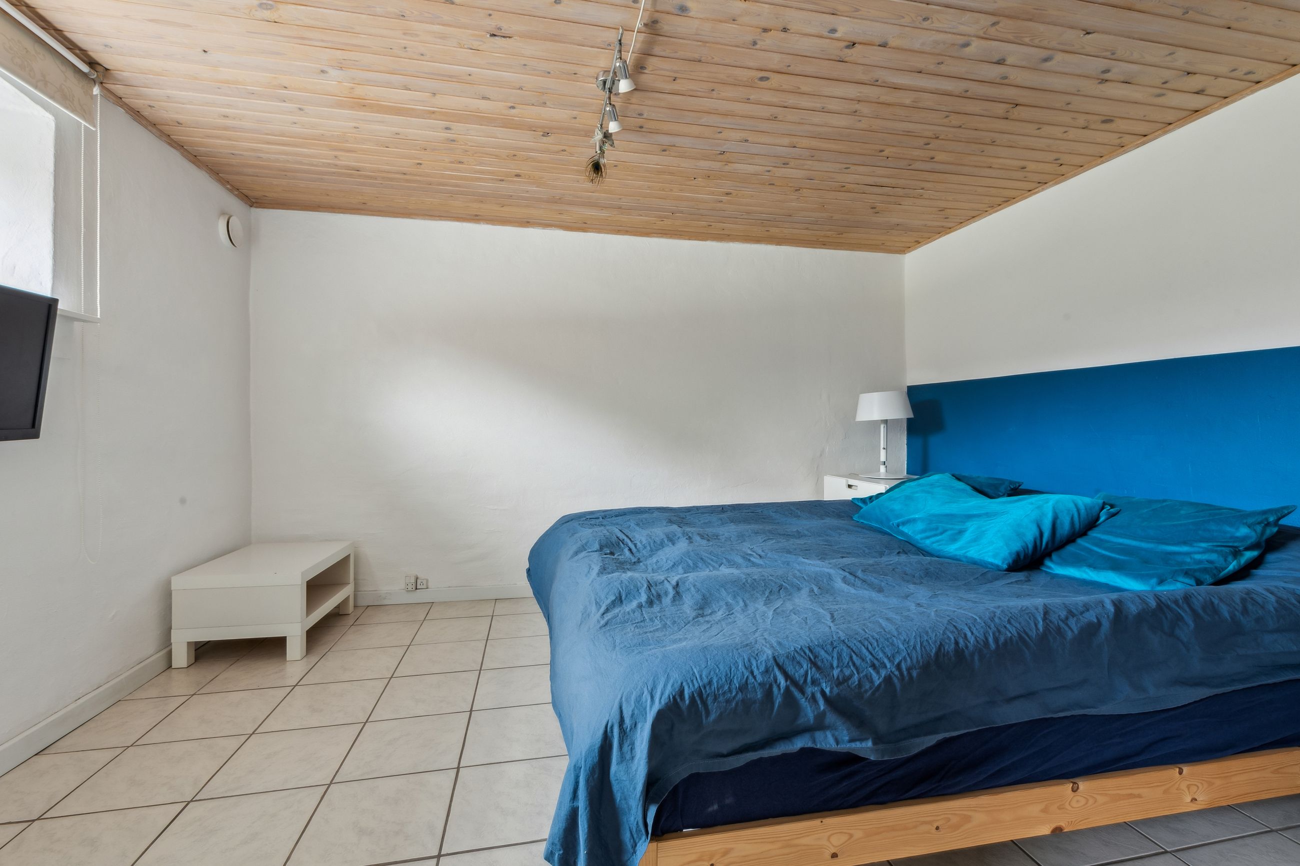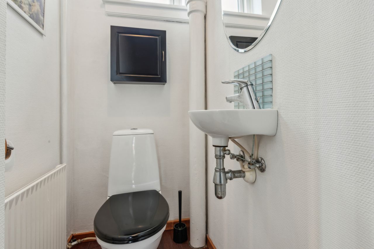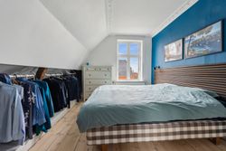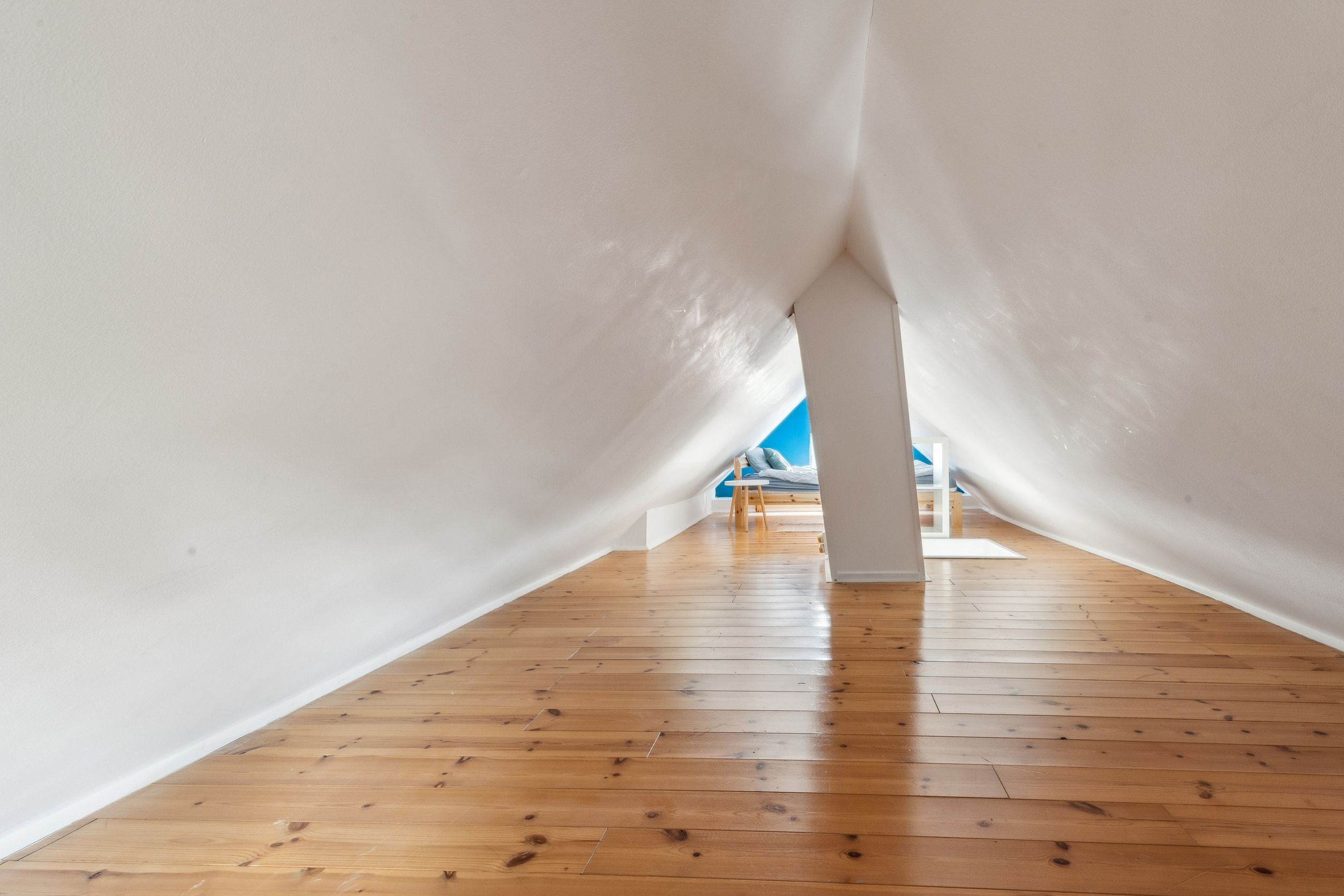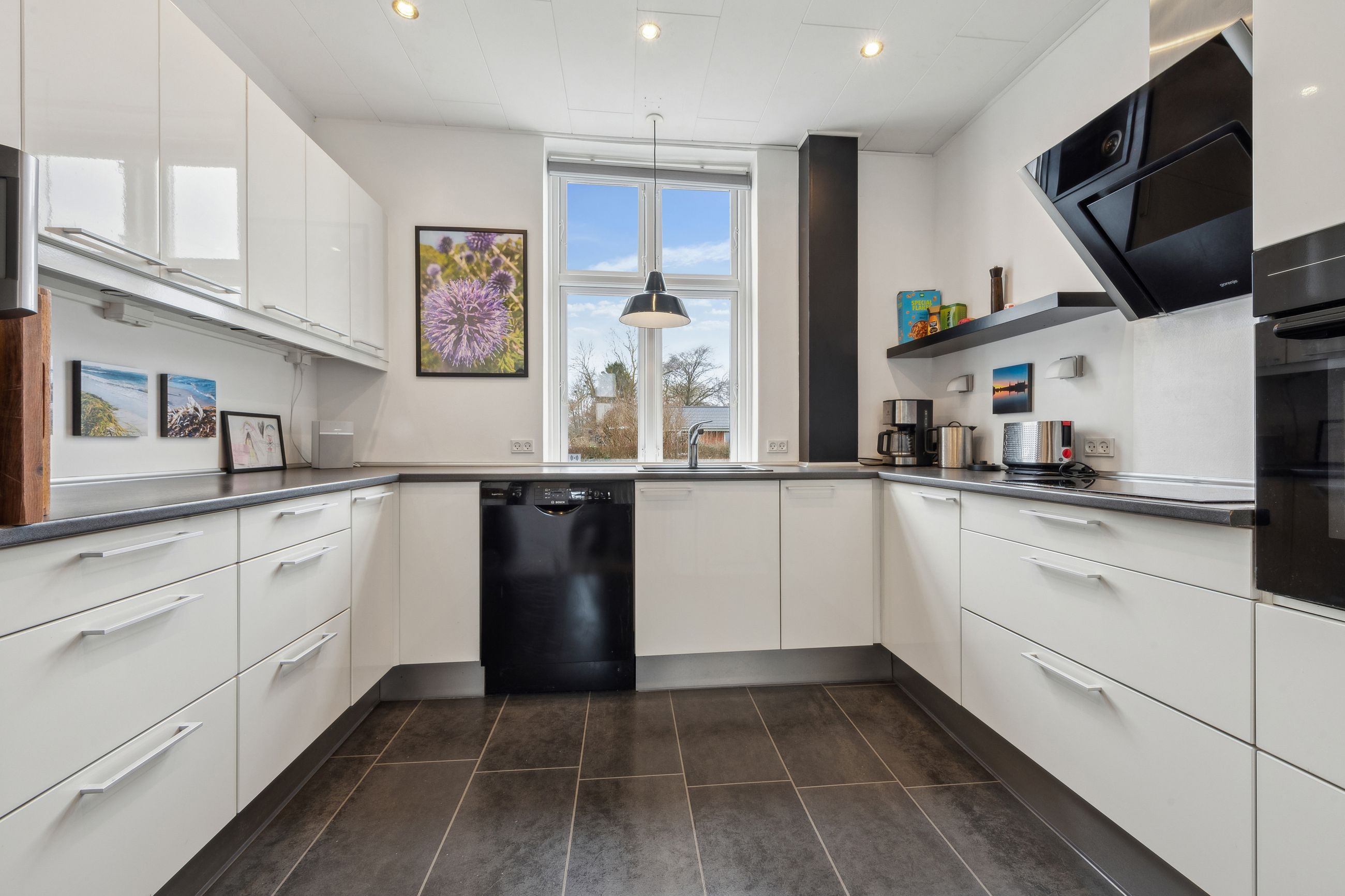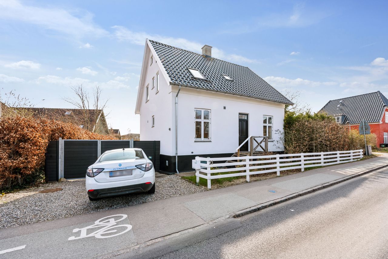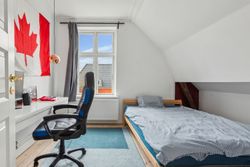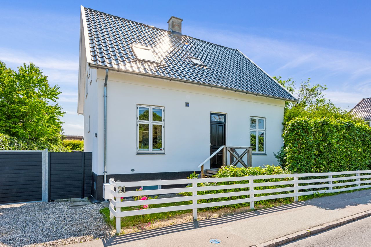 Stueetagen rummer også et praktisk værelse samt et gæstetoilet og et veludstyret køkken, hvor madlavning bliver en fornøjelse. På første sal finder du tre lyse værelser; det ene med en charmerende hems, som kan bruges som legeområde for børnene. Heroppe findes også endnu et køkken samt et badeværelse, hvilket giver mulighed for at skabe en separat boligafdeling om ønsket.