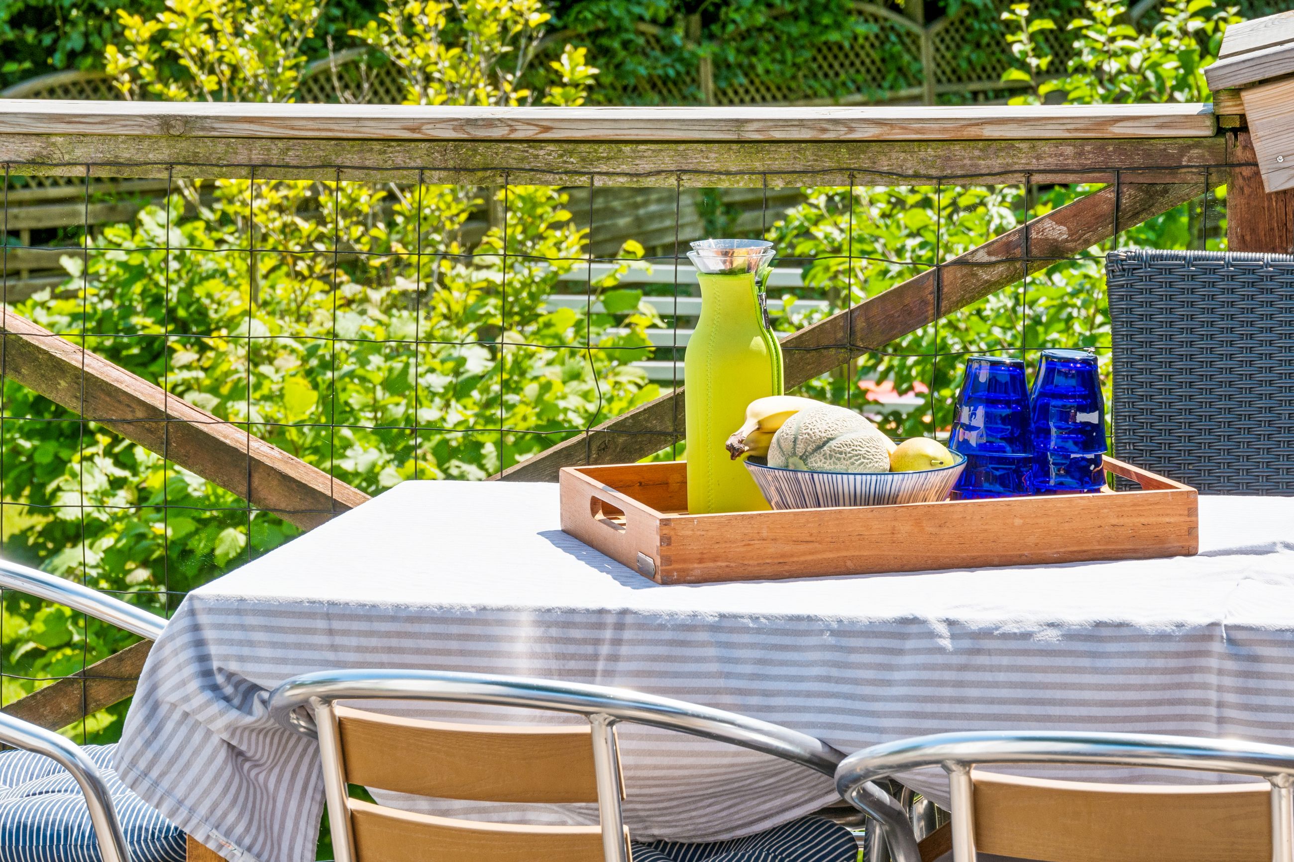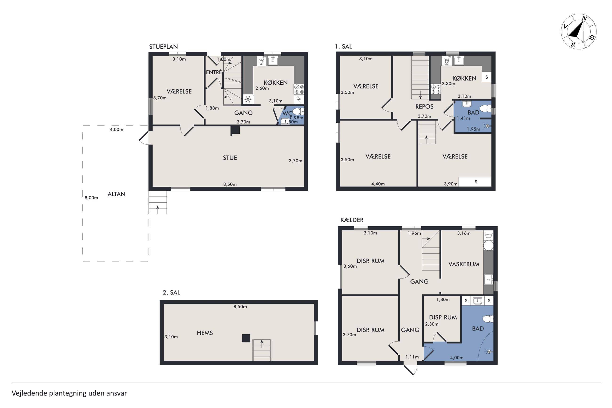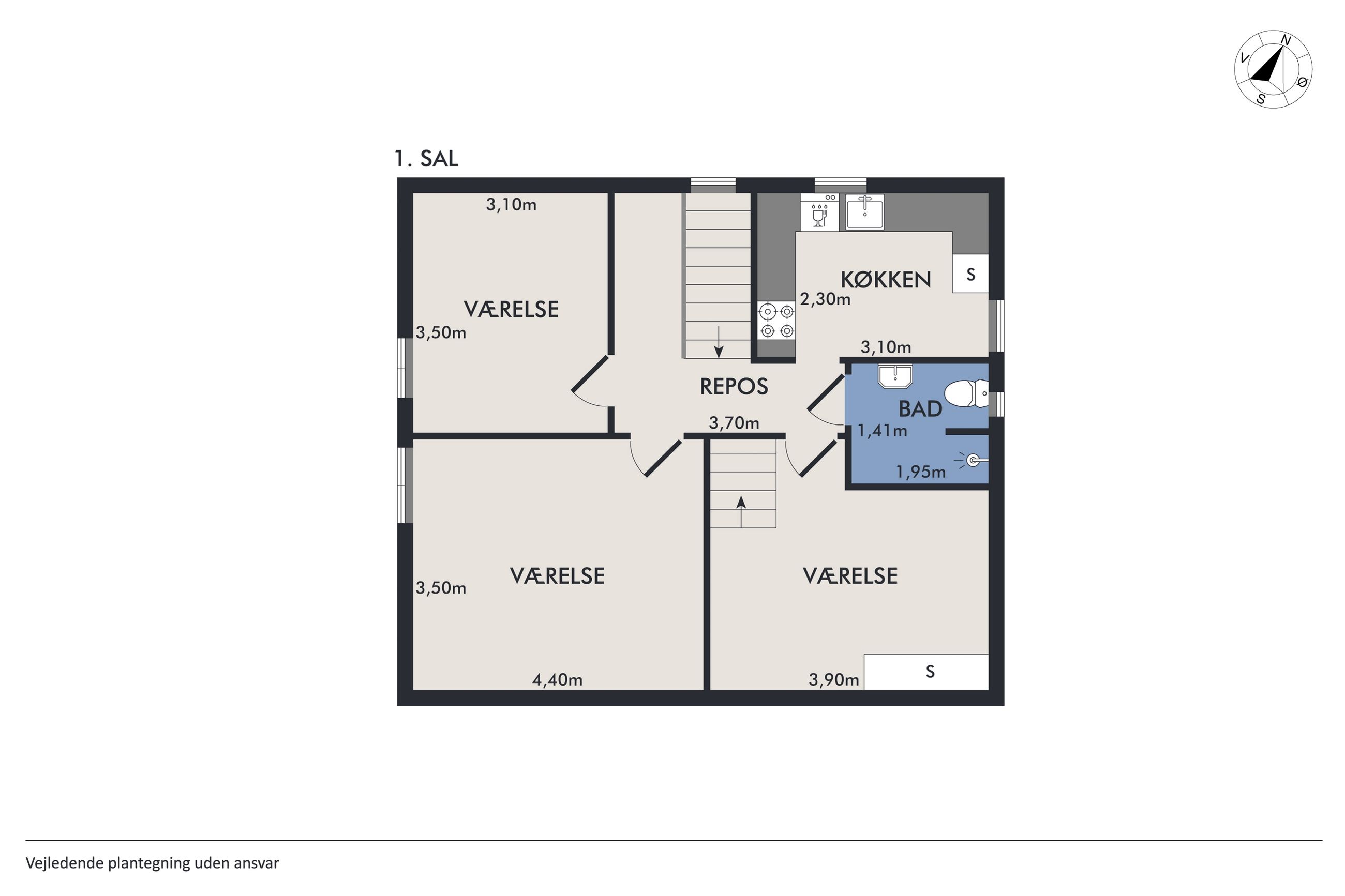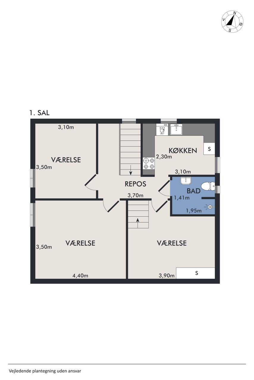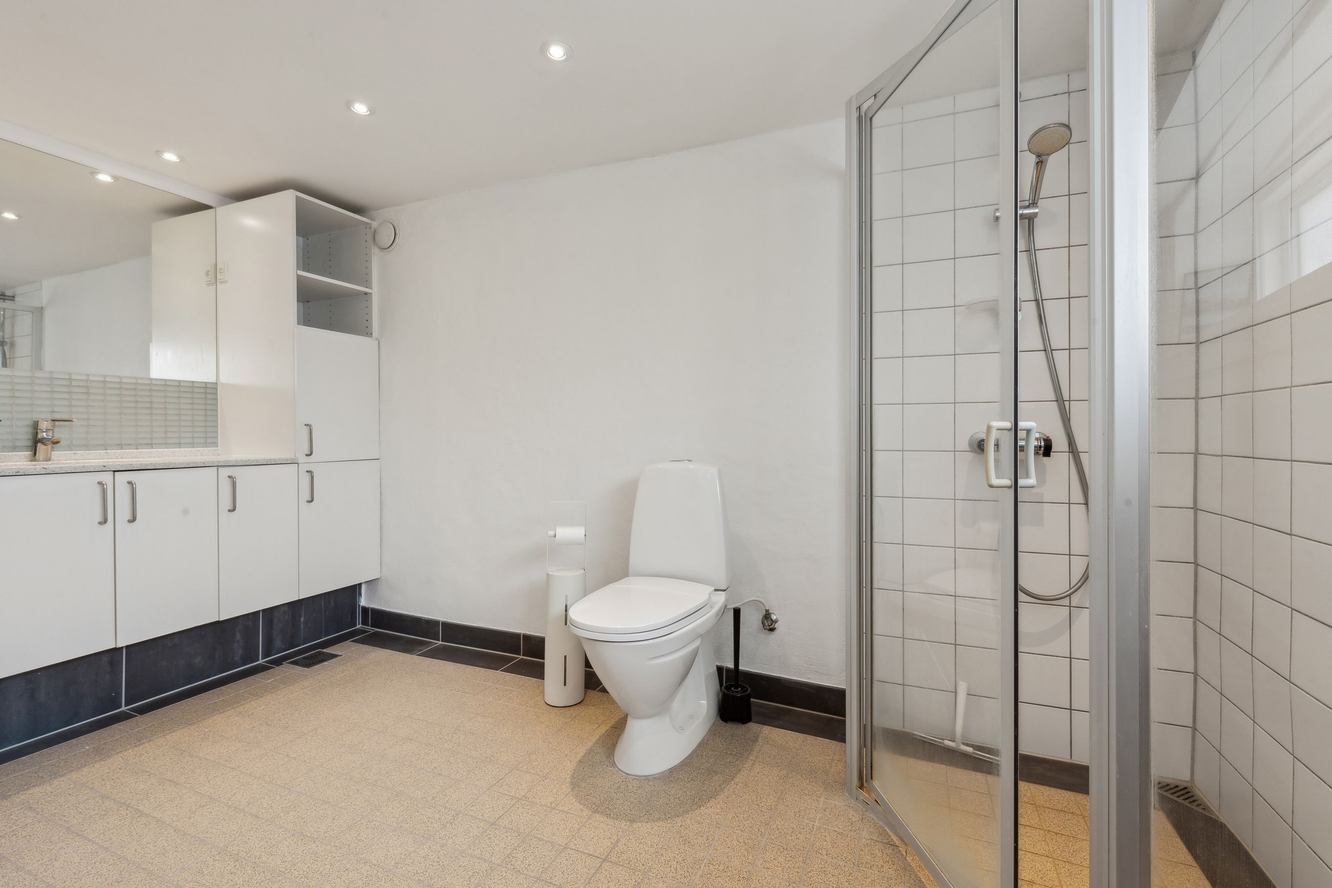 Stueetagen rummer også et praktisk værelse samt et gæstetoilet og et veludstyret køkken, hvor madlavning bliver en fornøjelse. På første sal finder du tre lyse værelser; det ene med en charmerende hems, som kan bruges som legeområde for børnene. Heroppe findes også endnu et køkken samt et badeværelse, hvilket giver mulighed for at skabe en separat boligafdeling om ønsket.
