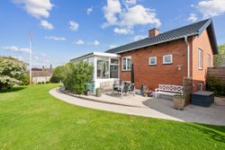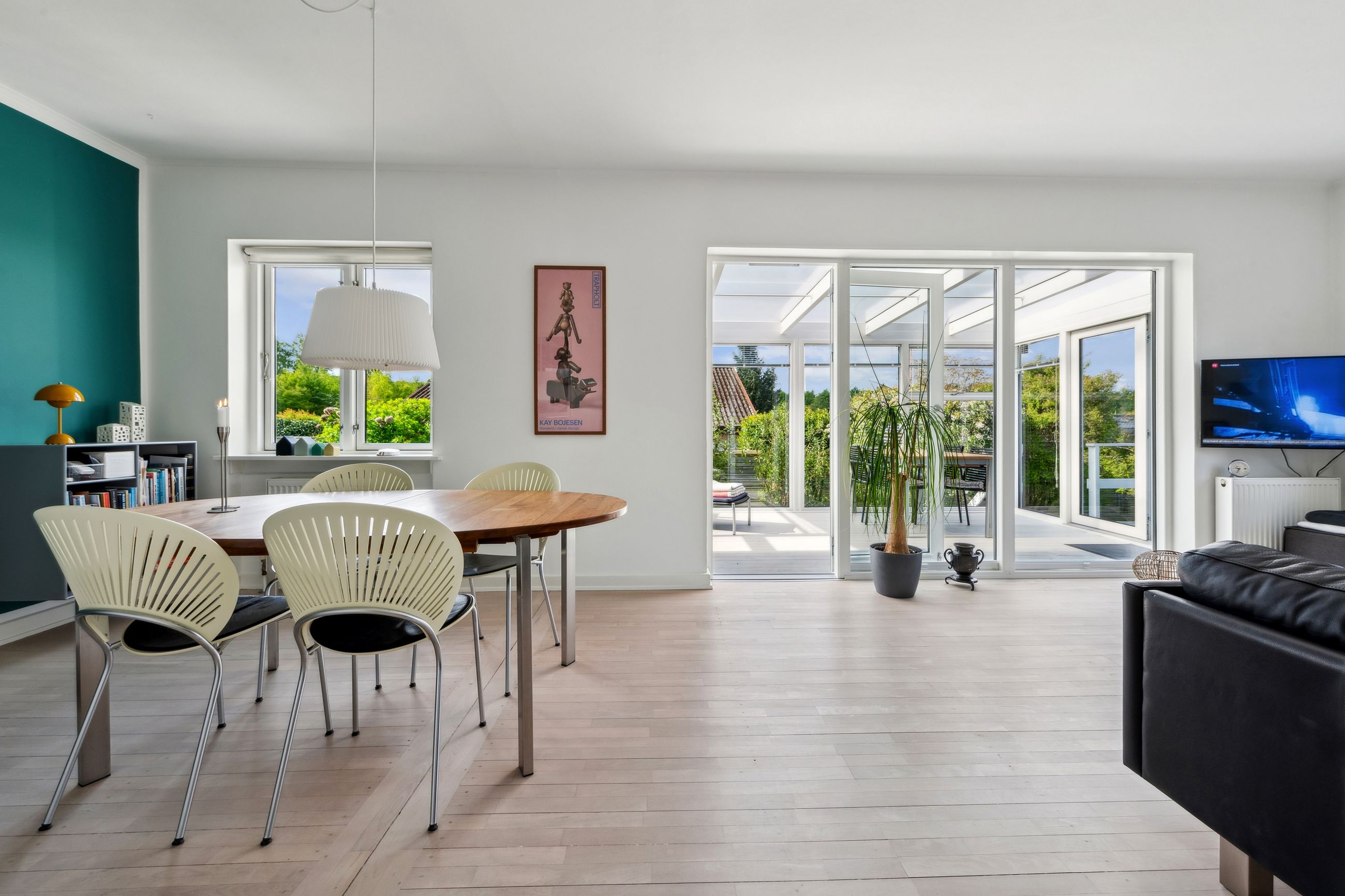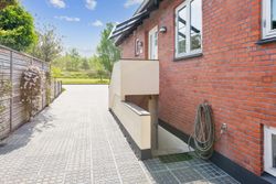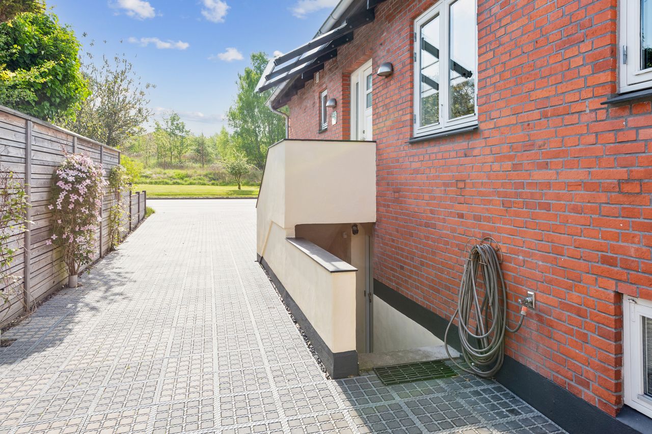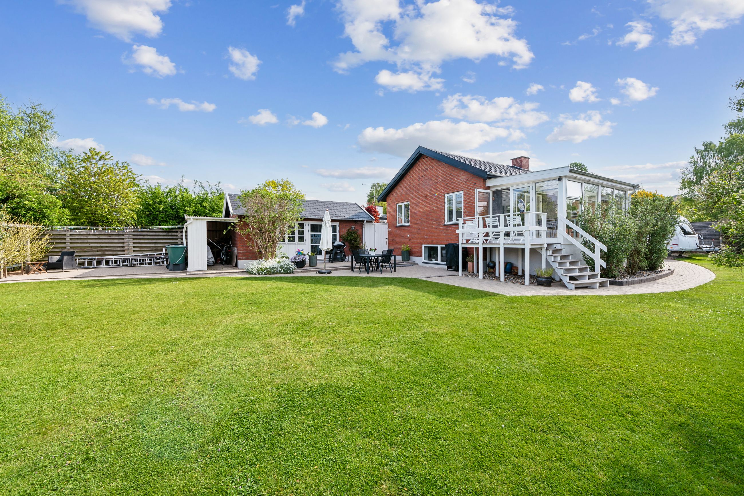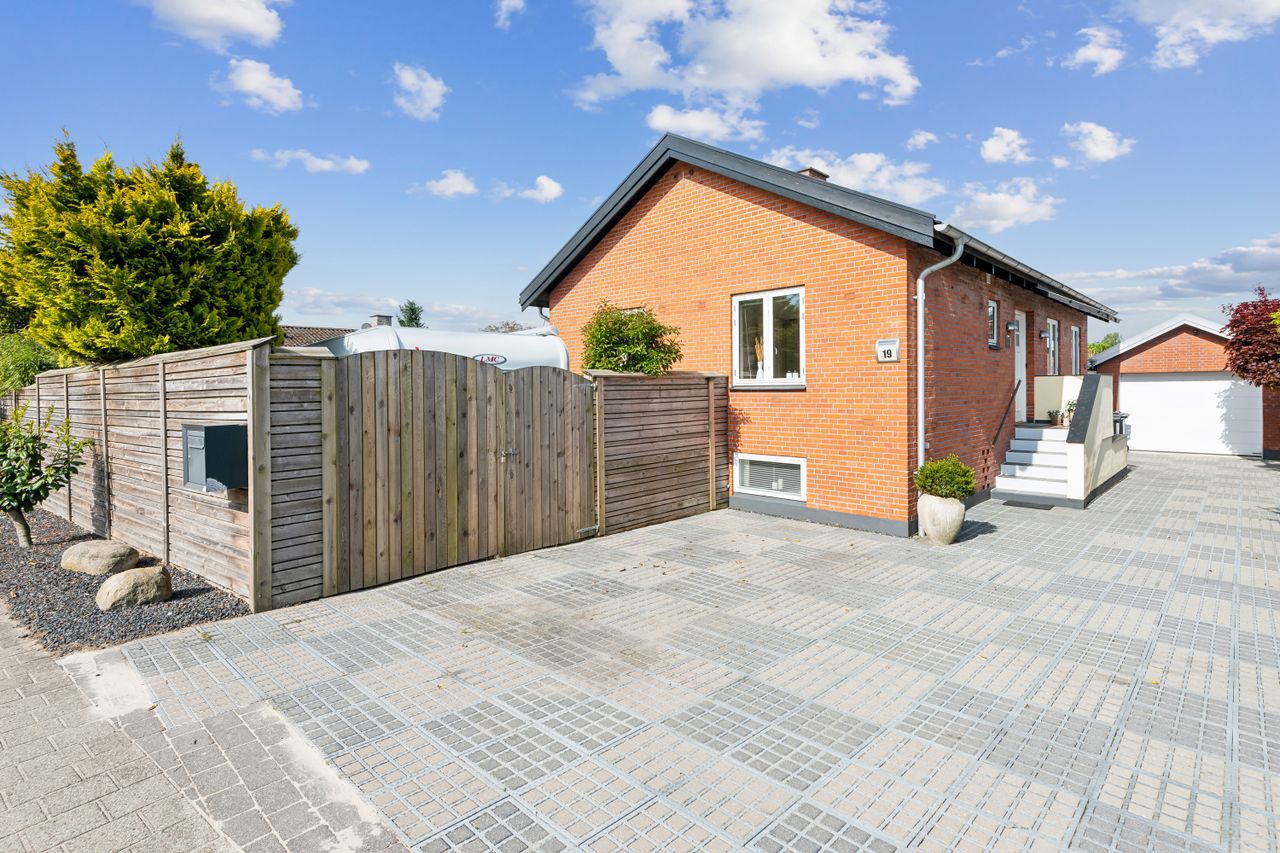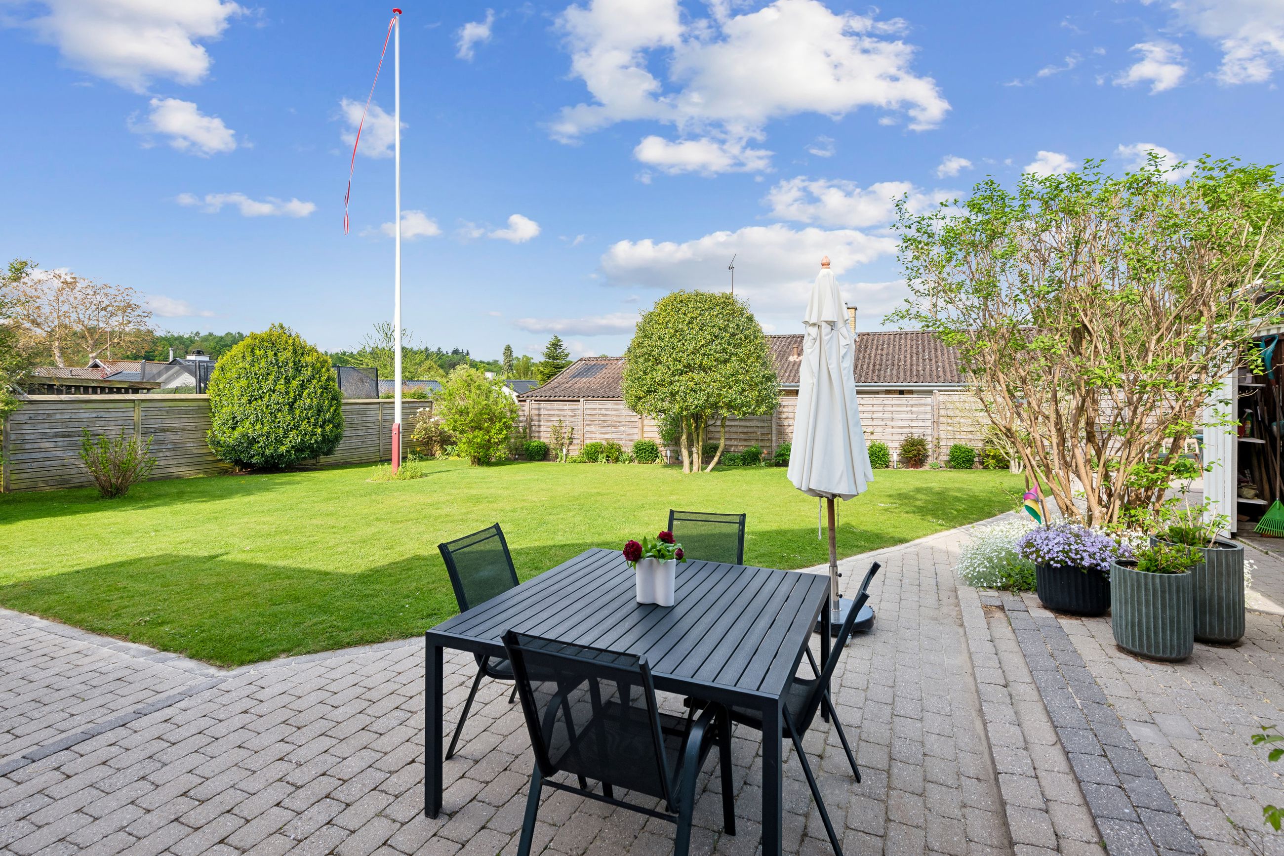 Udenfor venter en skøn solrig have, med flere gode terrassemiljøer. Havefliserne er renset og imprægneret i 2024. Den murede garage er tør og med Hørmann elport. Mod haven et glasparti med to terrassedøre og solpanel der genererer frisk luft til garagen. Hele indkørslen er belagt med miljørigtig belægning der tillader 100% nedsivning af regnvand.