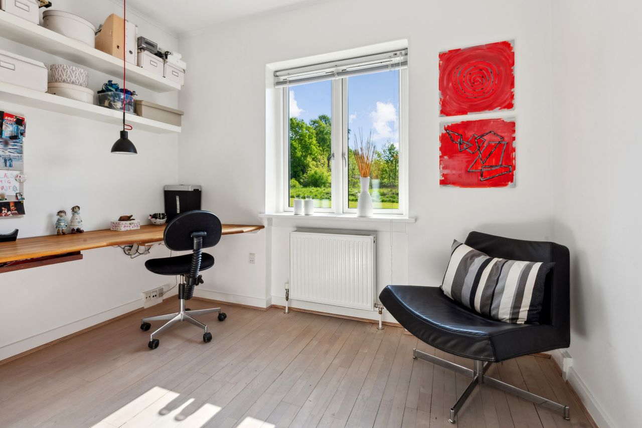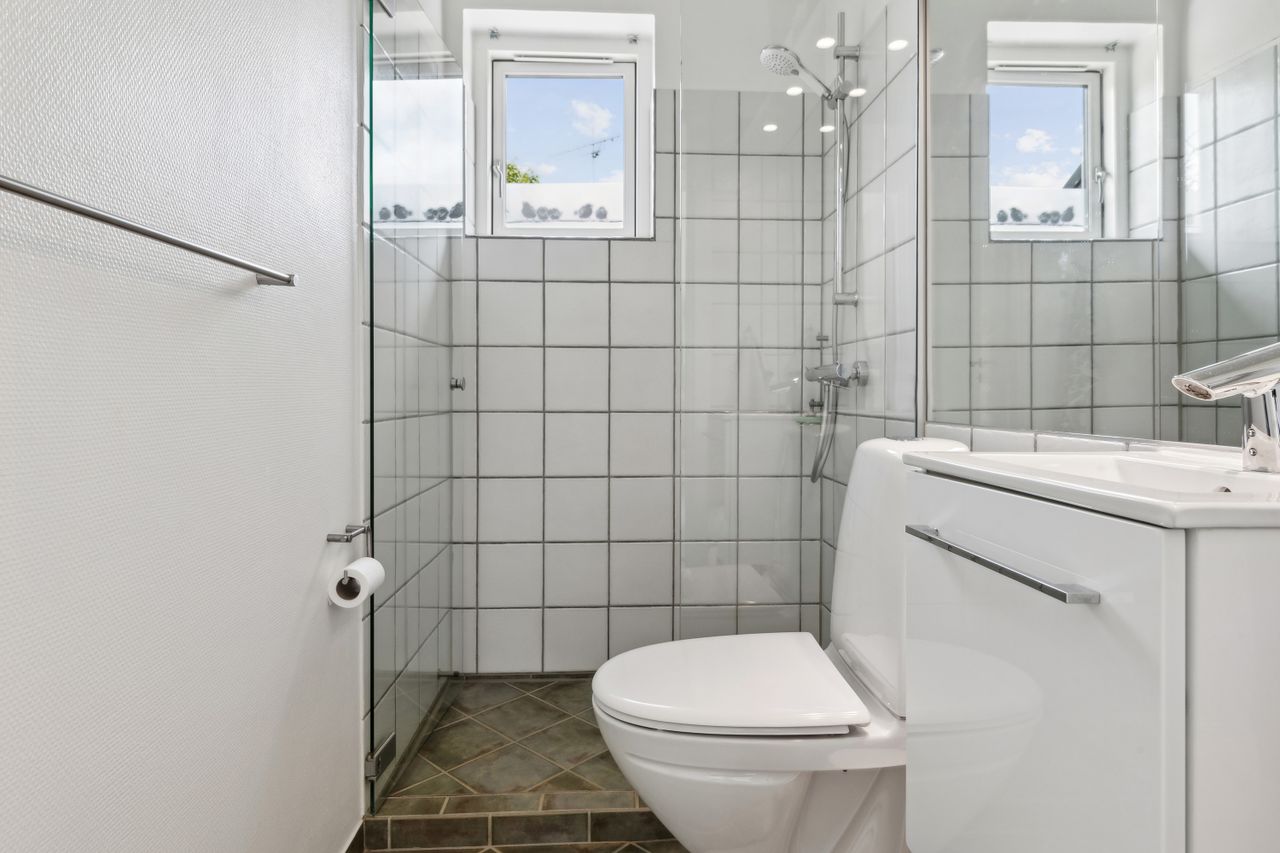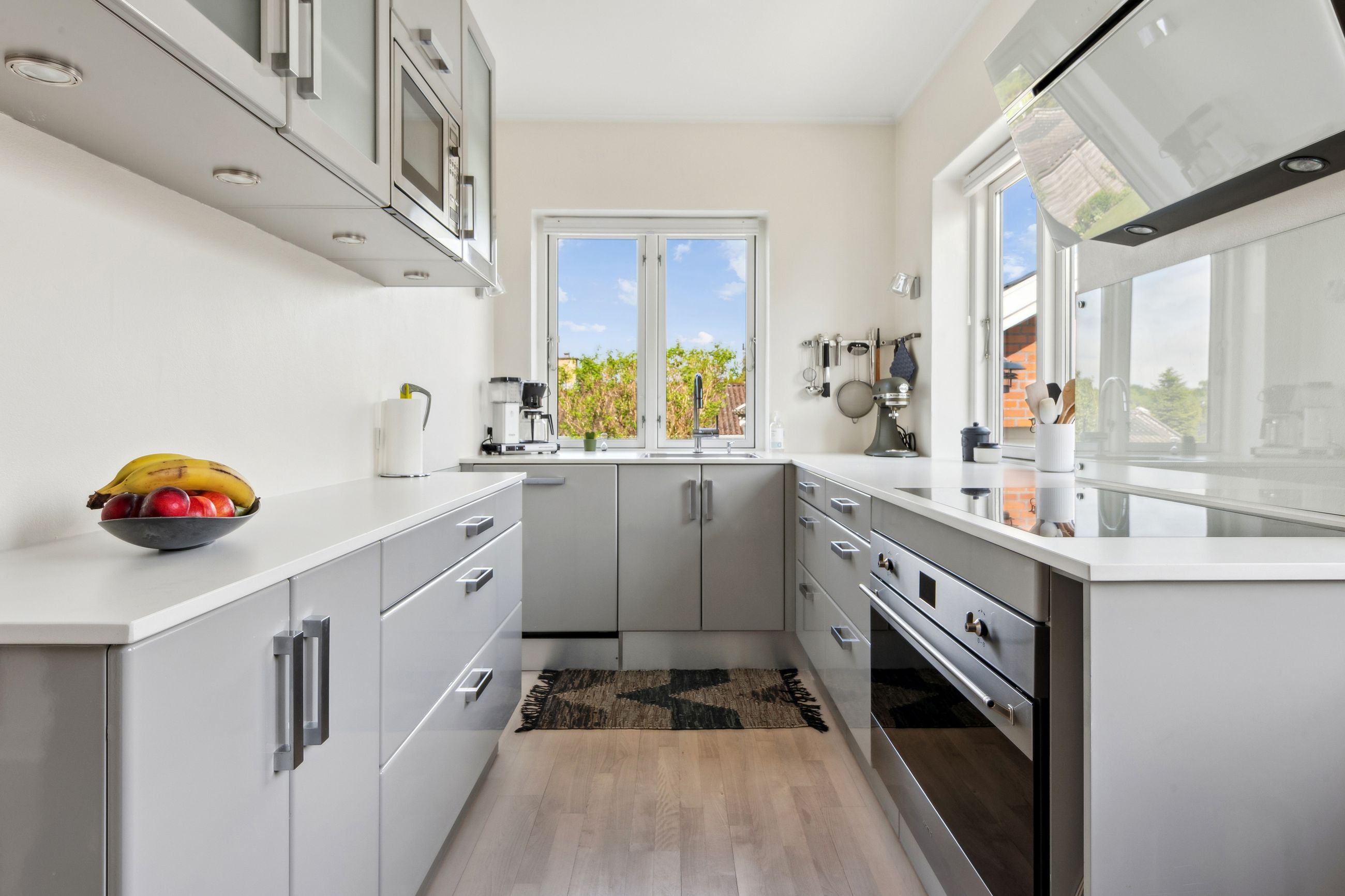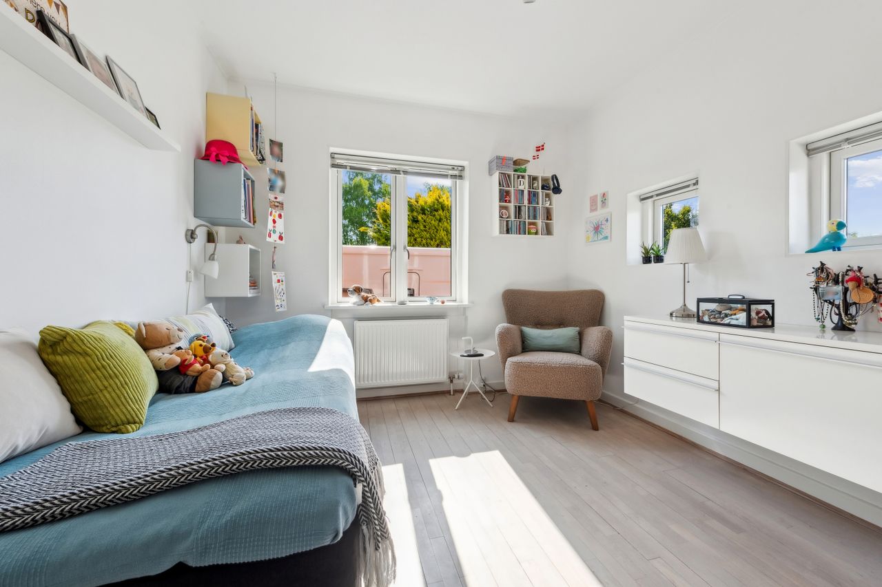 Indretningen er gennemtænkt med to rummelige værelser, oprindeligt tre. Her i overetagen er der gulvvarme i køkken og badeværelse. Badeværelset er elegant designet med brusebad, og blot det ene af to badeværelser. Køkkenet er funktionelt og stilfuldt med direkte adgang til stuen med brændeovn. Fra stuen udgang til en 14 m2 charmerede udestue fra 2019 der fungerer som en forlængelse af stuen, med termovinduer og termotag med solgardiner, samt dobbeltdør til træterrasse med nedgang til haven. Udestuen er højt beliggende med udsigt over hustagene til trætoppene i Præstevang skov. Der er sol i udestuen fra morgen til sen aften og herfra kan nyde smukke solnedgange på himlen.