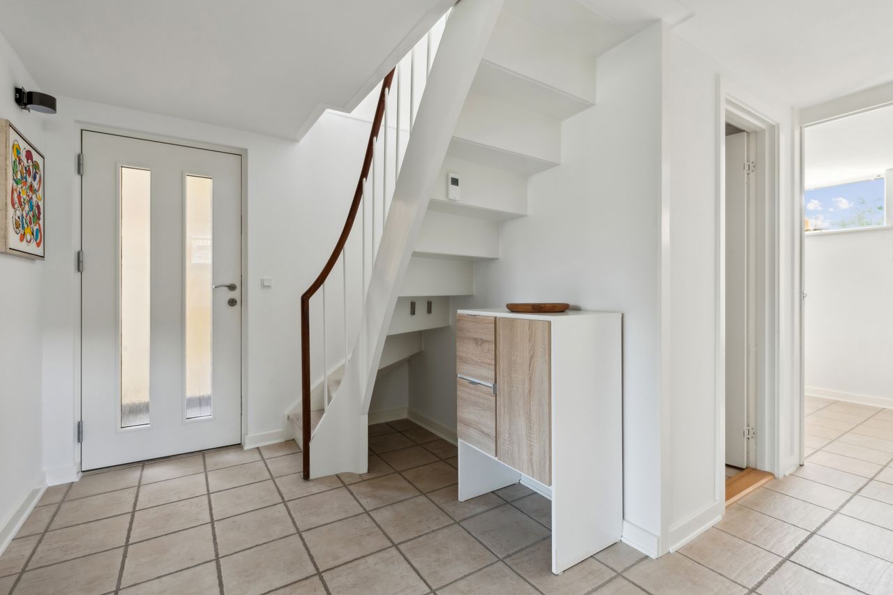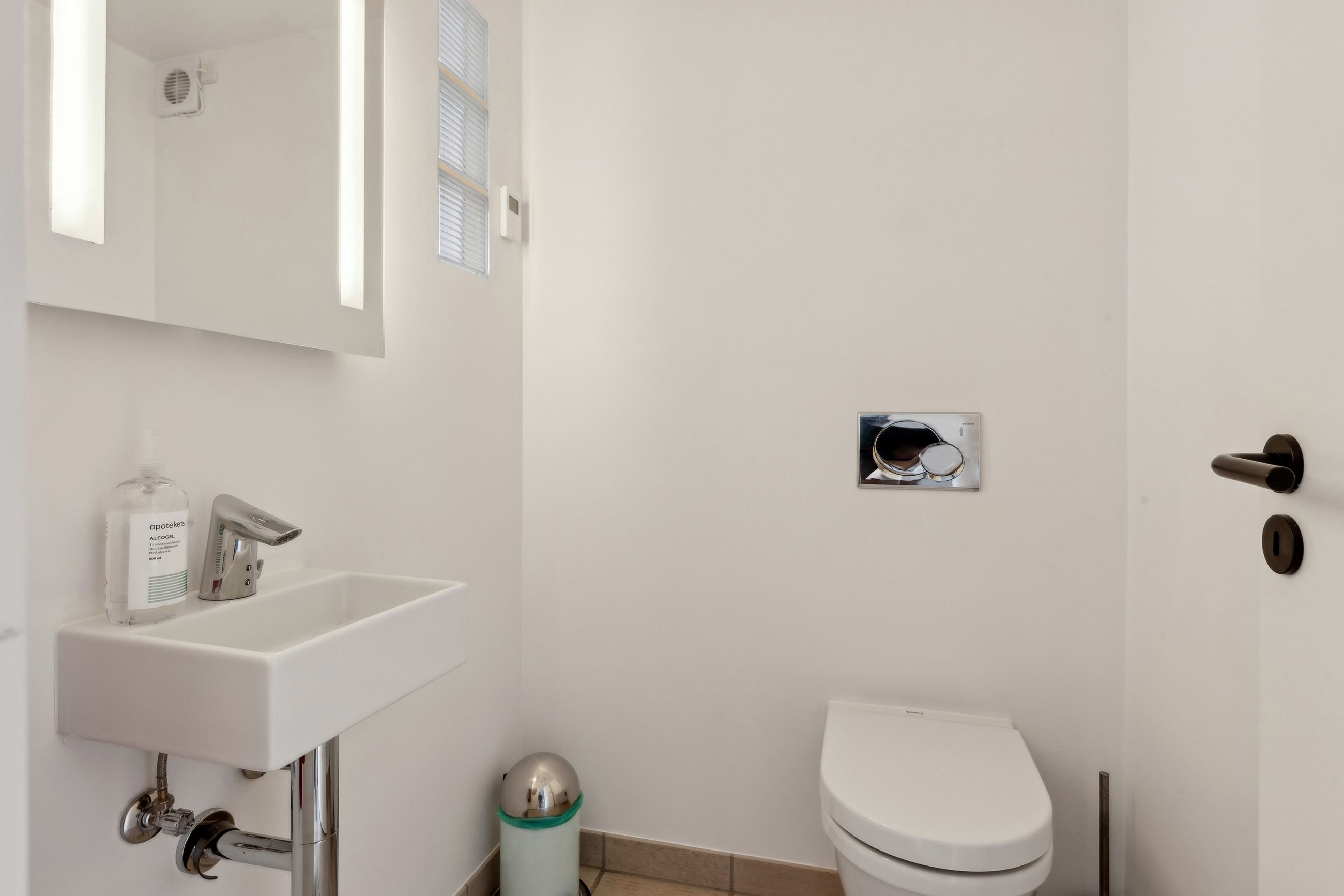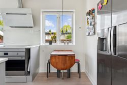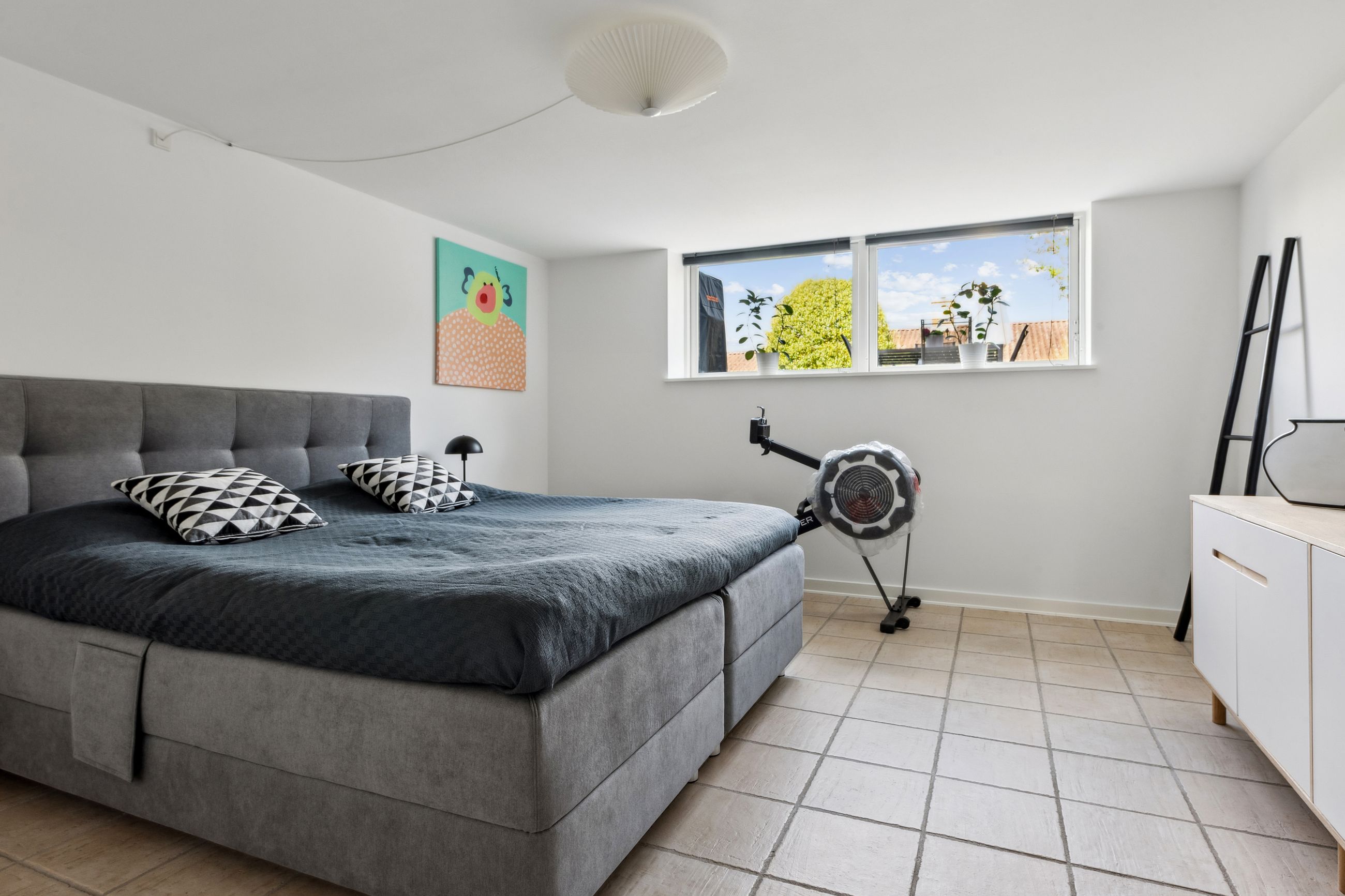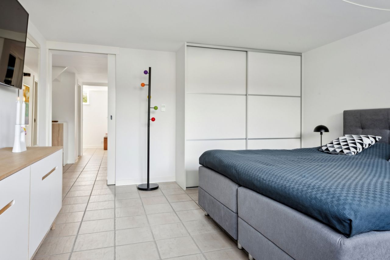 Indretningen er gennemtænkt med to rummelige værelser, oprindeligt tre. Her i overetagen er der gulvvarme i køkken og badeværelse. Badeværelset er elegant designet med brusebad, og blot det ene af to badeværelser. Køkkenet er funktionelt og stilfuldt med direkte adgang til stuen med brændeovn. Fra stuen udgang til en 14 m2 charmerede udestue fra 2019 der fungerer som en forlængelse af stuen, med termovinduer og termotag med solgardiner, samt dobbeltdør til træterrasse med nedgang til haven. Udestuen er højt beliggende med udsigt over hustagene til trætoppene i Præstevang skov. Der er sol i udestuen fra morgen til sen aften og herfra kan nyde smukke solnedgange på himlen.