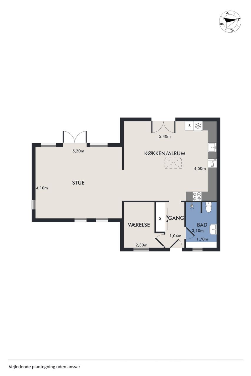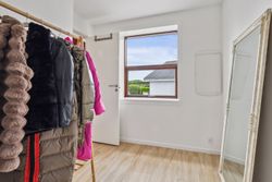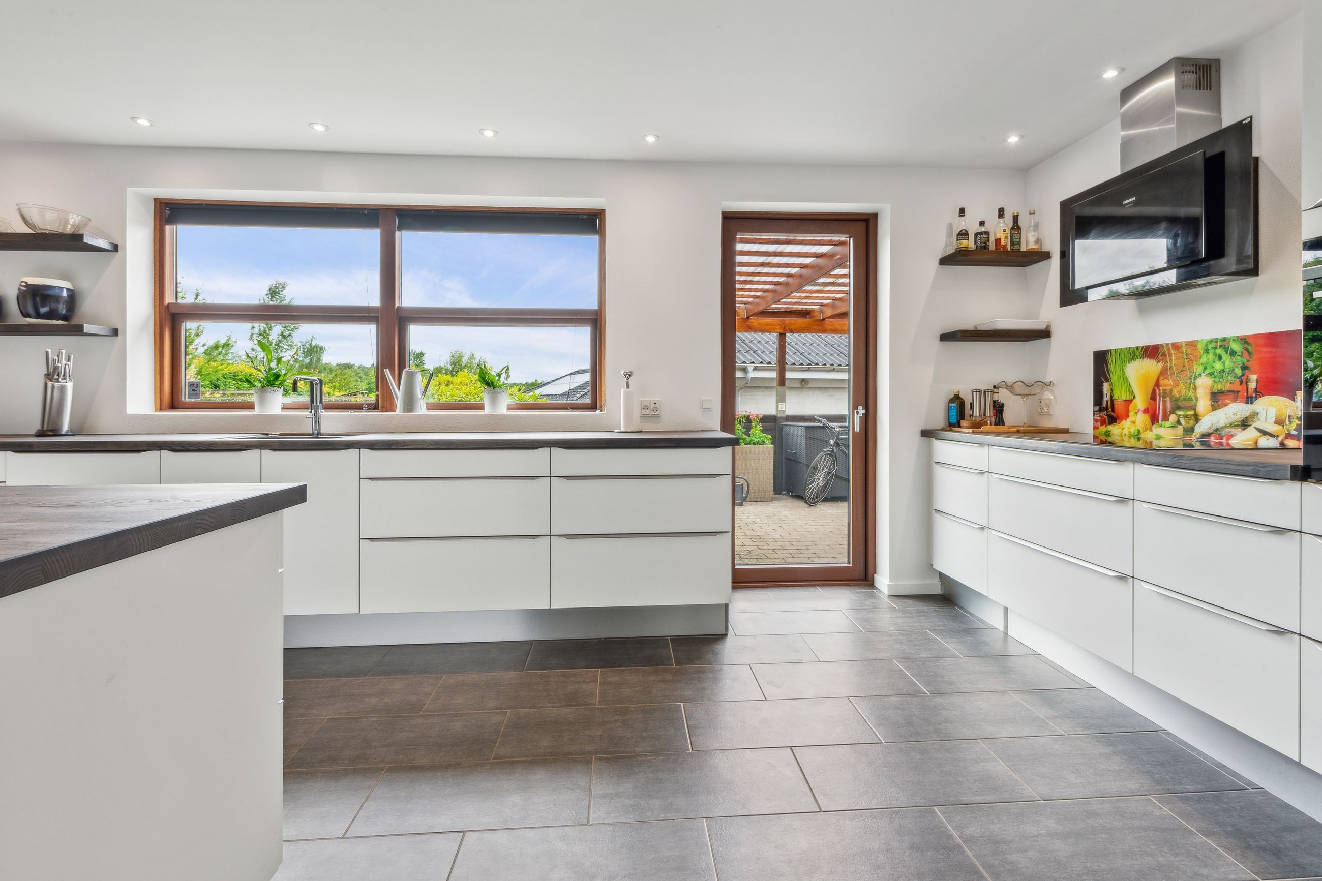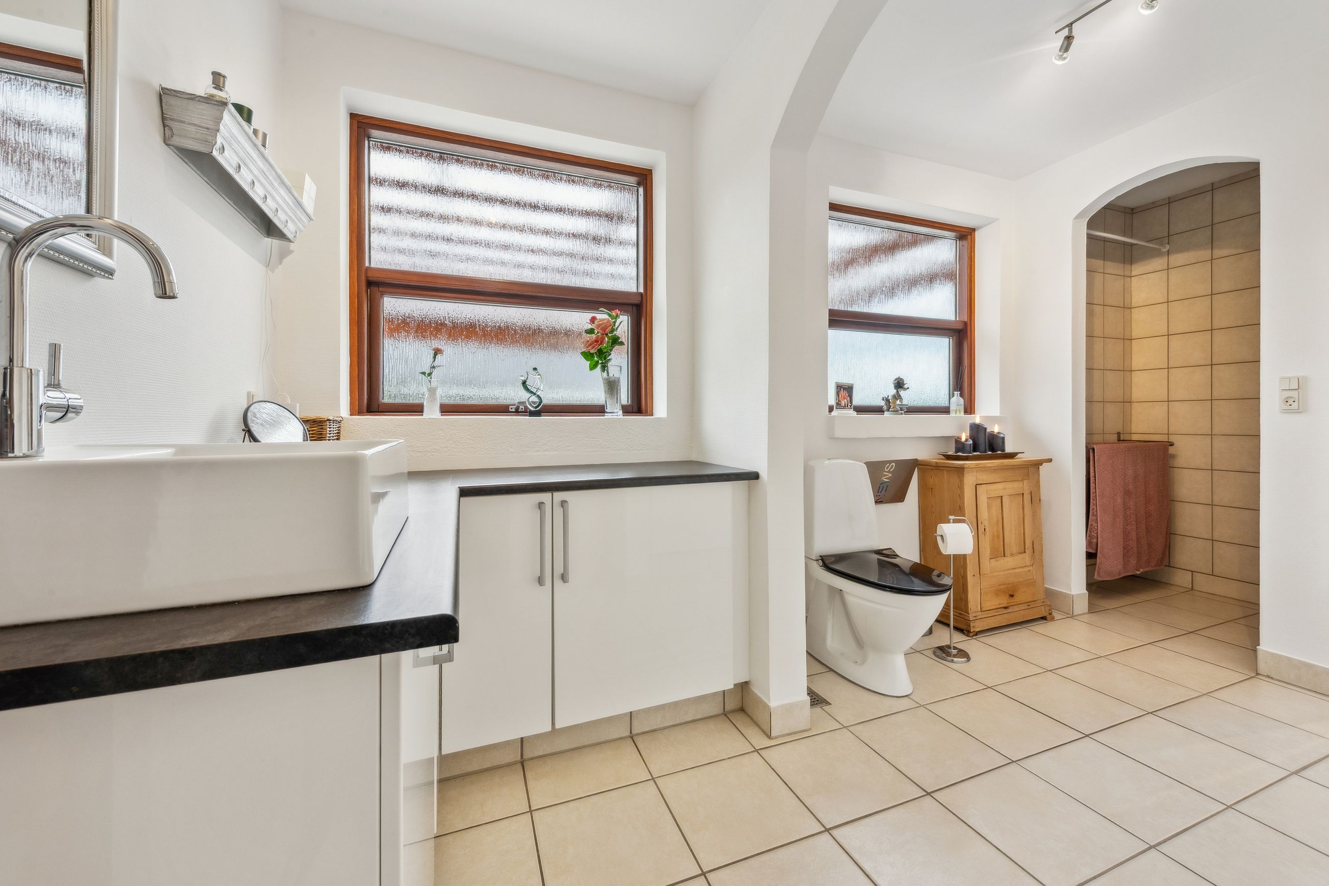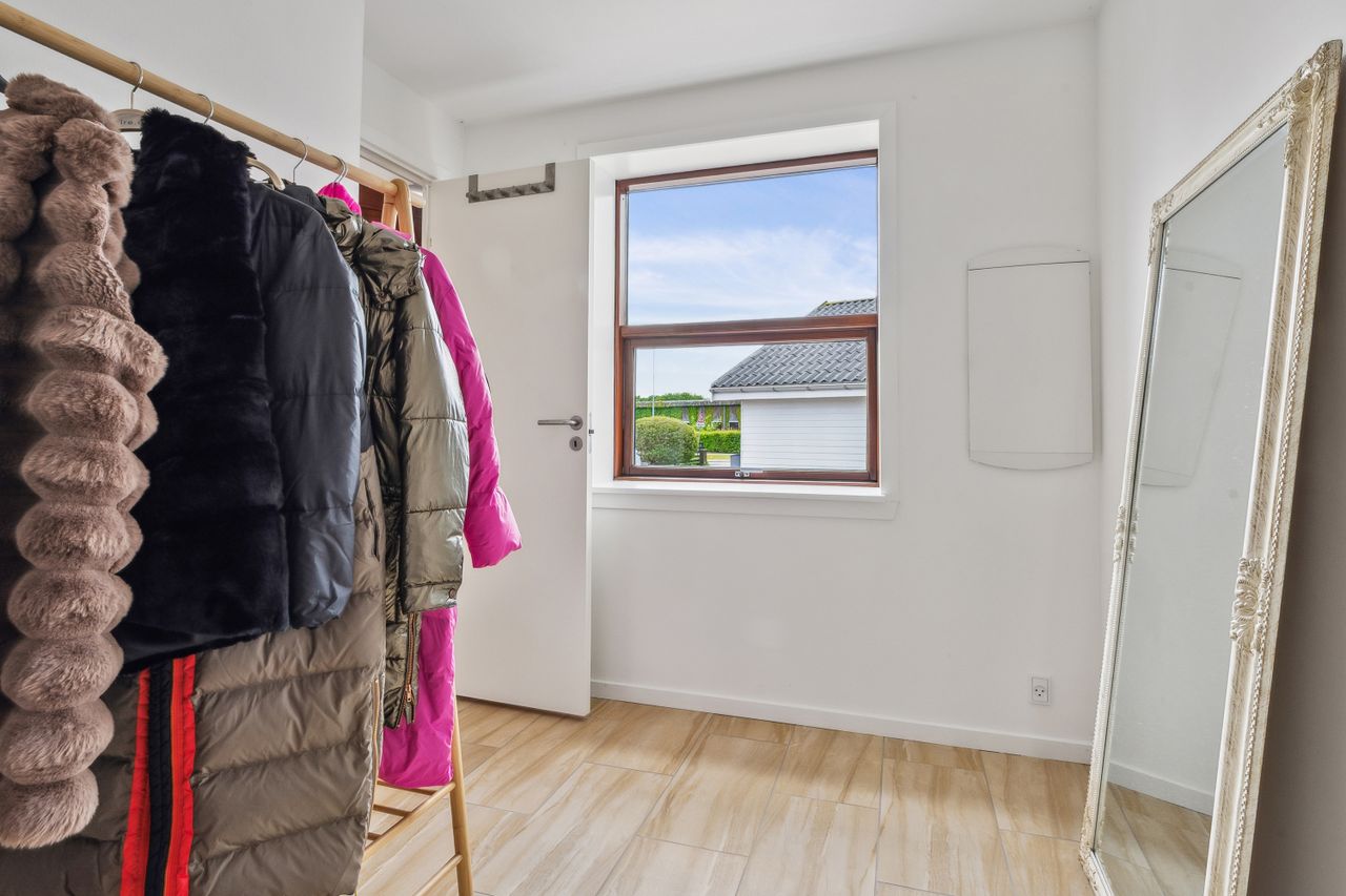 Villaen byder velkommen med et praktisk bryggers, ideelt til hverdagens opgaver. Det åbne køkken-alrum skaber en indbydende atmosfære, hvor familien kan samles om madlavning og hyggelige stunder. Herfra flyder rummet naturligt over i stuen, som inviterer til afslapning og socialt samvær. Villaen rummer desuden to værelser; det ene kan nemt opdeles i to mindre rum alt efter behov, hvilket gør det fleksibelt for familier med børn eller behov for kontorplads. Badeværelset er rummeligt og moderne indrettet med brusefaciliteter.