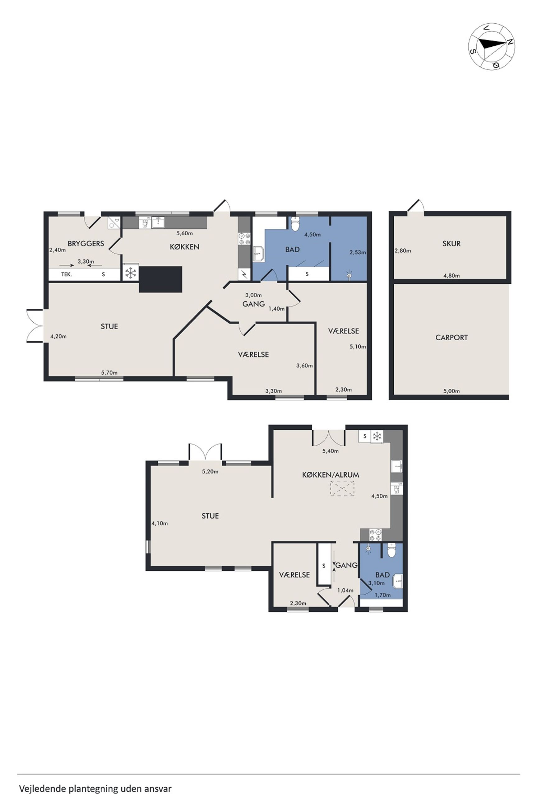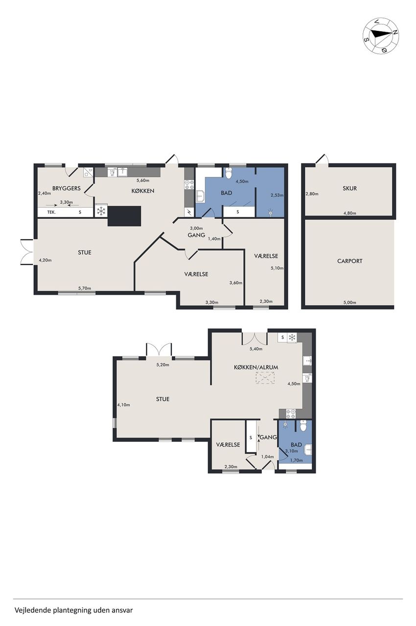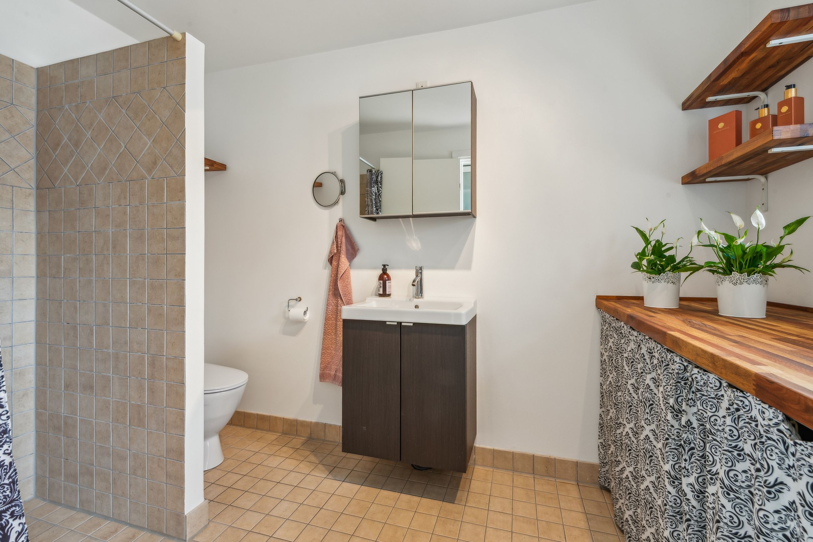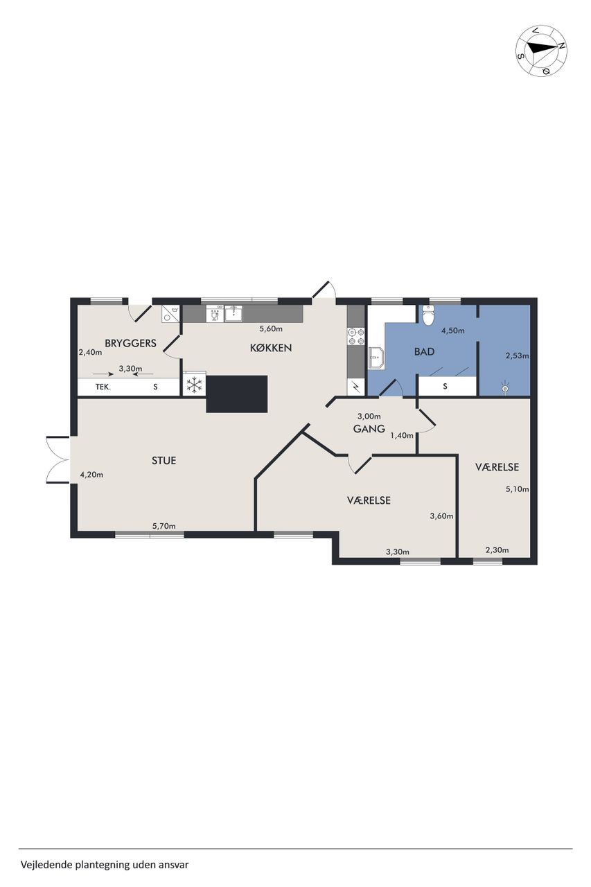 Villaen byder velkommen med et praktisk bryggers, ideelt til hverdagens opgaver. Det åbne køkken-alrum skaber en indbydende atmosfære, hvor familien kan samles om madlavning og hyggelige stunder. Herfra flyder rummet naturligt over i stuen, som inviterer til afslapning og socialt samvær. Villaen rummer desuden to værelser; det ene kan nemt opdeles i to mindre rum alt efter behov, hvilket gør det fleksibelt for familier med børn eller behov for kontorplads. Badeværelset er rummeligt og moderne indrettet med brusefaciliteter.
