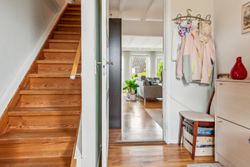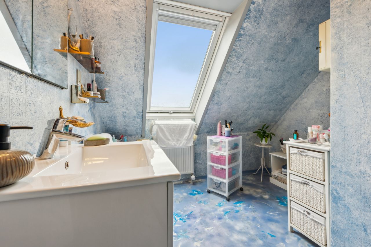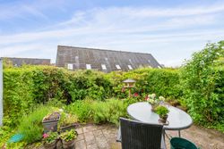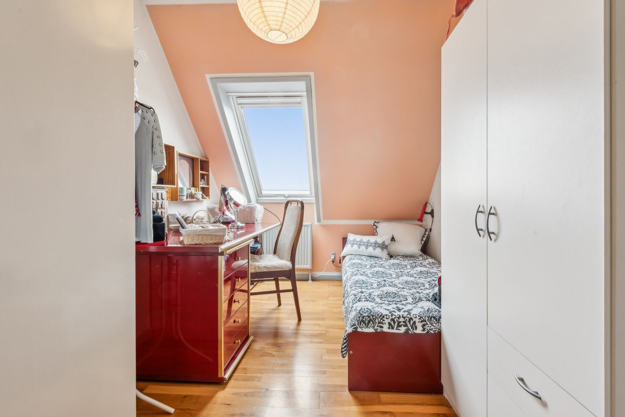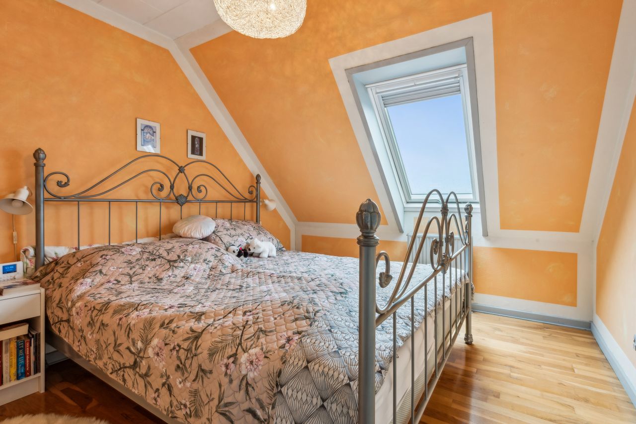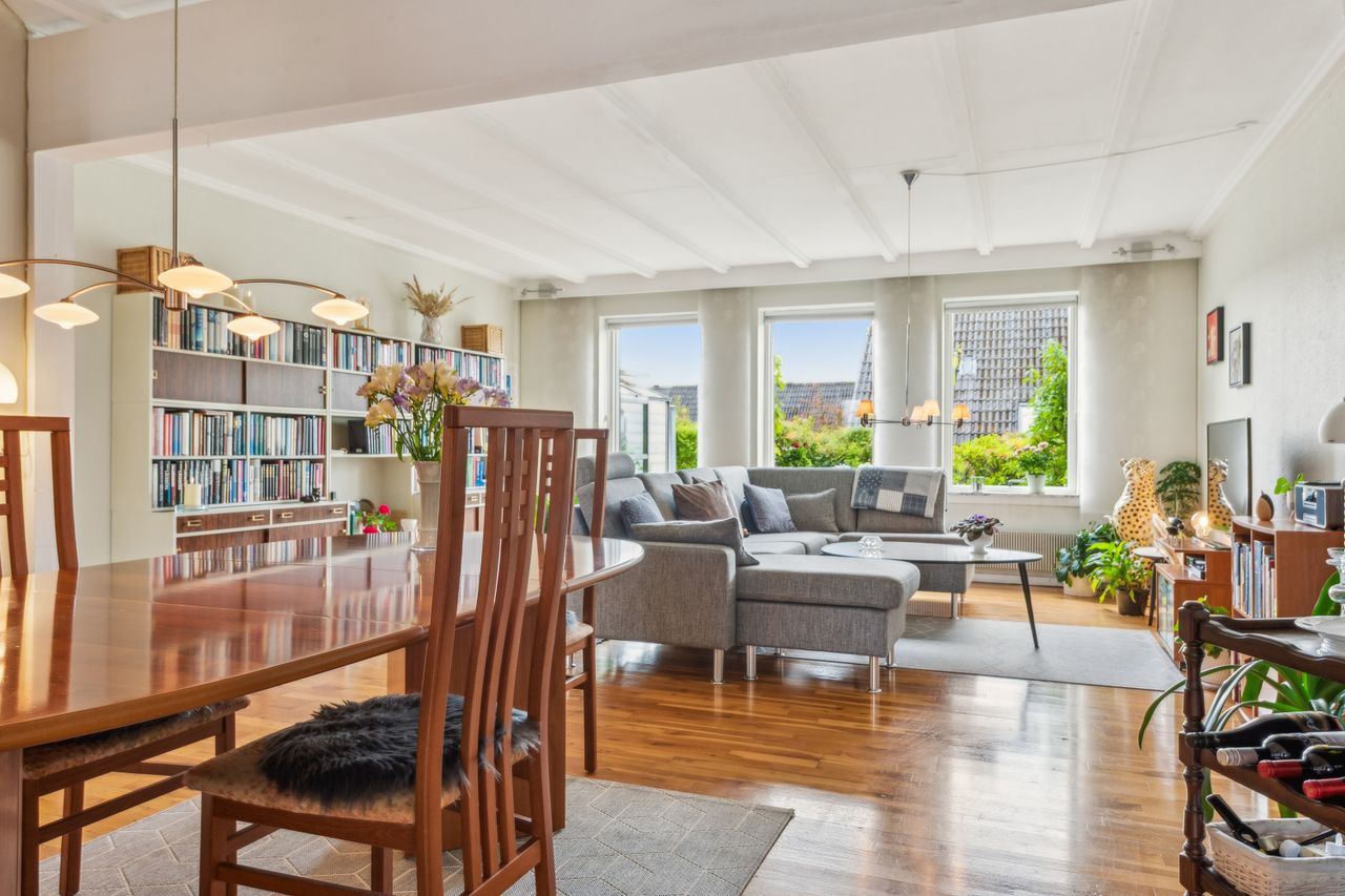 Indenfor mødes du af en lys entre, der fører videre til det oprindelige gæstetoilet. Køkkenet ligger i åben forbindelse med den store stue, hvilket skaber et dejligt samlingspunkt for familien. Fra stuen har du direkte adgang til en solrig terrasse, hvor du kan nyde de lange sommerdage eller hyggelige aftener under åben himmel. På første sal finder du tre gode værelser samt et badeværelse med brus – perfekt indrettet til familielivet.