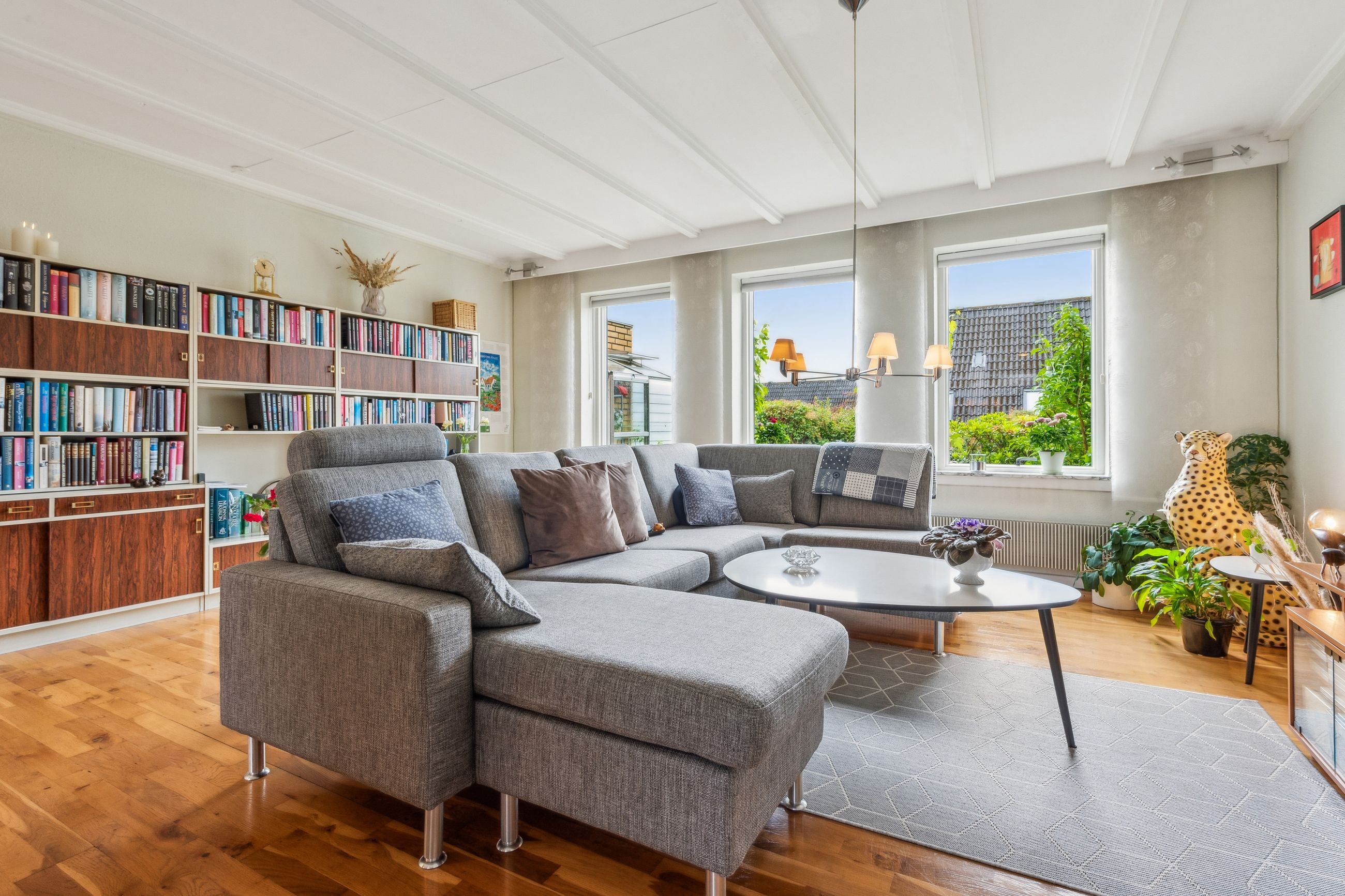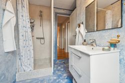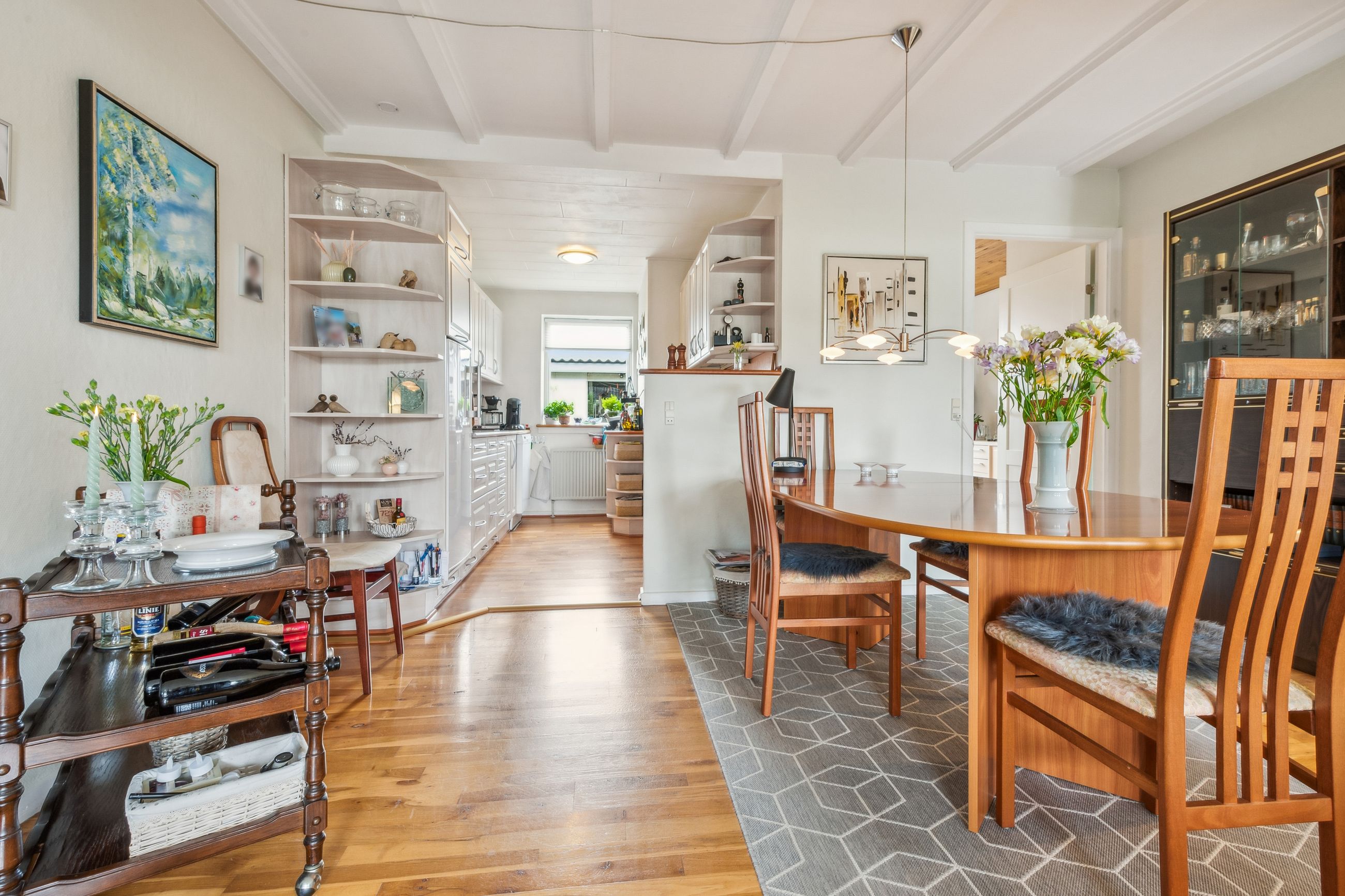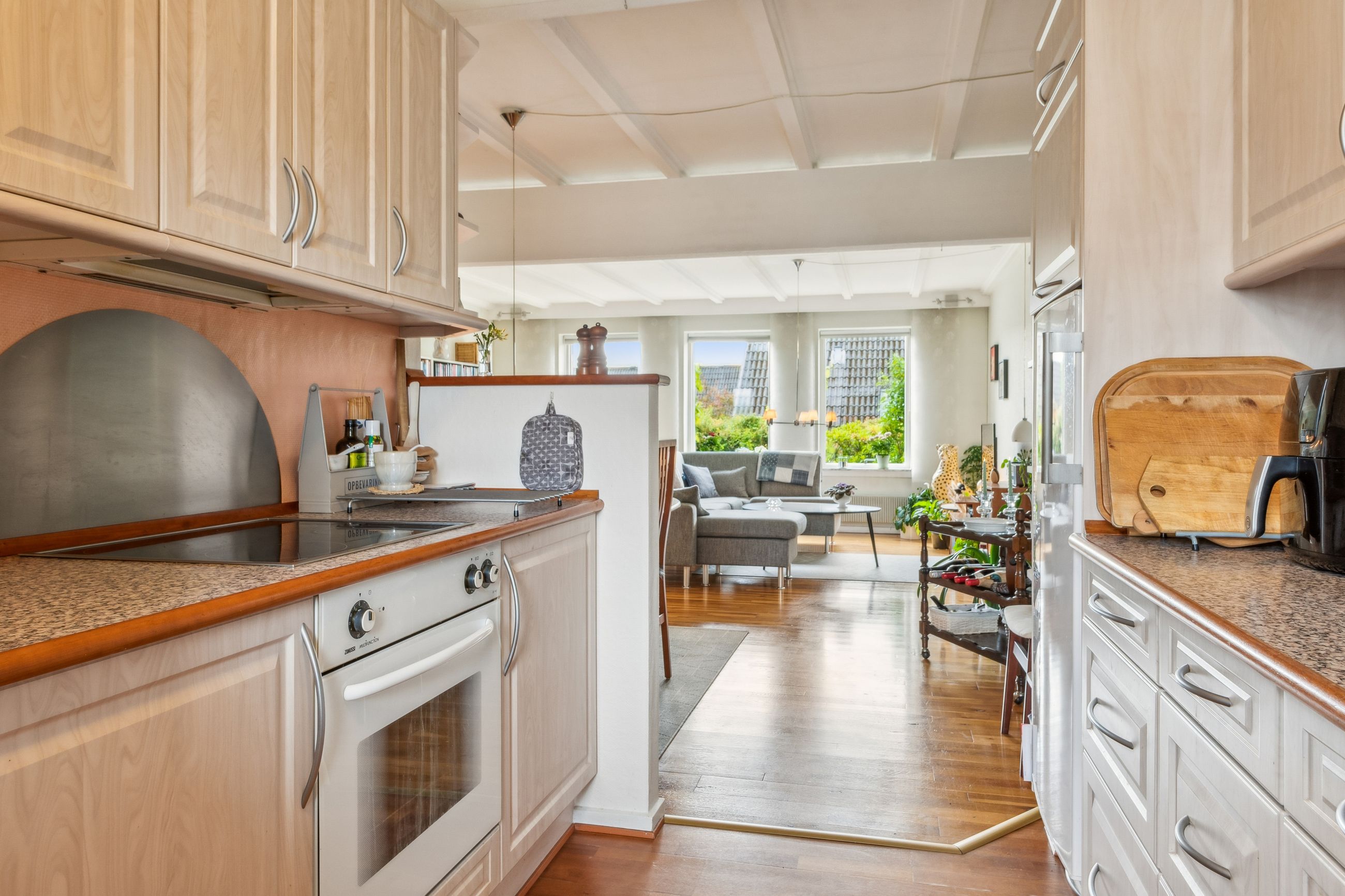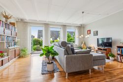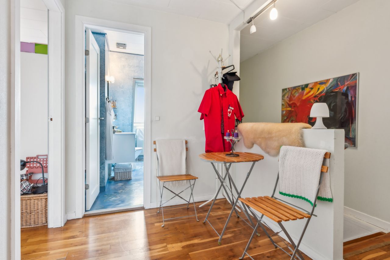 Indenfor mødes du af en lys entre, der fører videre til det oprindelige gæstetoilet. Køkkenet ligger i åben forbindelse med den store stue, hvilket skaber et dejligt samlingspunkt for familien. Fra stuen har du direkte adgang til en solrig terrasse, hvor du kan nyde de lange sommerdage eller hyggelige aftener under åben himmel. På første sal finder du tre gode værelser samt et badeværelse med brus – perfekt indrettet til familielivet.