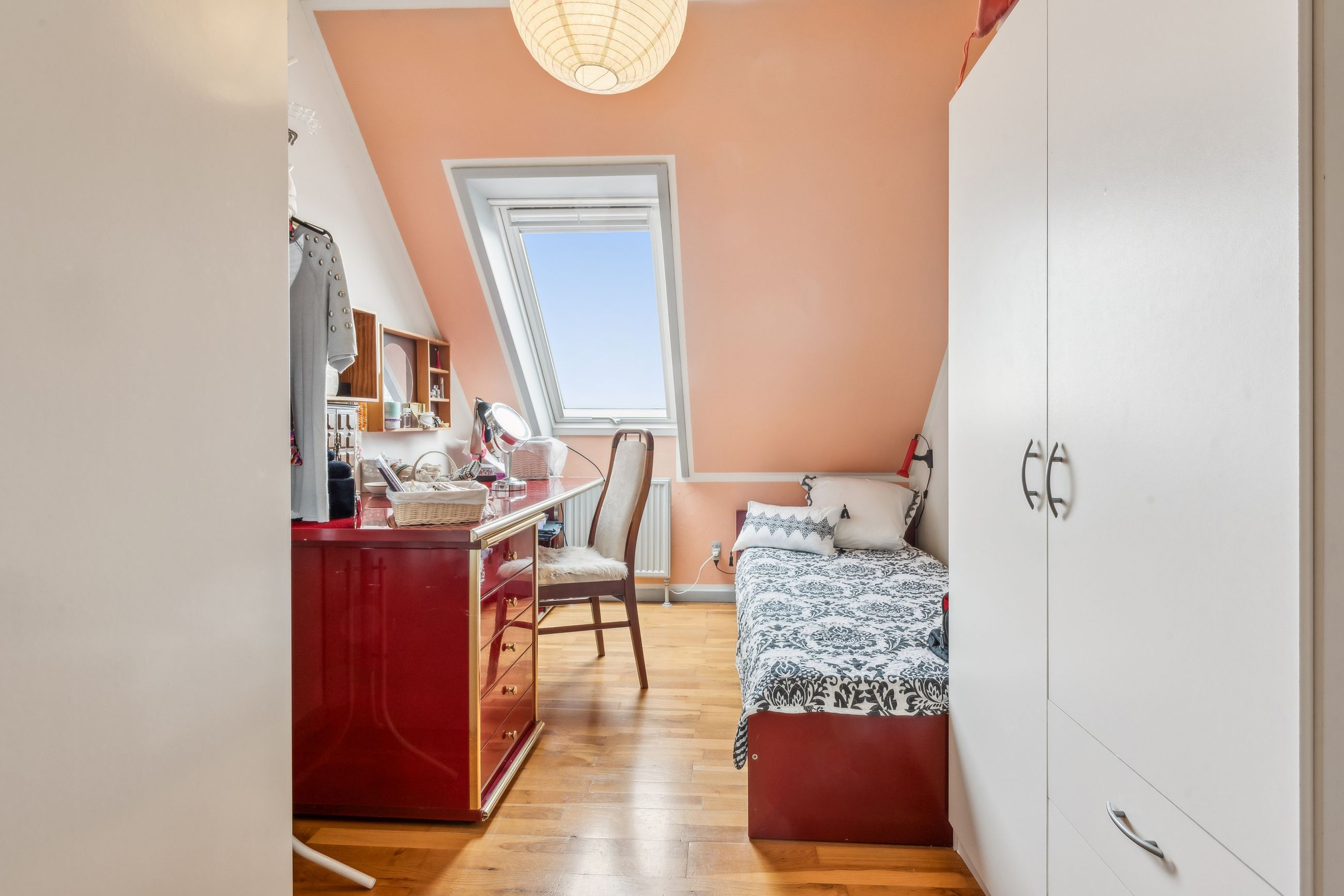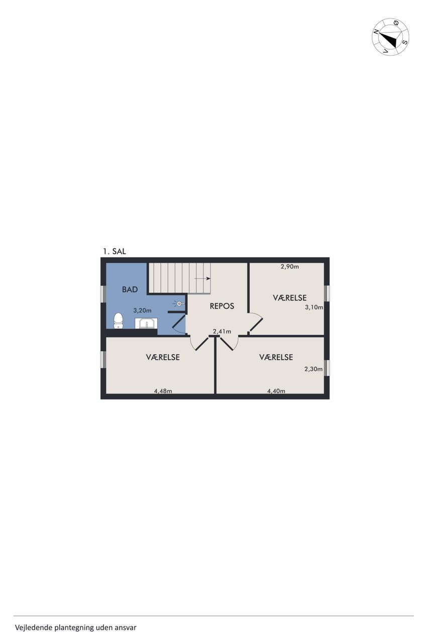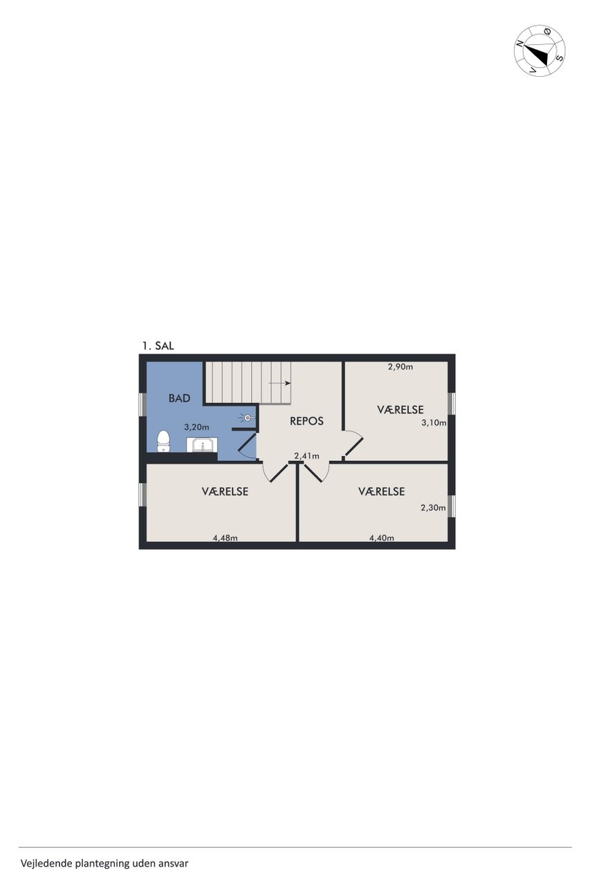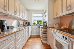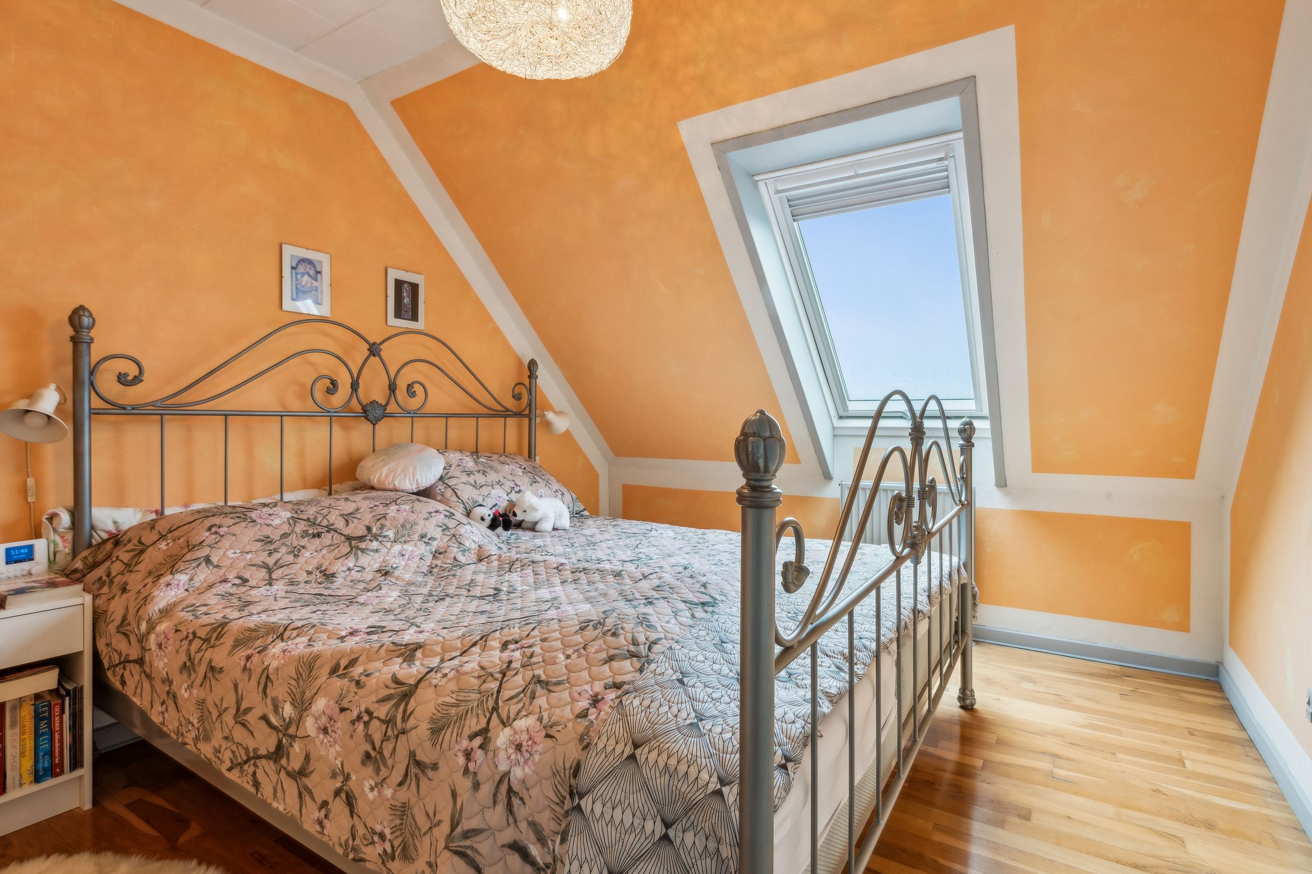 Indenfor mødes du af en lys entre, der fører videre til det oprindelige gæstetoilet. Køkkenet ligger i åben forbindelse med den store stue, hvilket skaber et dejligt samlingspunkt for familien. Fra stuen har du direkte adgang til en solrig terrasse, hvor du kan nyde de lange sommerdage eller hyggelige aftener under åben himmel. På første sal finder du tre gode værelser samt et badeværelse med brus – perfekt indrettet til familielivet.