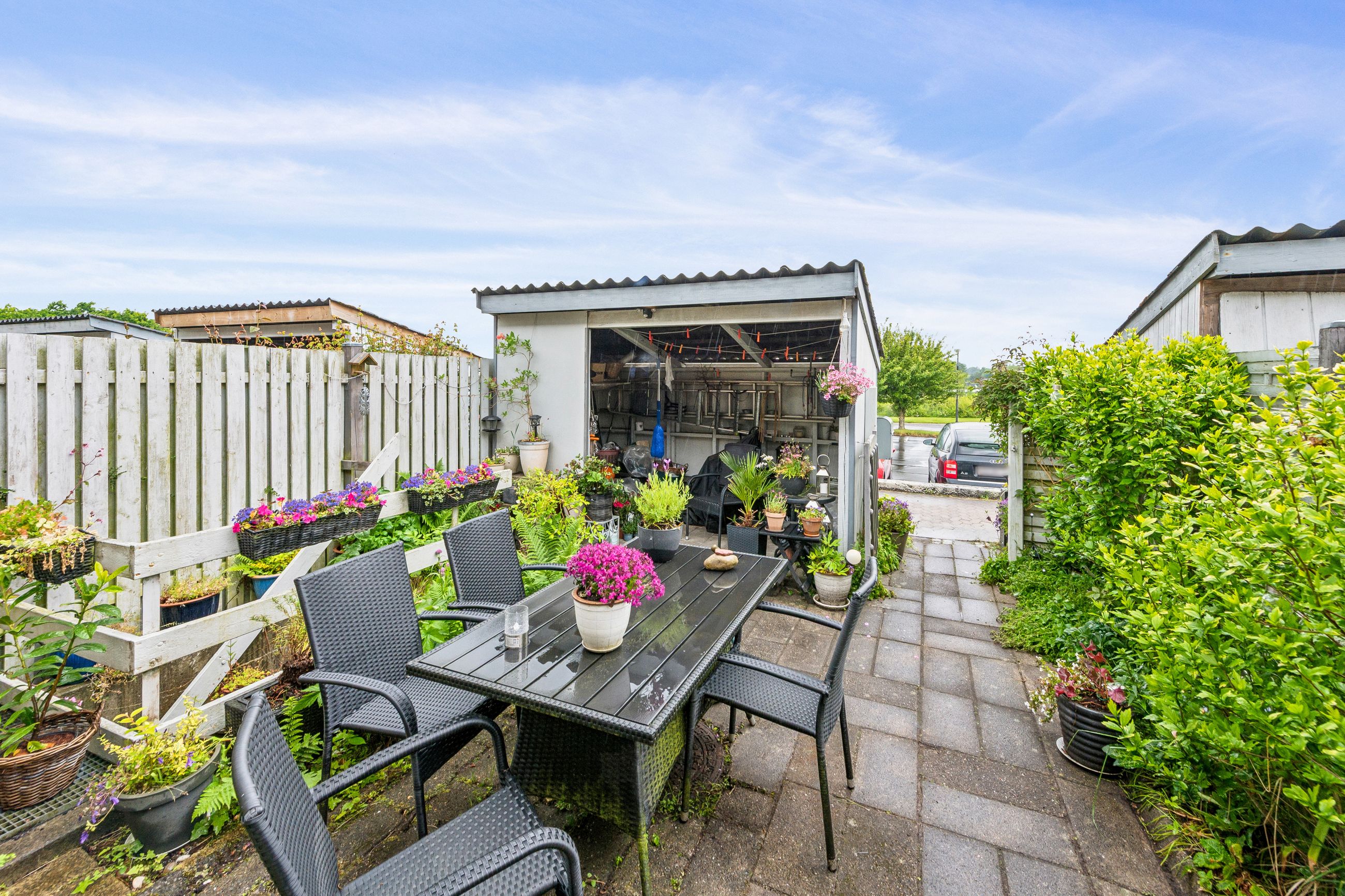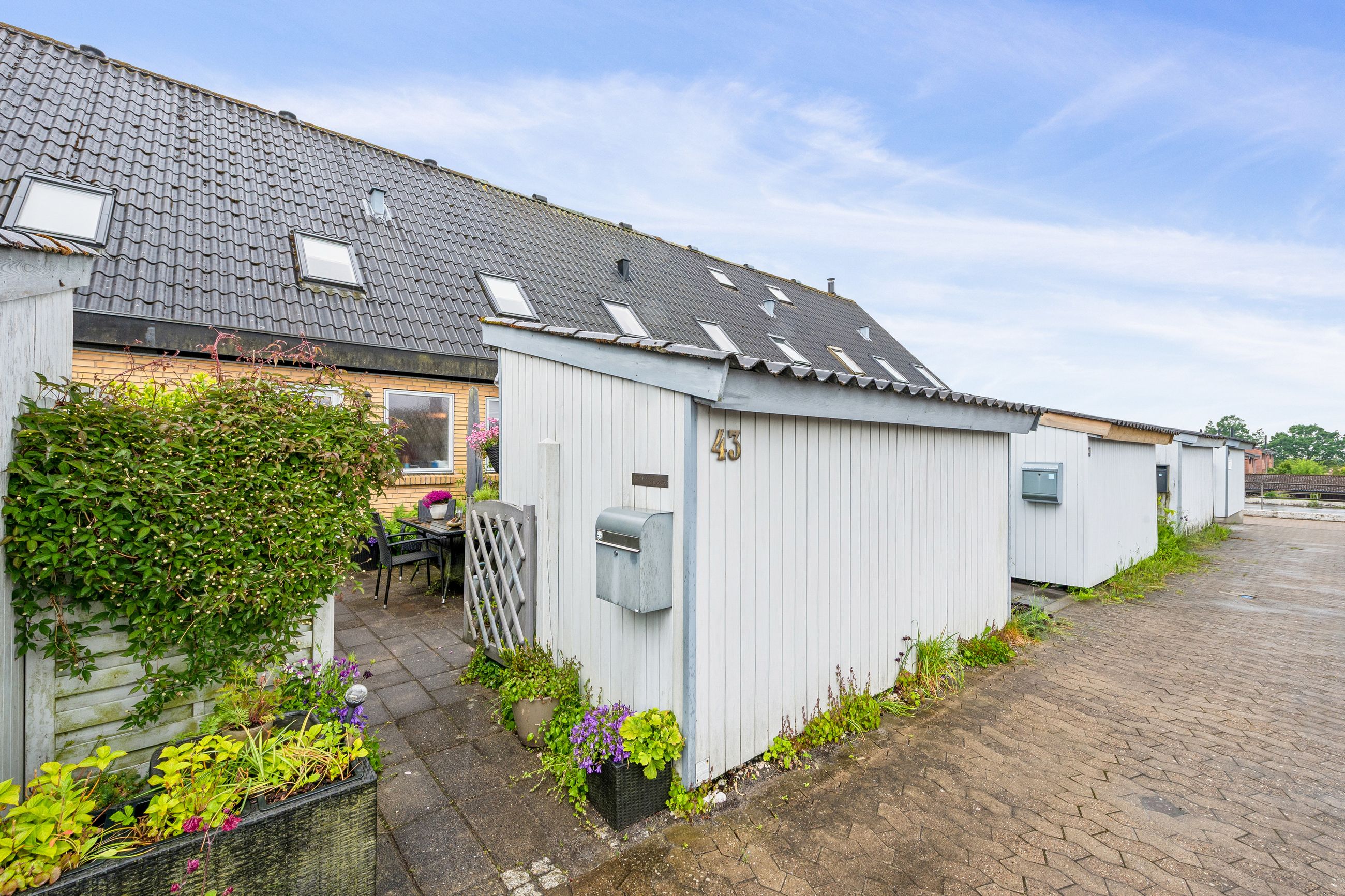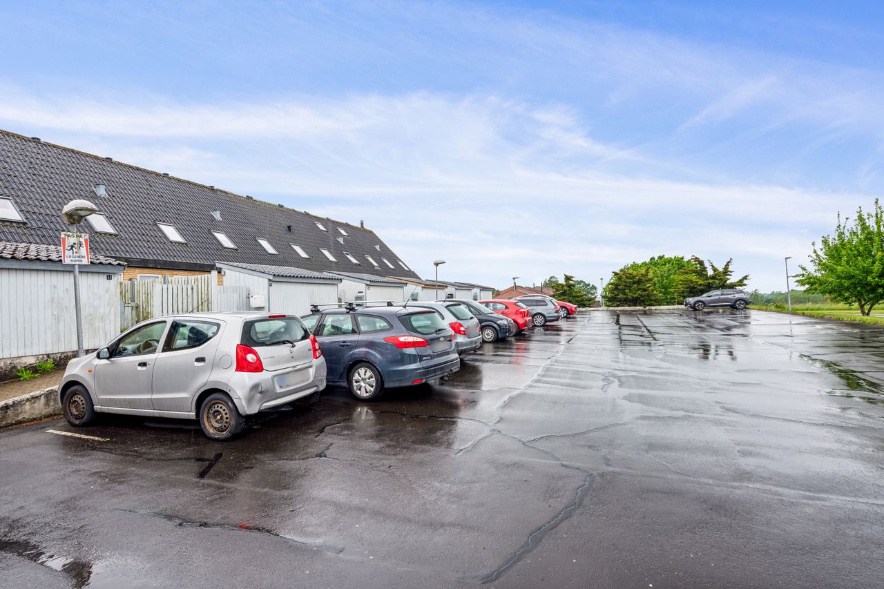 Foran rækkehuset findes en fælles parkeringsplads lige ved døren – en praktisk detalje i hverdagen. Området omkring boligen er fyldt med muligheder for udendørs aktiviteter; flere legepladser sikrer sjov for børnene, mens de voksne kan tage afslappende gåture i den nærliggende Store Dyrehave eller blot nyde naturens ro i områdets grønne oaser.