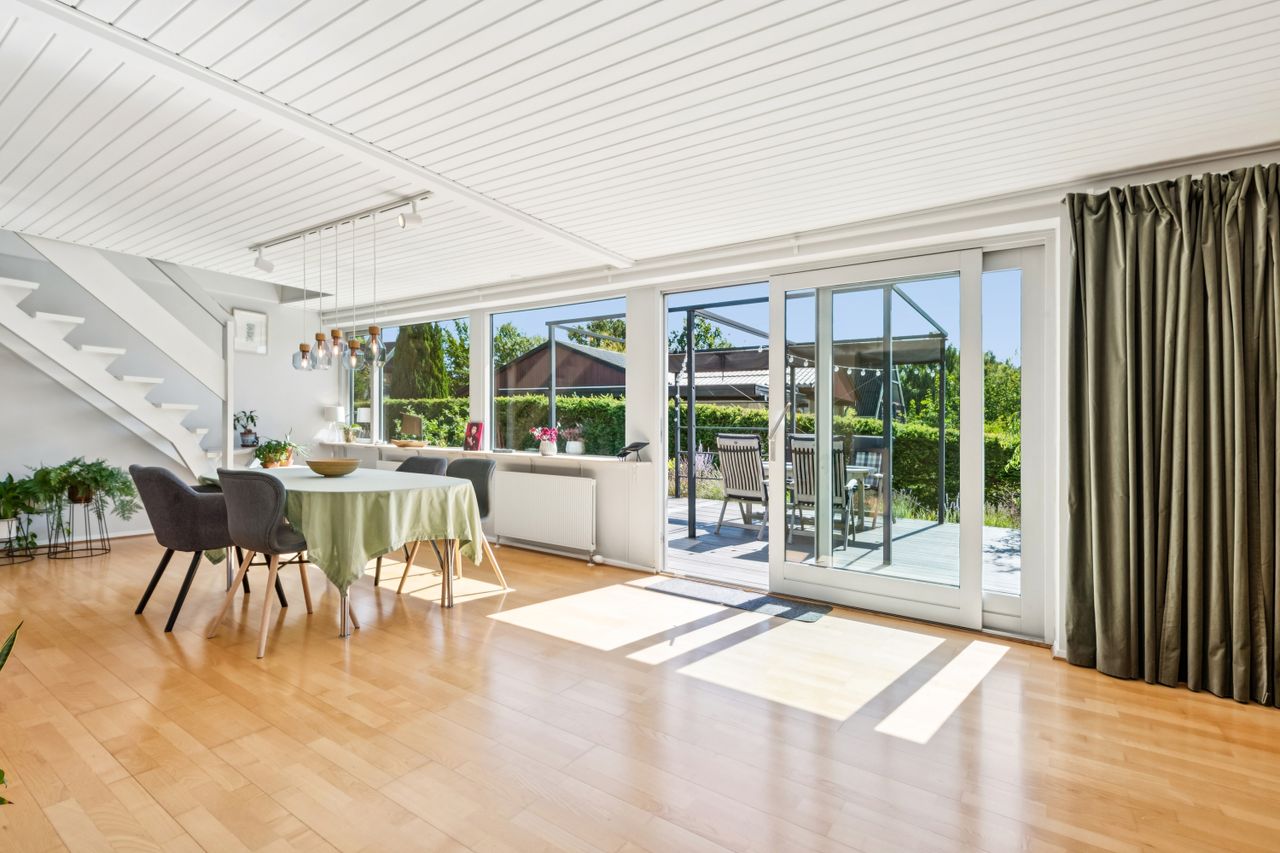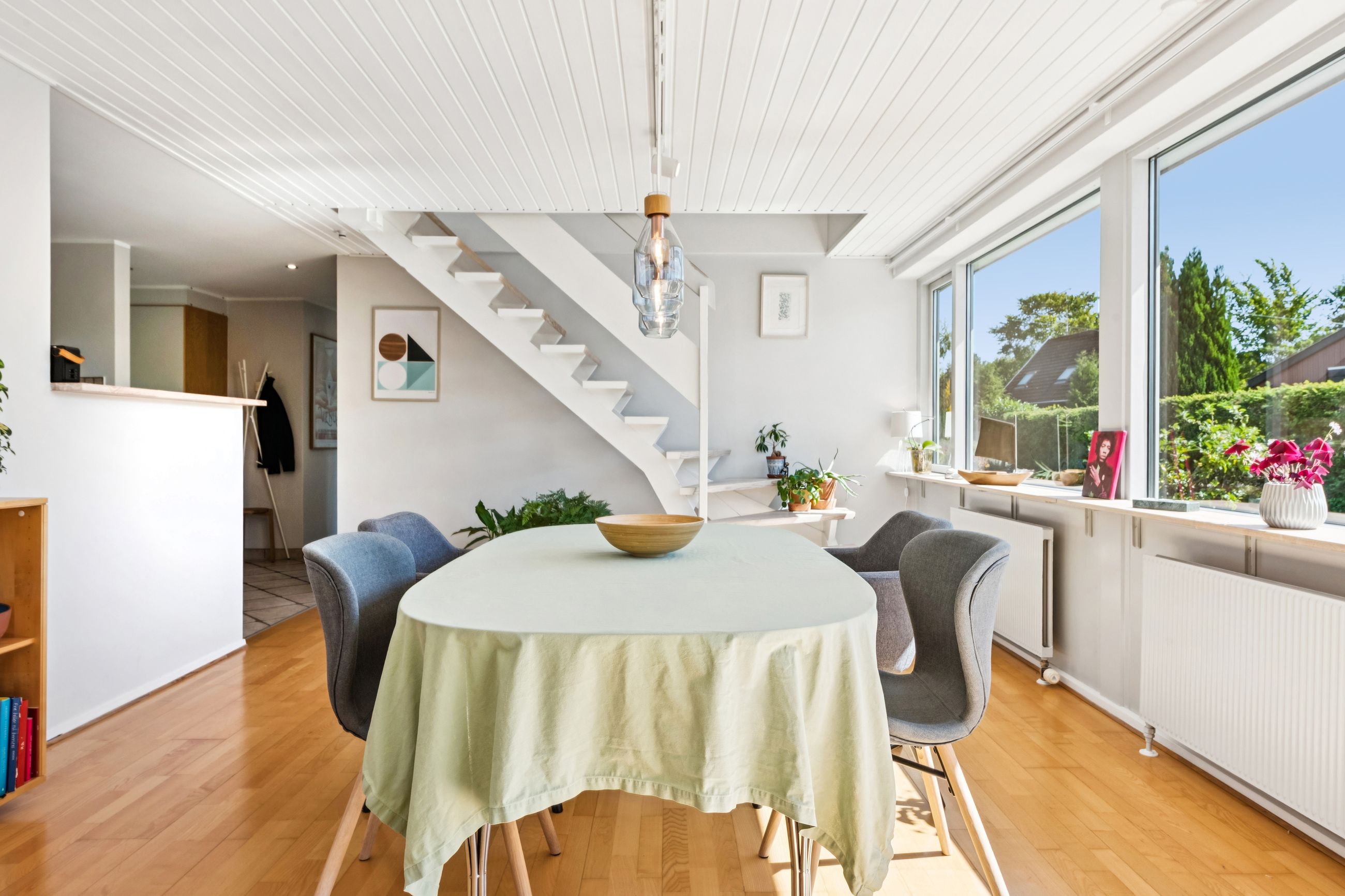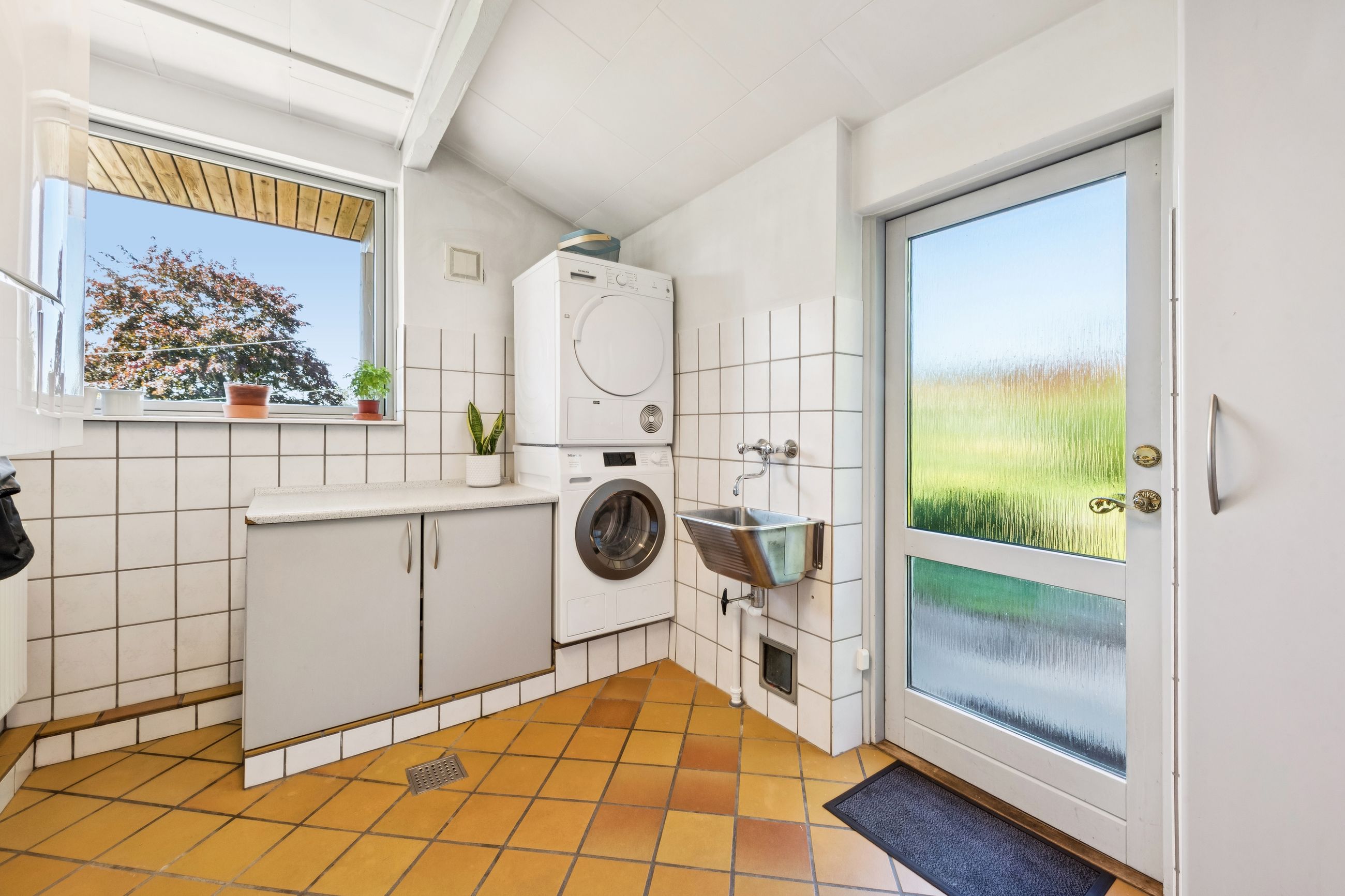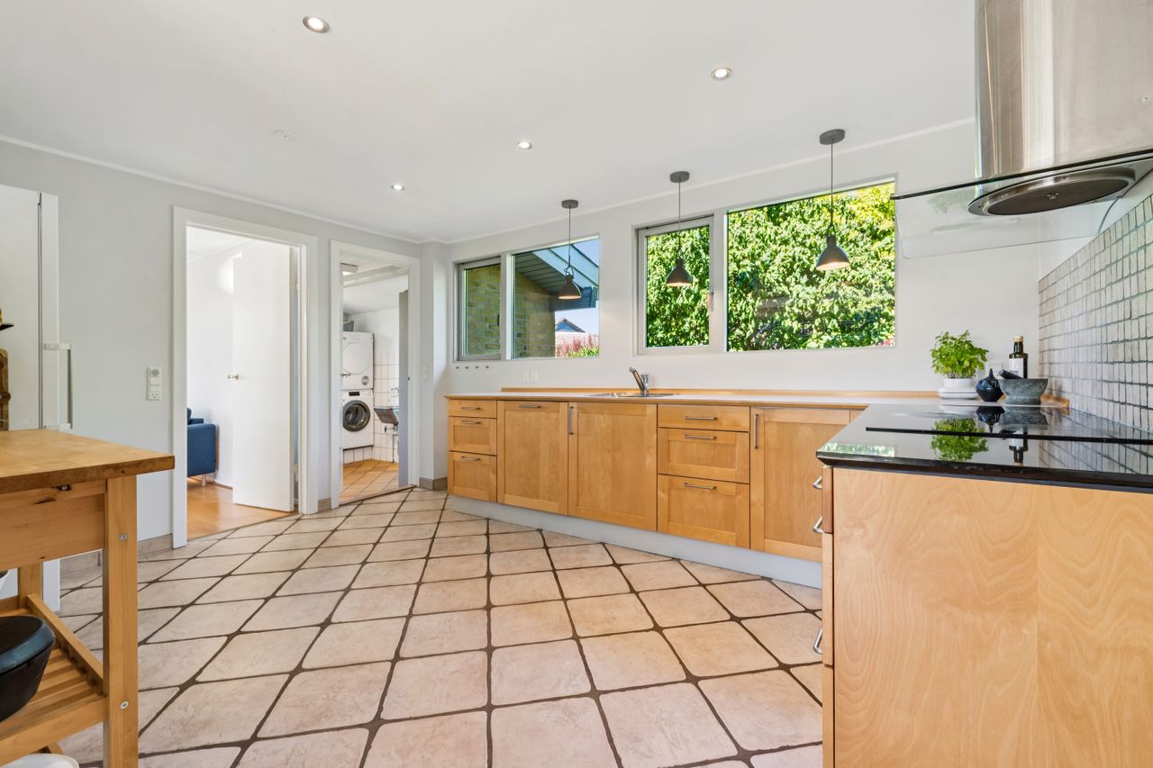 Husets hjerte er det åbne køkken-alrum, hvor køkkenet flyder harmonisk sammen med den store stue. Herfra har du direkte adgang til en vidunderlig solrig terrasse – ideel til afslapning eller sociale sammenkomster under åben himmel. I stueplan finder du også et praktisk bryggers.