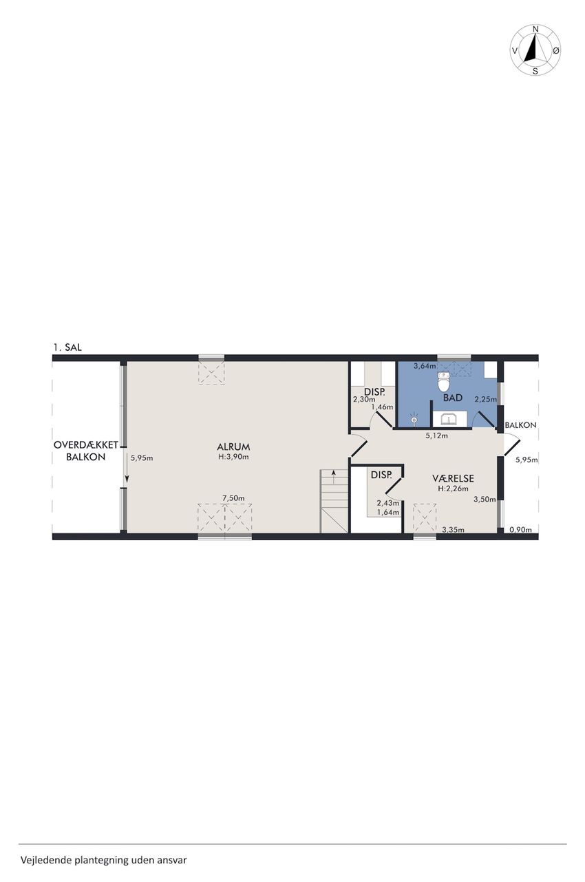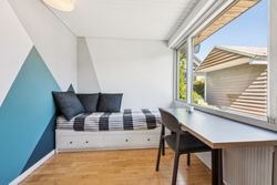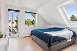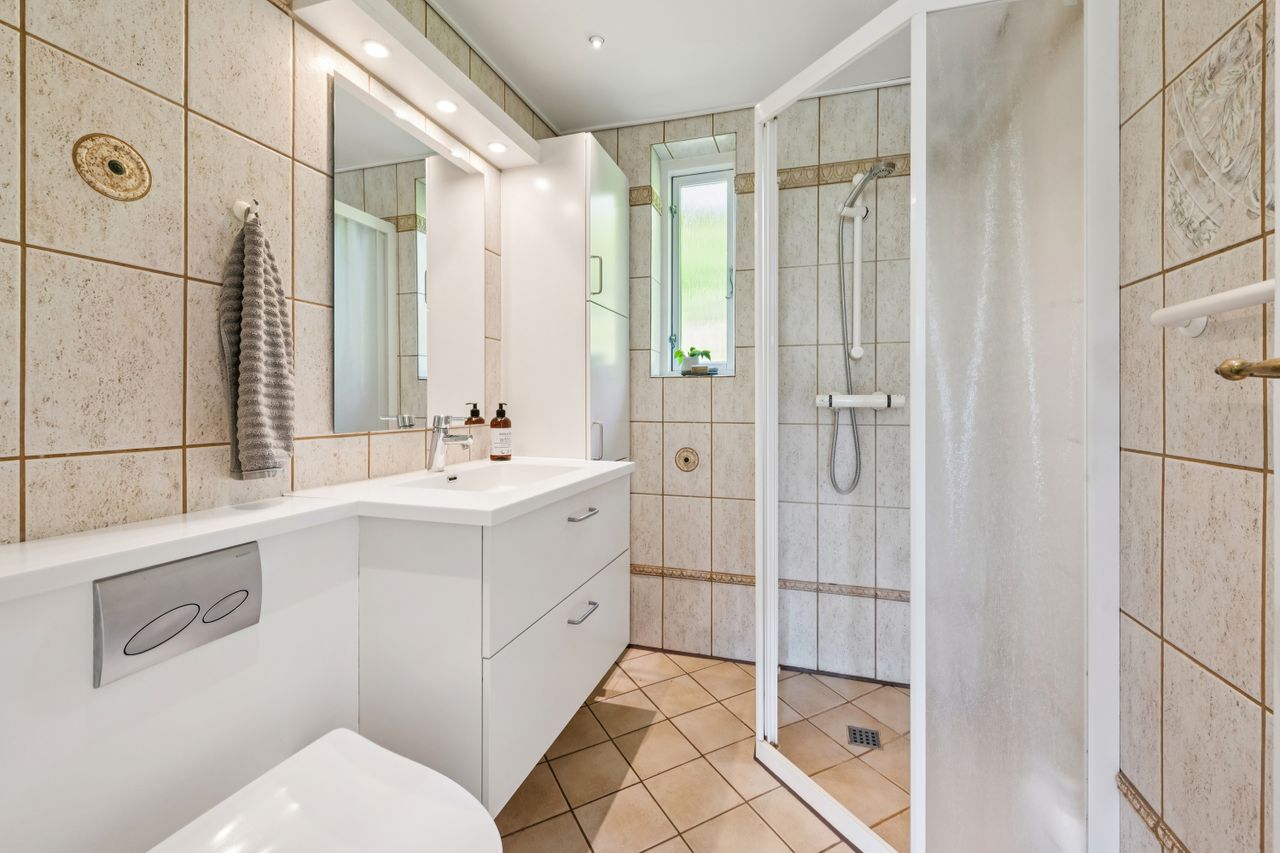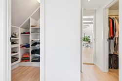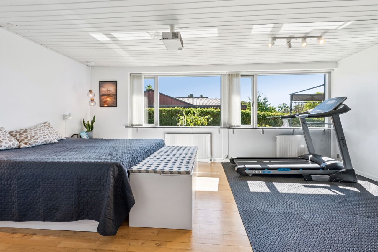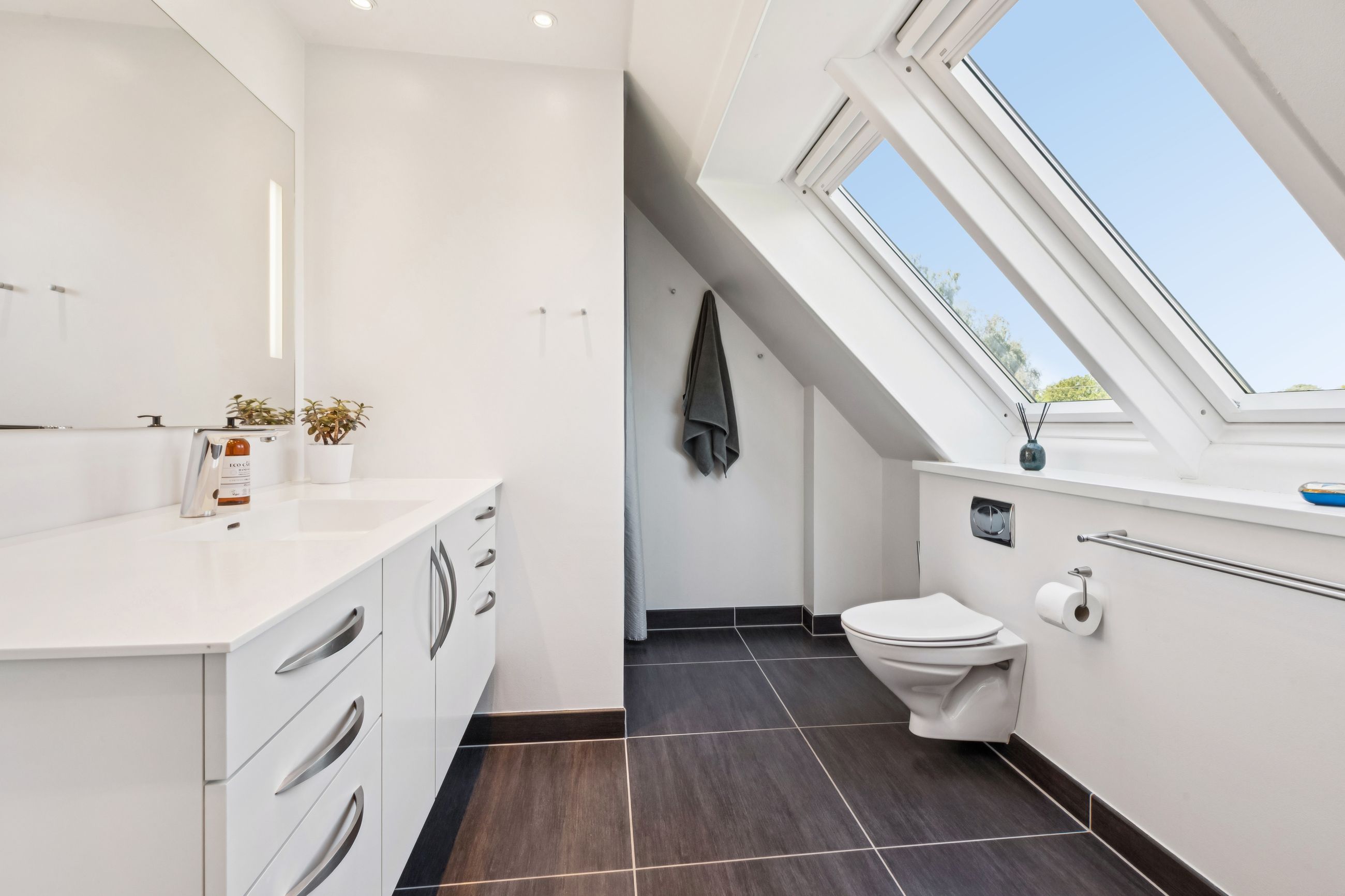 Når du træder ind ad døren, mødes du af en lys entre, der fører dig videre til et stilfuldt badeværelse med brus udført i lyse nuancer. Et stort værelse giver mulighed for at skabe et personligt fristed til træning eller gæsteophold. Værelset kan let opdeles i to separate rum efter behov. Derudover findes et kontor/værelse perfekt til hjemmearbejde.