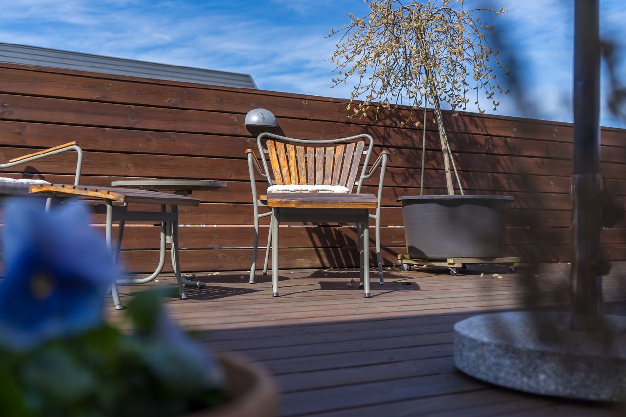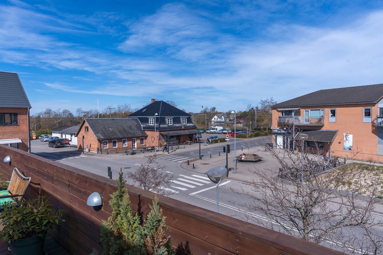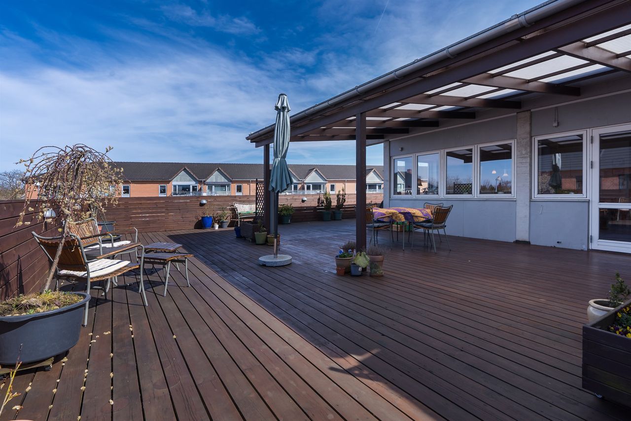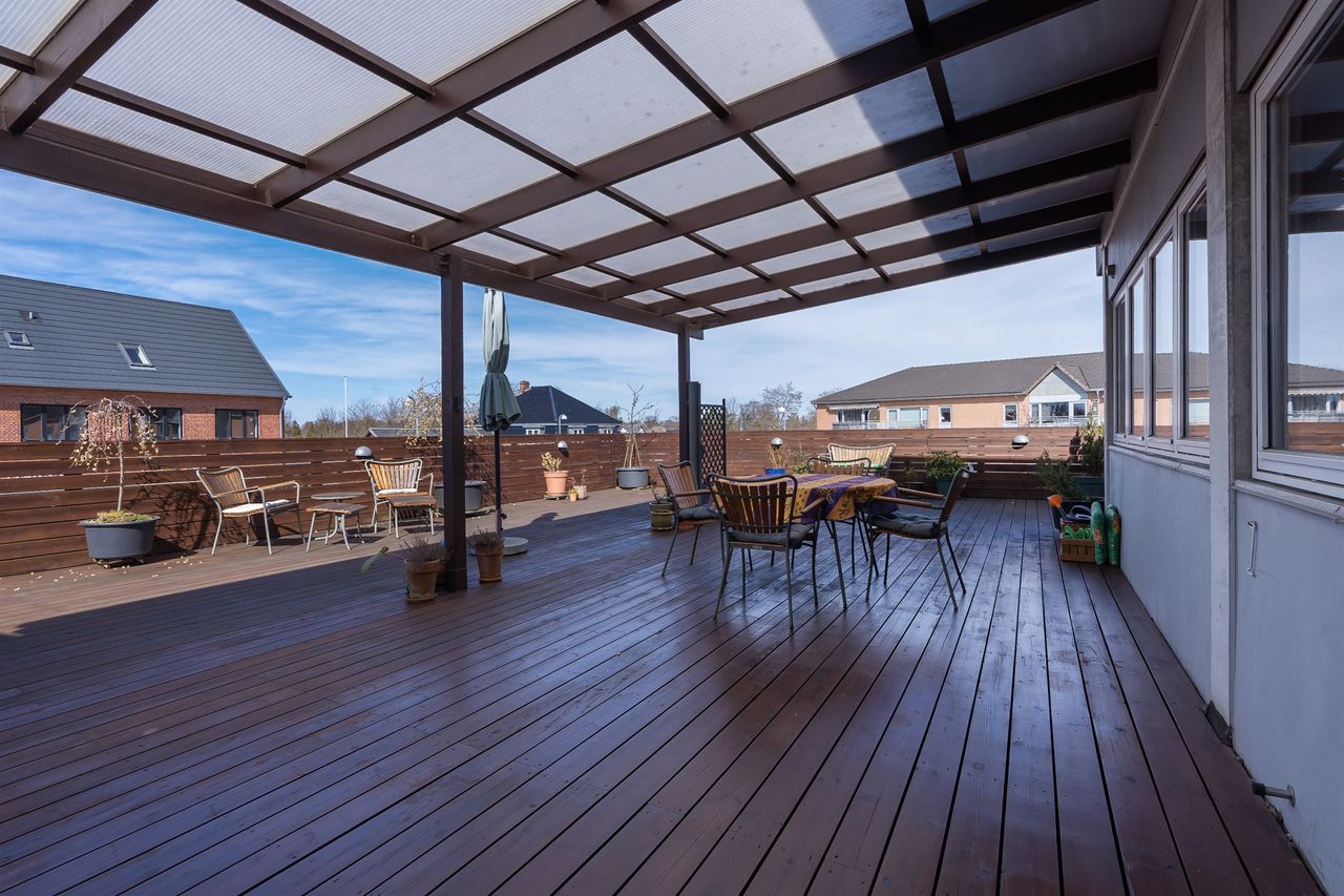 Men det, der virkelig gør lejligheden til noget særligt, venter udenfor: En ca. 100 m2 stor træterrasse – din helt egen oase i hjertet af Ølstykke. Her kan solen nydes hele dagen, og den store overdækkede del skaber perfekte rammer for sommerens grillaftener og hyggelige sammenkomster – uanset vejret.