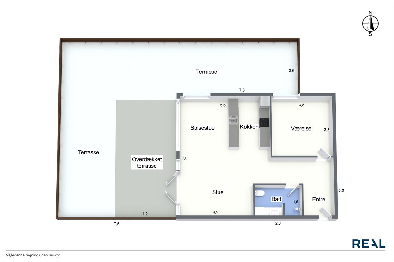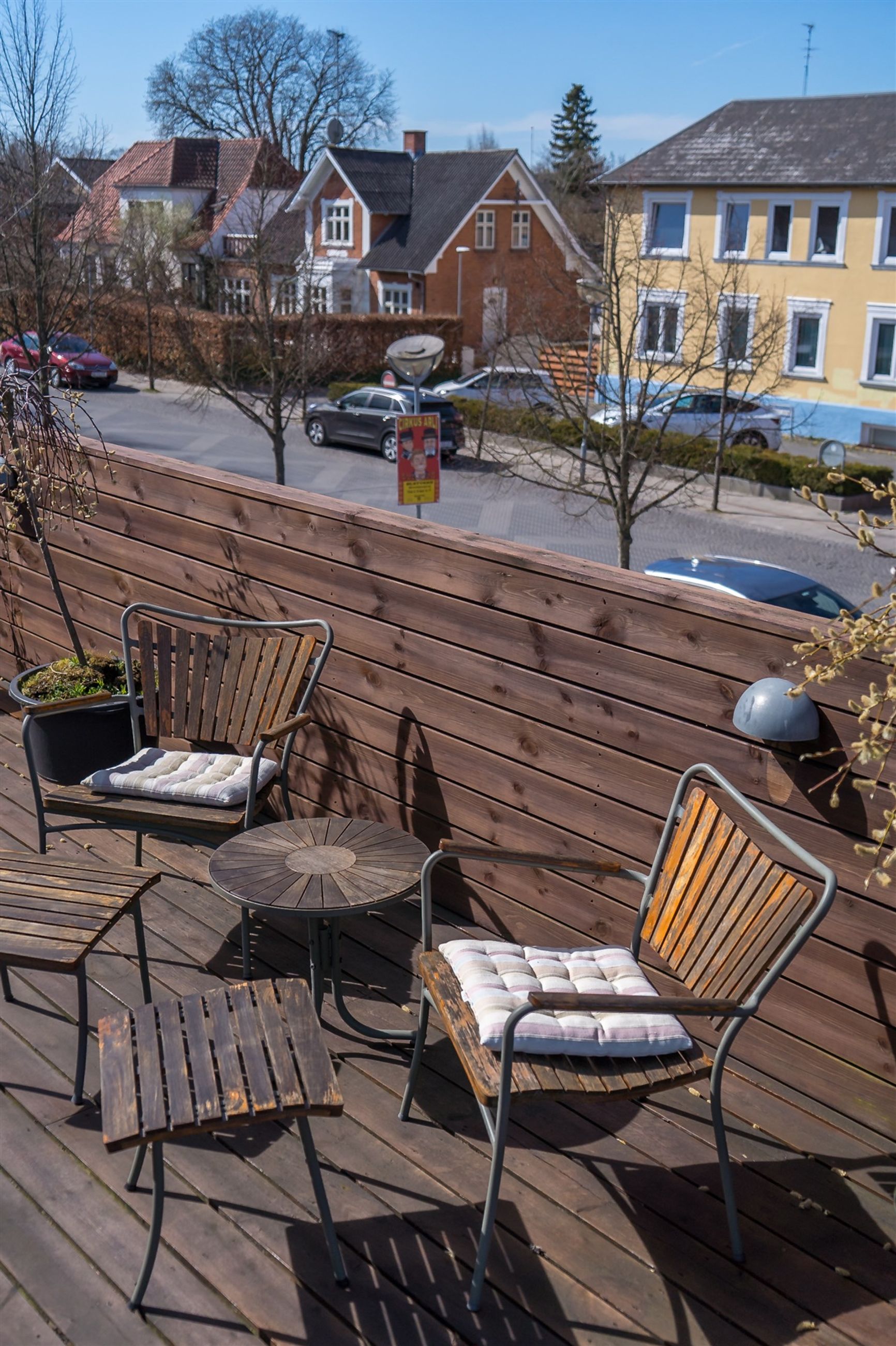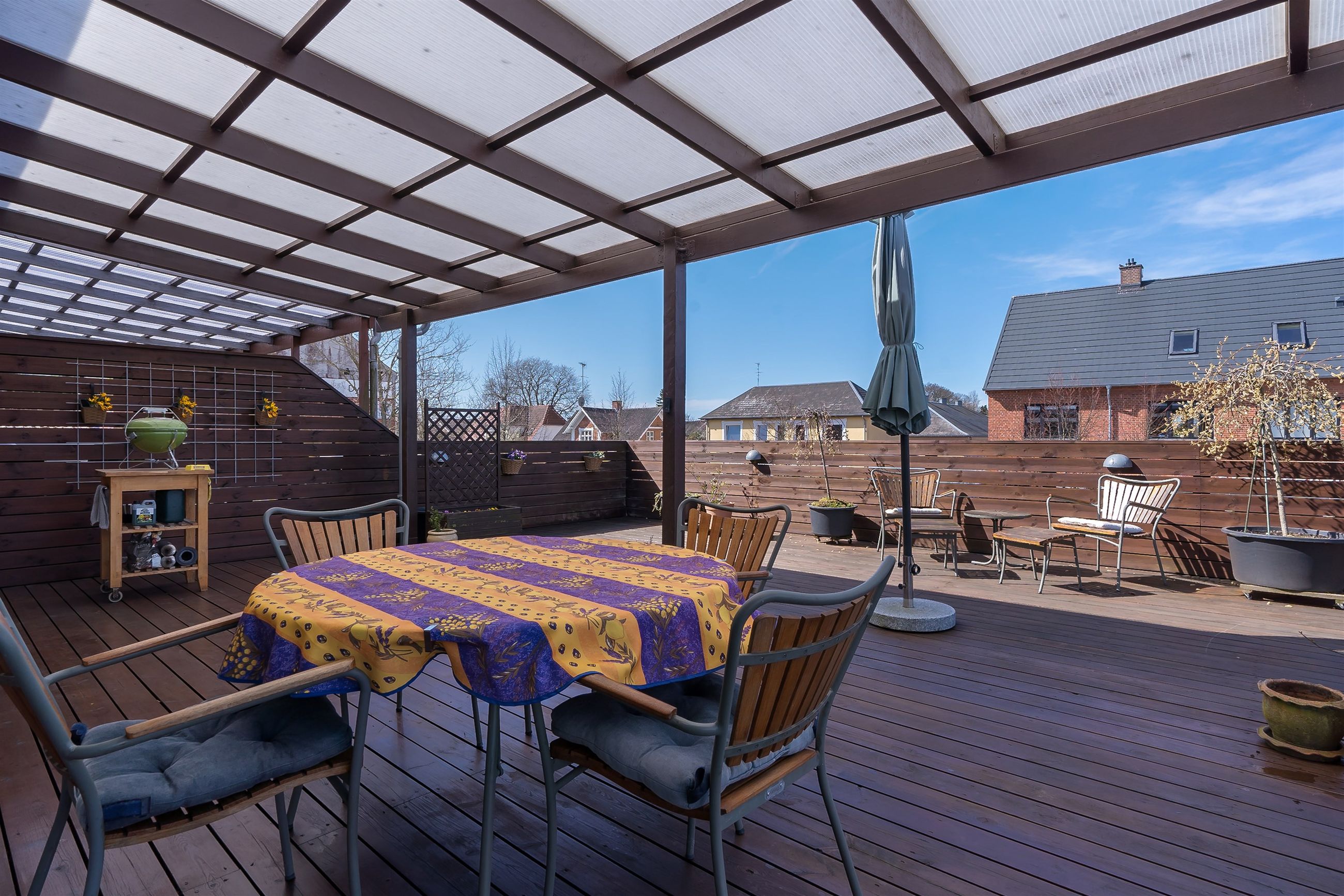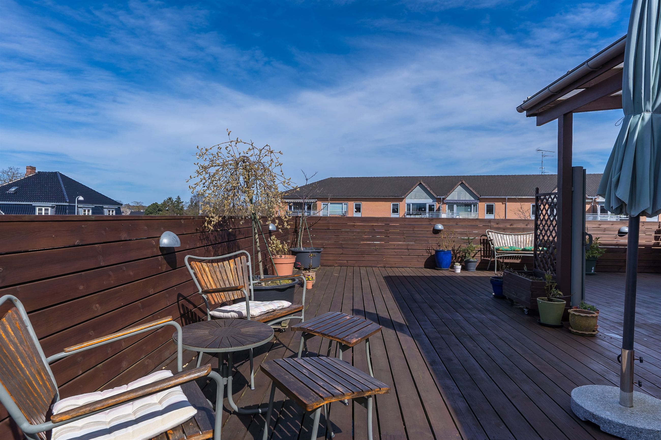 Men det, der virkelig gør lejligheden til noget særligt, venter udenfor: En ca. 100 m2 stor træterrasse – din helt egen oase i hjertet af Ølstykke. Her kan solen nydes hele dagen, og den store overdækkede del skaber perfekte rammer for sommerens grillaftener og hyggelige sammenkomster – uanset vejret.