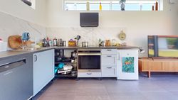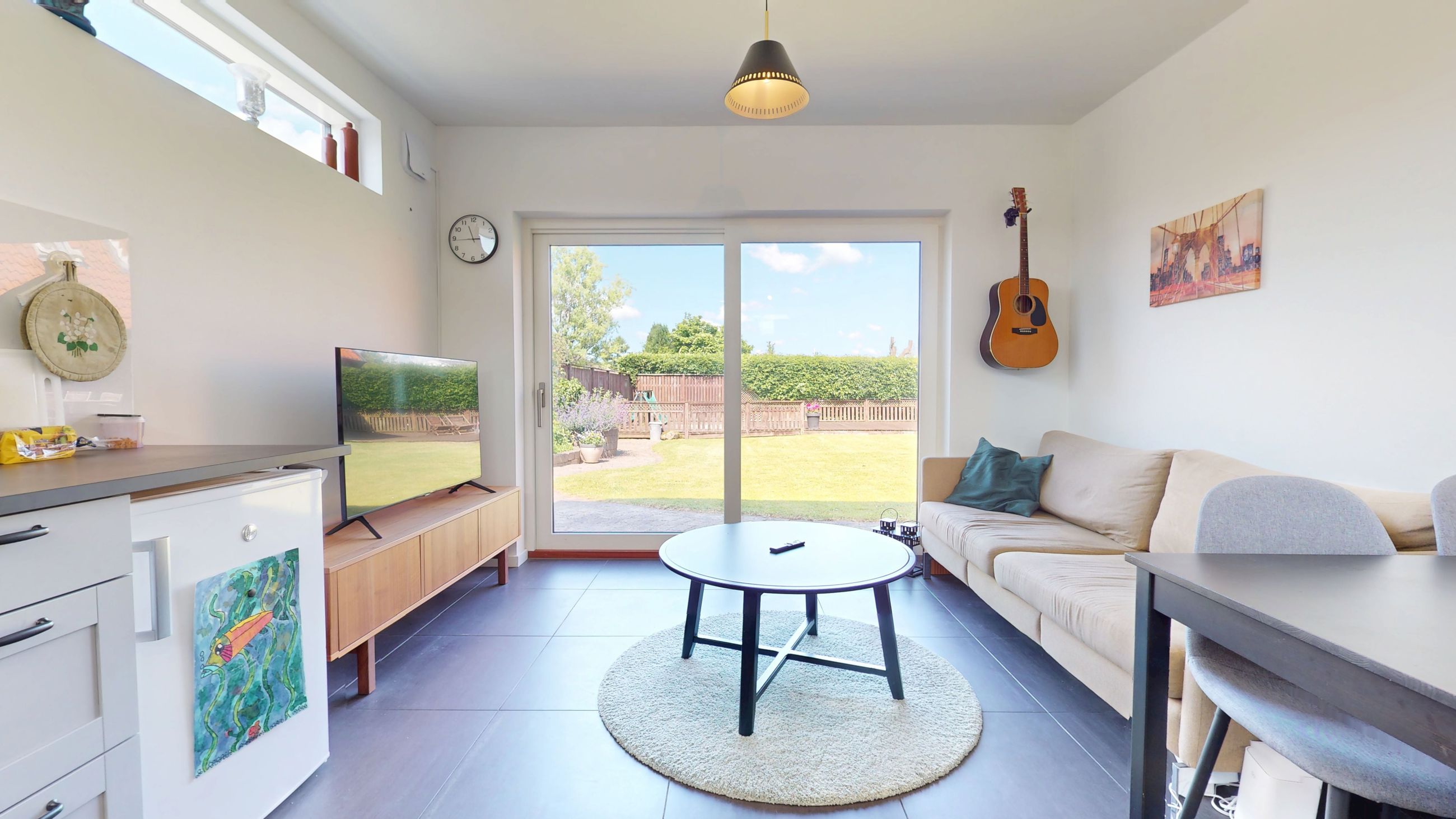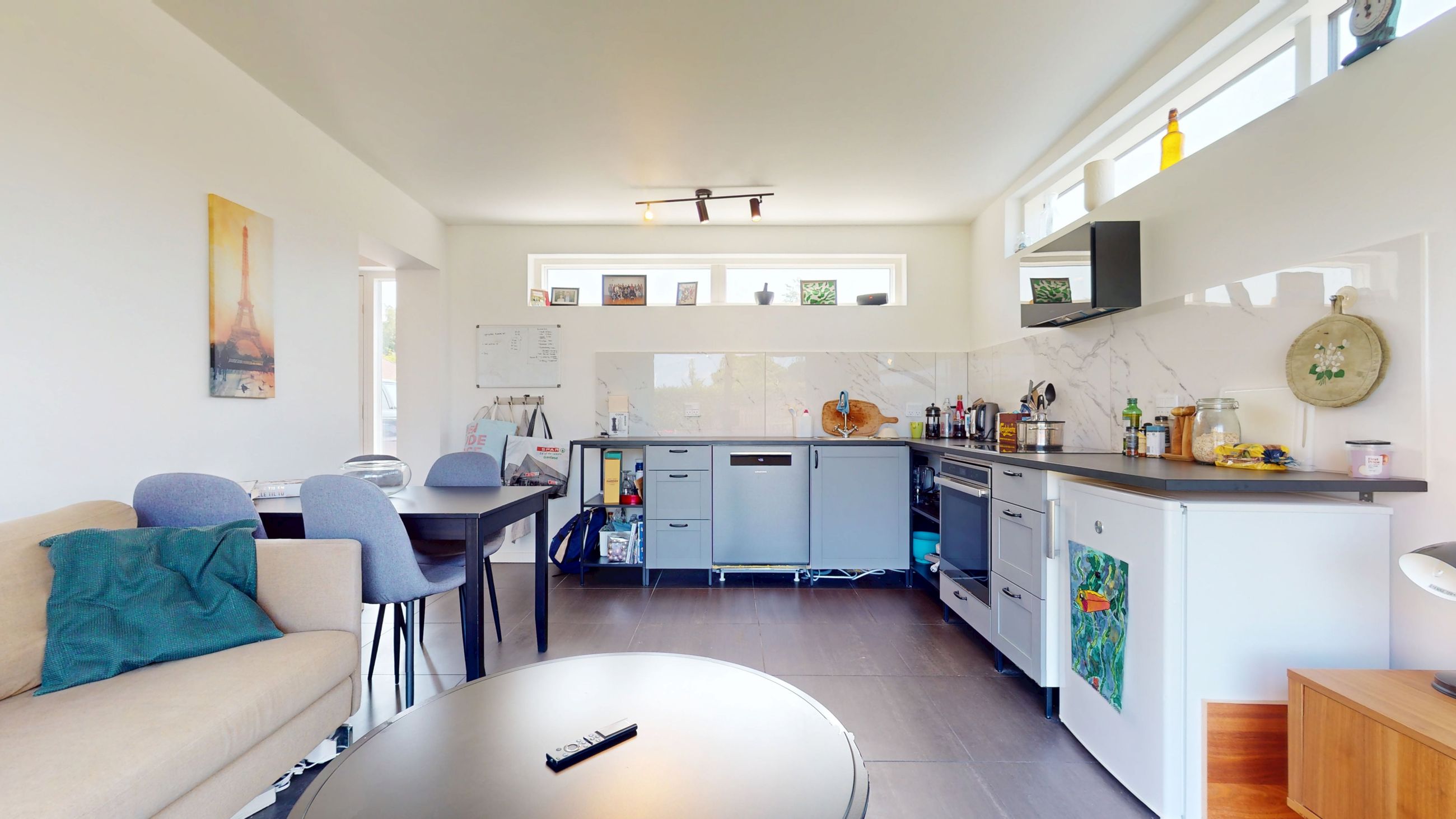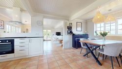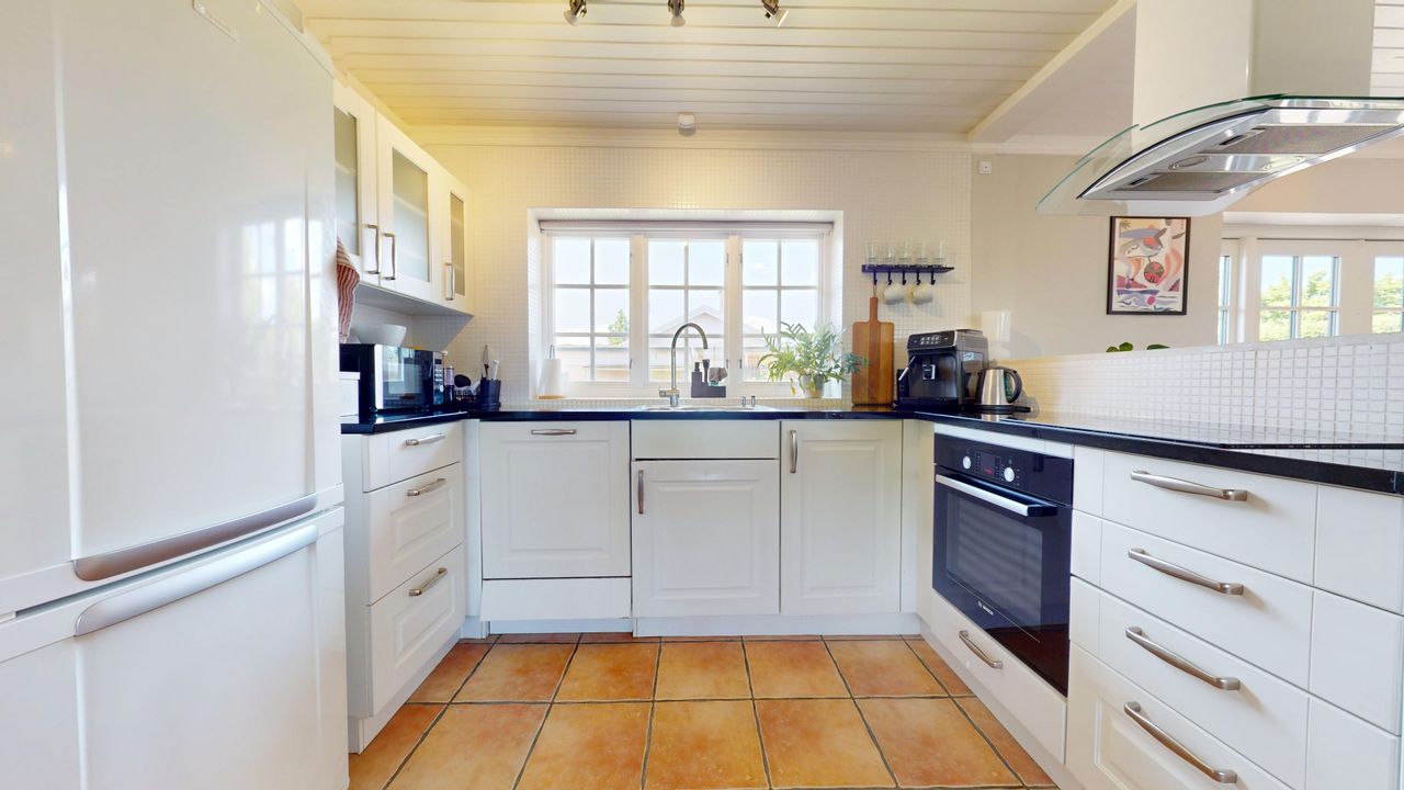 Husets naturlige samlingspunkt er det lyse og indbydende køkken-alrum, hvor der er god plads til både madlavning, lektier og hyggelige aftener med familie og venner.