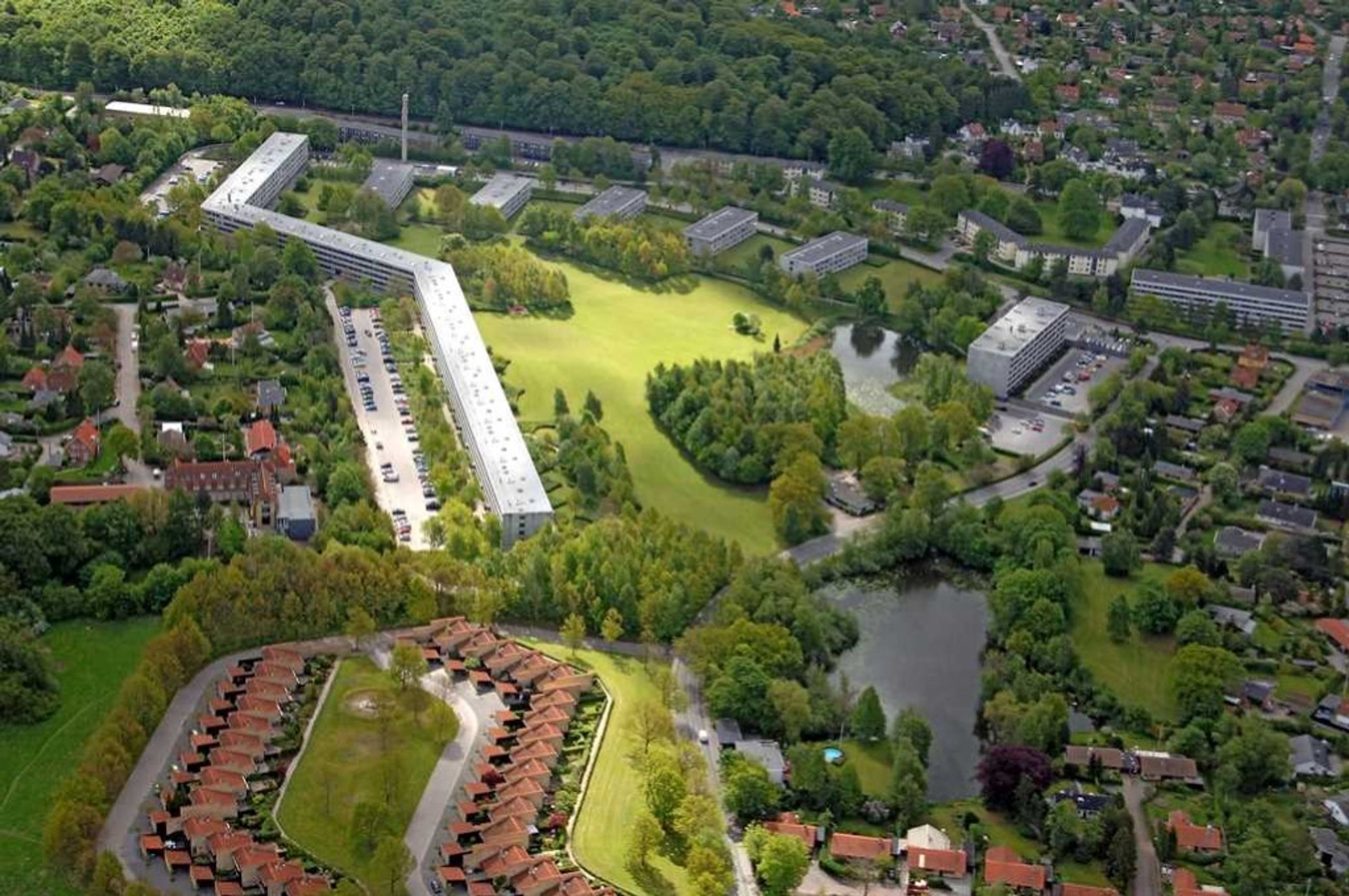 Lejligheden er perfekt placeret i bebyggelsen - øverst med udsigt fra den syd/vestvendte altan over hele parkområdet.