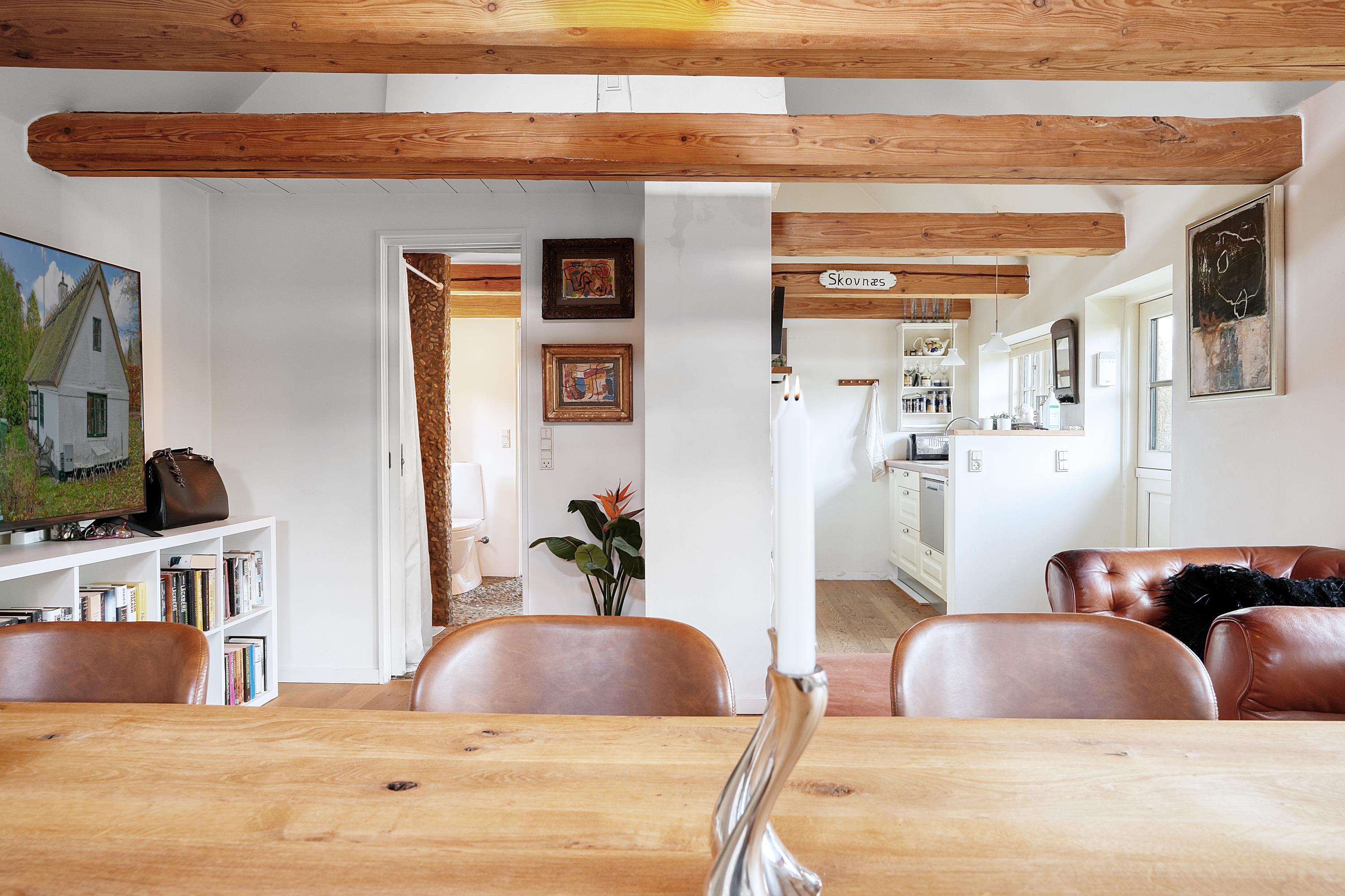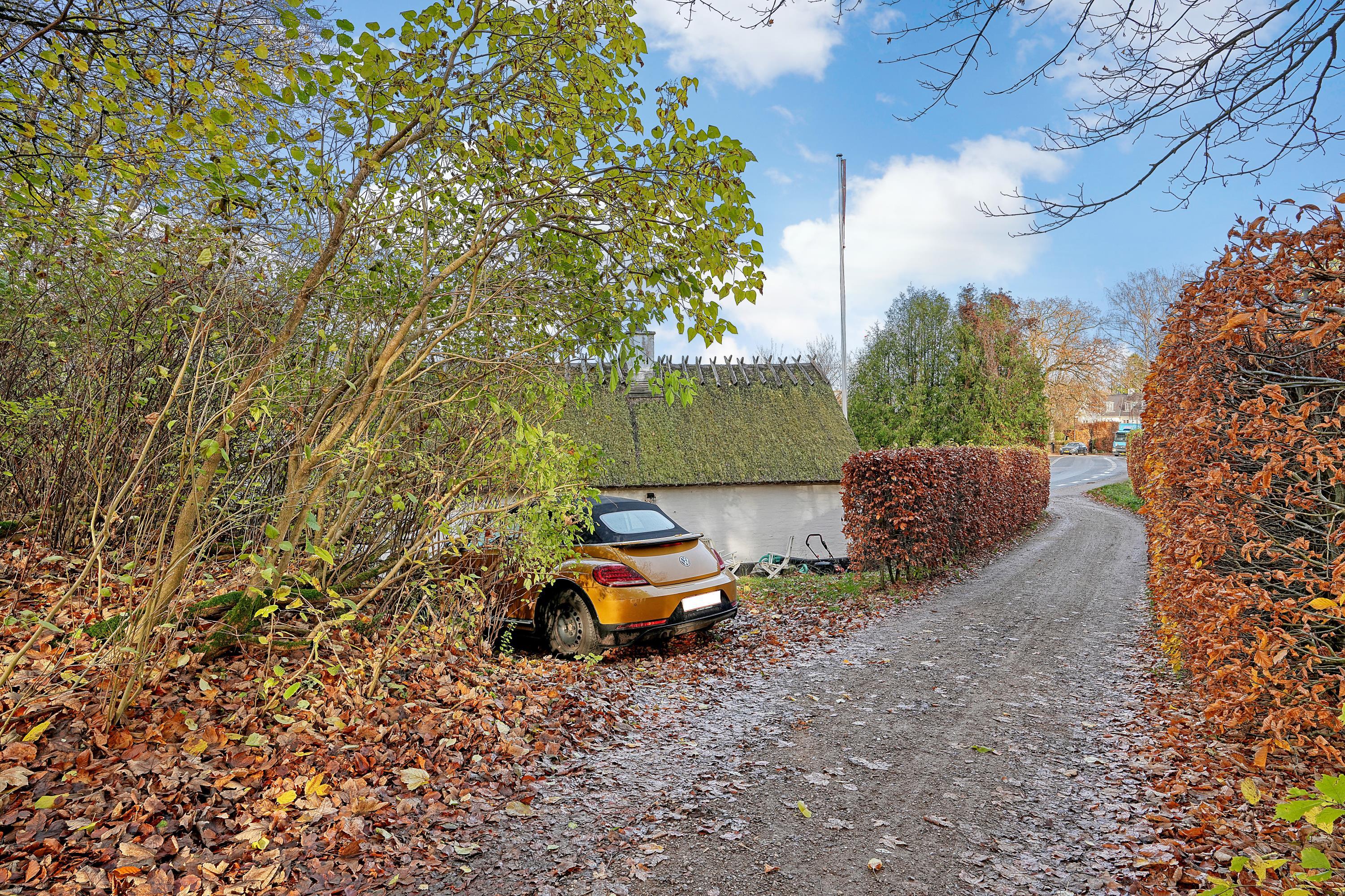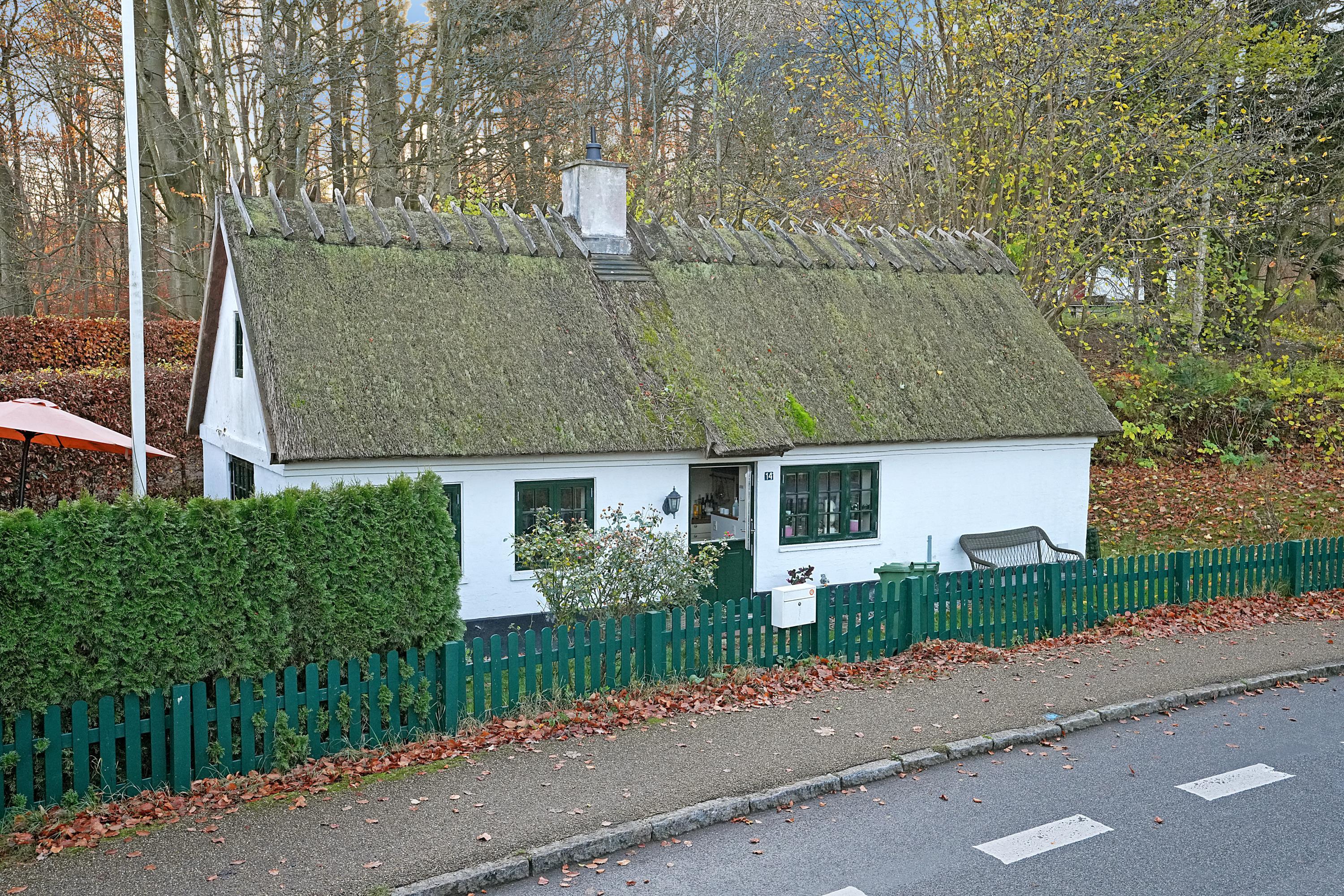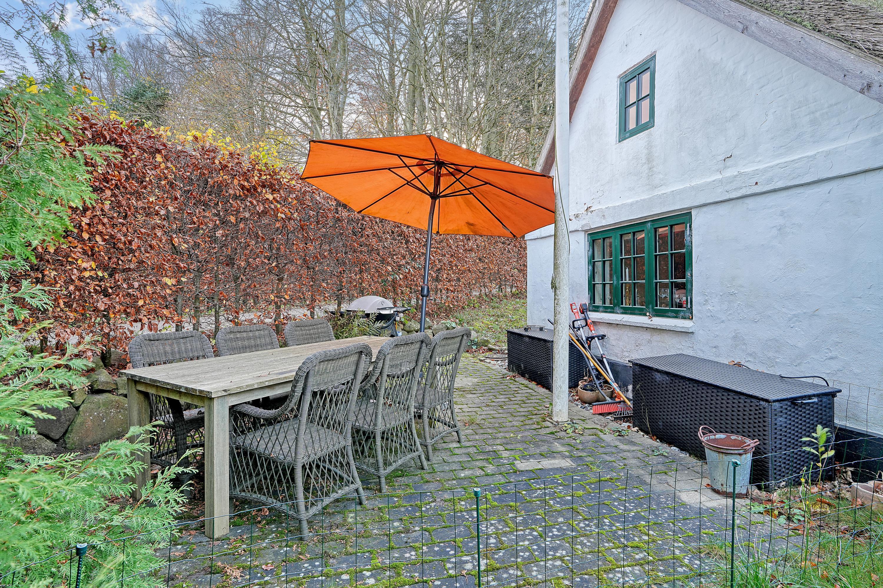 Hist hvor vejen slår en bugt ligger det skønneste lille stråtækte hus direkte til skoven i det attraktive Høsterkøb.
