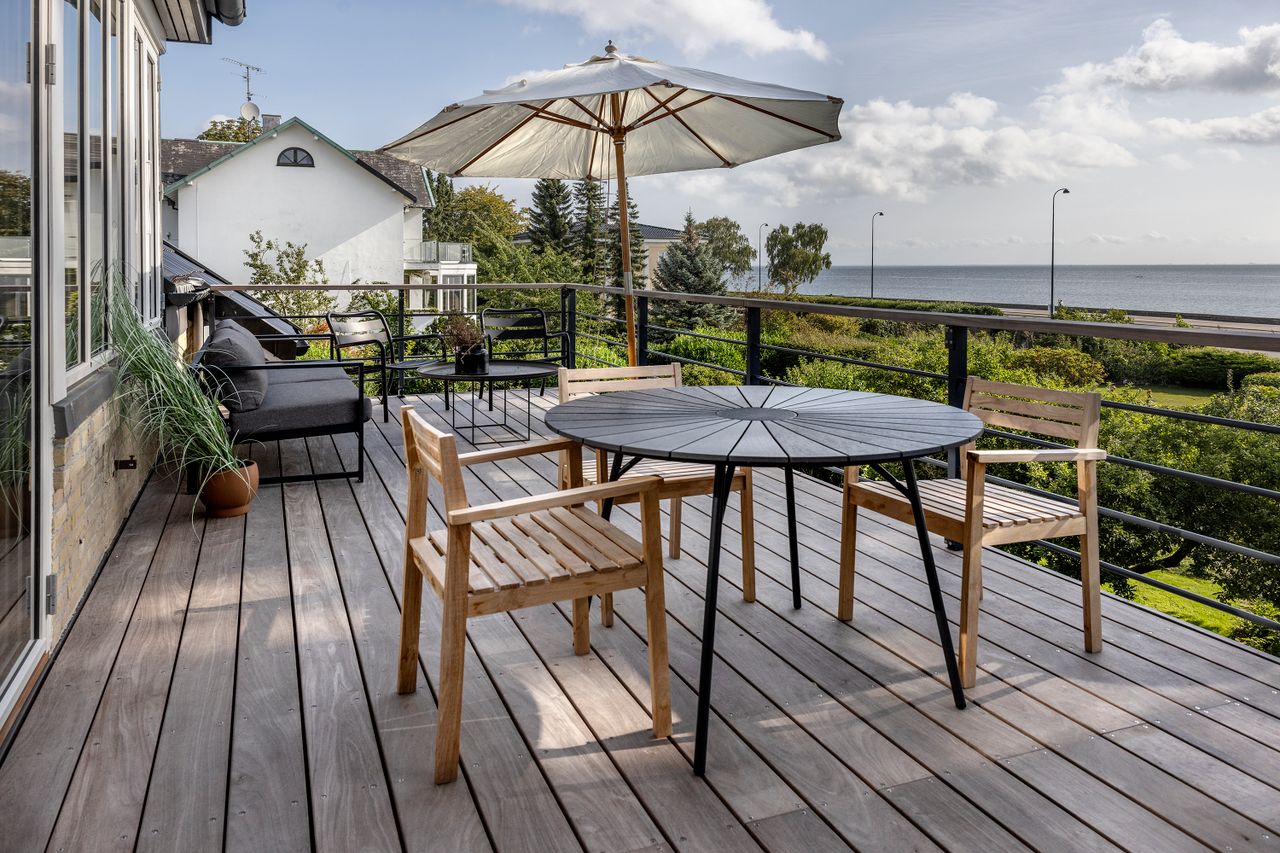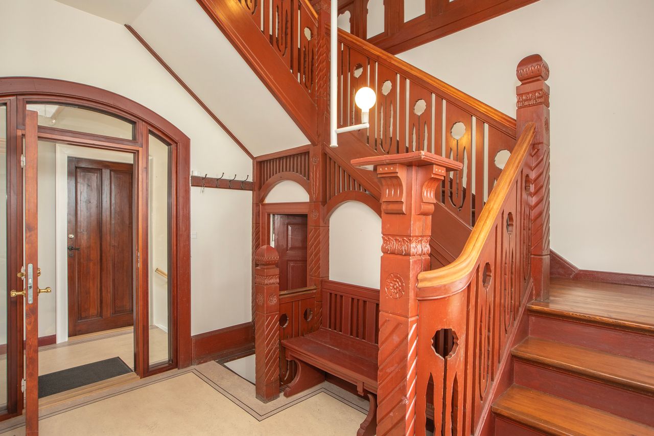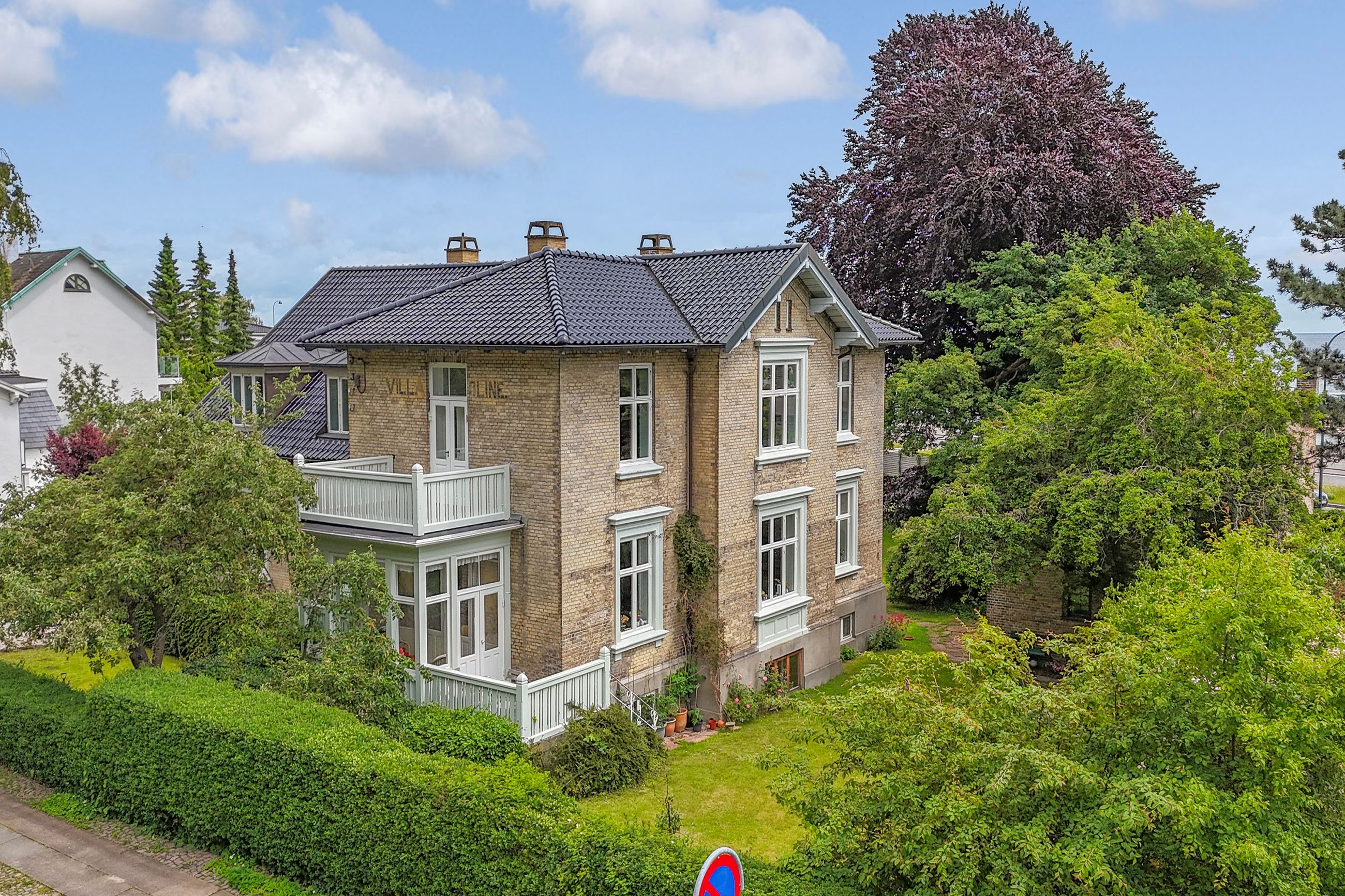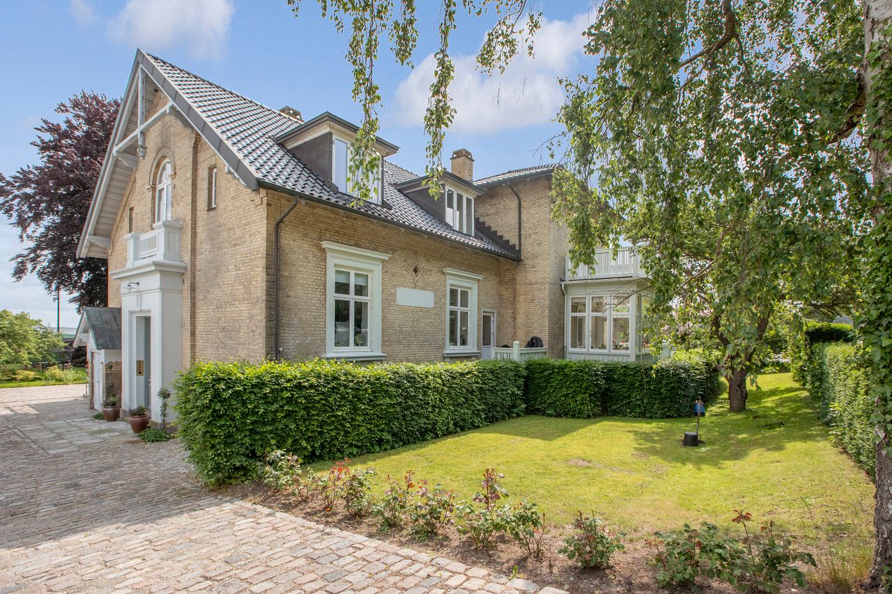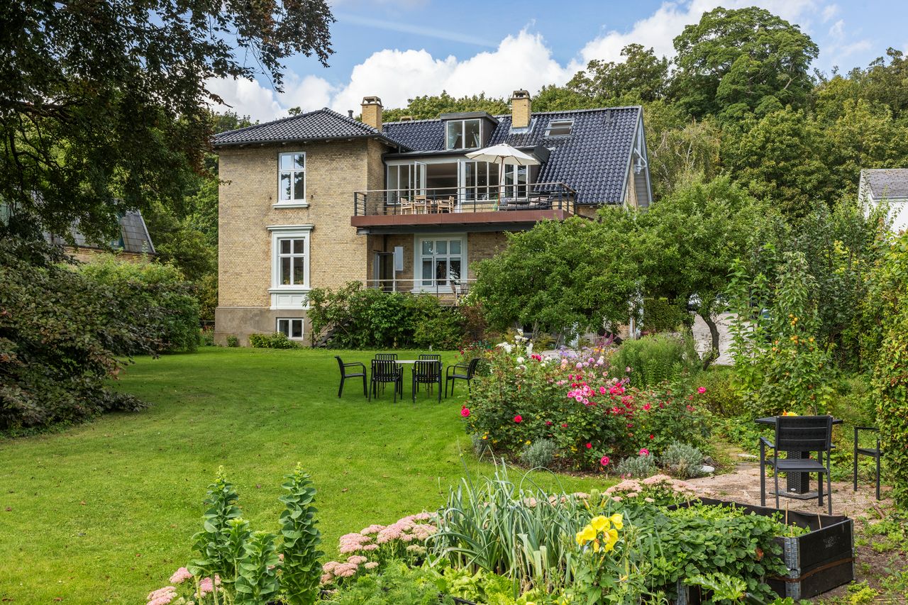 Denne bolig som ligger på 1. og 2. sal i ”Villa Oline” byder på noget helt særligt. Bygningen er af høj kvalitet, bevaringsværdig og står som da den blev opført i 1878 med sine tykke mure med hulmursisolering. Lejligheden – med lys fra alle verdenshjørner – er indrettet og istandsat efter alle kunstens regler. Alene ankomsten til denne bolig er helt speciel. Fornem brolagt indkørsel med planter, belyst om natten. Privat og yderst imponerende hall med unikke detaljer af træskærerarbejde fra en tid, hvor udsøgt håndværk var i højsædet. Flot vinduesparti og smukt loft. Stor repos med plads til kontorarbejdsplads. Præsentabel entré med elegant indbygget garderobe. Gæstebadeværelse med high end armatur, vask og sanitet. Værelse med kvist og udsigt til skoven. Stort køkken-alrum/stue i ét med kvist til skoven og dobbeltdør til meget stor altan med enestående flot udsigt til Øresund. Mellemgang med indbyggede skabe med stilfulde snedkerlåger, hvoraf den ene fører videre op til 2. sal. Klassisk stue med højt til loftet og indbyggede skabe. Videre adgang til stue/bibliotek med udgang til vestvendt terrasse med udsigt til skoven. Soveværelse mod Øresund med direkte adgang til praktisk vaskerum med de bedste maskiner samt separat toilet og separat badeværelse – Begge med høj kvalitet i materialer og i moderne og eksklusiv stil. Alt nyt og aldrig brugt. 2. sal byder på en ekstra mulighed for hjemmekontor eller teenageafdeling, alt efter behov. Også her flot udsigt over Sundet.