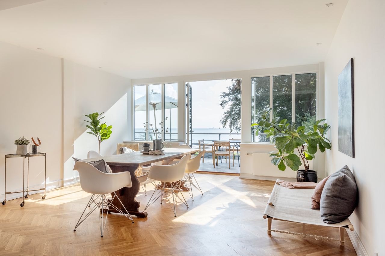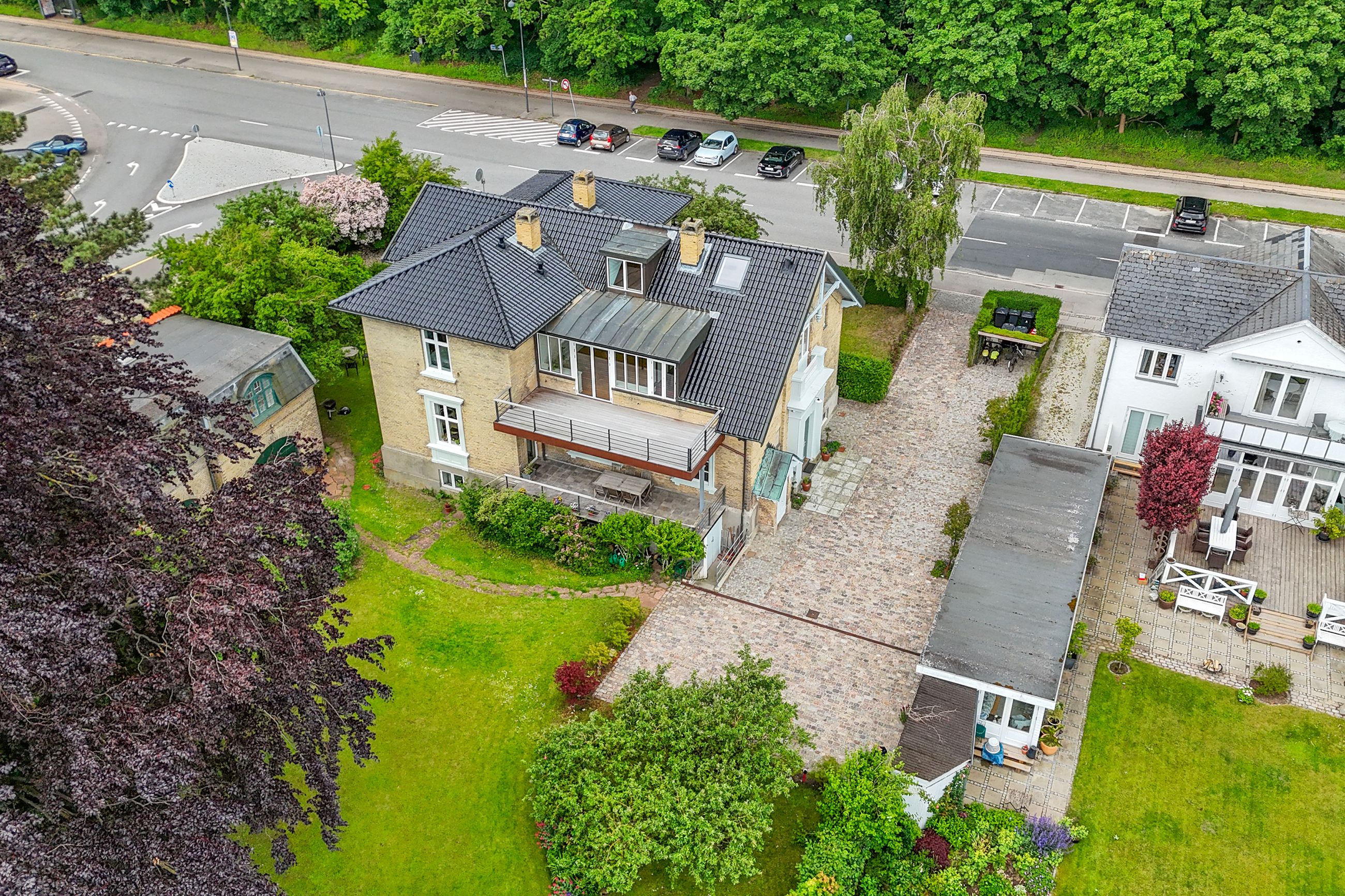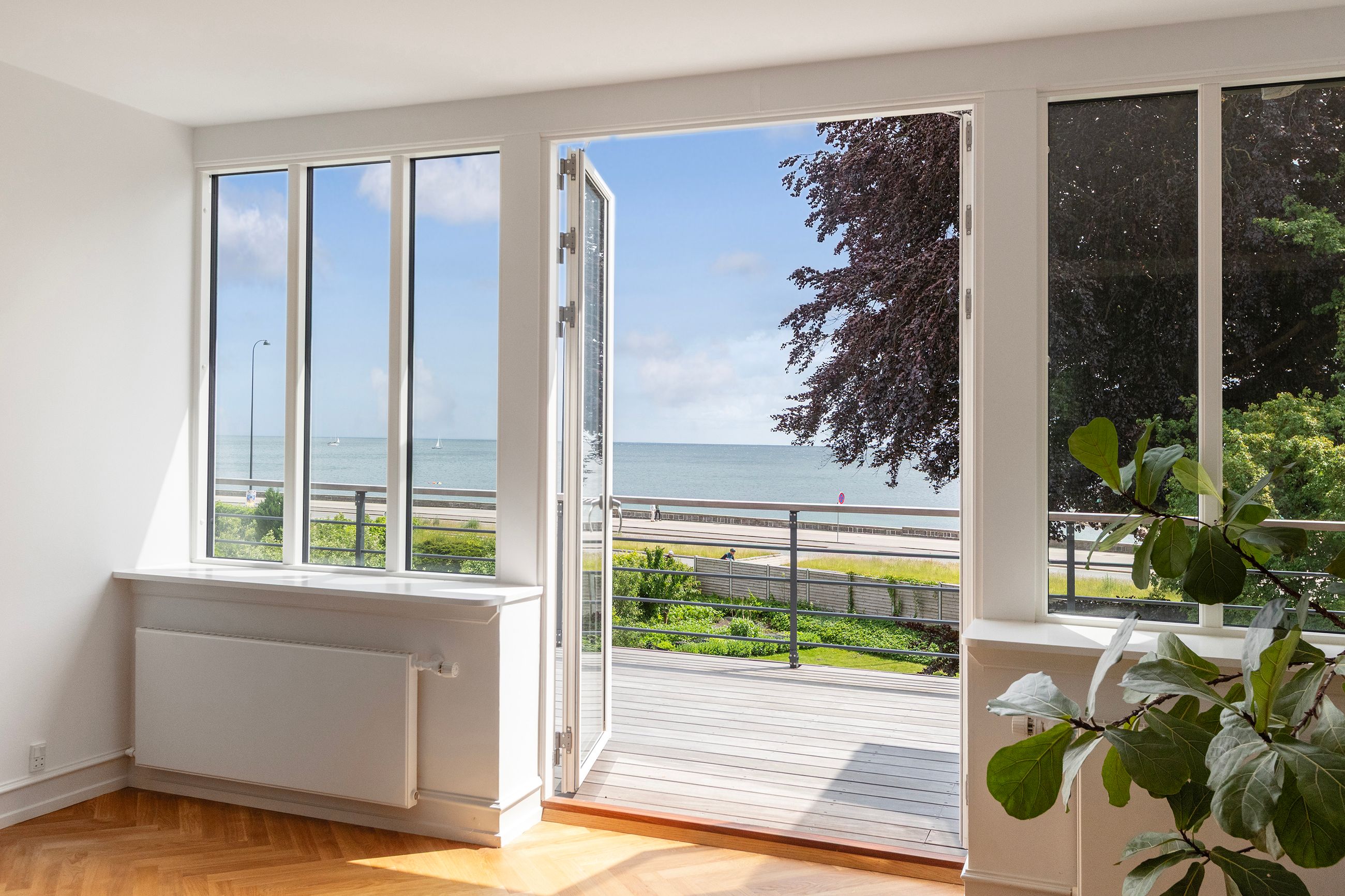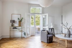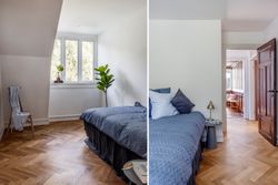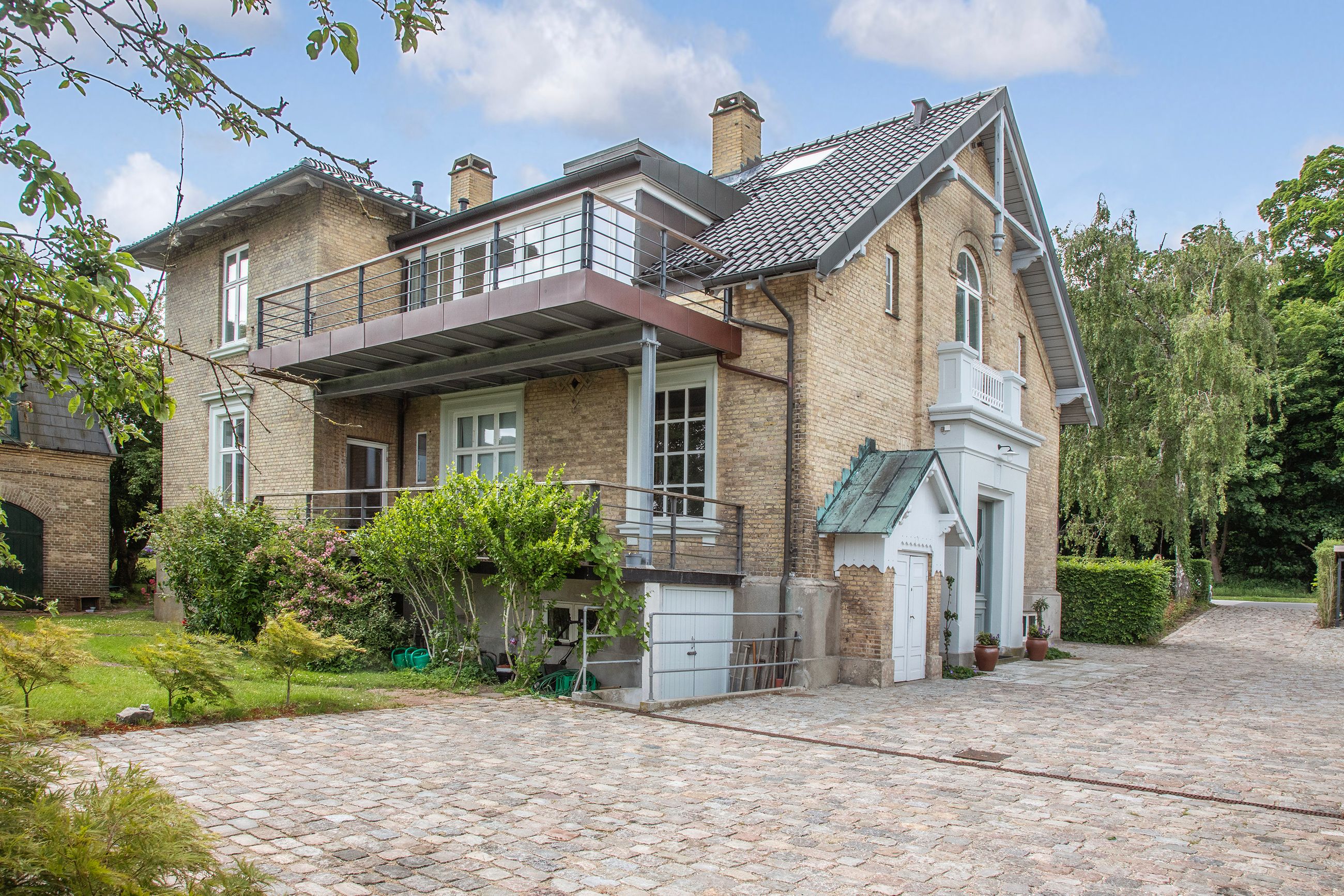Denne bolig som ligger på 1. og 2. sal i ”Villa Oline” byder på noget helt særligt. Bygningen er af høj kvalitet, bevaringsværdig og står som da den blev opført i 1878 med sine tykke mure med hulmursisolering. Lejligheden – med lys fra alle verdenshjørner – er indrettet og istandsat efter alle kunstens regler. Alene ankomsten til denne bolig er helt speciel. Fornem brolagt indkørsel med planter, belyst om natten. Privat og yderst imponerende hall med unikke detaljer af træskærerarbejde fra en tid, hvor udsøgt håndværk var i højsædet. Flot vinduesparti og smukt loft. Stor repos med plads til kontorarbejdsplads. Præsentabel entré med elegant indbygget garderobe. Gæstebadeværelse med high end armatur, vask og sanitet. Værelse med kvist og udsigt til skoven. Stort køkken-alrum/stue i ét med kvist til skoven og dobbeltdør til meget stor altan med enestående flot udsigt til Øresund. Mellemgang med indbyggede skabe med stilfulde snedkerlåger, hvoraf den ene fører videre op til 2. sal. Klassisk stue med højt til loftet og indbyggede skabe. Videre adgang til stue/bibliotek med udgang til vestvendt terrasse med udsigt til skoven. Soveværelse mod Øresund med direkte adgang til praktisk vaskerum med de bedste maskiner samt separat toilet og separat badeværelse – Begge med høj kvalitet i materialer og i moderne og eksklusiv stil. Alt nyt og aldrig brugt. 2. sal byder på en ekstra mulighed for hjemmekontor eller teenageafdeling, alt efter behov. Også her flot udsigt over Sundet.