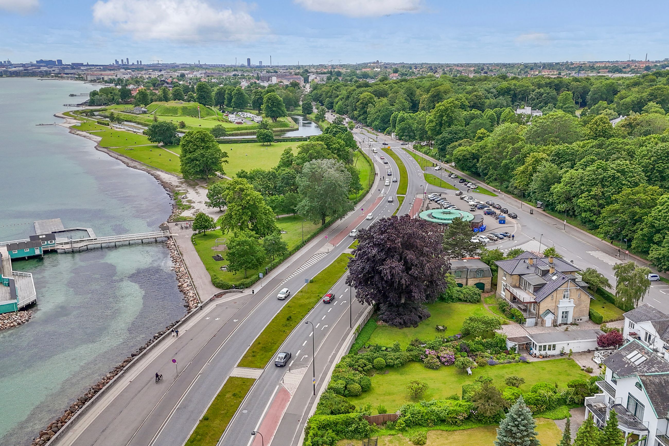 Attraktiv beliggenhed med Øresund på den ene side og skoven på den anden. Midt imellem Charlottenlunds indkøbscentrum på Jægersborg Allé, Hellerup og Skovshoved Havn. Charmerende stemning med både Café Jorden Rundt, Skovridderkroen og Fortet indenfor et par hundrede meter. På den anden side af vejen ligger den ikoniske badeanstalt for dem som ønsker at mærke havet.