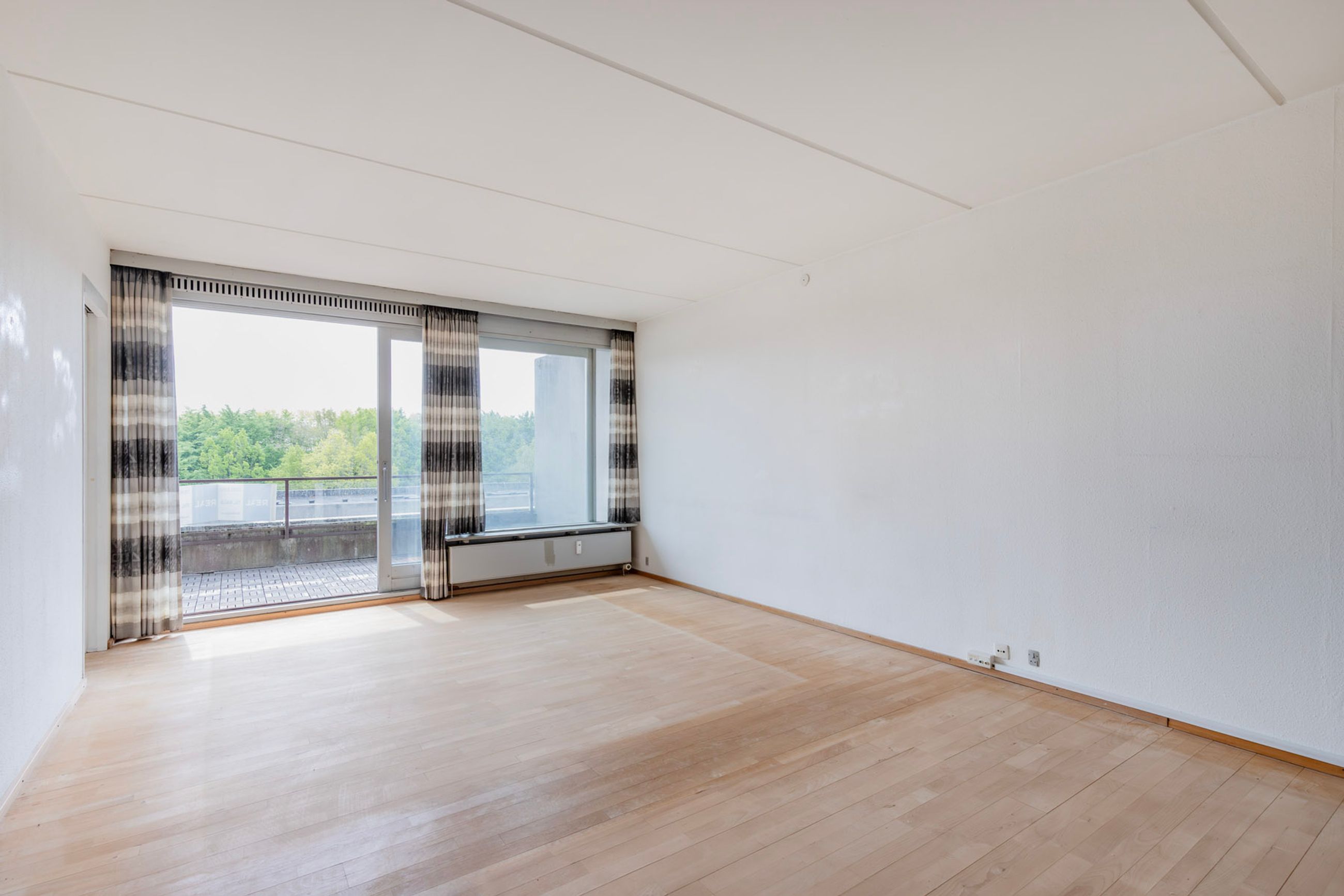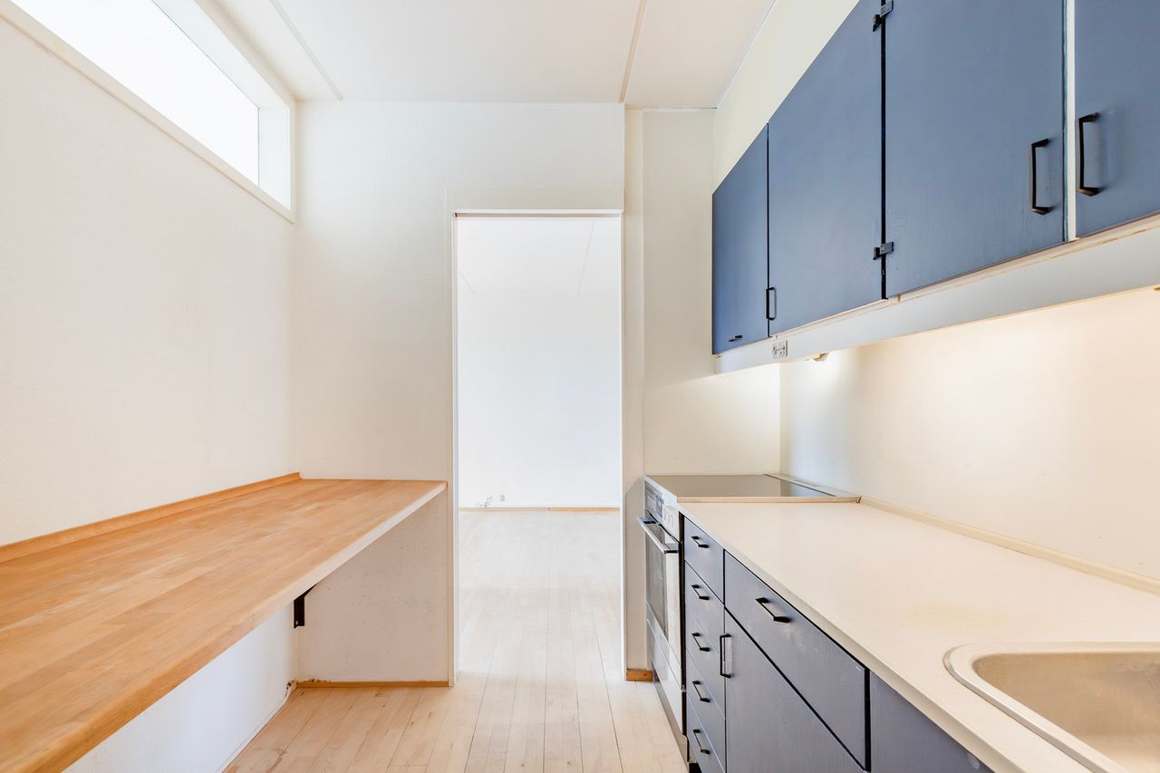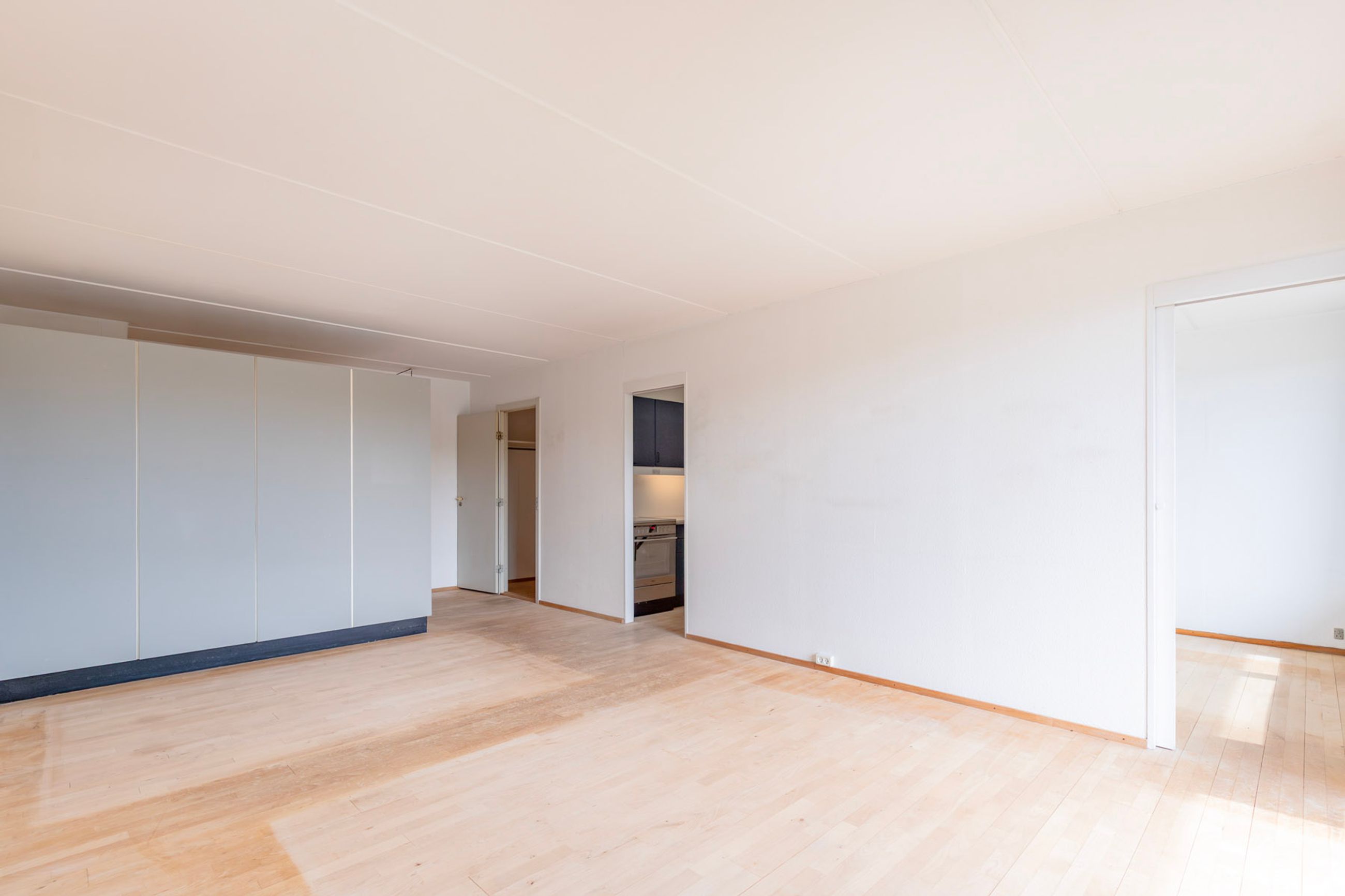 Lejligheden er indrettet med en dejlig lys og rummelig stue. Der er gulv-til-loft vinduesparti mod syd og skydedør ud til den kæmpestore terrasse. Her kan solen og udsigten til skov nydes fra morgen til aften. Køkkenet er originalt med god skabs- og bordplads, badeværelset er ligeledes originalt med badekar. Herudover et lyst værelse mod syd samt et garderoberum.