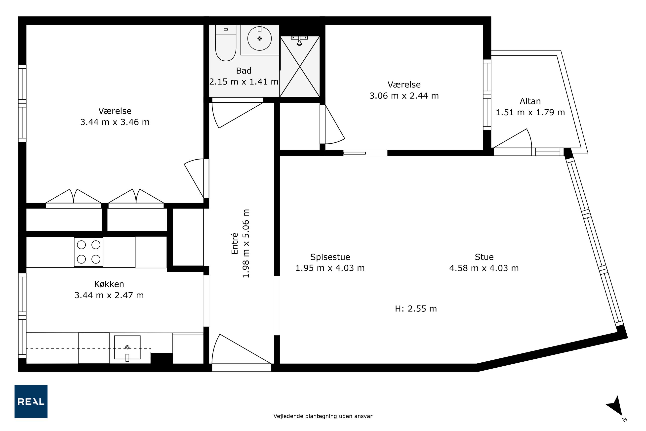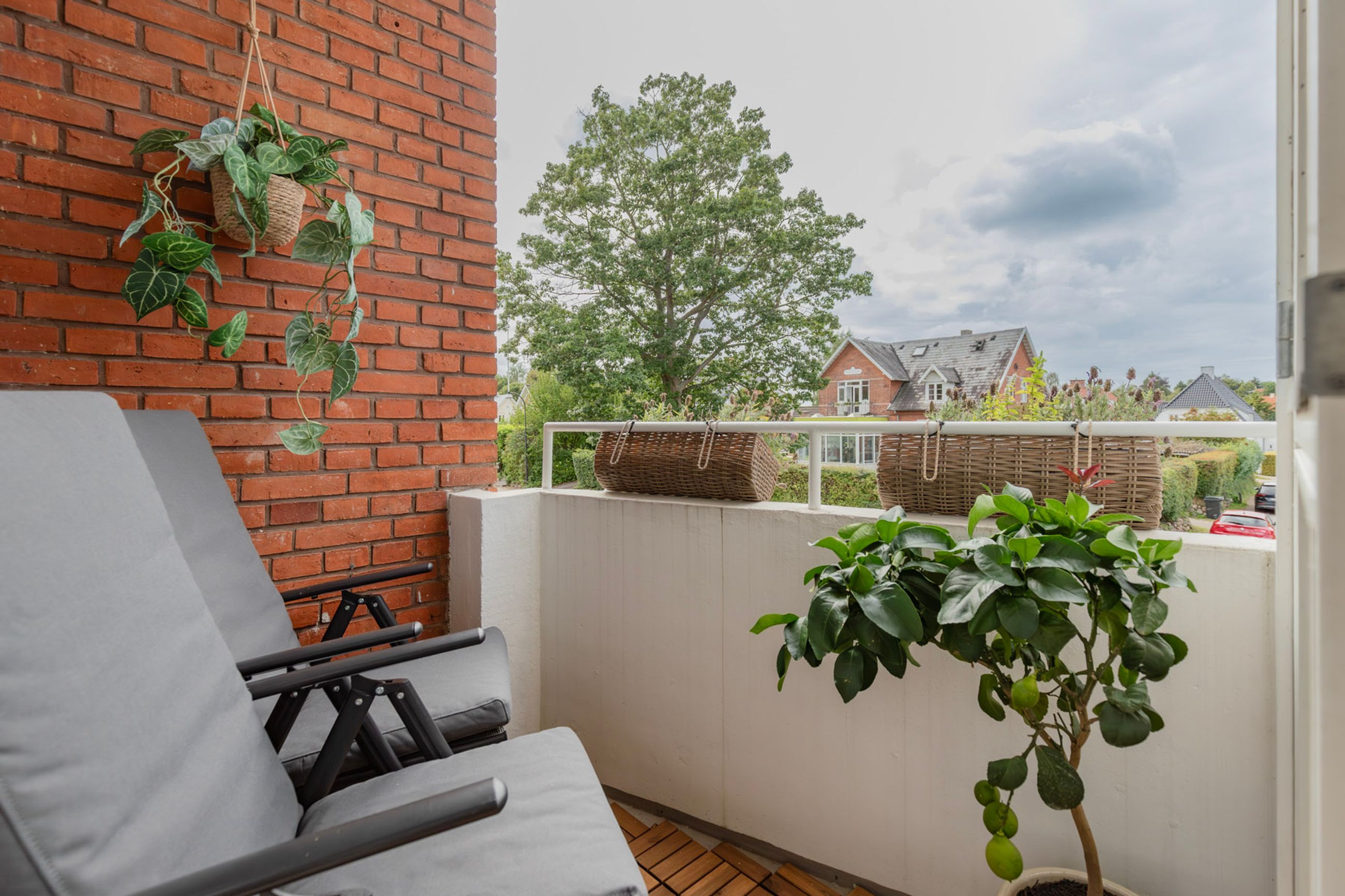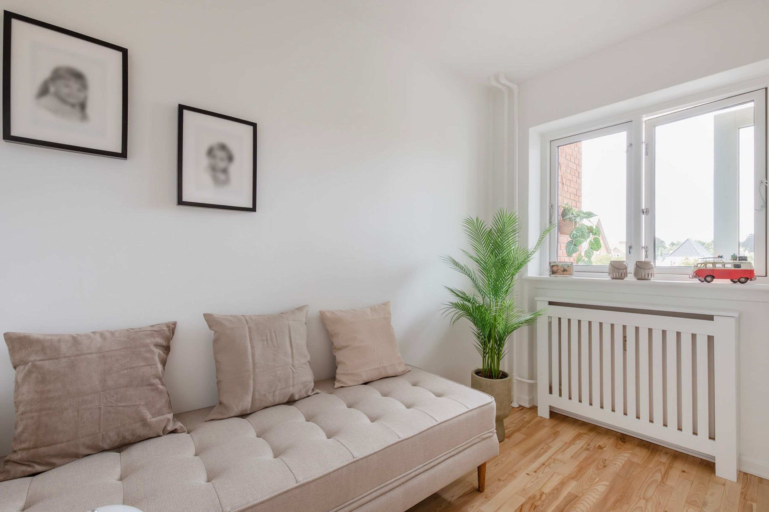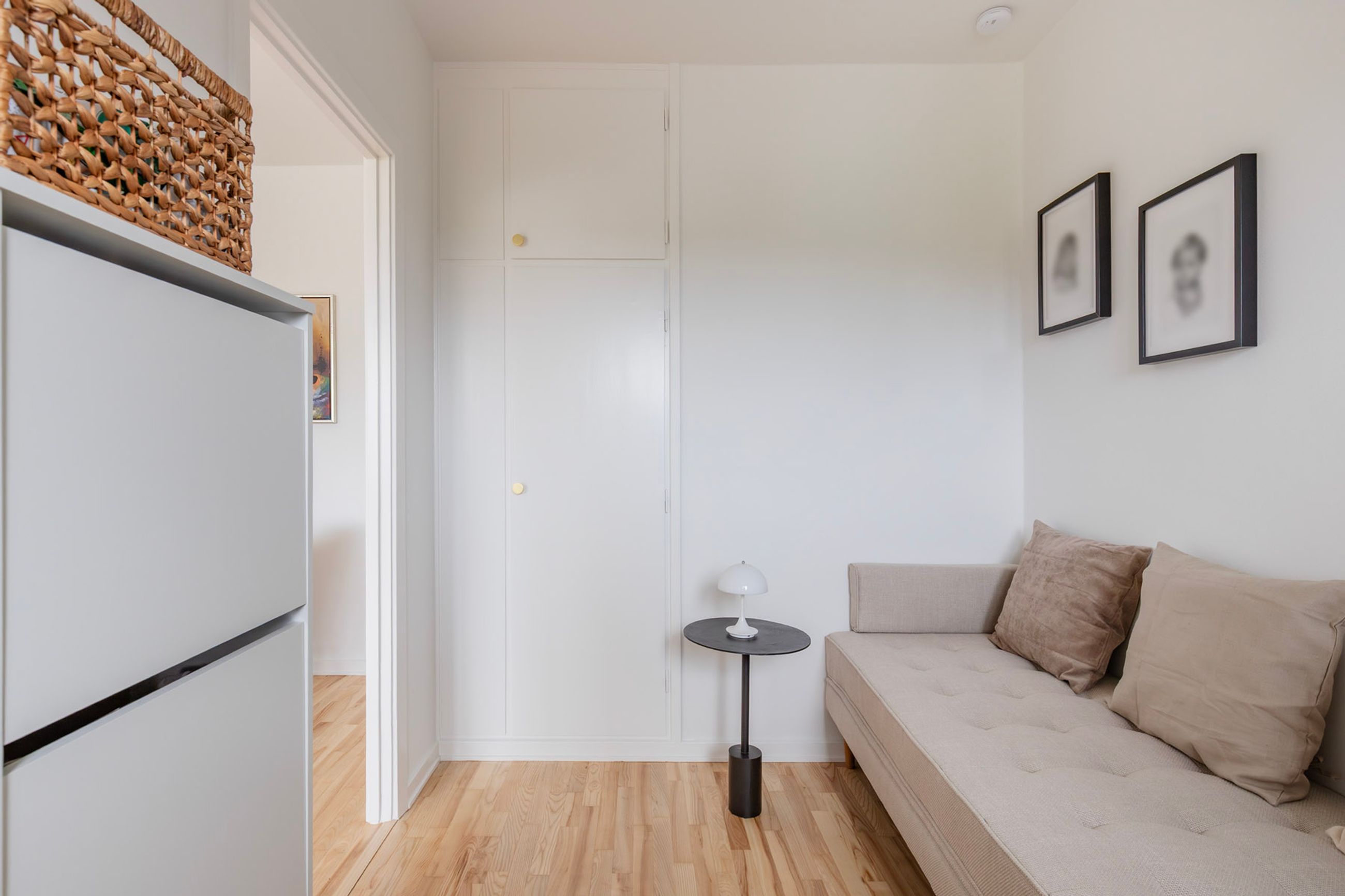 God lys entré med indbygget skab, hvor der er god plads til opbevaring samt tørretumbler. Der er åbnet op både ind til stuen og ud til køkkenet, så lyset frit kan strømme gennem lejligheden. Stuen er dejlig rummelig med god plads til både spisebord og sofaarrangement. Herfra er der også udgang til den vestvendte altan med fantastisk udsigt over villakvarteret. Fra stuen er der adgang til et værelse, oplagt som kontor, soveværelse eller gæsteværelse.