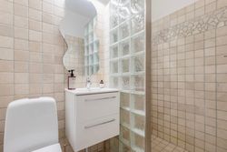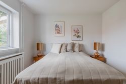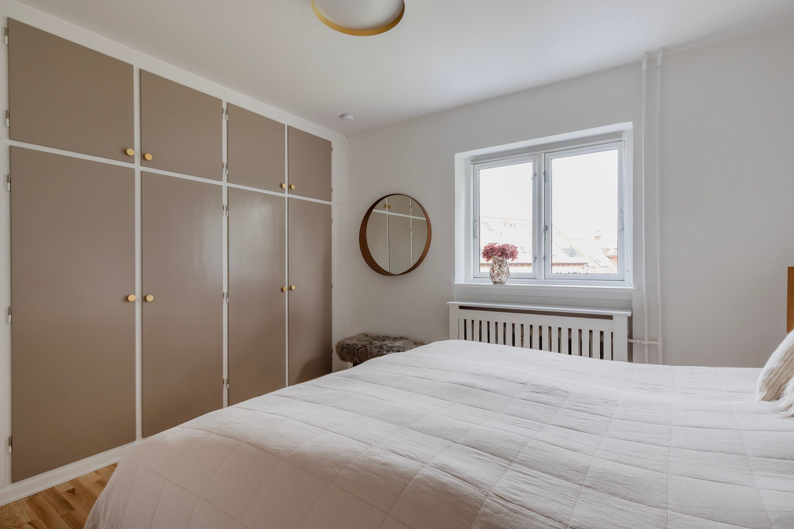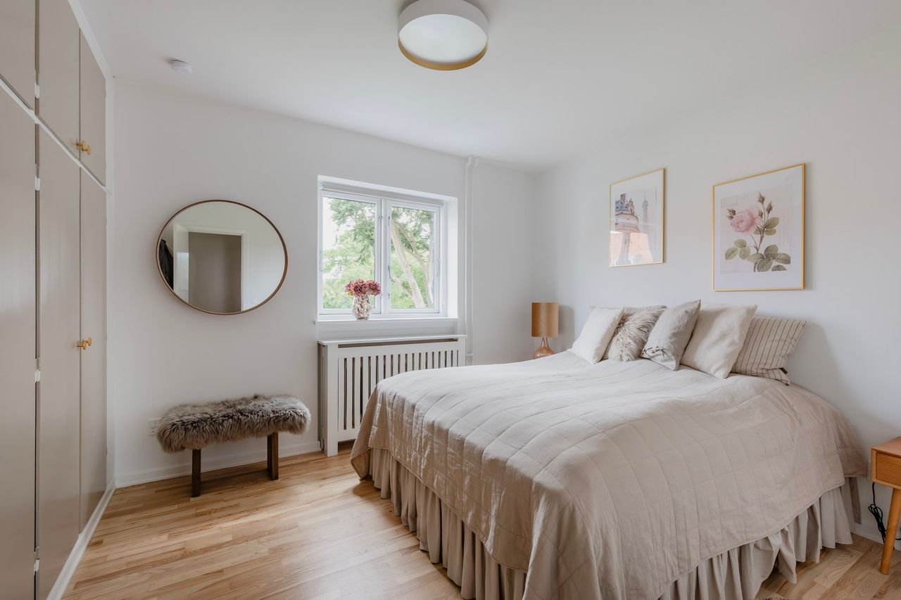 Herudover byder lejligheden på et dejligt stort soveværelse med vindue mod gården. Her er der stor original indbygget skabsvæg, som dog er moderniseret. Badeværelset er for år tilbage blevet renoveret og for nyligt moderniseret, så det fremstår pænt og indbydende. Her er der separat bruseniche.