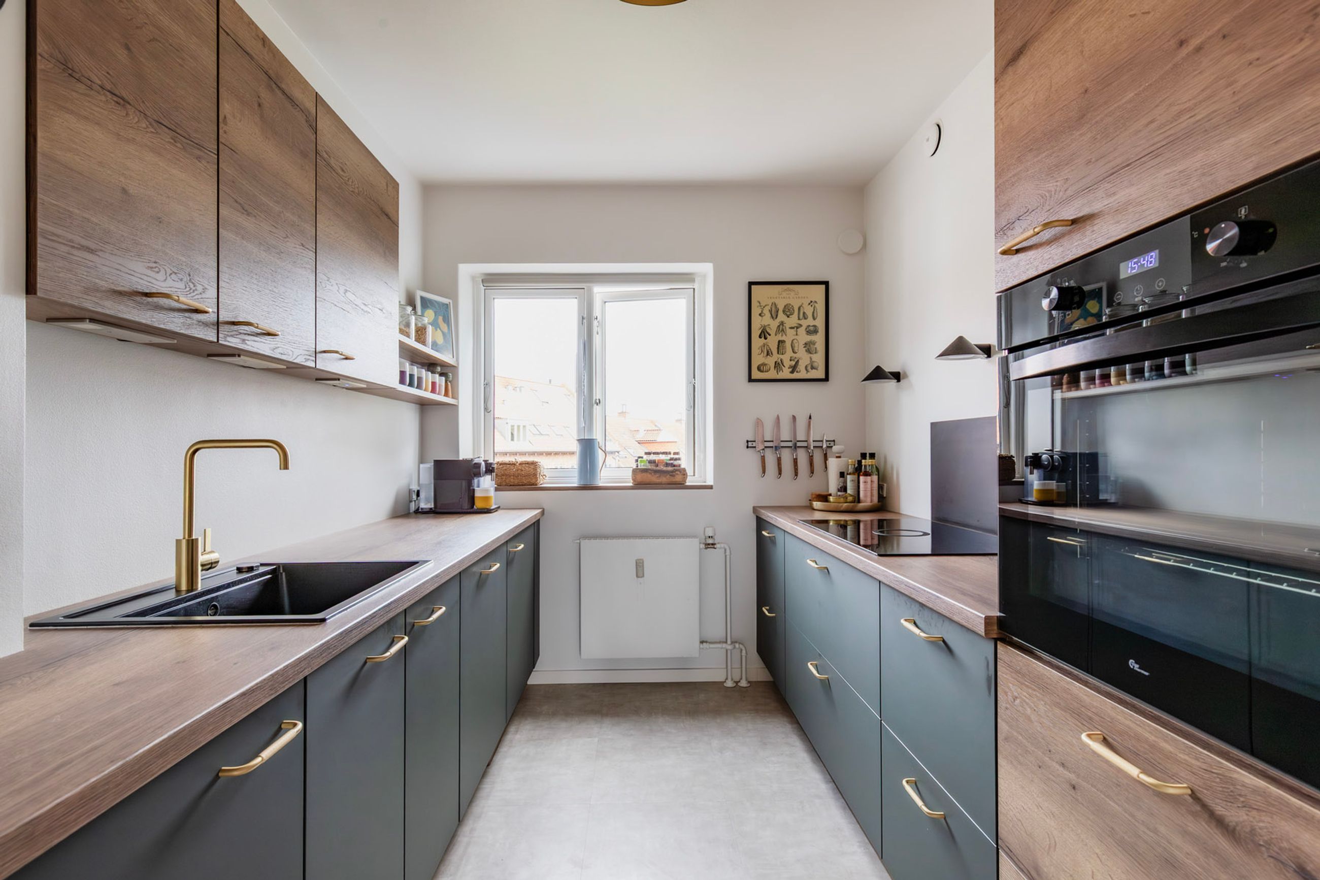Køkkenet er fra Vordingborg og helt nyt fra i år med integreret opvaskemaskine og vaskemaskine. Herfra et hyggeligt kig til gården og Geelskov i det fjerne.
