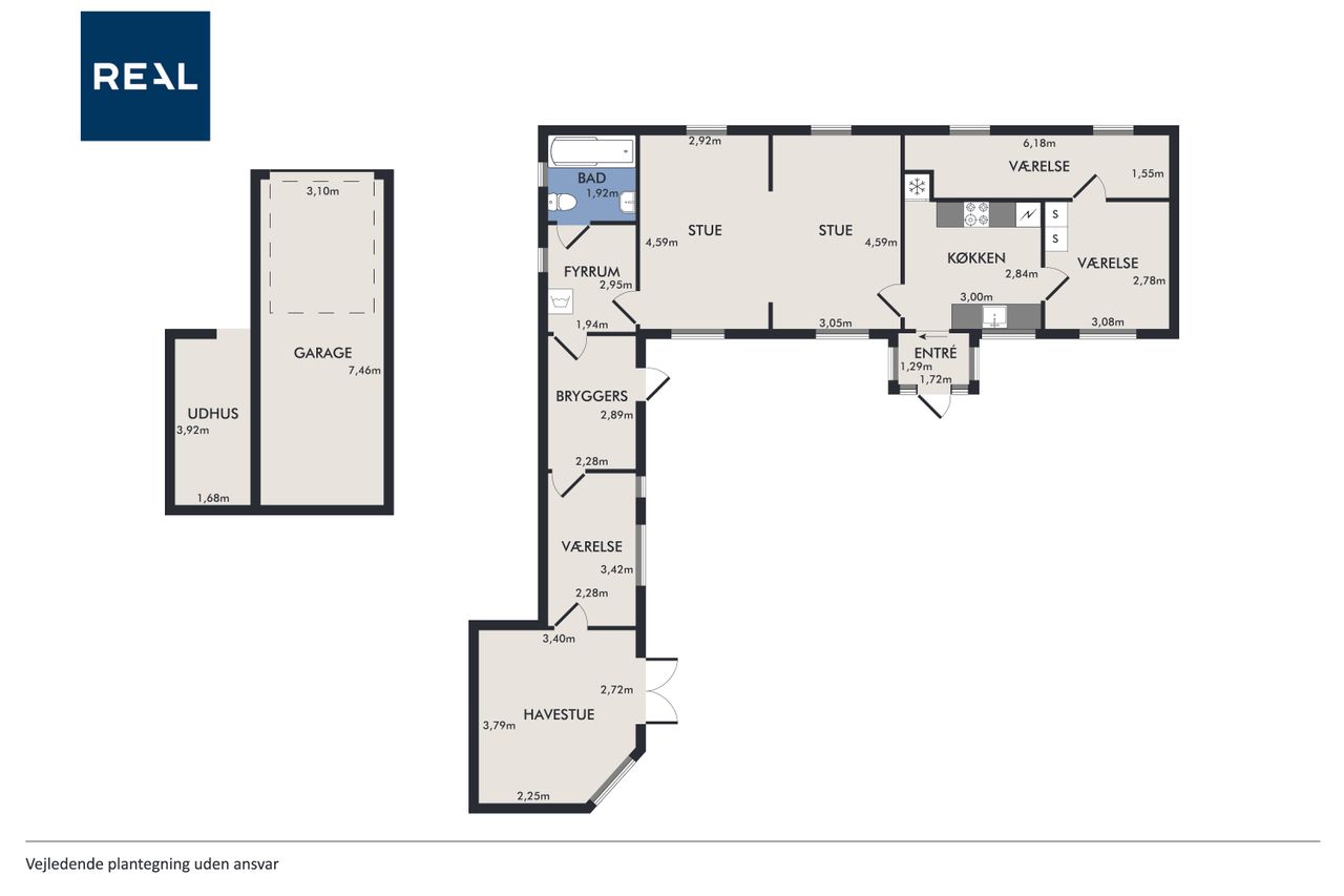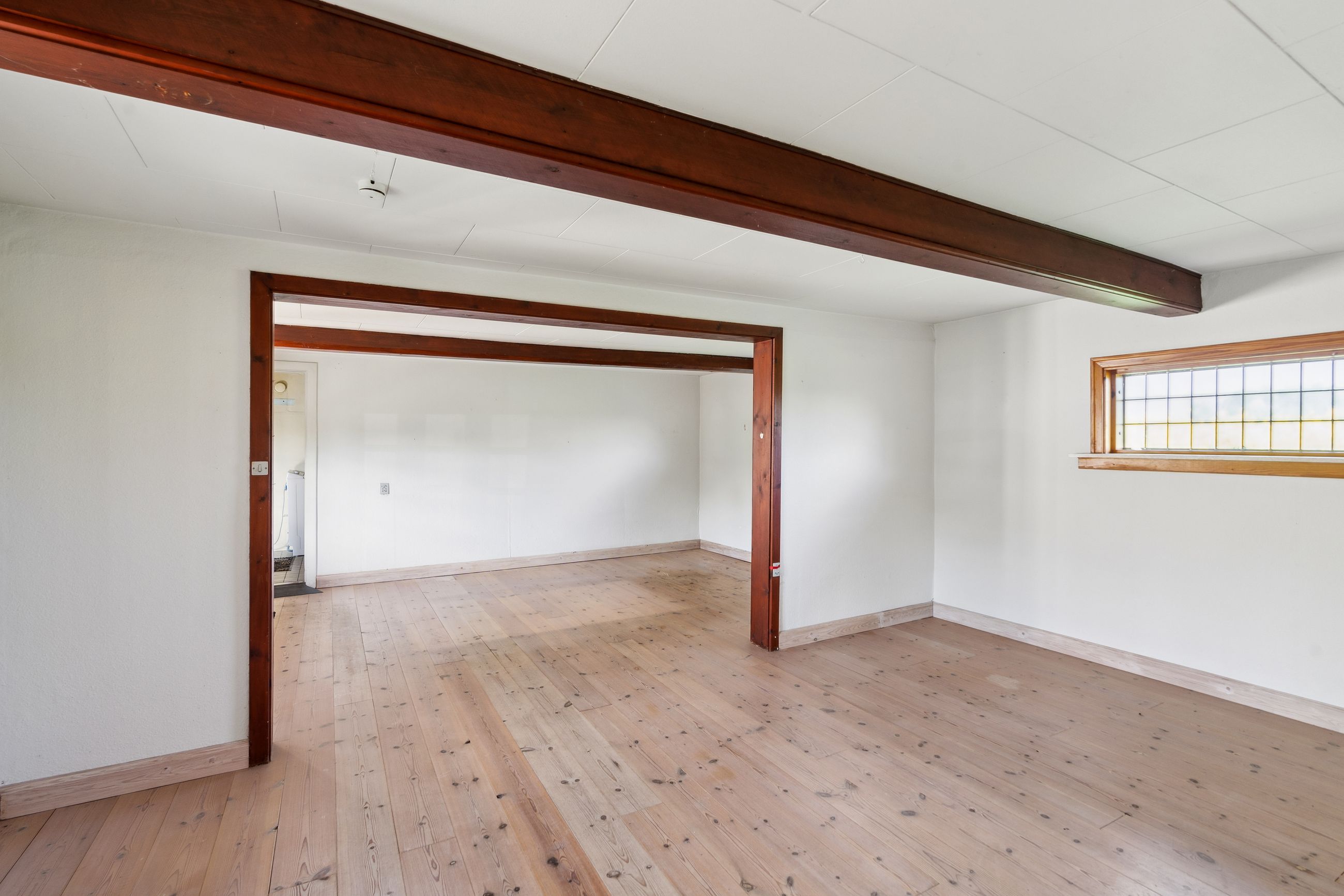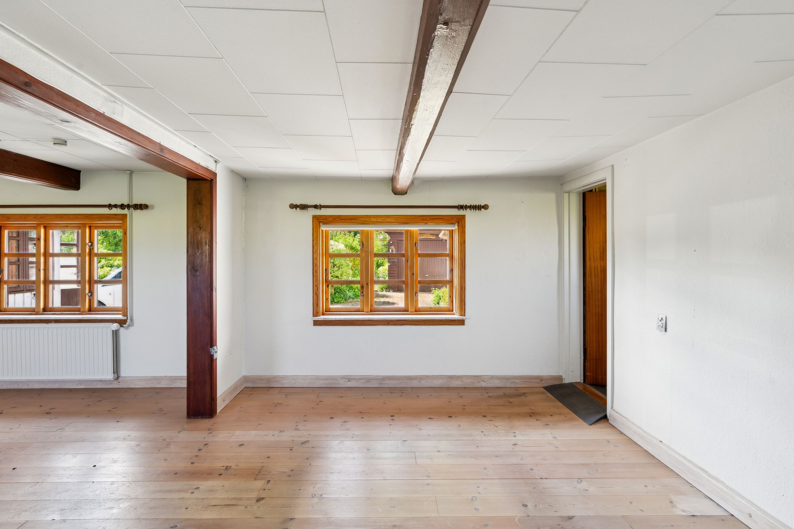 Entre med klinkegulv. Køkken med fyldningslåger og massive bordplader. 2 stuer ensuite med brede gulvbrædder. Værelse med skabsplads. Værelse med udsigt til de åbne marker. Vaskerum/fyrrum. Flisebadeværelse med kar. Bryggers med klinkegulv. Værelse med udsigt til haven. Havestue.