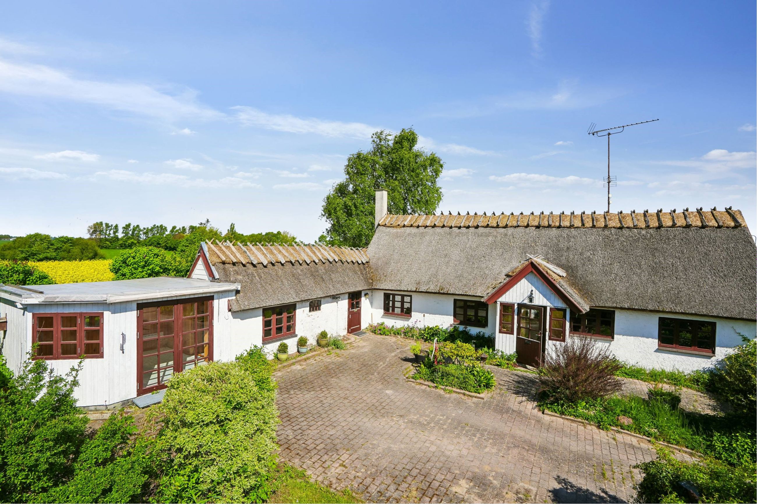 Hyggelig landhus fra 1827 med sprossede vinduer, hvidmalede facader og stråtag (fra ca. 2015). Beliggende på stor veltilplantet grund med mange træer, buske og