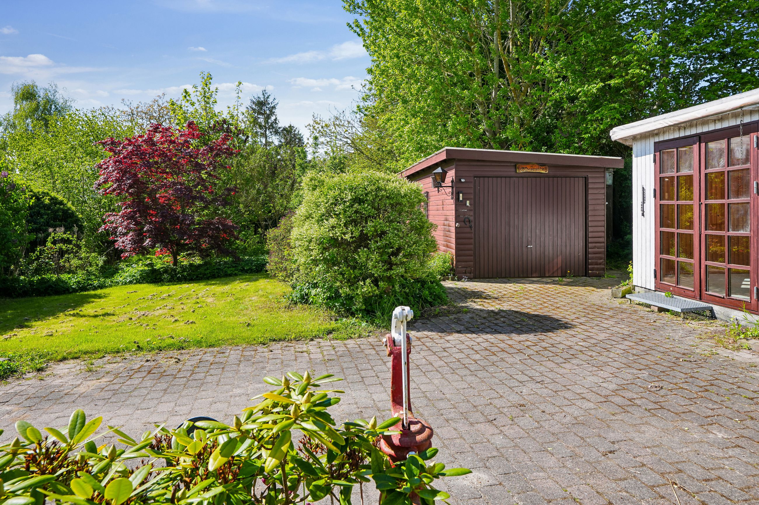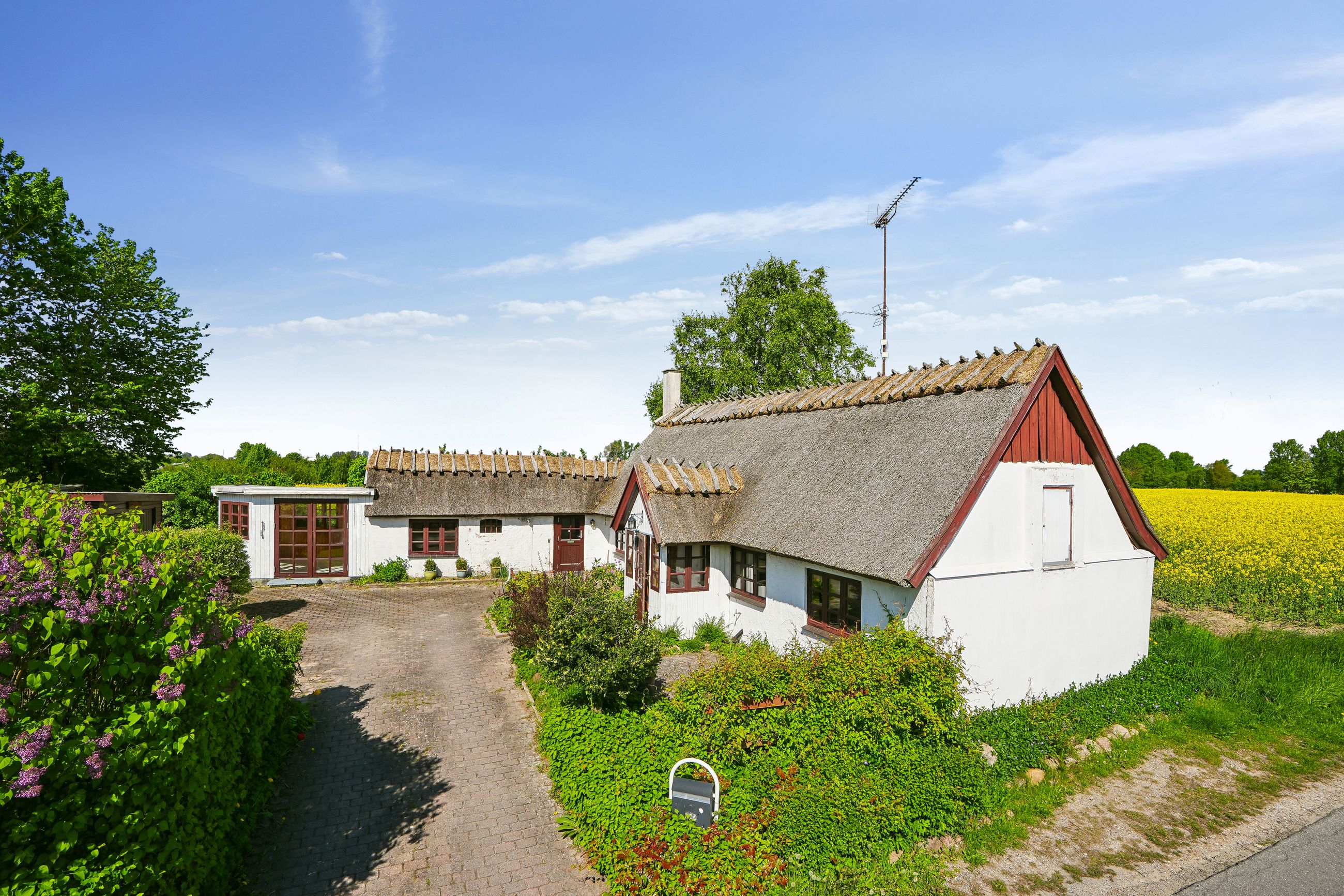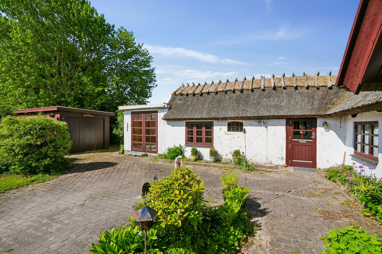 Hyggelig landhus fra 1827 med sprossede vinduer, hvidmalede facader og stråtag (fra ca. 2015). Beliggende på stor veltilplantet grund med mange træer, buske og blomster. Foran huset findes en fin gårdsplads/terrasse og bag ved huset ligger der åbne marker på to af husets sider. Desuden findes en stor garage, havestue og udhus.