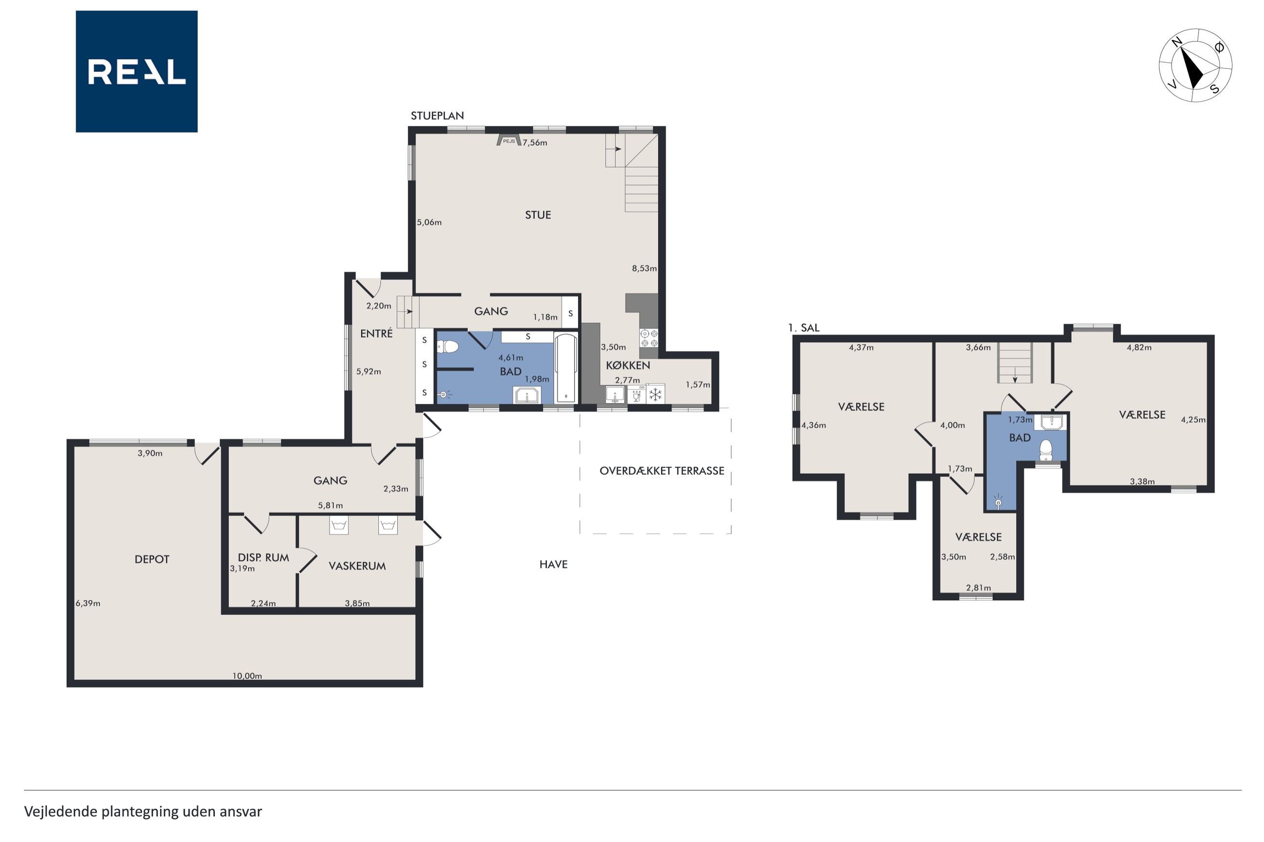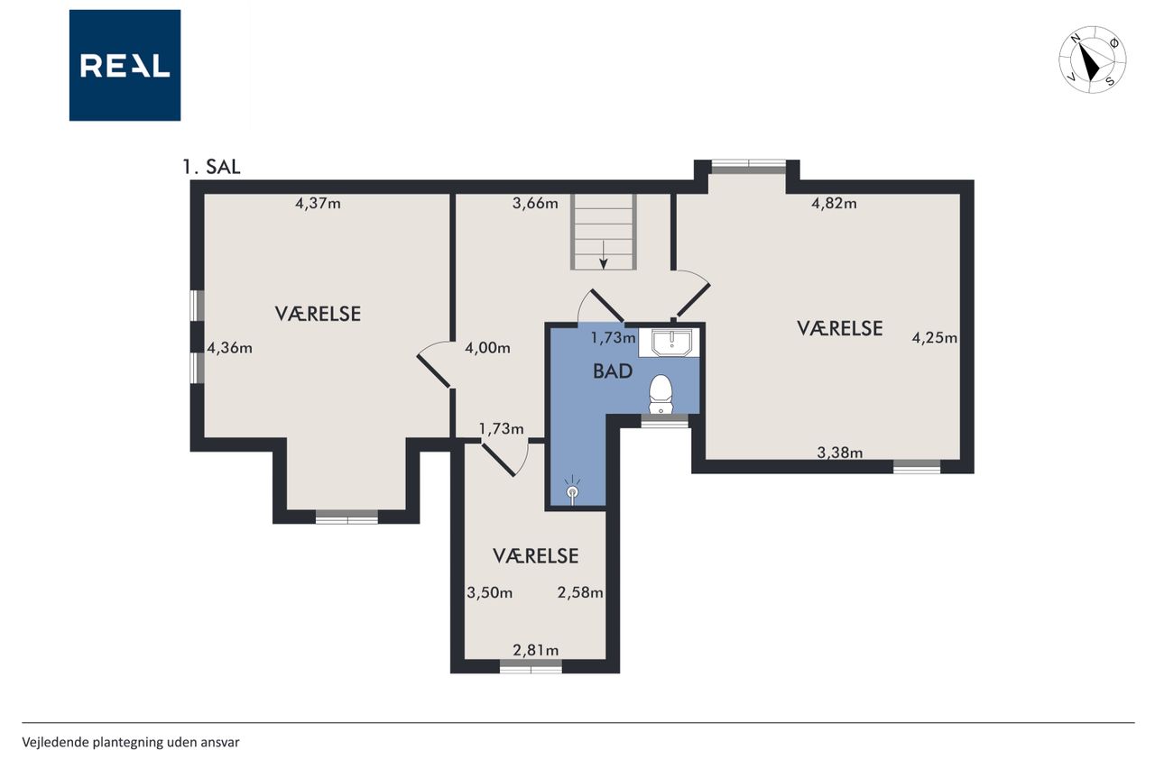 1. salen byder på: Hyggeligt møblerbart repos. 2 store soveværelser. 1 hyggeligt soveværelse. Lyst malede trægulve i værelser og på repos. Nyere badeværelse med bruseniche og klinkegulv med varme.
