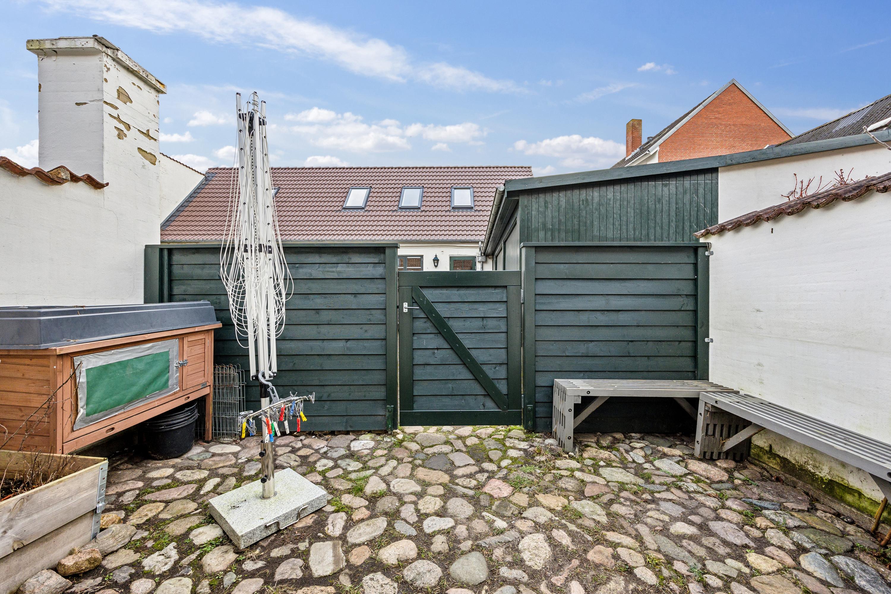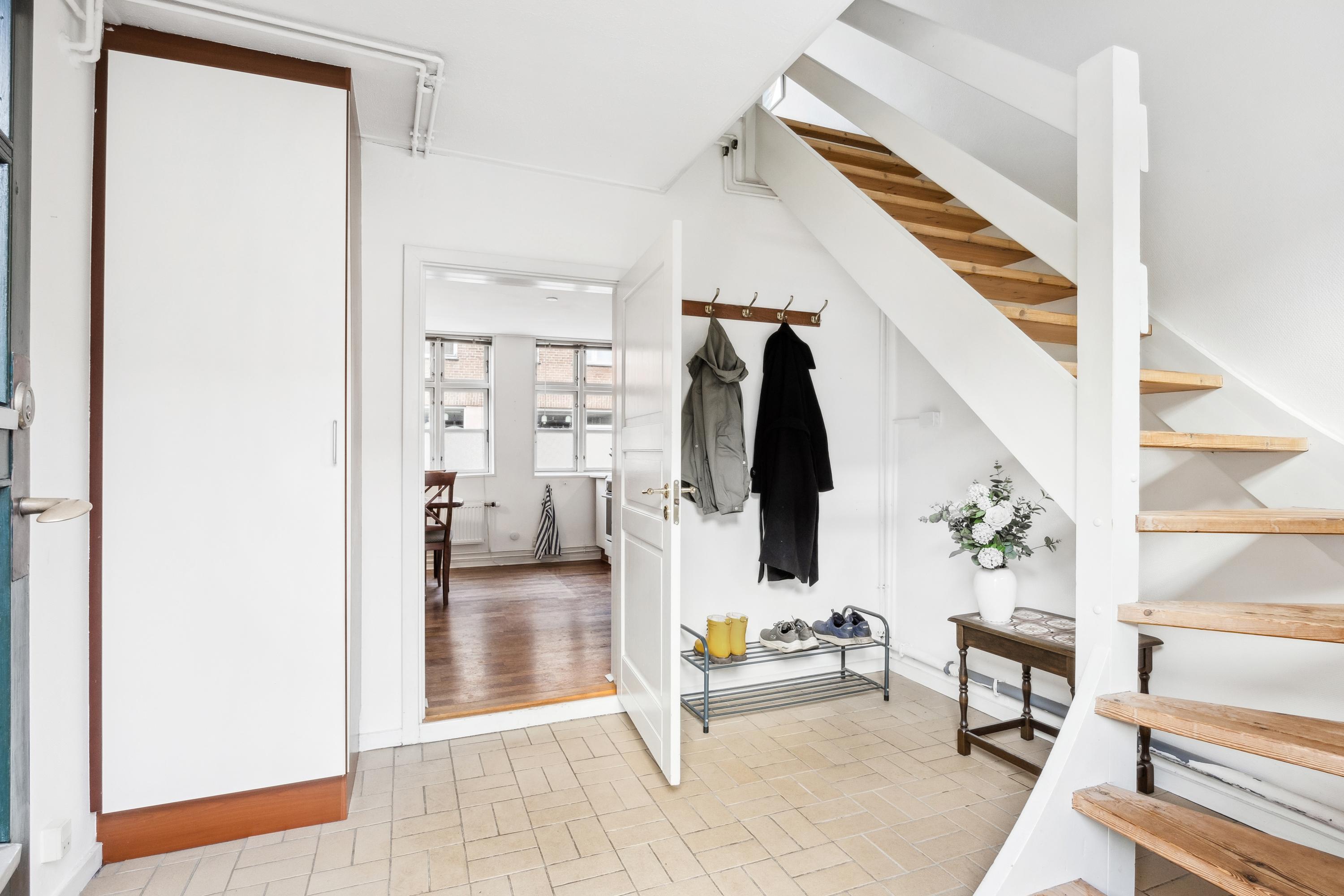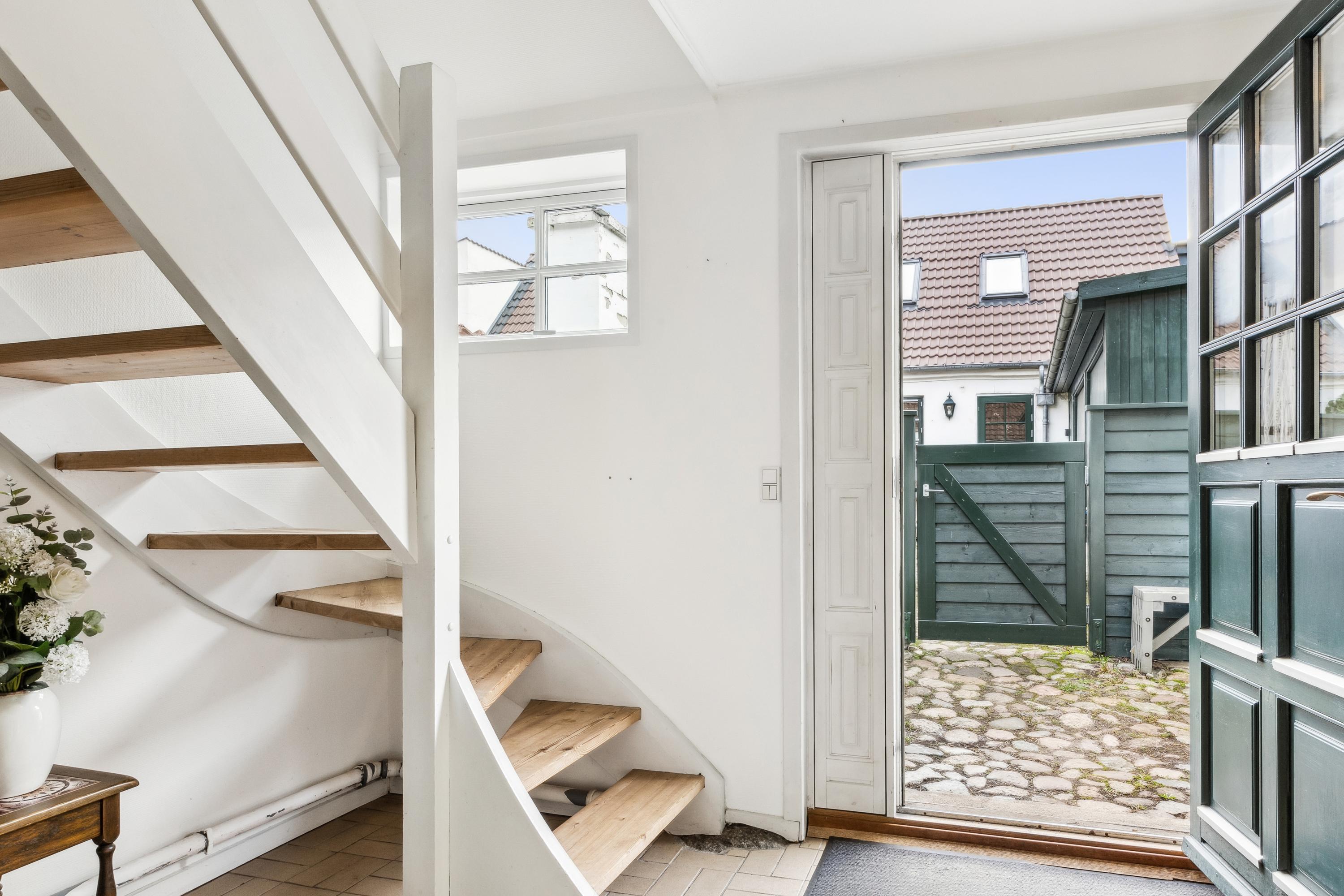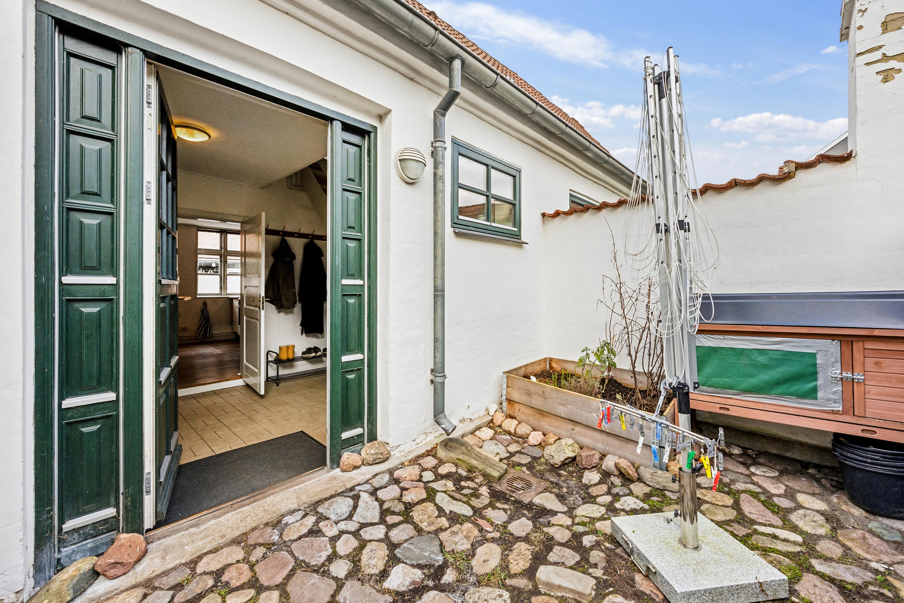 Der er indgang fra den fælles gårdhave, hvor man kommer ind i en mindre, privat gårdhave med plads til lidt havemøbler og tørrestativet. Lejligheden indeholder i stueetagen: Entré med trappe til første sal, badeværelse med brus og køkken og stue i åbent plan med god plads til både spiseafdeling og
