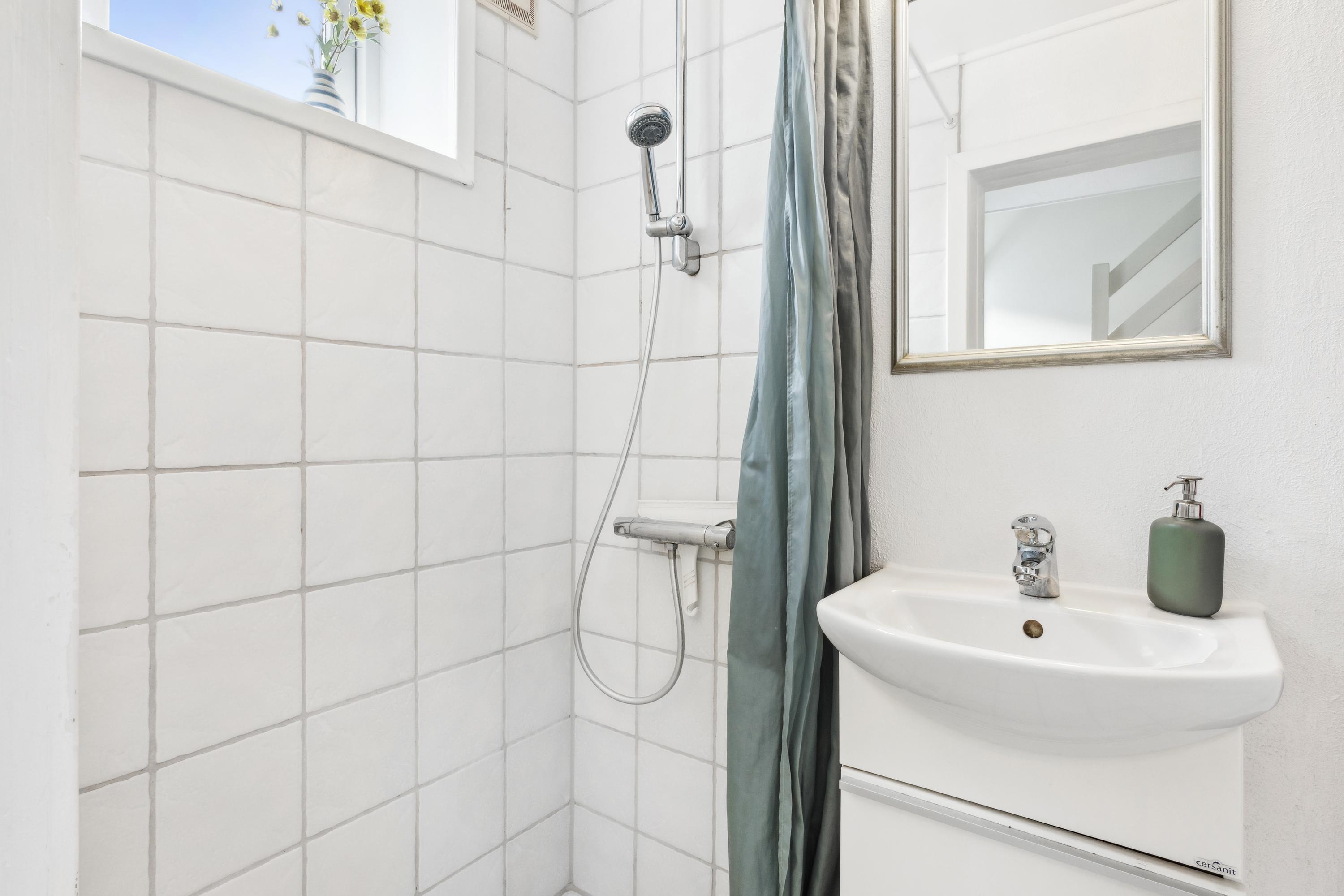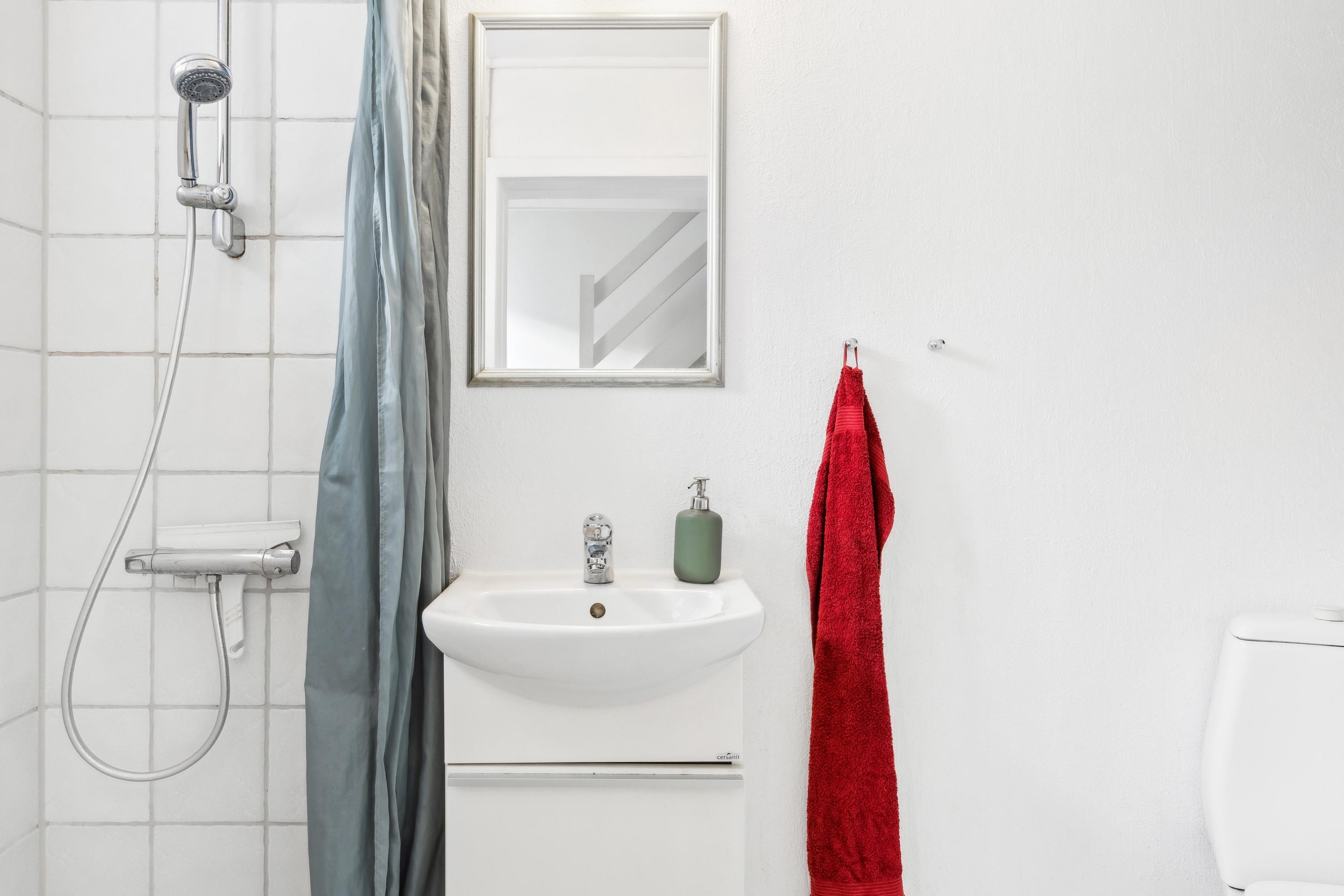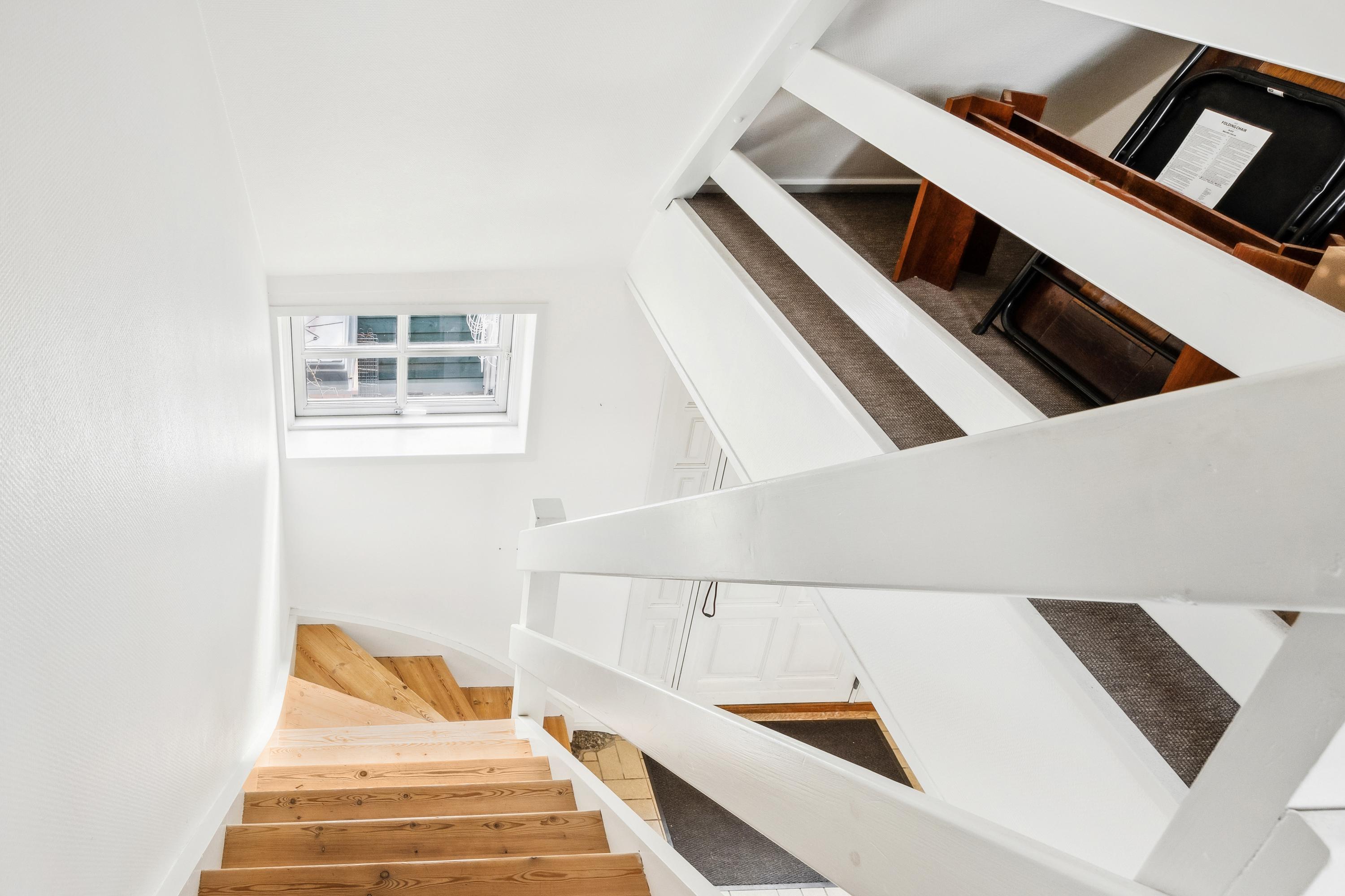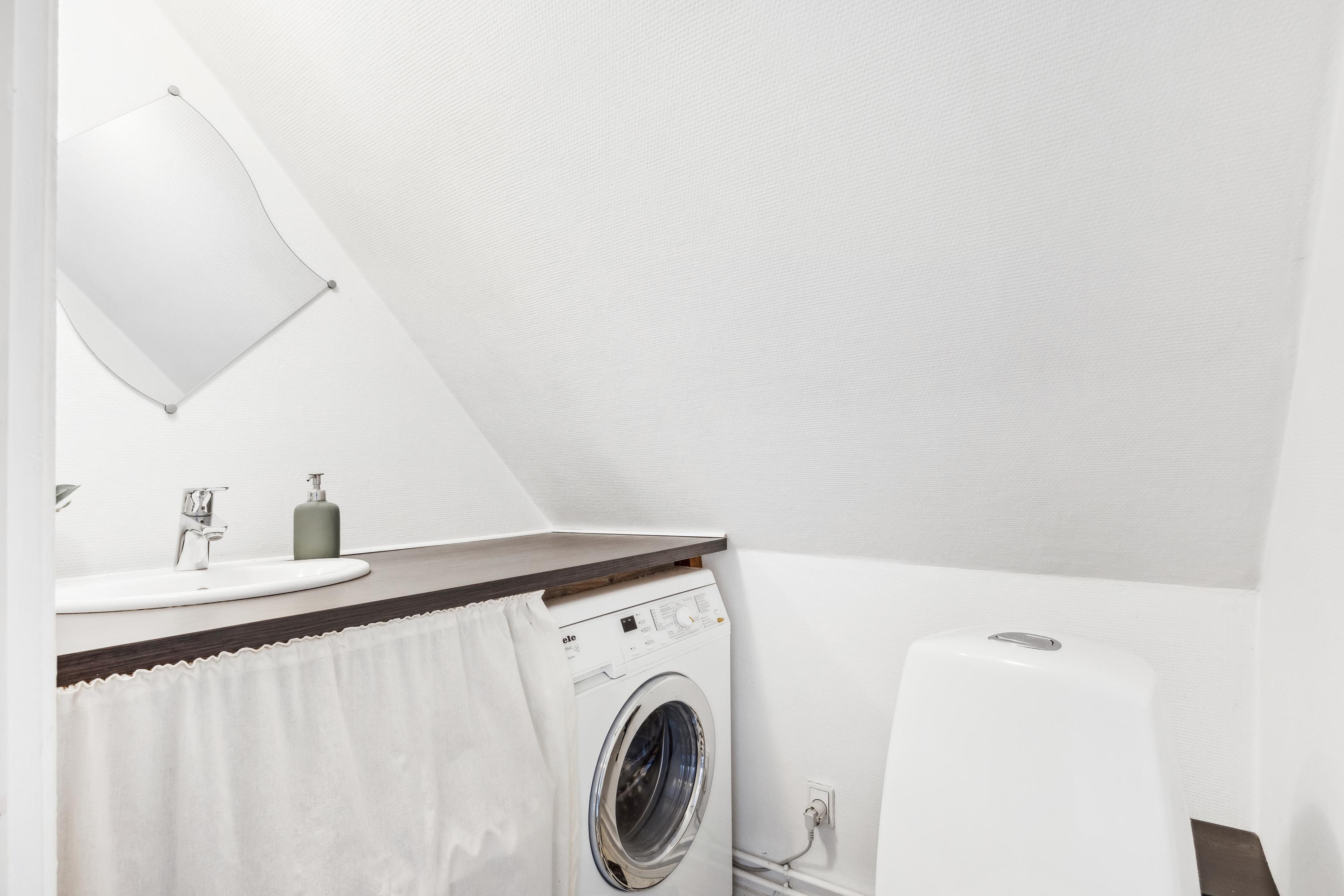 Der er indgang fra den fælles gårdhave, hvor man kommer ind i en mindre, privat gårdhave med plads til lidt havemøbler og tørrestativet. Lejligheden indeholder i stueetagen: Entré med trappe til første sal, badeværelse med brus og køkken og stue i åbent plan med god plads til både spiseafdeling og