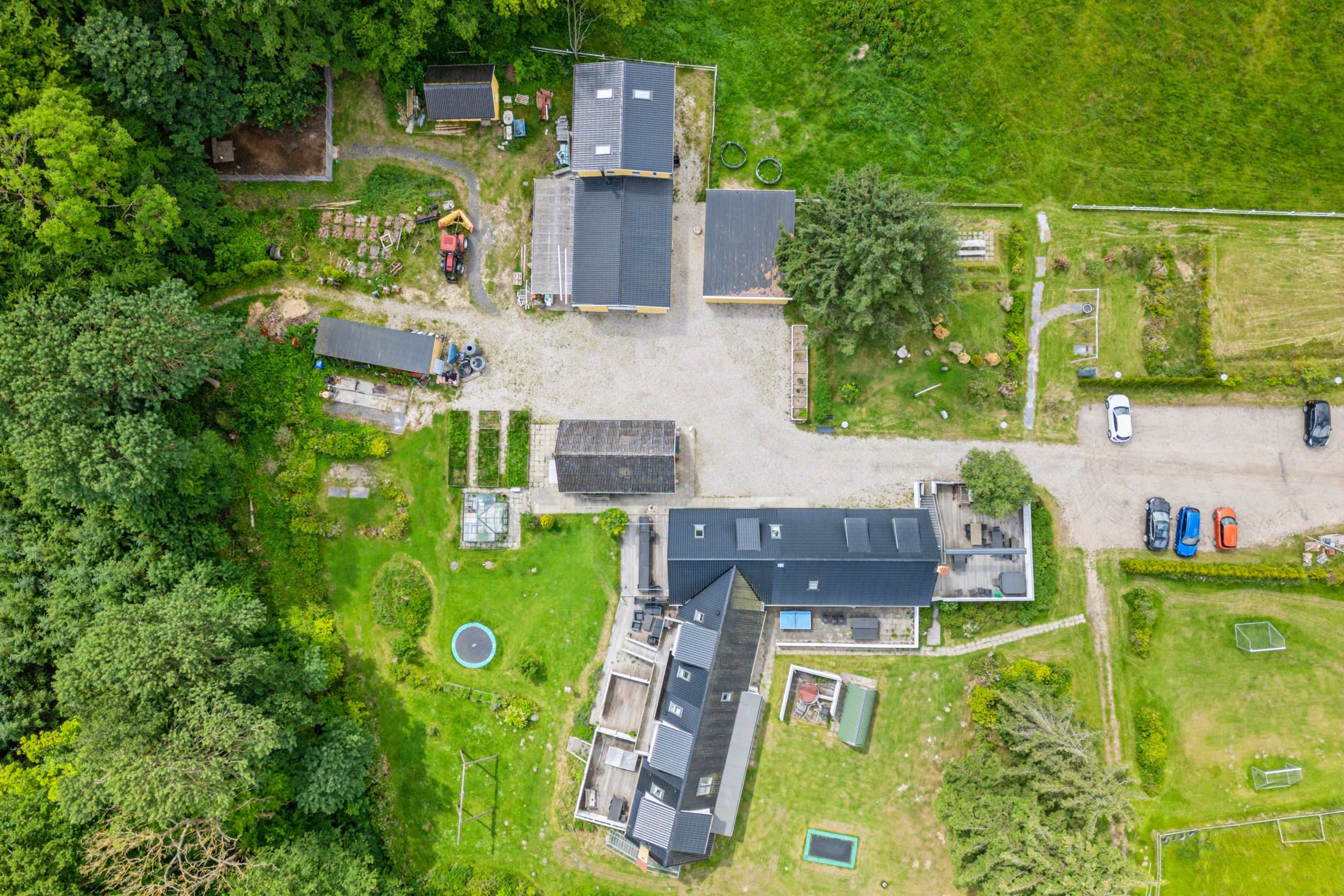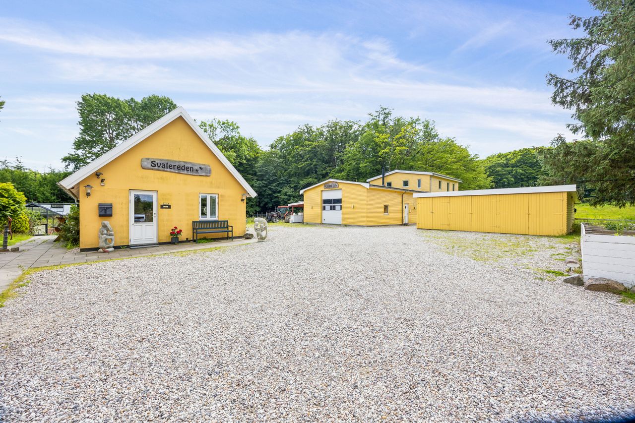 Boligen er beliggende på en grund på 61.172 m2, der byder på masser af plads til udeliv, leg, dyrkning eller afslapning. Dertil kommer flere sidebygninger/udhuse (flere i boligkvalitet), der kan bruges til kontorer, kreative projekter, værksteder, garager m.v.