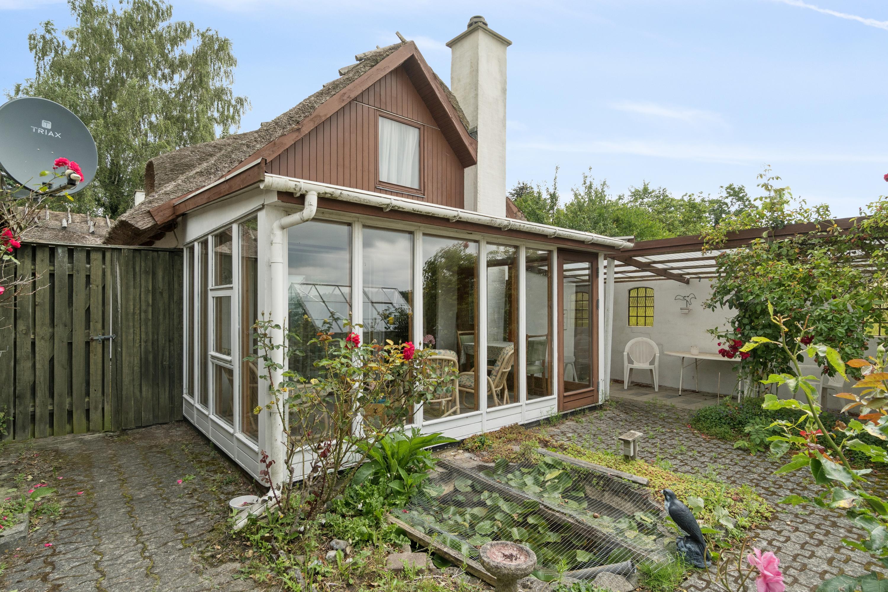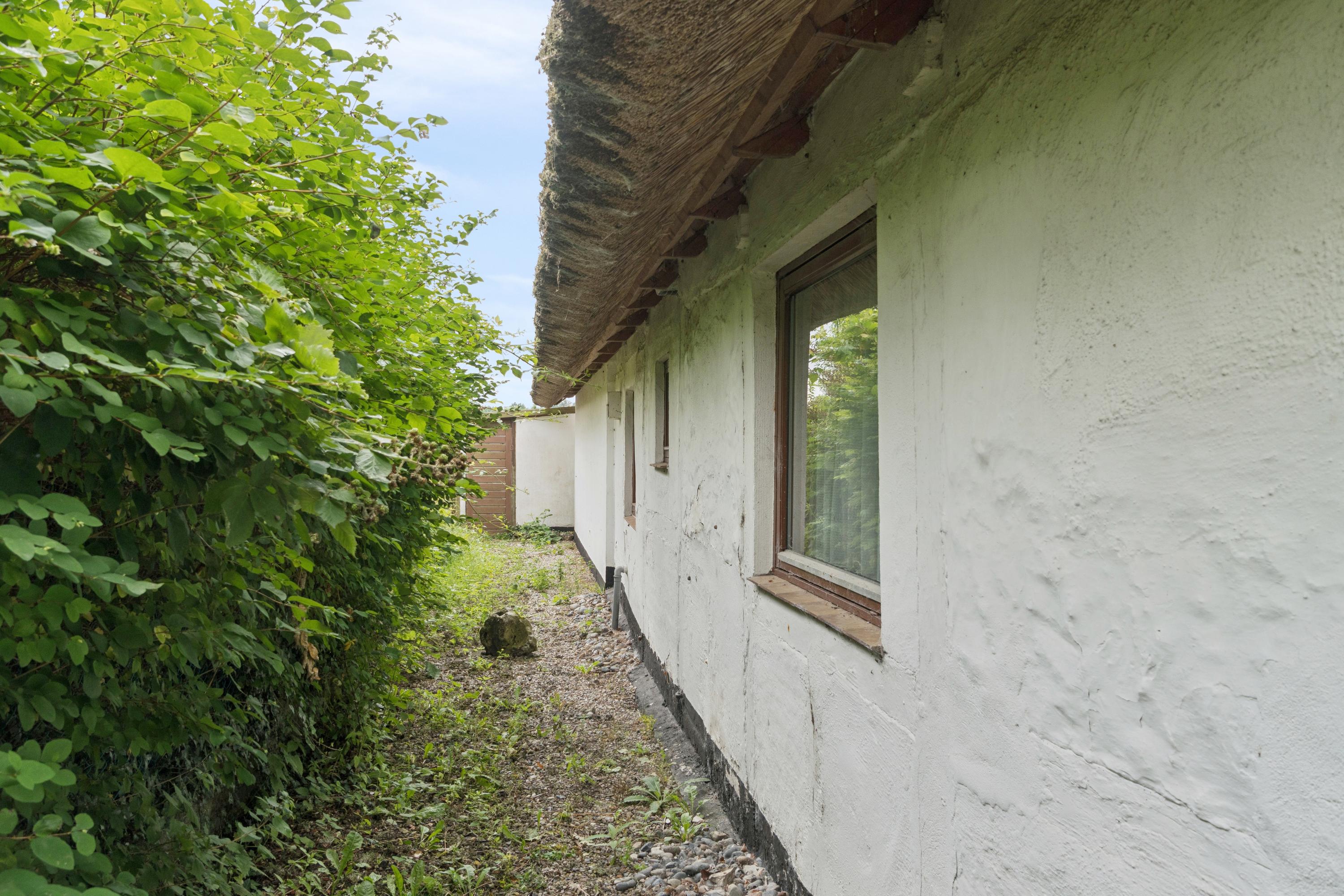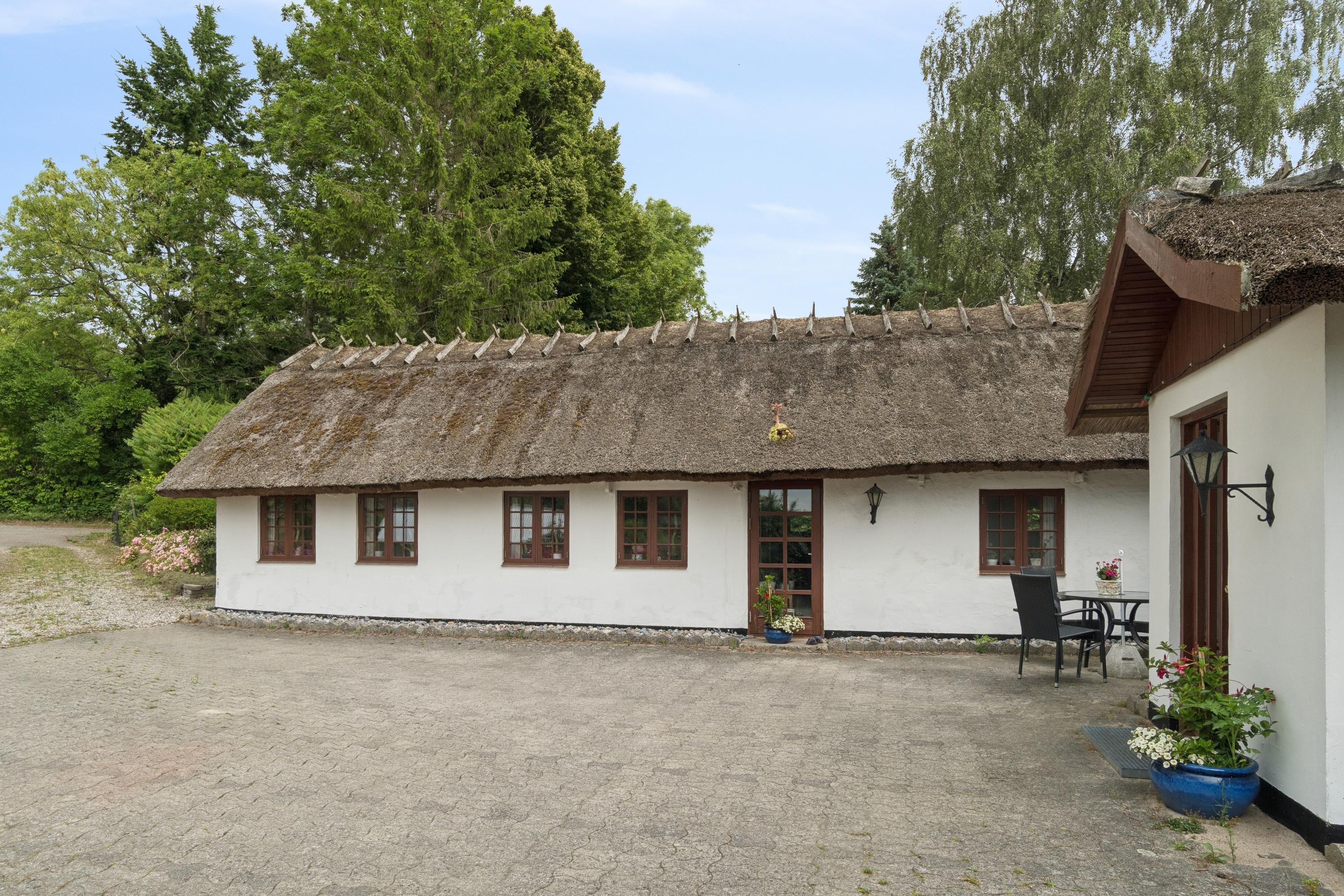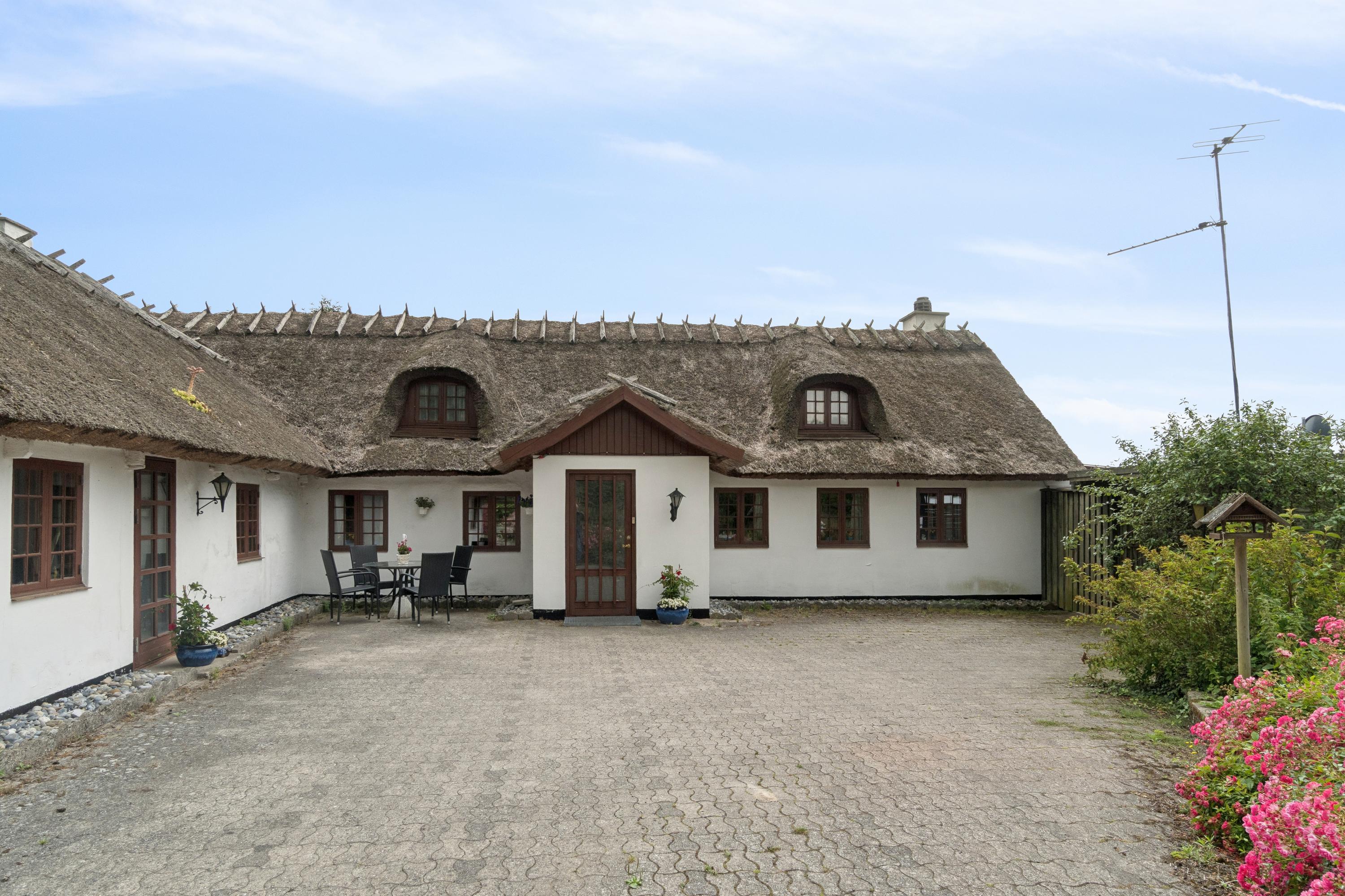 I det hyggelige Svenstrup ligger denne særlige bindingsværksejendom, hvor den hvide facade smyger sig over stok og sten. Dette passer som fod i hose til udtrykket med de mørkebrune vinduesrammer og døre og ikke mindst det fine stråtag med kviste. Her kombineres historie og landlig idyl i smuk