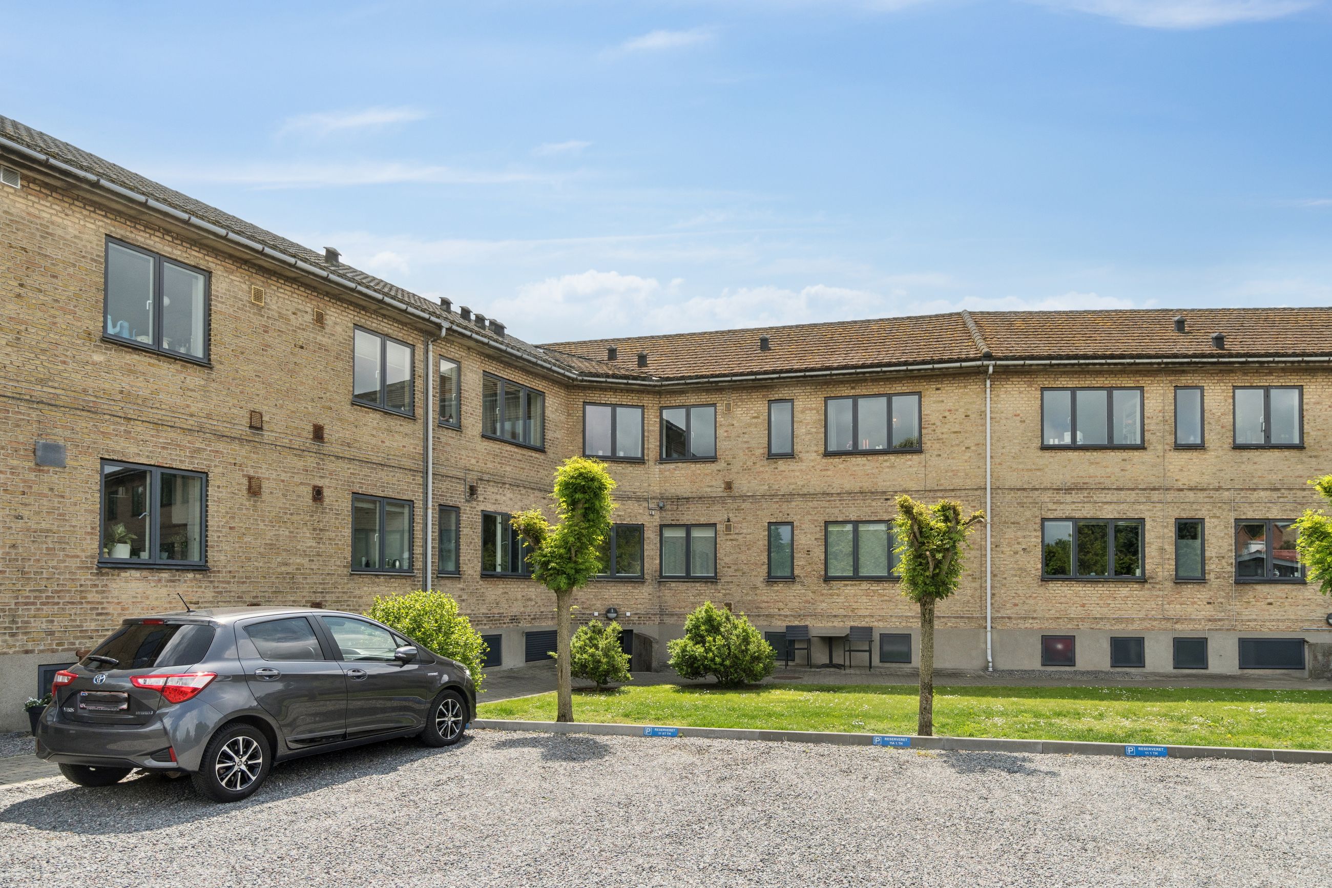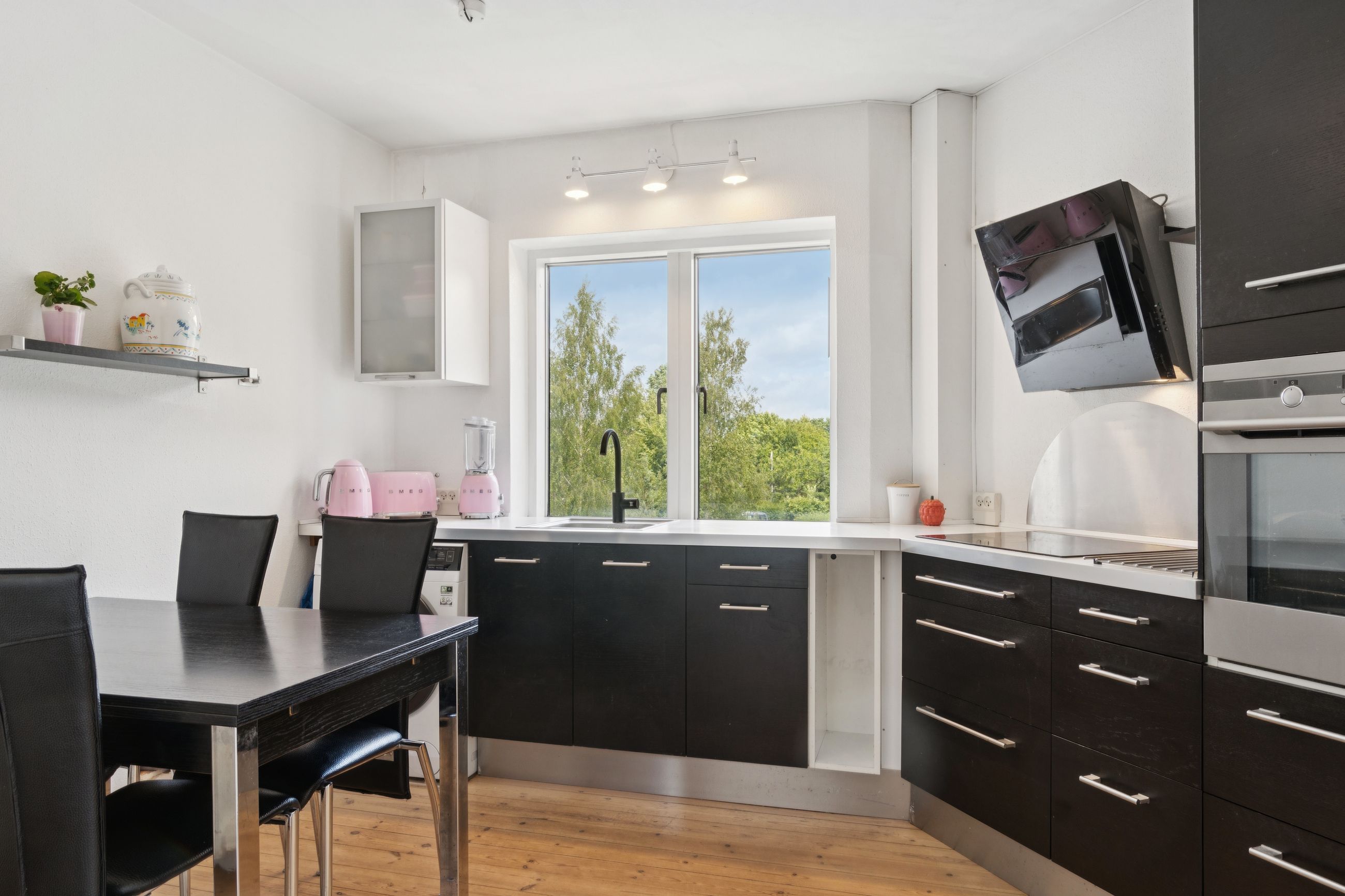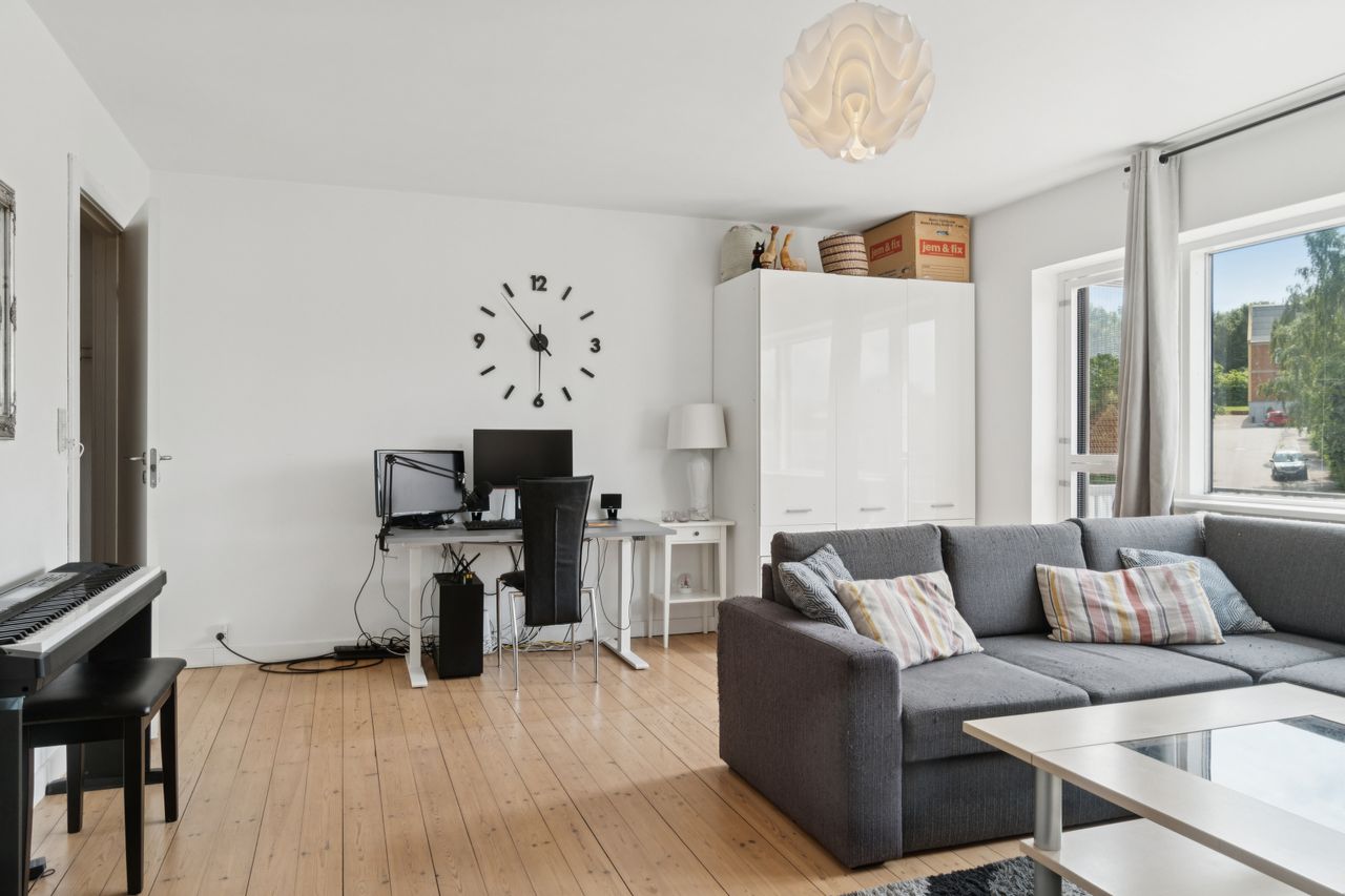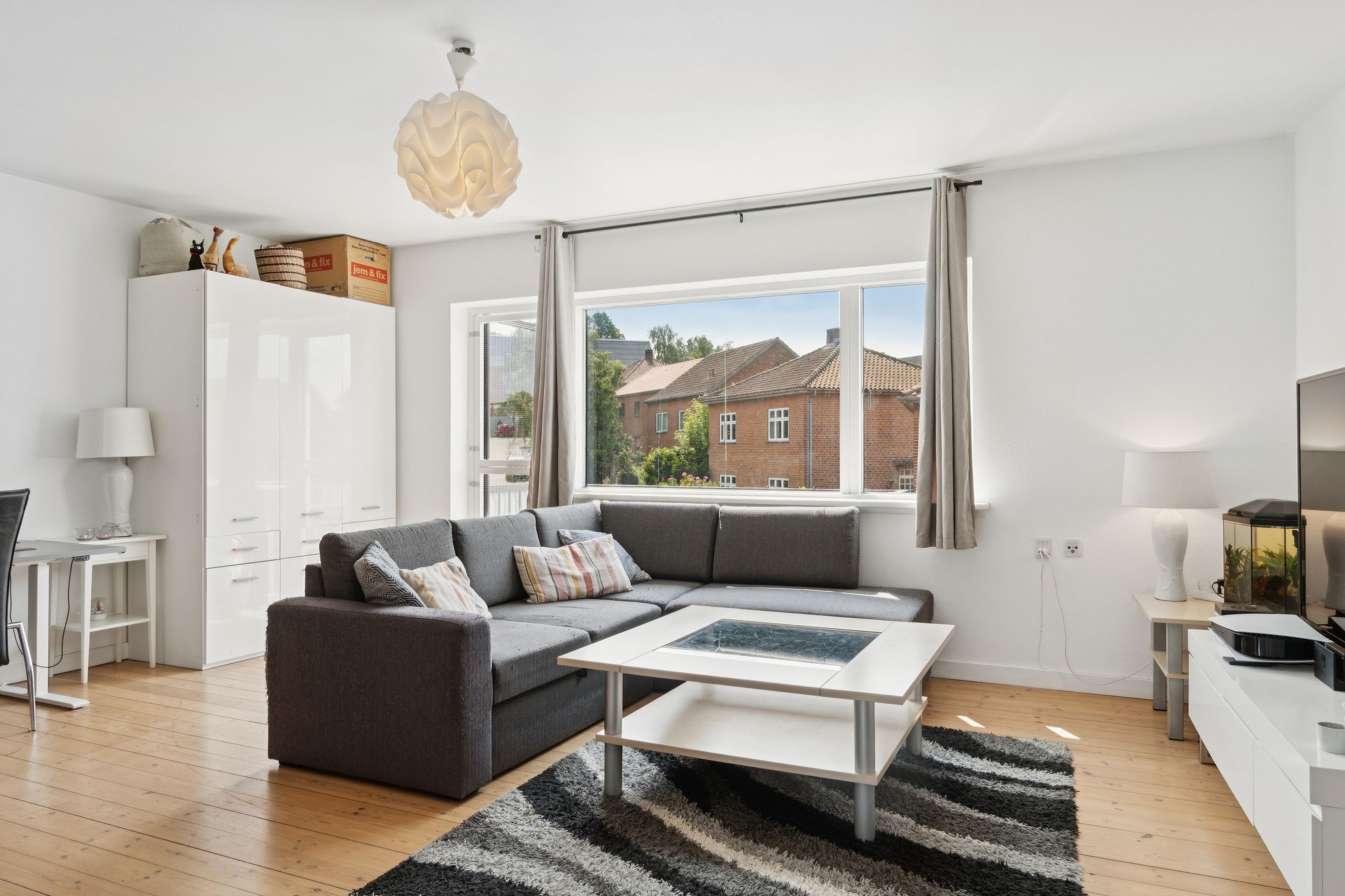 For foden af boligkomplekset har du din egen parkeringsplads til bilen, og oppe på første sal finder du lejligheden. Hjemmet indledes af en entré, hvorfra du har adgang til samtlige rum, og først skal du se det rummelige køkken med sorte fronter, gode opbevaringsløsninger og spiseplads. Videre til stuen oplever du et indretningsvenligt rum, hvor solen strømmer gavmildt ind fra syd gennem altandøren og det store vinduesparti.