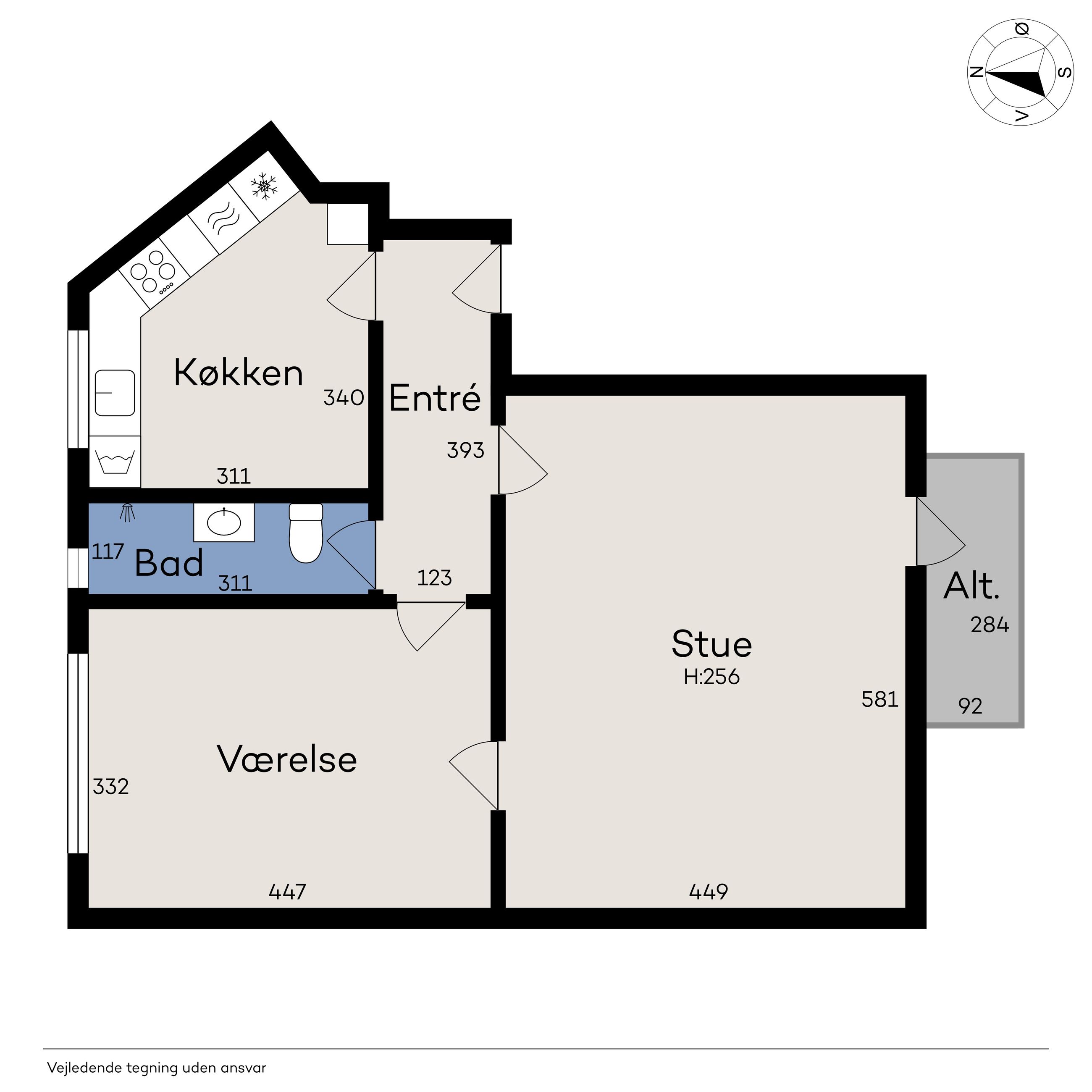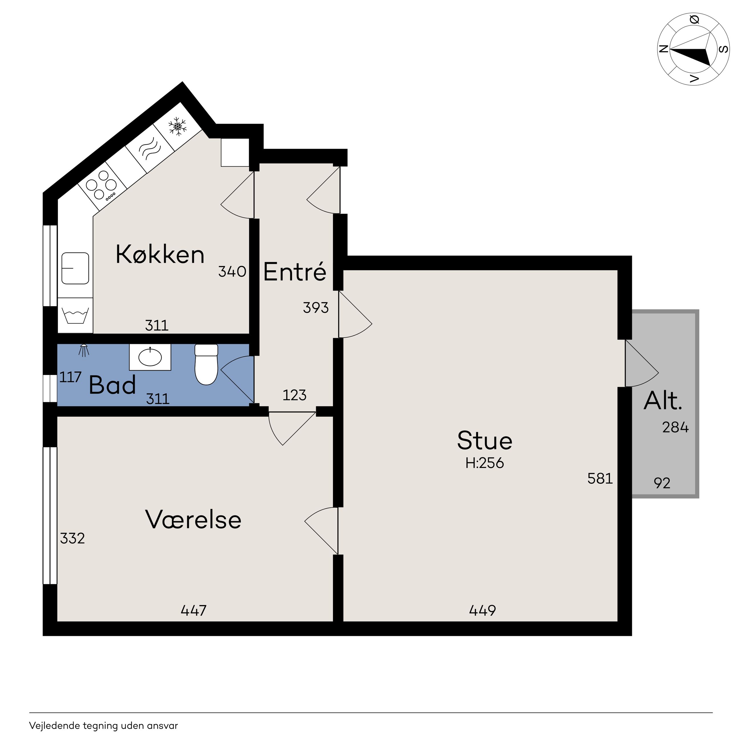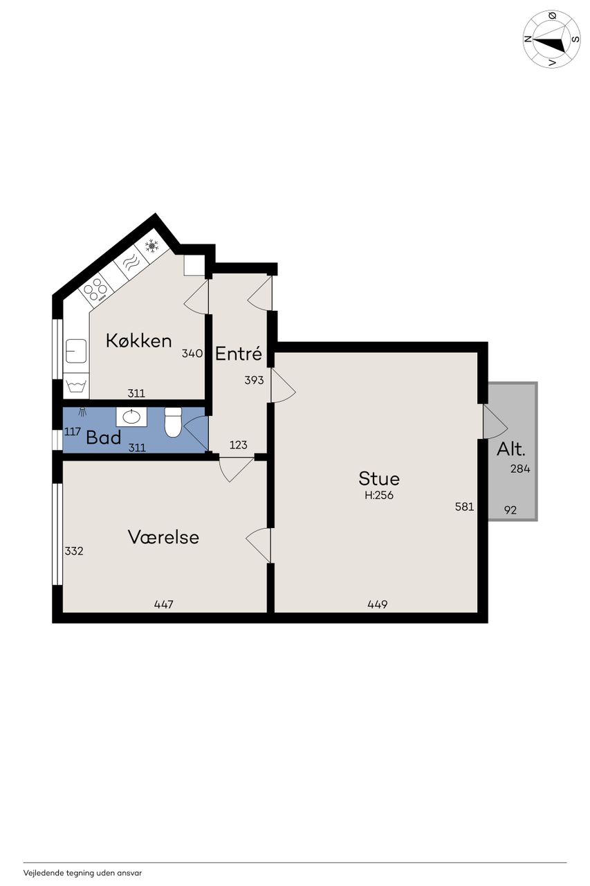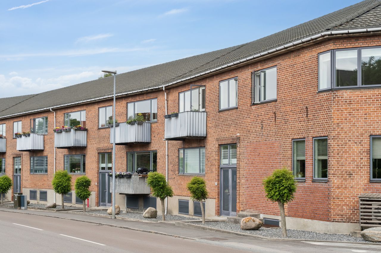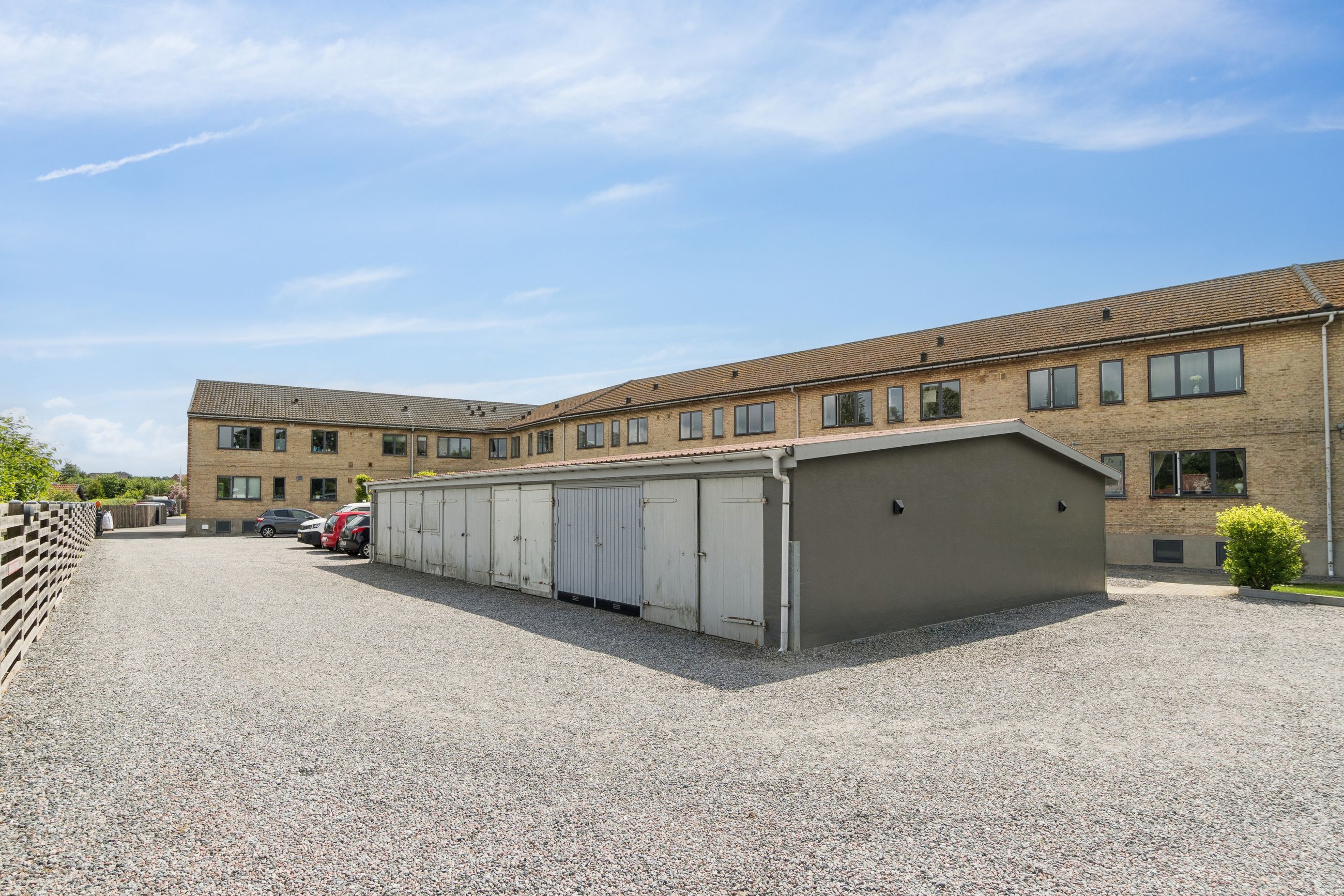 For foden af boligkomplekset har du din egen parkeringsplads til bilen, og oppe på første sal finder du lejligheden. Hjemmet indledes af en entré, hvorfra du har adgang til samtlige rum, og først skal du se det rummelige køkken med sorte fronter, gode opbevaringsløsninger og spiseplads. Videre til stuen oplever du et indretningsvenligt rum, hvor solen strømmer gavmildt ind fra syd gennem altandøren og det store vinduesparti.