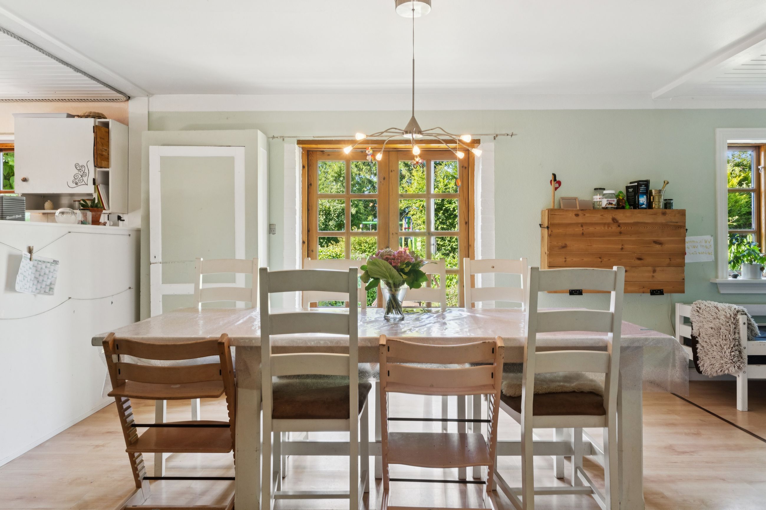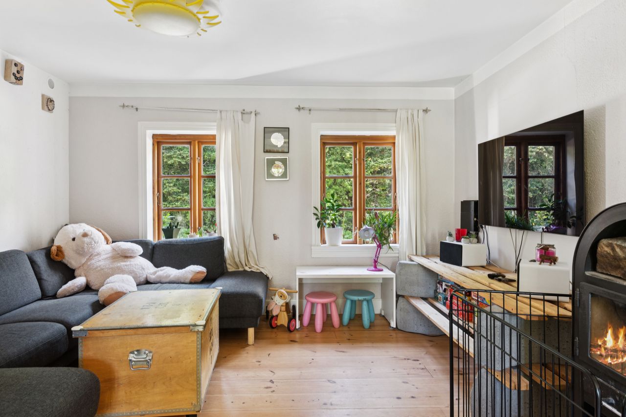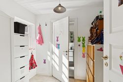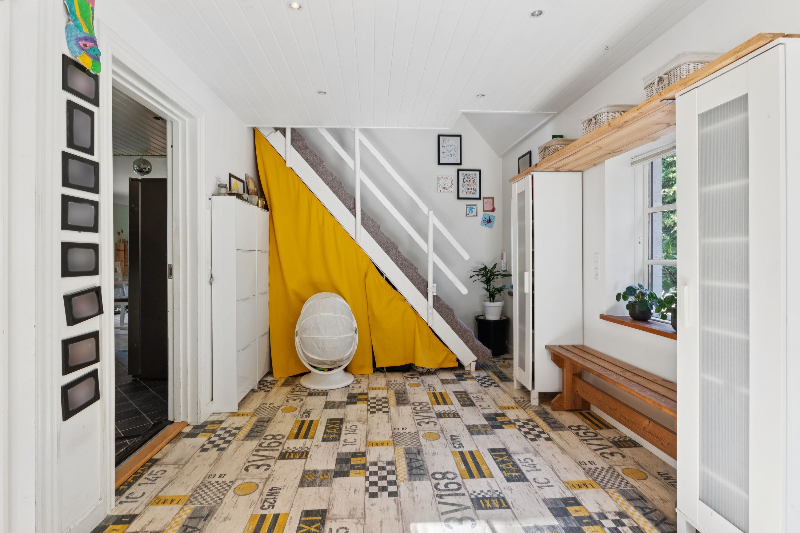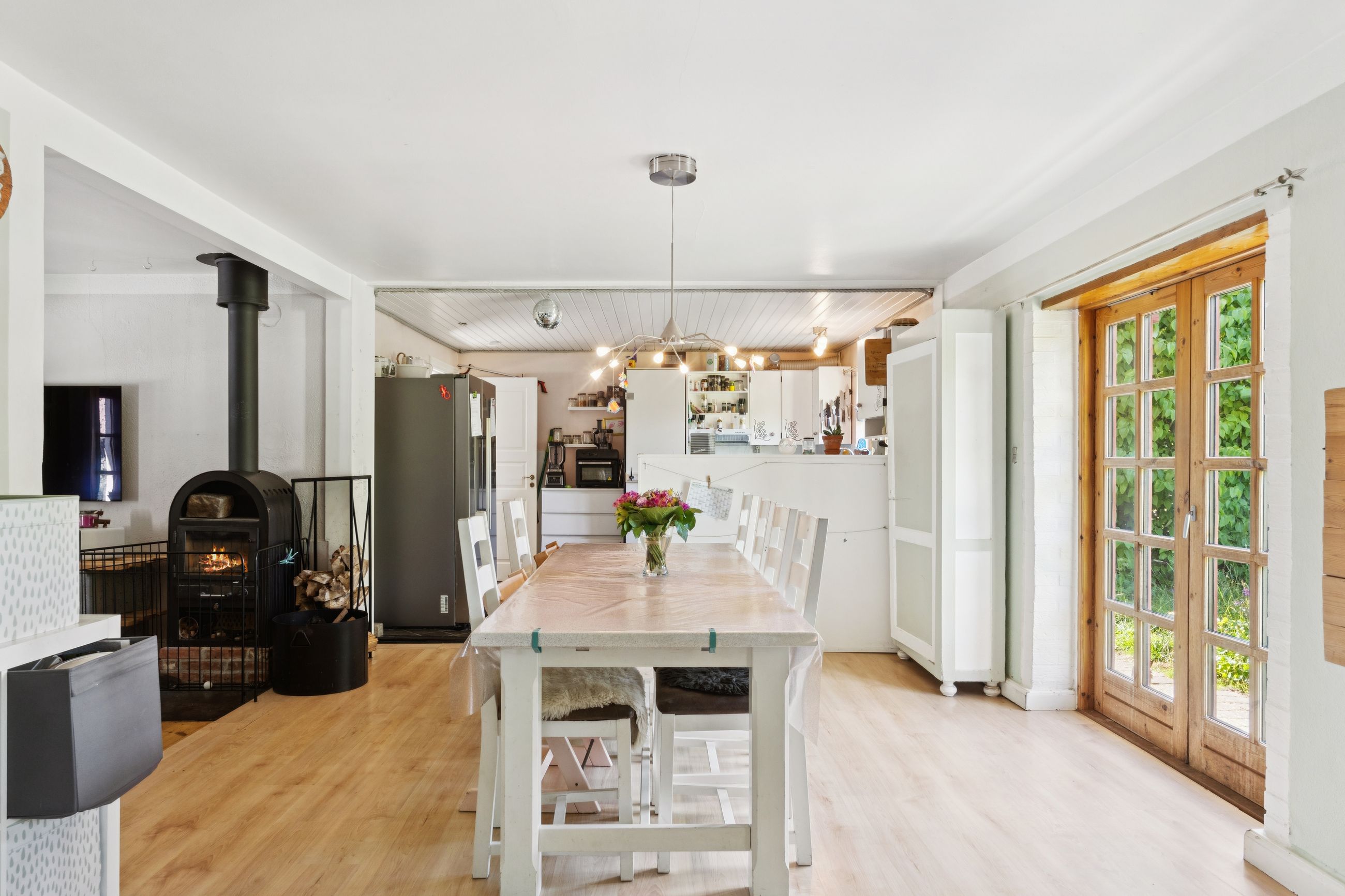 Villaen fremstår med et nydeligt udtryk. Den pudsede facade er hvid, og taget er rødt. De sprossede vinduer understreger den fine stil, og som I træder inden for, vil I finde æstetikken videreført på to etager med et samlet beboelsesareal på 166 kvadratmeter. I midten af det hele råder I over et markant opholdsrum med stue og køkken i åben forbindelse. Sidstnævnte er opstillet i en hesteskoform, mens der i de to stueafsnit opleves et behageligt lysindfald. En brændeovn understreger den charmerende atmosfære. Det resterende af boligen er i stueplan allokeret til et walk-in-closet, et badeværelse og en entré, hvorfra der er passage til førstesalen. Her venter et møblerbart repos og tre regulære værelser.