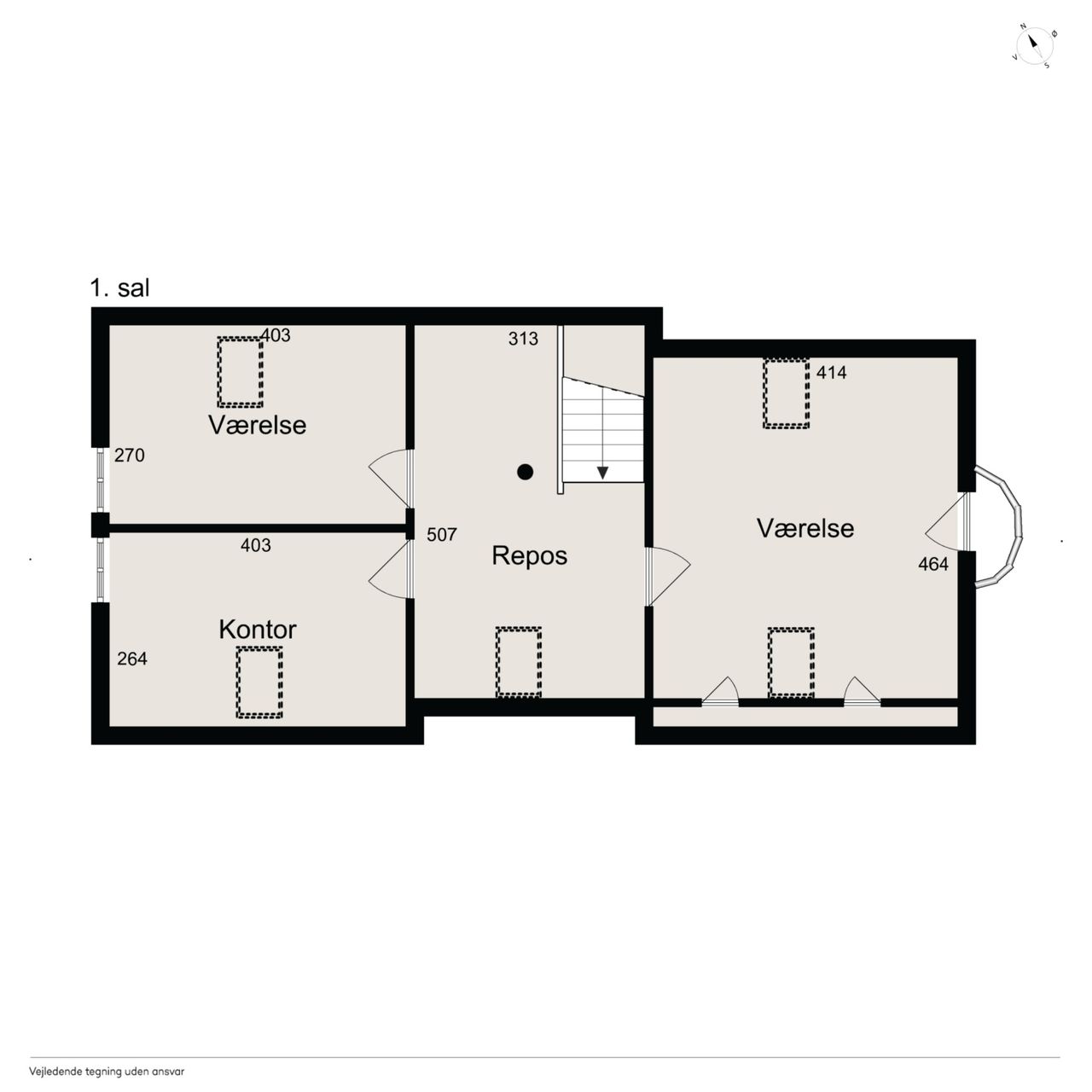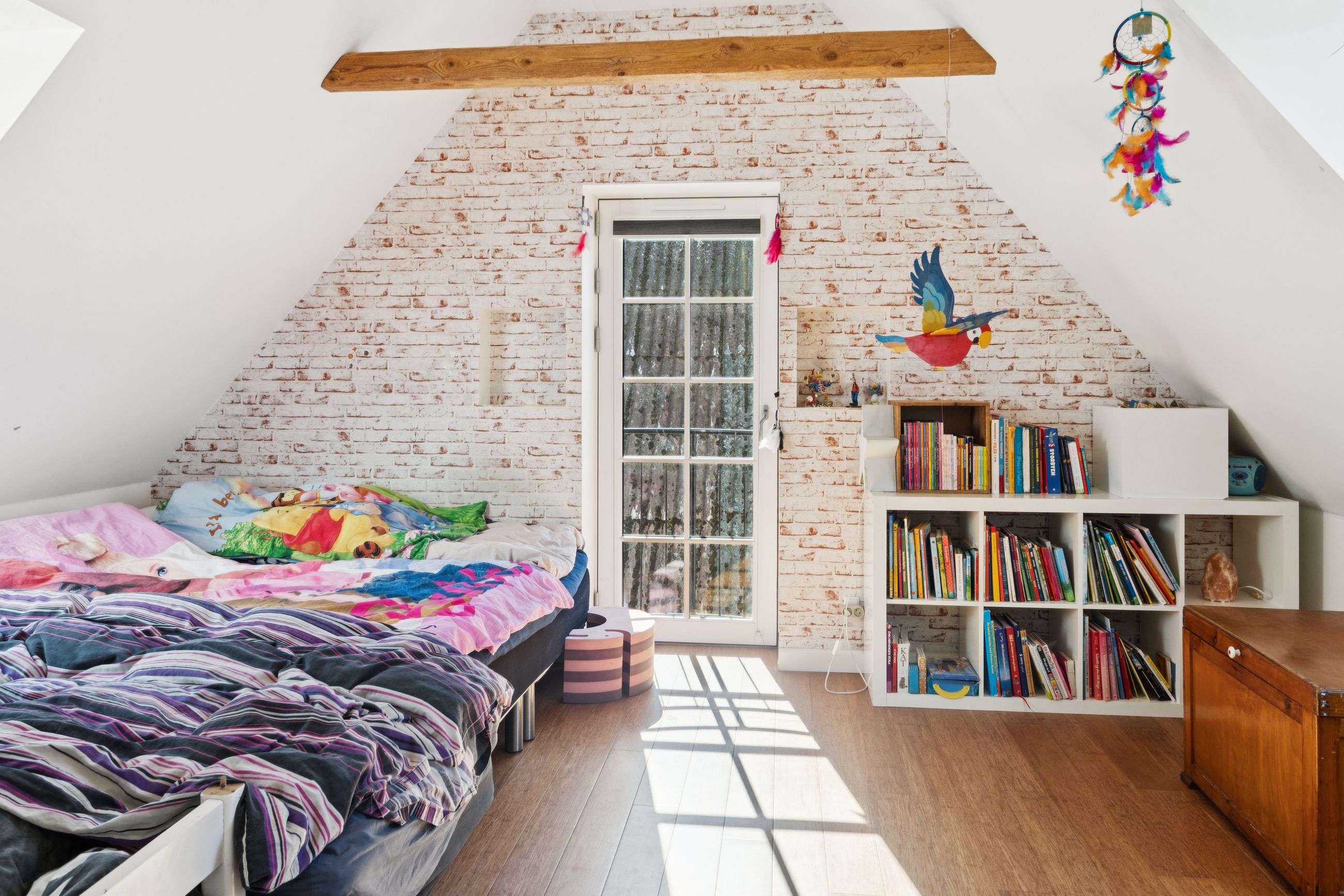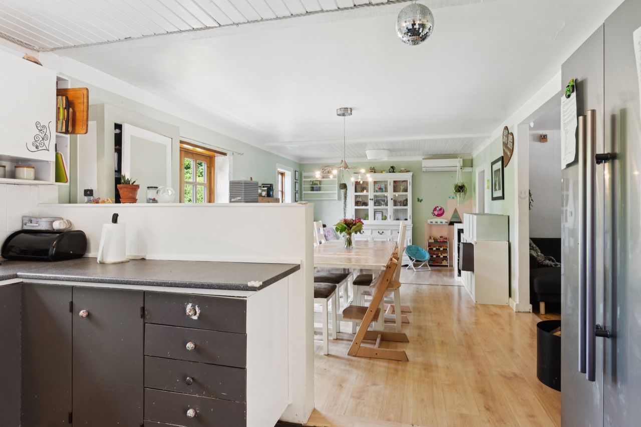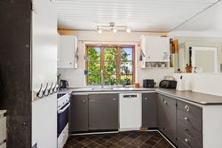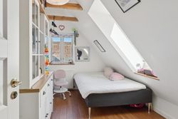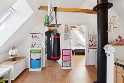 Villaen fremstår med et nydeligt udtryk. Den pudsede facade er hvid, og taget er rødt. De sprossede vinduer understreger den fine stil, og som I træder inden for, vil I finde æstetikken videreført på to etager med et samlet beboelsesareal på 166 kvadratmeter. I midten af det hele råder I over et markant opholdsrum med stue og køkken i åben forbindelse. Sidstnævnte er opstillet i en hesteskoform, mens der i de to stueafsnit opleves et behageligt lysindfald. En brændeovn understreger den charmerende atmosfære. Det resterende af boligen er i stueplan allokeret til et walk-in-closet, et badeværelse og en entré, hvorfra der er passage til førstesalen. Her venter et møblerbart repos og tre regulære værelser.