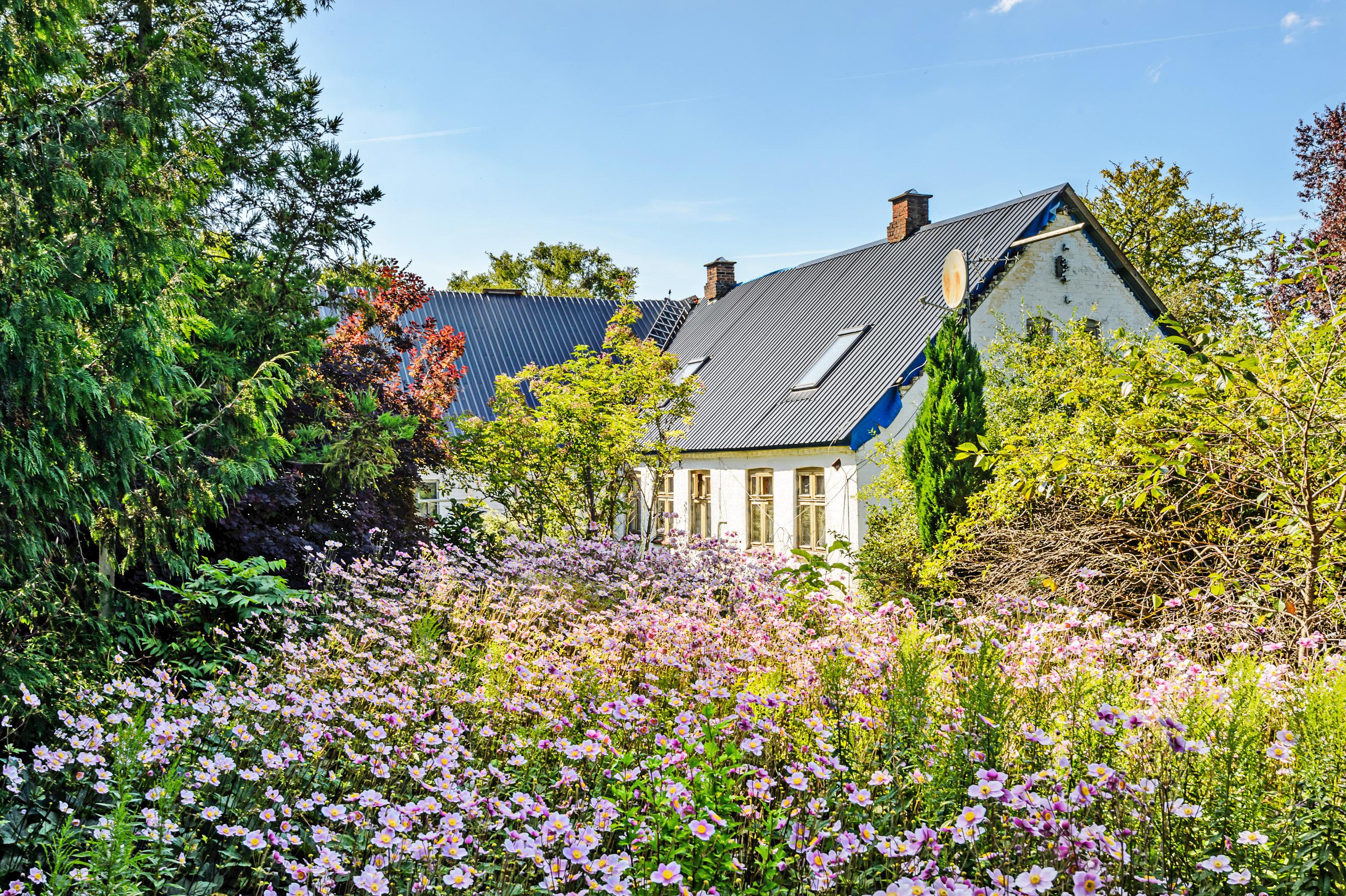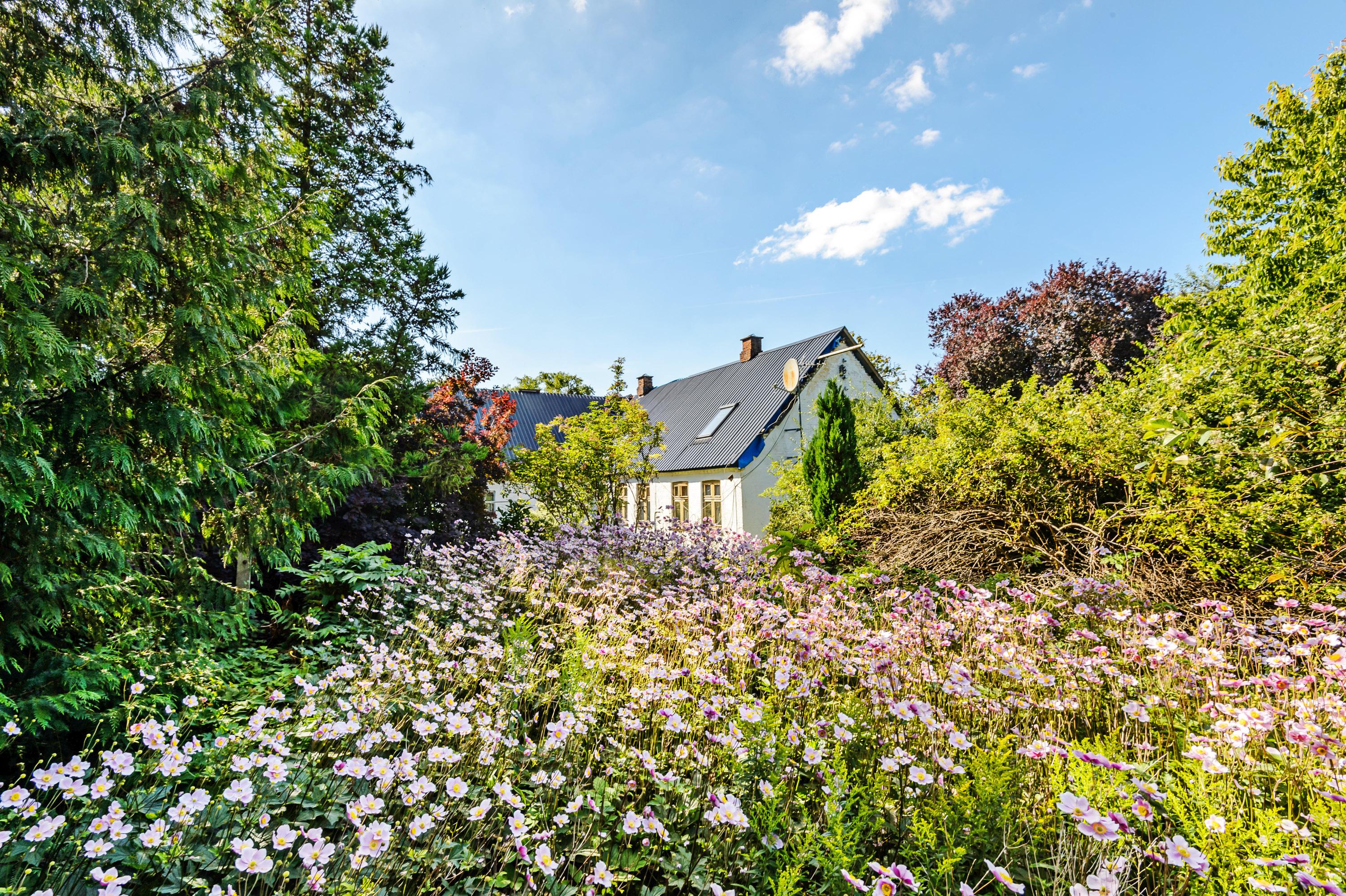 Ejendommens bygninger ligger for enden af jorden og ligger dejlig ugeneret. Haven omkring bygningerne er tilvokset med det skønneste virvar af blomster, frugttræer,