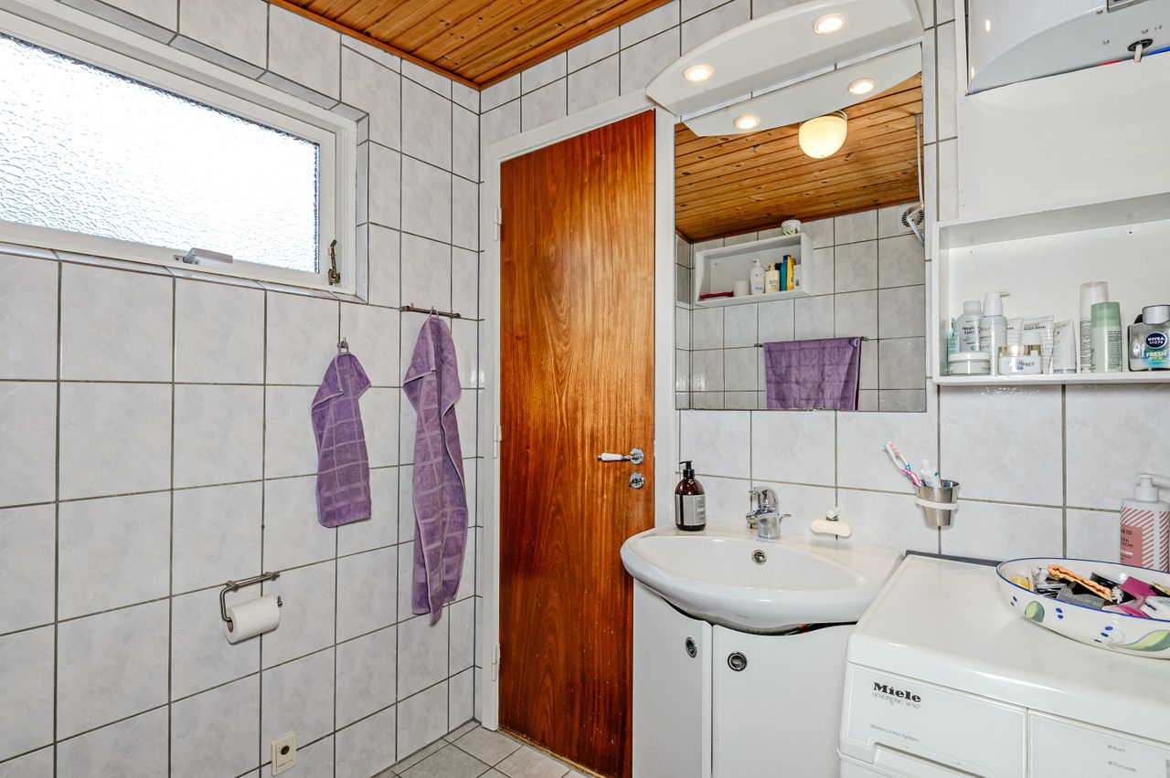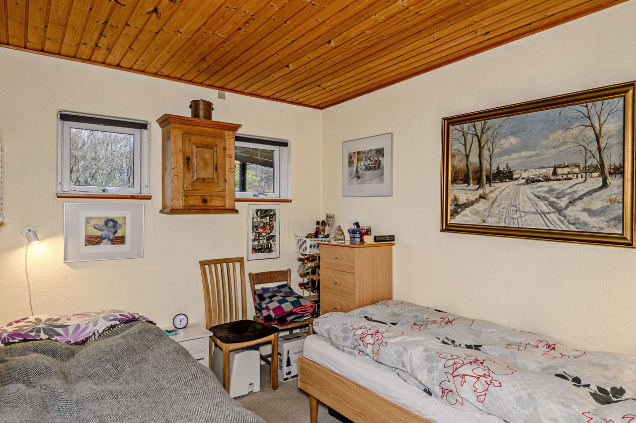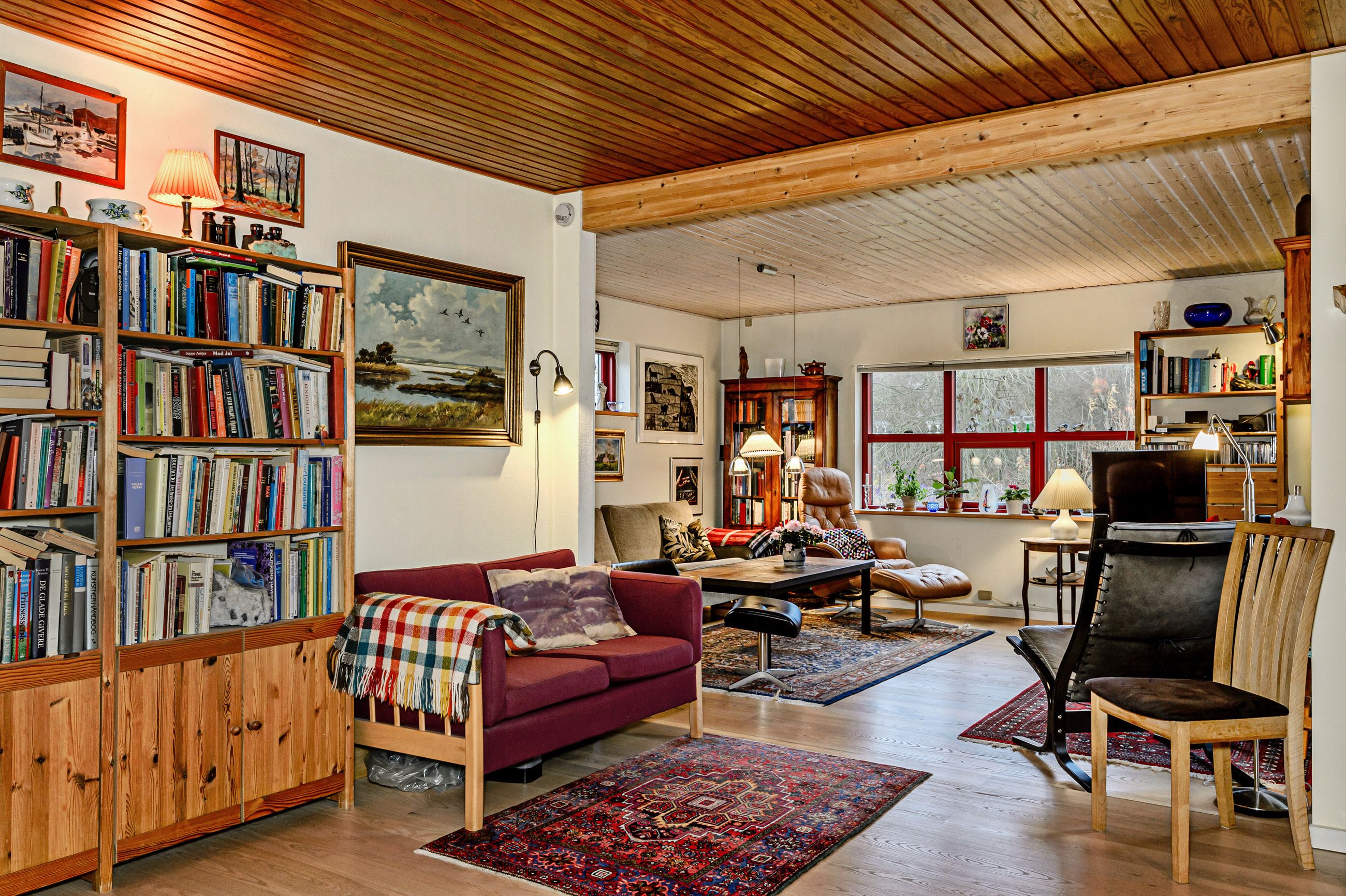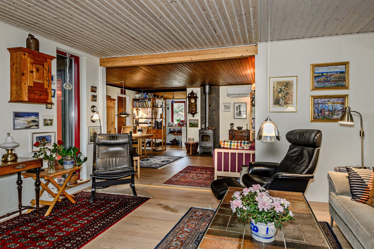 Villaen er opført med facader i træbeklædning, tagpaptag og døre/vinduer med termo-/energiglas. Indretning uden spildplads: Entre med skabe, nydeligt badeværelse med lyse fliser til loftet, bruseniche, gulvvarme og plads til vaskemaskine, velindrettet køkken med lyse elementer pålagt en praktisk bordplade samt afsætningsplads til varme gryder, virkelig hyggelig spisestue med plads til et stort bord, brændeovn og helt ny luft til luft varmepumpe, rigtig hyggelig stue med plads til sofagruppe og stort TV, soveværelse, stort værelse med skabsvæg og udgang til den overdækkede terrasse. Trægulve og trælofter.